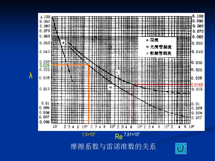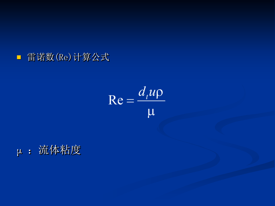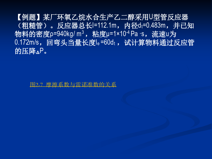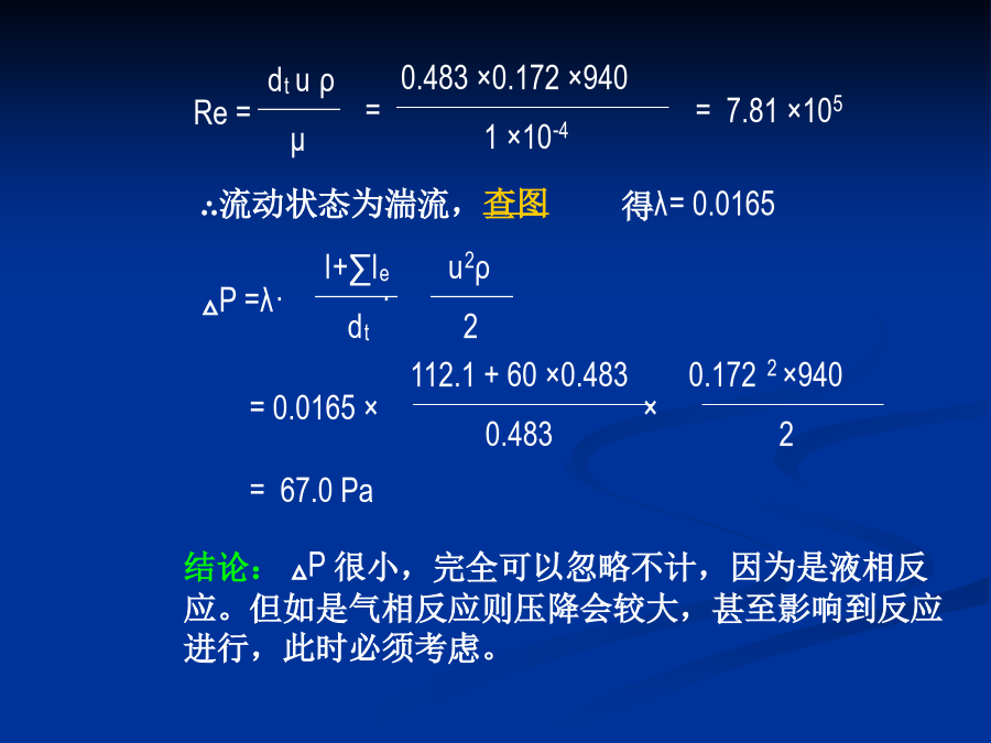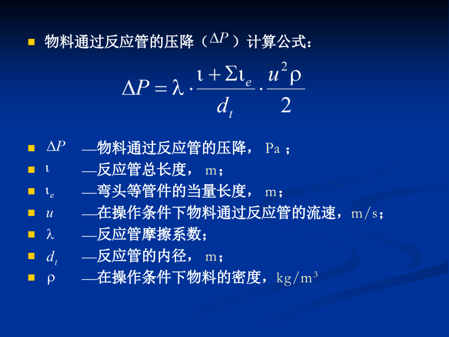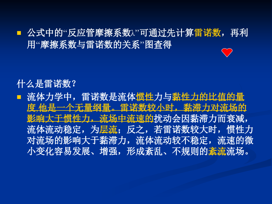 (二)物料通过反应管的压降物料通过反应管的压降()计算公式:—物料通过反应管的压降,Pa;—反应管总长度,m;—弯头等管件的当量长度,m;—在操作条件下物料通过反应管的流速,m/s;—反应管摩擦系数;—反应管的内径,m;—在操作条件下物料的密度,kg/m3公式中的“反应管摩擦系数λ”可通过先计算雷诺数,再利用“摩擦系数与雷诺数的关系”图查得什么是雷诺数?流体力学中,雷诺数是流体惯性力与黏性力的比值的量度,他是一个无量纲量。雷诺数较小时,黏滞力对流场的影响大于惯性力,流场中流速的扰动会因黏滞力而衰减,流体流