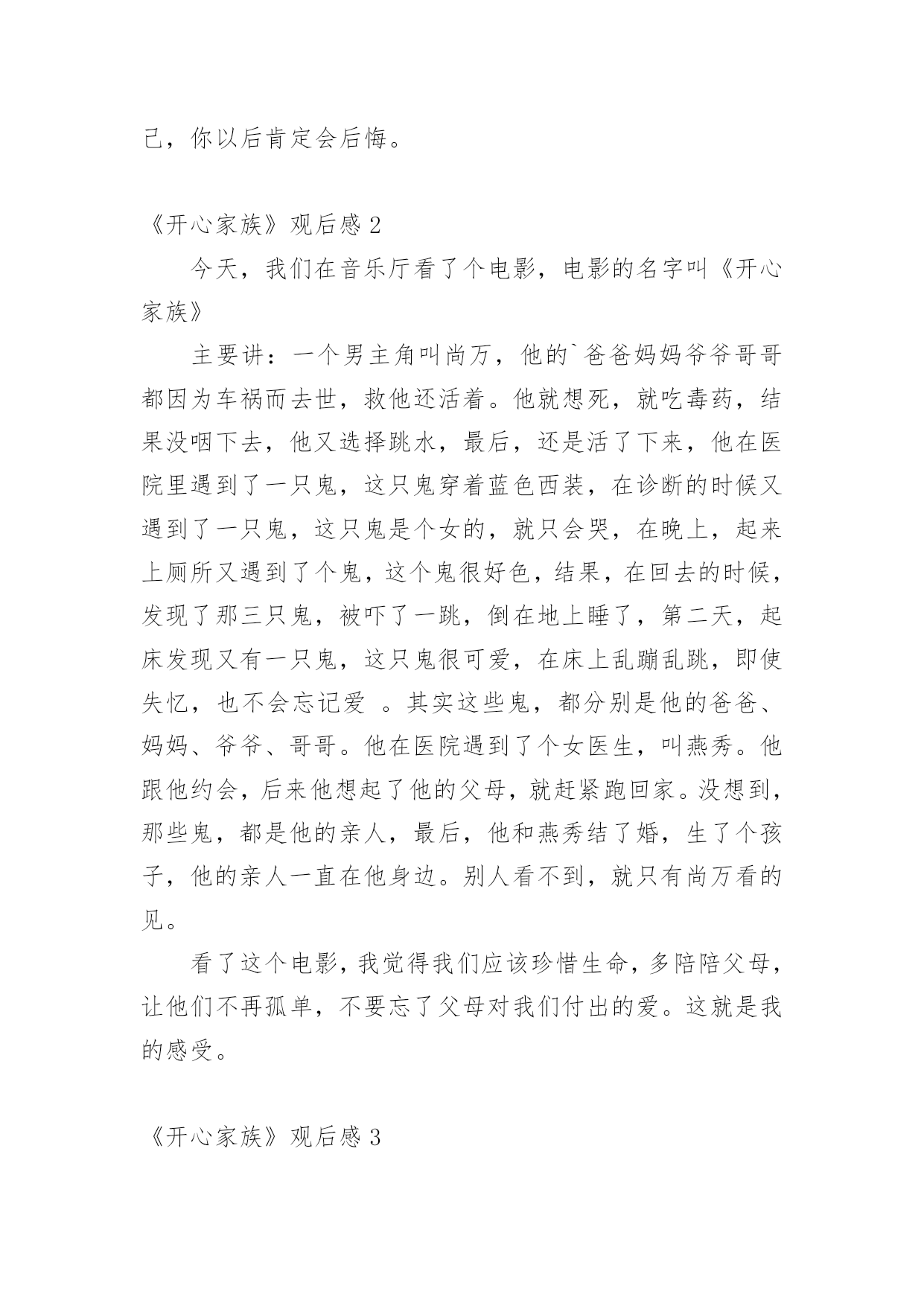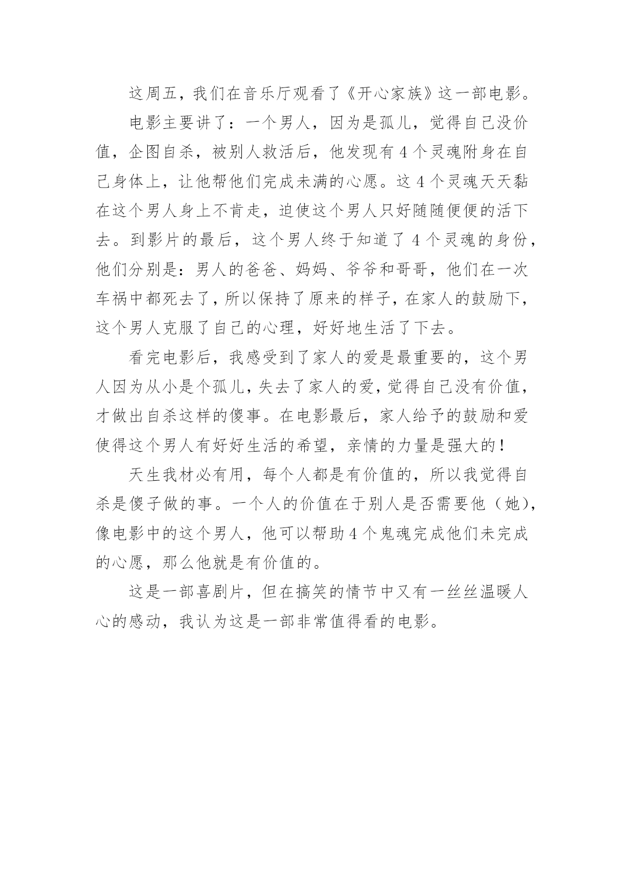 《开心家族》观后感《开心家族》观后感3篇看完一部作品后,一定有不少感悟吧,让我们好好写份观后感,把你的收获感想写下来吧。快来参考观后感是怎么写的吧,下面是小编为大家整理的《开心家族》观后感,希望能够帮助到大家。《开心家族》观后感1今天我们学校组织看了一部非常好看的电影,电影的名字叫做《开心家族》,我先给大家讲讲这个故事吧。这个电影开始给人一种非常恐怖的感觉,一开始,男主人公用各种方法自杀都没成功,可是却引来了四个鬼,一个小孩,一个老人,一个胖子,还有一个经常哭泣的女人。主人公想尽办法赶那四个鬼走,可是却被告知只有满足他的愿望,他们才会离开。于是,主人公开始了一段不可思议的旅程。当时我在想结局一定是那四个鬼的愿望被满足,他们自动离开了。可是结局也有一点不可思议,原来那四个鬼竟然是男主人公的亲人,分别是爸爸妈妈爷爷和哥哥。因为年幼的一场交通事故使主人公的亲人全部死了,那是主人公承受不了亲人的死而导致最后失忆了。看完这部电影我感触很深,我们一定要珍惜自己的家人,珍惜自己身边的人,爱惜自己的生命,不要因为一时困难就放弃。要知道,我们最后一定会成功!如果你当时放弃了自己,你以后肯定会后悔。《开心家族》观后感2今天,我们在音乐厅看了个电影,电影的名字叫《开心家族》主要讲:一个男主角叫尚万,他的`爸爸妈妈爷爷哥哥都因为车祸而去世,救他还活着。他就想死,就吃毒药,结果没咽下去,他又选择跳水,最后,还是活了下来,他在医院里遇到了一只鬼,这只鬼穿着蓝色西装,在诊断的时候又遇到了一只鬼,这只鬼是个女的,就只会哭,在晚上,起来上厕所又遇到了个鬼,这个鬼很好色,结果,在回去的时候,发现了那三只鬼,被吓了一跳,倒在地上睡了,第二天,起床发现又有一只鬼,这只鬼很可爱,在床上乱蹦乱跳,即使失忆,也不会忘记爱。其实这些鬼,都分别是他的爸爸、妈妈、爷爷、哥哥。他在医院遇到了个女医生,叫燕秀。他跟他约会,后来他想起了他的父母,就赶紧跑回家。没想到,那些鬼,都是他的亲人,最后,他和燕秀结了婚,生了个孩子,他的亲人一直在他身边。别人看不到,就只有尚万看的见。看了这个电影,我觉得我们应该珍惜生命,多陪陪父母,让他们不再孤单,不要忘了父母对我们付出的爱。这就是我的感受。《开心家族》观后感3这周五,我们在音乐厅观看了《开心家族》这一部电影。电影主要讲了:一个男人,因为是孤儿,觉得自己没价值,企图自杀,被别人救活后,他发现有4个灵魂附身在自己身体上,让他帮他们完成未满的心愿。这4个灵魂天天黏在这个男人身上不肯走,迫使这个男人只好随随便便的活下去。到影片的最后,这个男人终于知道了4个灵魂的身份,他们分别是:男人的爸爸、妈妈、爷爷和哥哥,他们在一次车祸中都死去了,所以保持了原来的样子,在家人的鼓励下,这个男人克服了自己的心理,好好地生活了下去。看完电影后,我感受到了家人的爱是最重要的,这个男人因为从小是个孤儿,失去了家人的爱,觉得自己没有价值,才做出自杀这样的傻事。在电影最后,家人给予的鼓励和爱使得这个男人有好好生活的希望,亲情的力量是强大的!天生我材必有用,每个人都是有价值的,所以我觉得自杀是傻子做的事。一个人的价值在于别人是否需要他(她),像电影中的这个男人,他可以帮助4个鬼魂完成他们未完成的心愿,那么他就是有价值的。这是一部喜剧片,但在搞笑的情节中又有一丝丝温暖人心的感动,我认为这是一部非常值得看的电影。