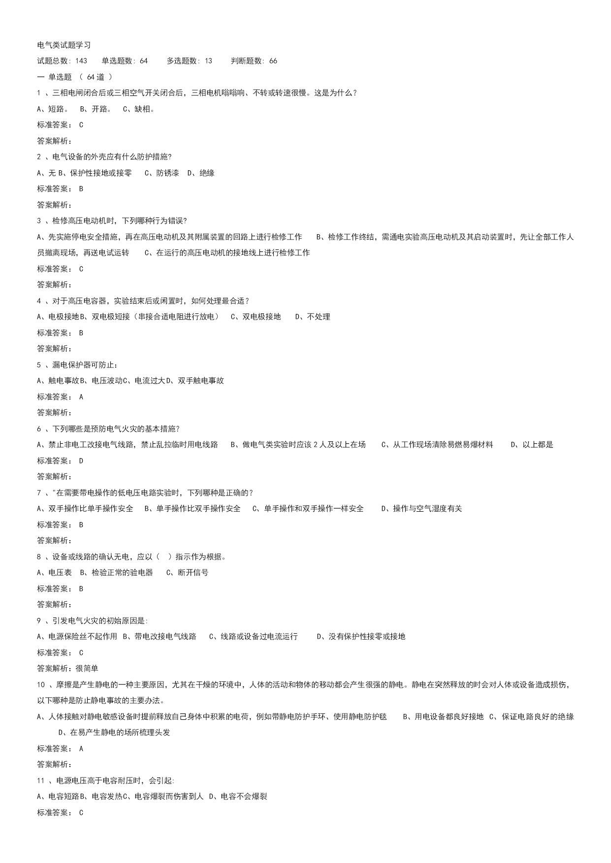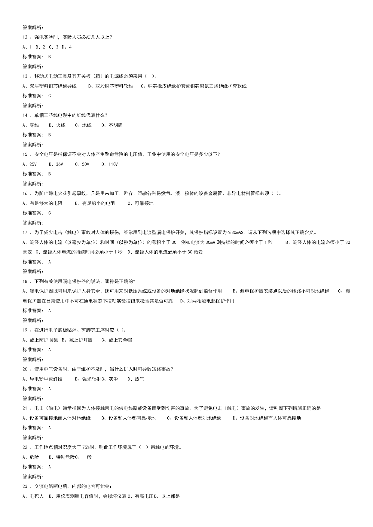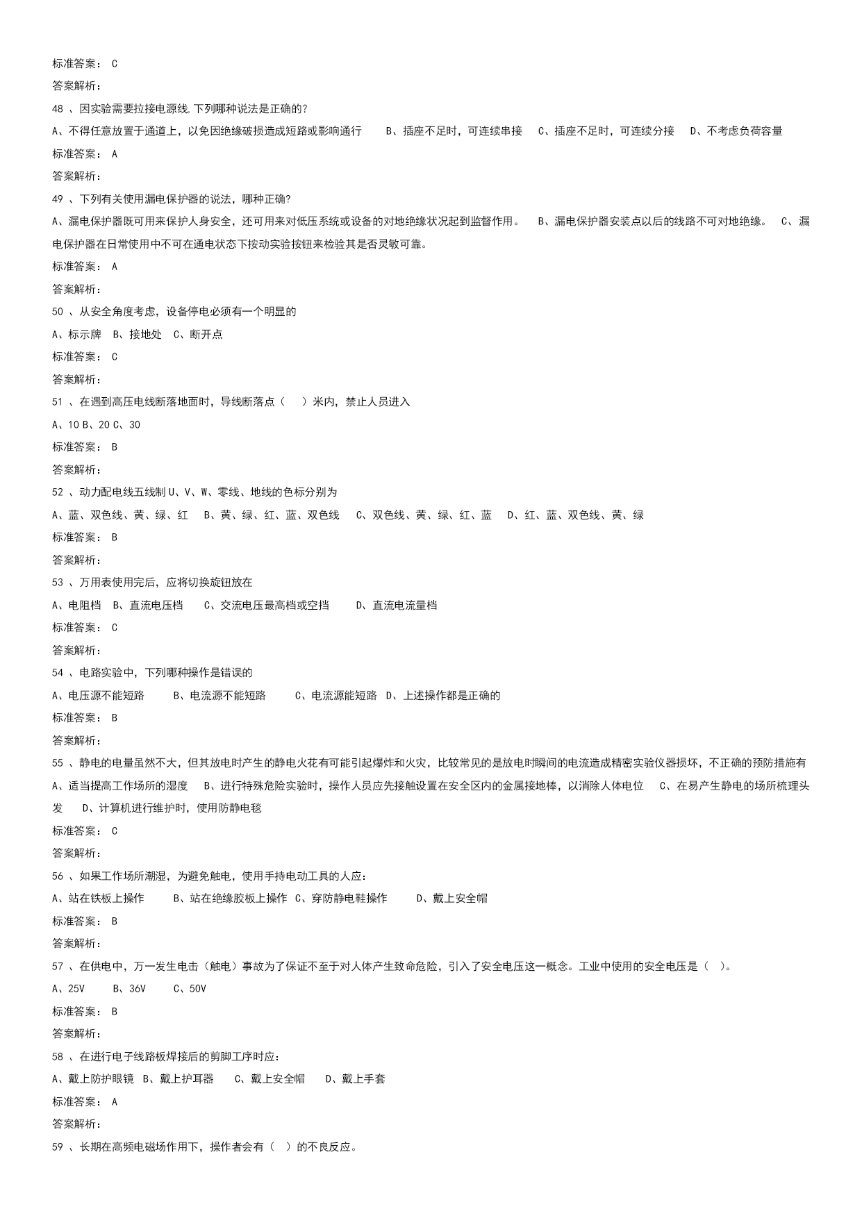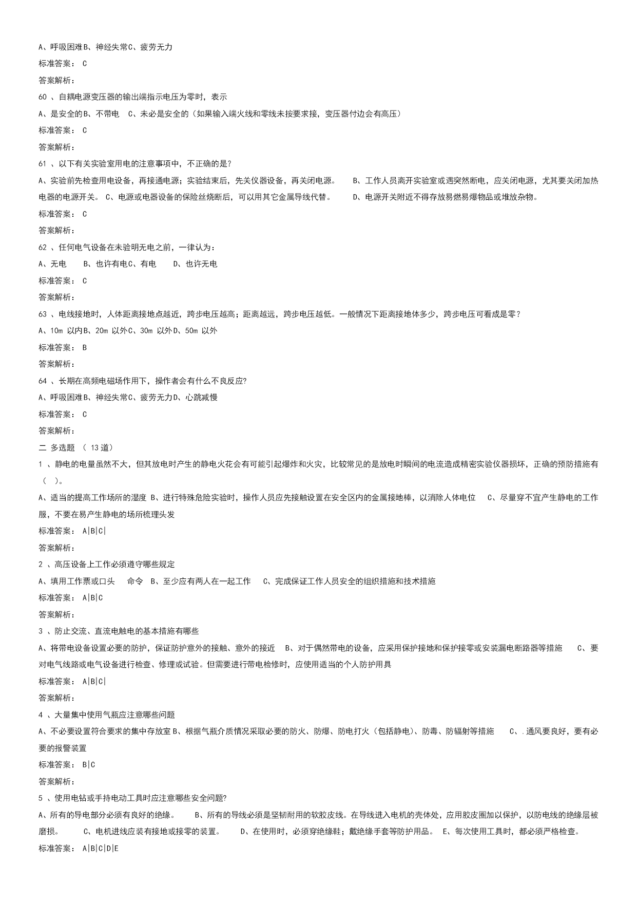 实验室安全学习真题优质资料(可以直接使用,可编辑优质资料,欢迎下载)电气类试题学习试题总数:143单选题数:64多选题数:13判断题数:66一单选题(64道)1、三相电闸闭合后或三相空气开关闭合后,三相电机嗡嗡响、不转或转速很慢。这是为什么?A、短路。B、开路。C、缺相。标准答案:C答案解析:2、电气设备的外壳应有什么防护措施?A、无B、保护性接地或接零C、防锈漆D、绝缘标准答案:B答案解析:3、检修高压电动机时,下列哪种行为错误?A、先实施停电安全措施,再在高压电动机及其附属装置的回路上进行检修工作B、检修工作终结,需通电实验高压电动机及其启动装置时,先让全部工作人员撤离现场,再送电试运转C、在运行的高压电动机的接地线上进行检修工作标准答案:C答案解析:4、对于高压电容器,实验结束后或闲置时,如何处理最合适?A、电极接地B、双电极短接(串接合适电阻进行放电)C、双电极接地D、不处理标准答案:B答案解析:5、漏电保护器可防止:A、触电事故B、电压波动C、电流过大D、双手触电事故标准答案:A答案解析:6、下列哪些是预防电气火灾的基本措施?A、禁止非电工改接电气线路,禁止乱拉临时用电线路B、做电气类实验时应该2人及以上在场C、从工作现场清除易燃易爆材料D、以上都是标准答案:D答案解析:7、"在需要带电操作的低电压电路实验时,下列哪种是正确的?A、双手操作比单手操作安全B、单手操作比双手操作安全C、单手操作和双手操作一样安全D、操作与空气湿度有关标准答案:B答案解析:8、设备或线路的确认无电,应以()指示作为根据。A、电压表B、检验正常的验电器C、断开信号标准答案:B答案解析:9、引发电气火灾的初始原因是:A、电源保险丝不起作用B、带电改接电气线路C、线路或设备过电流运行D、没有保护性接零或接地标准答案:C答案解析:很简单10、摩擦是产生静电的一种主要原因,尤其在干燥的环境中,人体的活动和物体的移动都会产生很强的静电。静电在突然释放的时会对人体或设备造成损伤,以下哪种是防止静电事故的主要办法。A、人体接触对静电敏感设备时提前释放自己身体中积累的电荷,例如带静电防护手环、使用静电防护毯B、用电设备都良好接地C、保证电路良好的绝缘D、在易产生静电的场所梳理头发标准答案:A答案解析:11、电源电压高于电容耐压时,会引起:A、电容短路B、电容发热C、电容爆裂而伤害到人D、电容不会爆裂标准答案:C答案解析:12、强电实验时,实验人员必须几人以上?A、1B、2C、3D、4标准答案:B答案解析:13、移动式电动工具及其开关板(箱)的电源线必须采用()。A、双层塑料铜芯绝缘导线B、双股铜芯塑料软线C、铜芯橡皮绝缘护套或铜芯聚氯乙烯绝缘护套软线标准答案:C答案解析:14、单相三芯线电缆中的红线代表什么?A、零线B、火线C、地线D、不明确标准答案:B答案解析:15、安全电压是指保证不会对人体产生致命危险的电压值,工业中使用的安全电压是多少以下?A、25VB、36VC、50VD、110V标准答案:B答案解析:16、为防止静电火花引起事故,凡是用来加工、贮存、运输各种易燃气、液、粉体的设备金属管、非导电材料管都必须()。A、有足够大的电阻B、有足够小的电阻C、可靠接地标准答案:C答案解析:17、为了减少电击(触电)事故对人体的损伤,经常用到电流型漏电保护开关,其保护指标设置为≤30mAS。请从下列选项中选择其正确含义。A、流经人体的电流(以毫安为单位)和时间(以秒为单位)的乘积小于30。例如电流为30mA则持续的时间必须小于1秒B、流经人体的电流必须小于30毫安C、流经人体电流的持续时间必须小于1秒D、流经人体的电流必须小于30微安标准答案:A答案解析:18、下列有关使用漏电保护器的说法,哪种是正确的?A、漏电保护器既可用来保护人身安全,还可用来对低压系统或设备的对地绝缘状况起到监督作用B、漏电保护器安装点以后的线路不可对地绝缘C、漏电保护器在日常使用中不可在通电状态下按动实验按钮来检验其是否可靠D、对两相触电起保护作用标准答案:A答案解析:19、在进行电子底板贴焊、剪脚等工序时应()。A、戴上防护眼镜B、戴上护耳器C、戴上安全帽标准答案:A答案解析:20、使用电气设备时,由于维护不及时,当什么进入时可导致短路事故?A、导电粉尘或纤维B、强光辐射C、灰尘D、热气标准答案:A答案解析:21、电击(触电)通常指因为人体接触带电的供电线路或设备而受到伤害的事故。为了避免电击(触电)