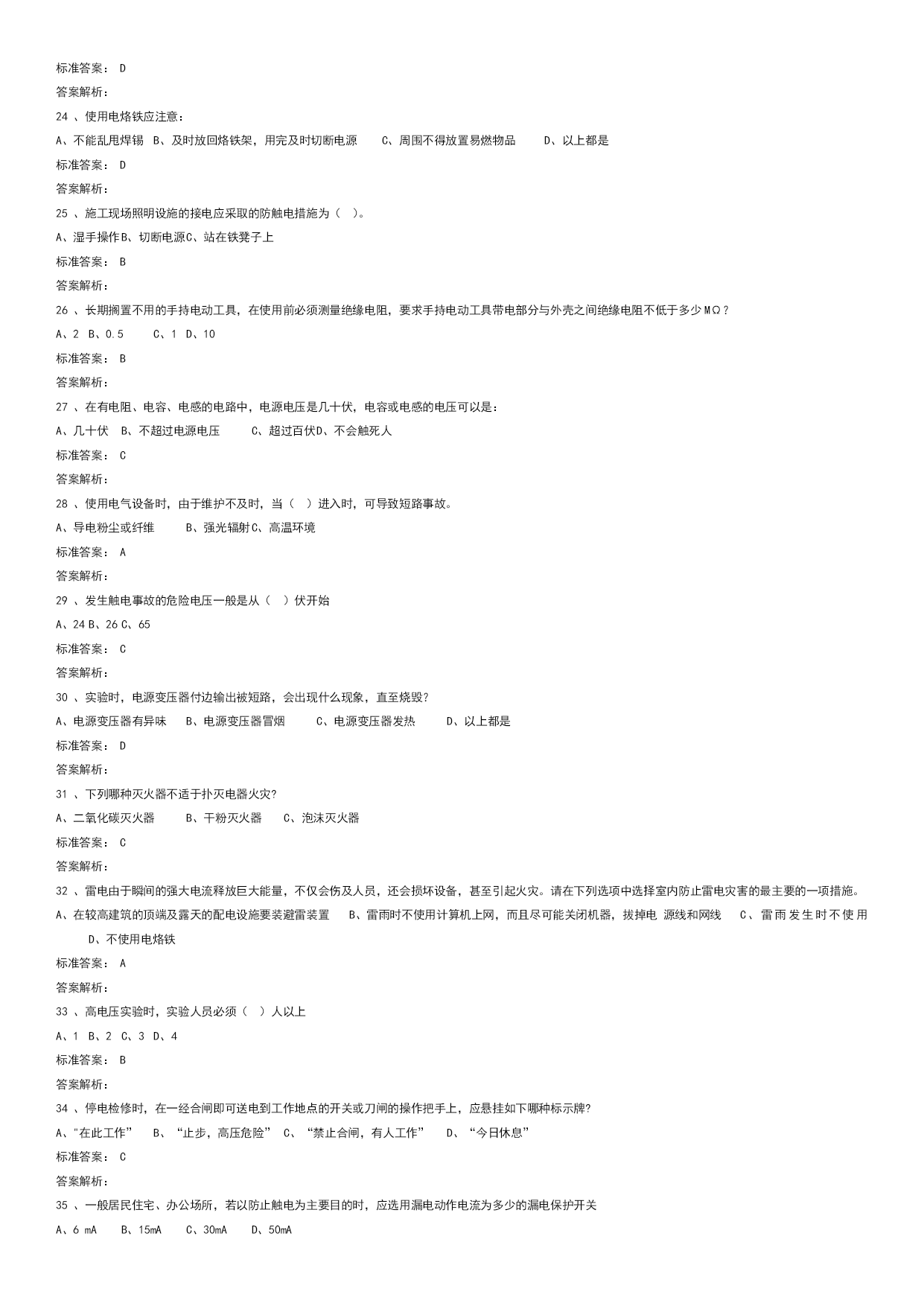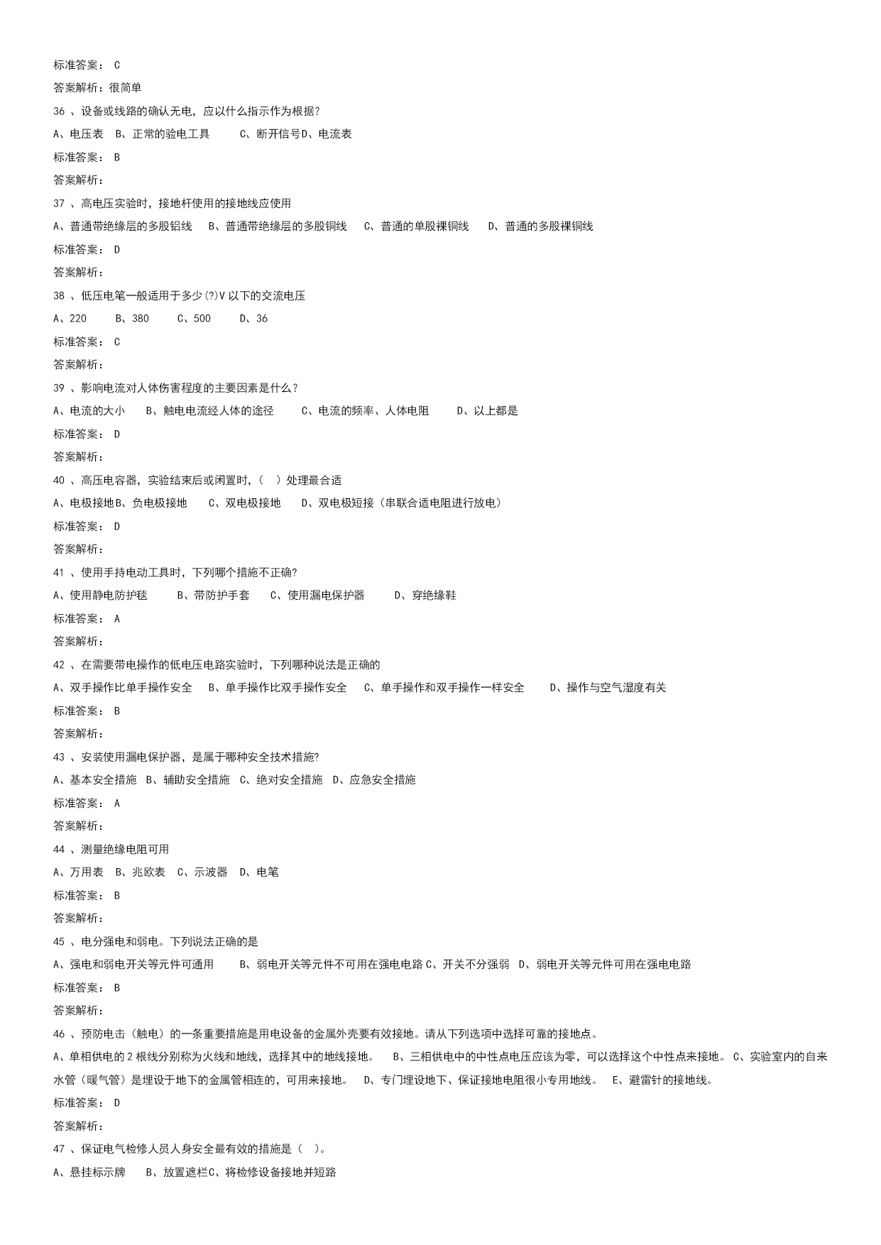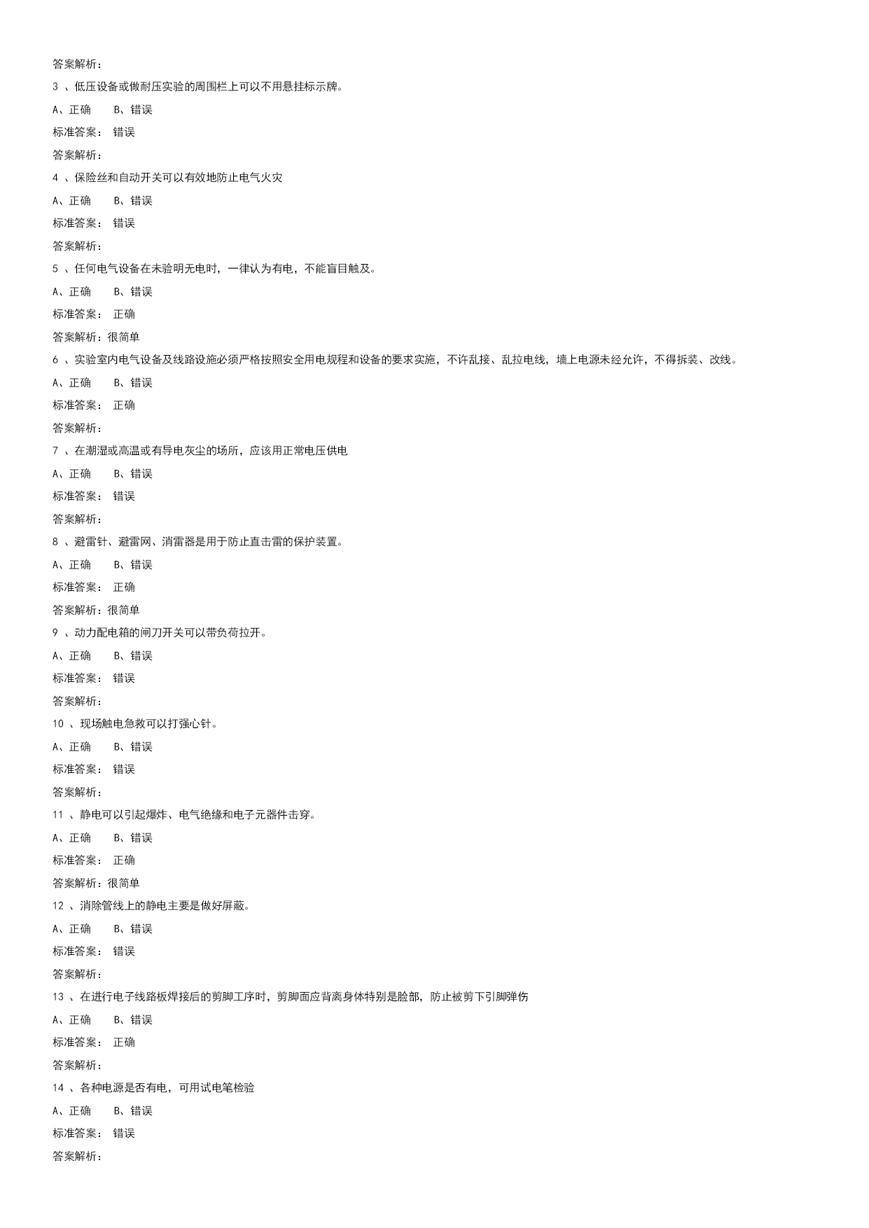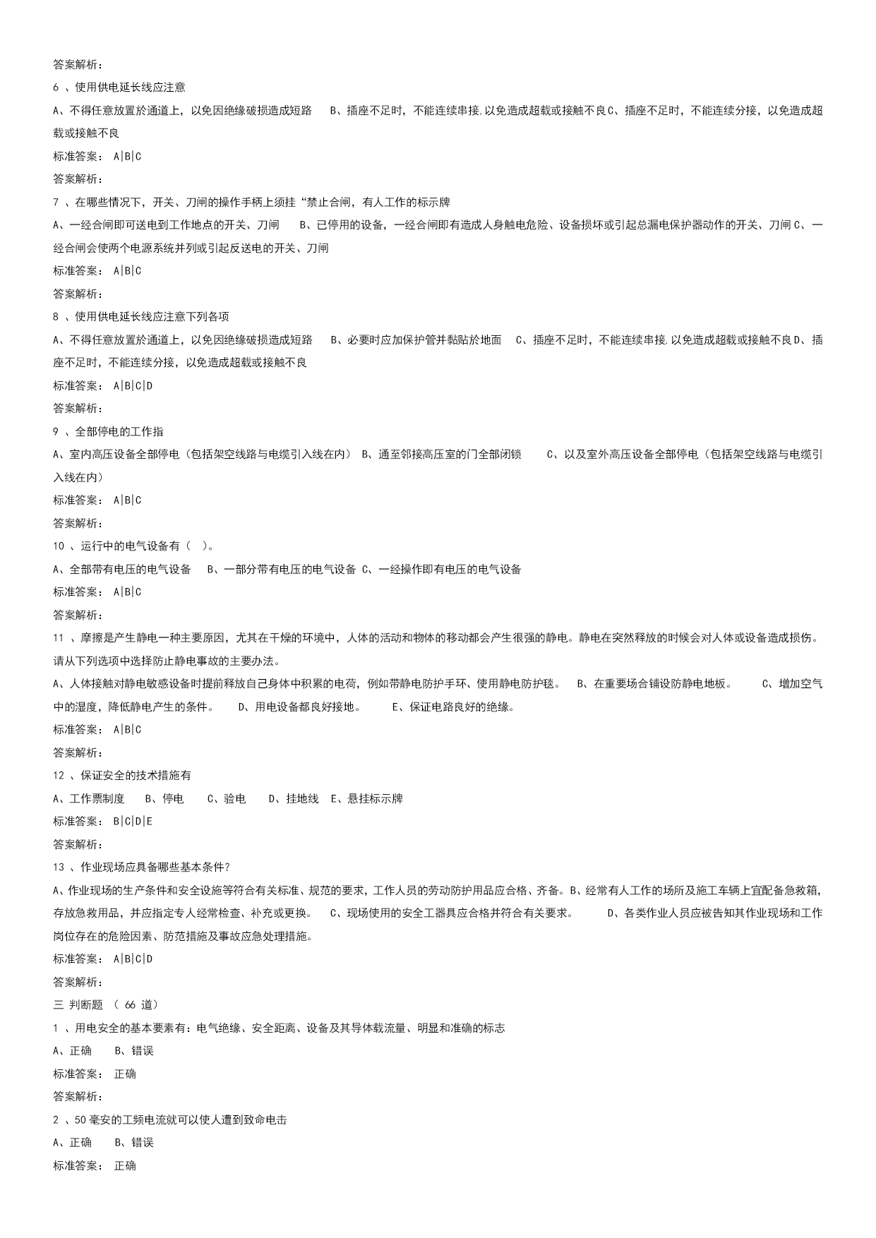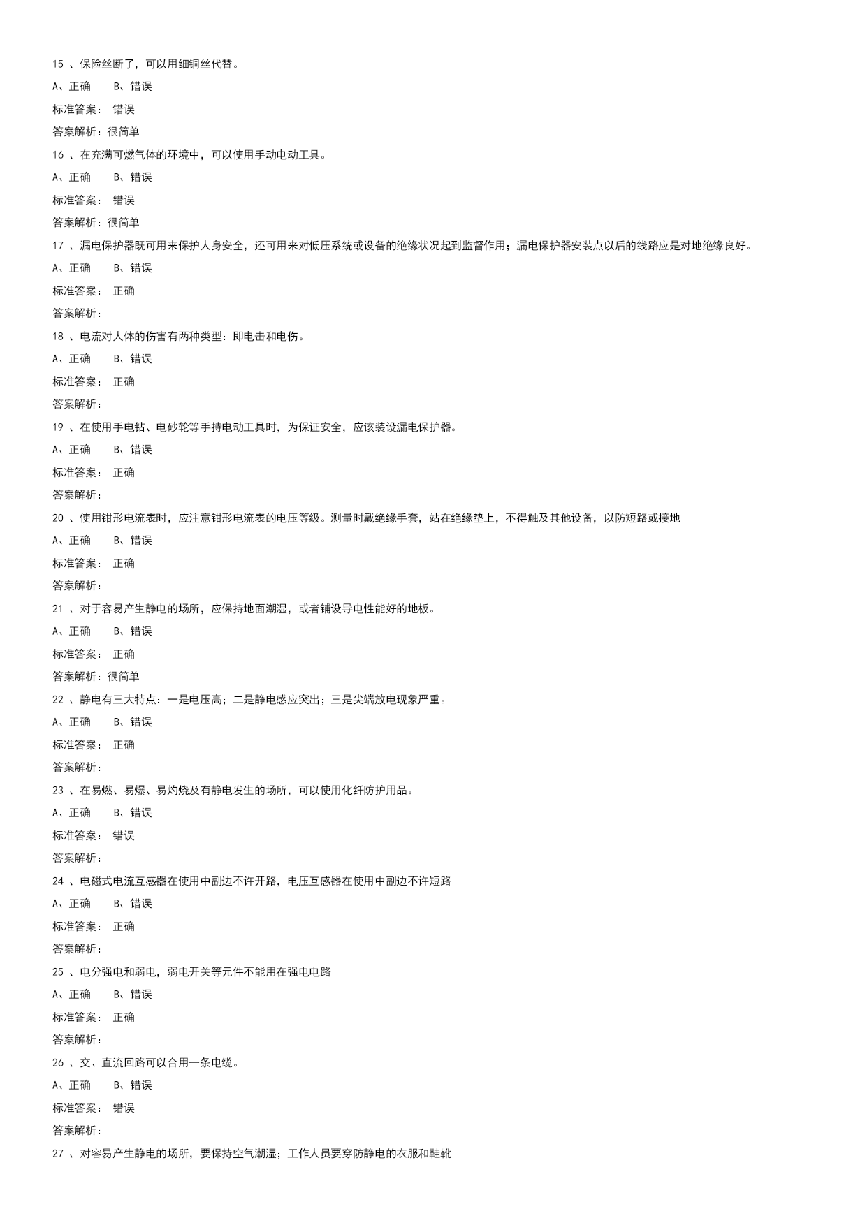 实验室安全学习真题优质资料(可以直接使用,可编辑优质资料,欢迎下载)电气类试题学习试题总数:143单选题数:64多选题数:13判断题数:66一单选题(64道)1、三相电闸闭合后或三相空气开关闭合后,三相电机嗡嗡响、不转或转速很慢。这是为什么?A、短路。B、开路。C、缺相。标准答案:C答案解析:2、电气设备的外壳应有什么防护措施?A、无B、保护性接地或接零C、防锈漆D、绝缘标准答案:B答案解析:3、检修高压电动机时,下列哪种行为错误?A、先实施停电安全措施,再在高压电动机及其附属装置的回路上进行检修工作B、检修工作终结,需通电实验高压电动机及其启动装置时,先让全部工作人员撤离现场,再送电试运转C、在运行的高压电动机的接地线上进行检修工作标准答案:C答案解析:4、对于高压电容器,实验结束后或闲置时,如何处理最合适?A、电极接地B、双电极短接(串接合适电阻进行放电)C、双电极接地D、不处理标准答案:B答案解析:5、漏电保护器可防止:A、触电事故B、电压波动C、电流过大D、双手触电事故标准答案:A答案解析:6、下列哪些是预防电气火灾的基本措施?A、禁止非电工改接电气线路,禁止乱拉临时用电线路B、做电气类实验时应该2人及以上在场C、从工作现场清除易燃易爆材料D、以上都是标准答案:D答案解析:7、"在需要带电操作的低电压电路实验时,下列哪种是正确的?A、双手操作比单手操作安全B、单手操作比双手操作安全C、单手操作和双手操作一样安全D、操作与空气湿度有关标准答案:B答案解析:8、设备或线路的确认无电,应以()指示作为根据。A、电压表B、检验正常的验电器C、断开信号标准答案:B答案解析:9、引发电气火灾的初始原因是:A、电源保险丝不起作用B、带电改接电气线路C、线路或设备过电流运行D、没有保护性接零或接地标准答案:C答案解析:很简单10、摩擦是产生静电的一种主要原因,尤其在干燥的环境中,人体的活动和物体的移动都会产生很强的静电。静电在突然释放的时会对人体或设备造成损伤,以下哪种是防止静电事故的主要办法。A、人体接触对静电敏感设备时提前释放自己身体中积累的电荷,例如带静电防护手环、使用静电防护毯B、用电设备都良好接地C、保证电路良好的绝缘D、在易产生静电的场所梳理头发标准答案:A答案解析:11、电源电压高于电容耐压时,会引起:A、电容短路B、电容发热C、电容爆裂而伤害到人D、电容不会爆裂标准答案:C答案解析:12、强电实验时,实验人员必须几人以上?A、1B、2C、3D、4标准答案:B答案解析:13、移动式电动工具及其开关板(箱)的电源线必须采用()。A、双层塑料铜芯绝缘导线B、双股铜芯塑料软线C、铜芯橡皮绝缘护套或铜芯聚氯乙烯绝缘护套软线标准答案:C答案解析:14、单相三芯线电缆中的红线代表什么?A、零线B、火线C、地线D、不明确标准答案:B答案解析:15、安全电压是指保证不会对人体产生致命危险的电压值,工业中使用的安全电压是多少以下?A、25VB、36VC、50VD、110V标准答案:B答案解析:16、为防止静电火花引起事故,凡是用来加工、贮存、运输各种易燃气、液、粉体的设备金属管、非导电材料管都必须()。A、有足够大的电阻B、有足够小的电阻C、可靠接地标准答案:C答案解析:17、为了减少电击(触电)事故对人体的损伤,经常用到电流型漏电保护开关,其保护指标设置为≤30mAS。请从下列选项中选择其正确含义。A、流经人体的电流(以毫安为单位)和时间(以秒为单位)的乘积小于30。例如电流为30mA则持续的时间必须小于1秒B、流经人体的电流必须小于30毫安C、流经人体电流的持续时间必须小于1秒D、流经人体的电流必须小于30微安标准答案:A答案解析:18、下列有关使用漏电保护器的说法,哪种是正确的?A、漏电保护器既可用来保护人身安全,还可用来对低压系统或设备的对地绝缘状况起到监督作用B、漏电保护器安装点以后的线路不可对地绝缘C、漏电保护器在日常使用中不可在通电状态下按动实验按钮来检验其是否可靠D、对两相触电起保护作用标准答案:A答案解析:19、在进行电子底板贴焊、剪脚等工序时应()。A、戴上防护眼镜B、戴上护耳器C、戴上安全帽标准答案:A答案解析:20、使用电气设备时,由于维护不及时,当什么进入时可导致短路事故?A、导电粉尘或纤维B、强光辐射C、灰尘D、热气标准答案:A答案解析:21、电击(触电)通常指因为人体接触带电的供电线路或设备而受到伤害的事故。为了避免电击(触电)
