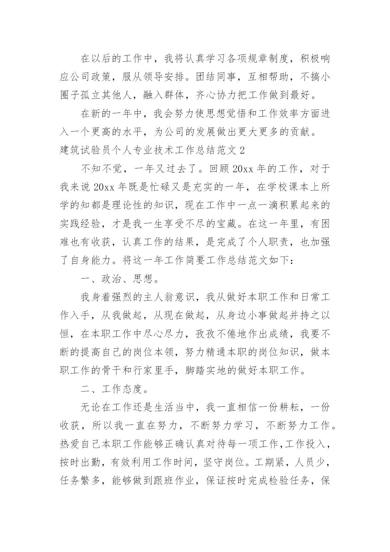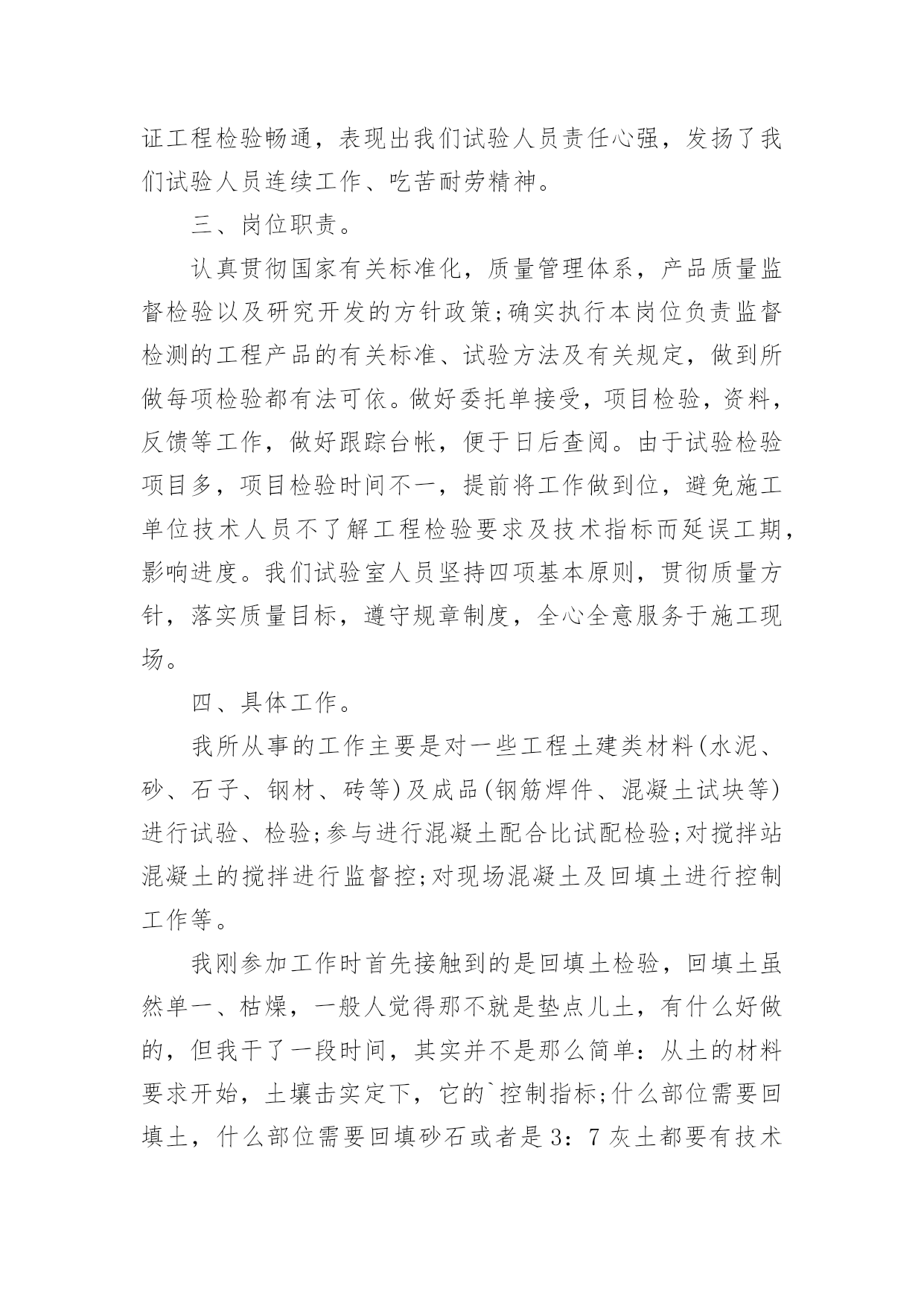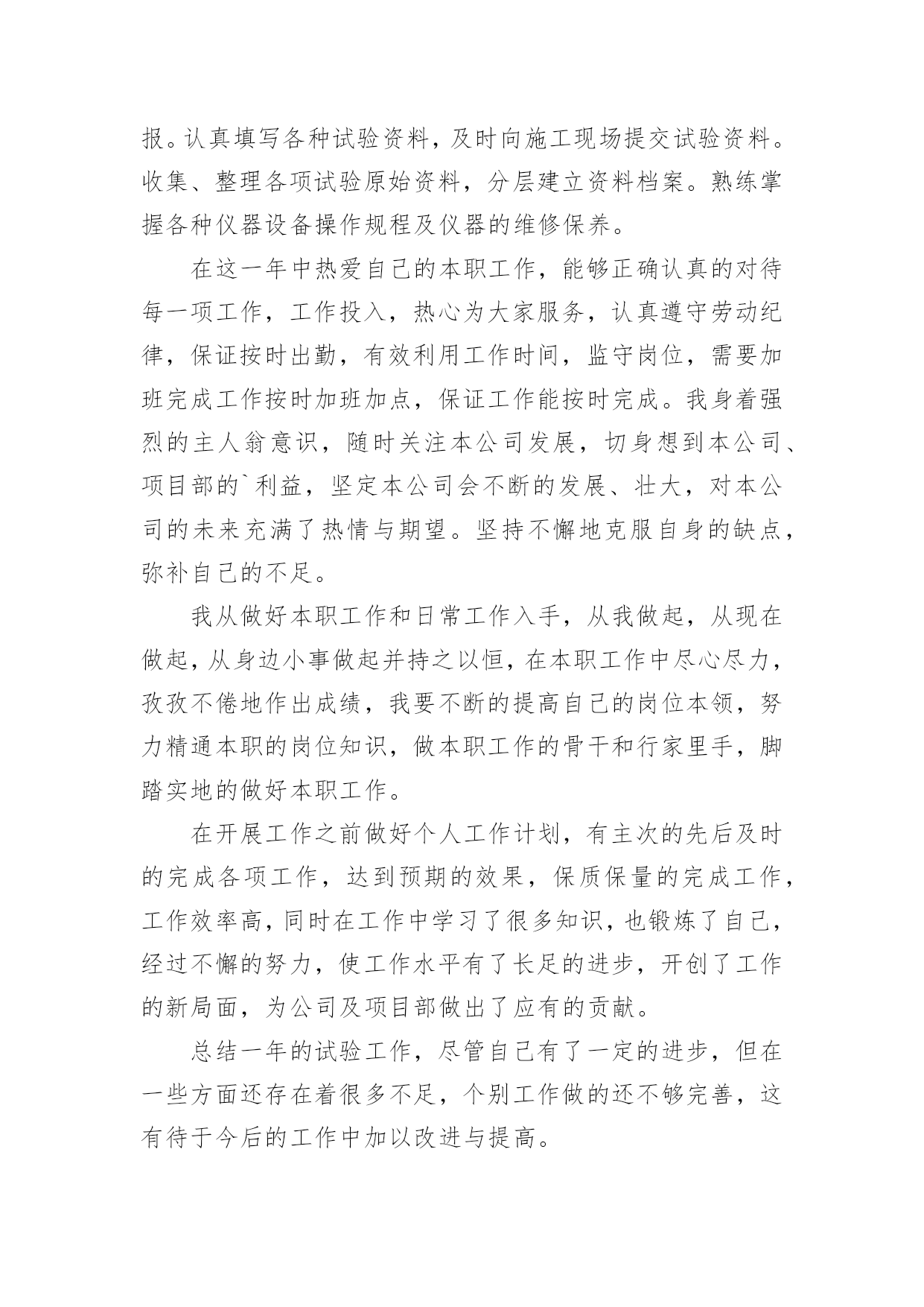 建筑试验员个人专业技术工作总结建筑试验员个人专业技术工作总结范文总结是把一定阶段内的有关情况分析研究,做出有指导性结论的书面材料,通过它可以全面地、系统地了解以往的学习和工作情况,不妨让我们认真地完成总结吧。我们该怎么去写总结呢?以下是小编整理的建筑试验员个人专业技术工作总结范文,欢迎大家借鉴与参考,希望对大家有所帮助。建筑试验员个人专业技术工作总结范文1转眼间已经工作快一年了,在项目部领导的教导与帮助下比较顺利的完成了各项工作。从对试验的一无所知,到可以独立完成试验方面的工作,少不了主任对我的教导和帮助,下面对一年工作做如下总结。在工作中热爱本职工作,遵守项目部的管理规定,服从领导工作安排。刻苦学习专业技术,工作态度端正,认真负责,在不懂的地方,要不怕麻烦向领导请教、向同事学习、自己摸索实践在很短的时间内熟悉试验的工作,熟练掌握各种试验方法和步骤。了解工程所用材料技术性能,在监理工程师指导下,严格按操作规程对工程材料进行品质指标试验鉴定。现场人员要抓好现场施工配比,矿料级配,要控制好水泥剂量、含水量,按规定进行检测及资料整理。深入施工现场,监督检查工程质量,发现问题及时纠正处理并向上汇报。认真填写各种试验资料,及时向施工现场提交试验资料。收集、整理各项试验原始资料,分层建立资料档案。熟练掌握各种仪器设备操作规程及仪器的维修保养。在这一年中热爱自己的本职工作,能够正确认真的对待每一项工作,工作投入,热心为大家服务,认真遵守劳动纪律,保证按时出勤,有效利用工作时间,监守岗位,需要加班完成工作按时加班加点,保证工作能按时完成。我身着强烈的主人翁意识,随时关注本公司发展,切身想到本公司、项目部的`利益,坚定本公司会不断的发展、壮大,对本公司的未来充满了热情与期望。坚持不懈地克服自身的缺点,弥补自己的不足。我从做好本职工作和日常工作入手,从我做起,从现在做起,从身边小事做起并持之以恒,在本职工作中尽心尽力,孜孜不倦地作出成绩,我要不断的提高自己的岗位本领,努力精通本职的岗位知识,做本职工作的骨干和行家里手,脚踏实地的做好本职工作。在开展工作之前做好个人工作计划,有主次的先后及时的完成各项工作,达到预期的效果,保质保量的完成工作,工作效率高,同时在工作中学习了很多知识,也锻炼了自己,经过不懈的努力,使工作水平有了长足的进步,开创了工作的新局面,为公司及项目部做出了应有的贡献。总结一年的试验工作,尽管自己有了一定的进步,但在一些方面还存在着很多不足,个别工作做的还不够完善,这有待于今后的工作中加以改进与提高。在以后的工作中,我将认真学习各项规章制度,积极响应公司政策,服从领导安排。团结同事,互相帮助,不搞小圈子孤立其他人,融入群体,齐心协力把工作做到最好。在新的一年中,我会努力使思想觉悟和工作效率方面进入一个更高的水平,为公司的发展做出更大更多的贡献。建筑试验员个人专业技术工作总结范文2不知不觉,一年又过去了。回顾20xx年的工作,对于我来说20xx年既是忙碌又是充实的一年,在学校课本上所学的知都是理论性的知识,现在工作中一点一滴积累起来的实践经验,才是我一生享受不尽的宝藏。在这一年里,有困难也有收获,认真工作的结果,是完成了个人职责,也加强了自身能力。将这一年工作简要工作总结范文如下:一、政治、思想。我身着强烈的主人翁意识,我从做好本职工作和日常工作入手,从我做起,从现在做起,从身边小事做起并持之以恒,在本职工作中尽心尽力,孜孜不倦地作出成绩,我要不断的提高自己的岗位本领,努力精通本职的岗位知识,做本职工作的骨干和行家里手,脚踏实地的做好本职工作。二、工作态度。无论在工作还是生活当中,我一直相信一份耕耘,一份收获,所以我一直在努力,不断努力学习,不断努力工作。热爱自己本职工作能够正确认真对待每一项工作,工作投入,按时出勤,有效利用工作时间,坚守岗位。工期紧,人员少,任务繁多,能够做到跟班作业,保证按时完成检验任务,保证工程检验畅通,表现出我们试验人员责任心强,发扬了我们试验人员连续工作、吃苦耐劳精神。三、岗位职责。认真贯彻国家有关标准化,质量管理体系,产品质量监督检验以及研究开发的方针政策;确实执行本岗位负责监督检测的工程产品的有关标准、试验方法及有关规定,做到所做每项检验都有法可依。做好委托单接受,项目检验,资料,反馈等工作,做好跟踪台帐,便于日后查阅。由于试验检验项目多,项目检验时间不一,提前将工作做到位,避免施工单位技术人员不了解工程检验要求及技术指标而延误工期,影响进度。我们试验室人员坚持四项基本原则,贯彻质量方针,落实质量目标,遵守规章制度,全心全意服务于施工现场。四、具体工作。我所从事的工作主要是对一些工程土建类材料(水泥、砂、石子、钢材、砖等)及成品(钢筋焊件、混凝土试块等)进行试验、检验;参与进行混凝土配合比试配检验