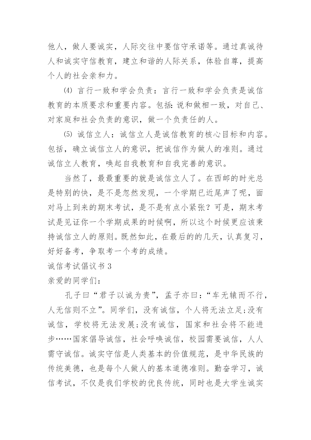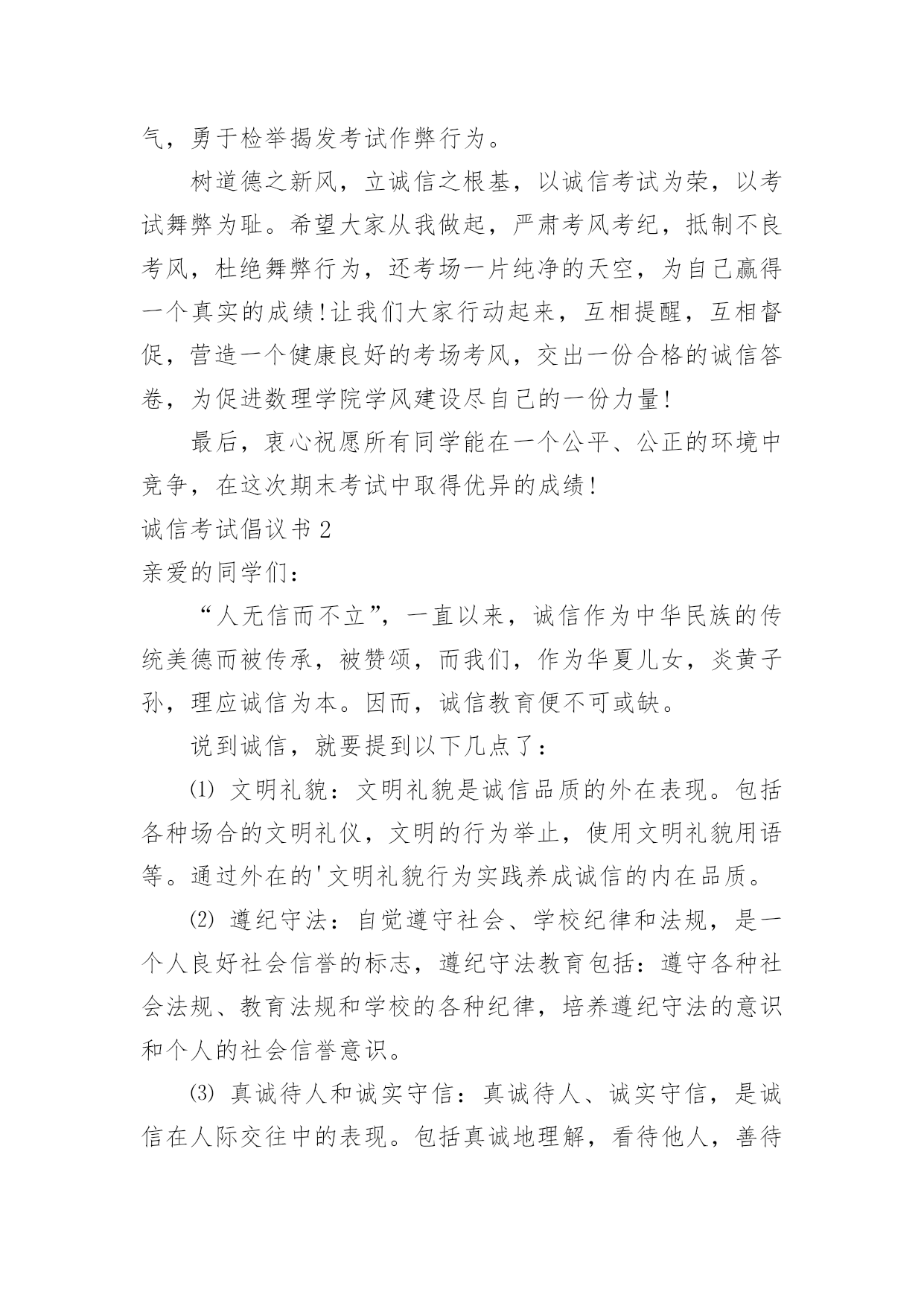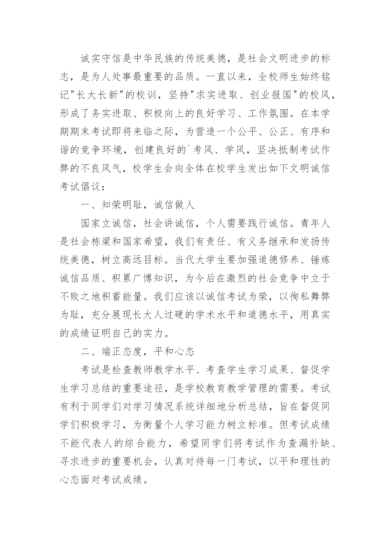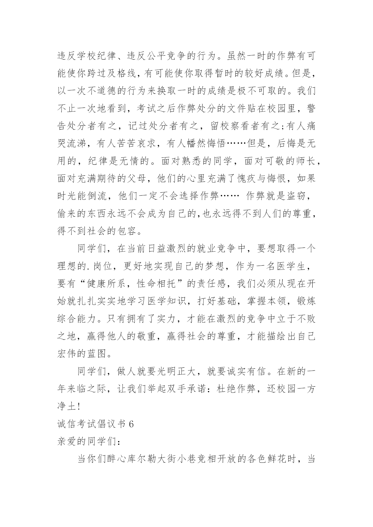 诚信考试倡议书诚信考试倡议书在不断进步的时代,倡议书应用范围愈来愈广泛,倡议书具有公开性的特征,是一种广而告之的书信。来参考自己需要的倡议书吧!下面是小编收集整理的诚信考试倡议书,希望能够帮助到大家。诚信考试倡议书1亲爱的同学们:诚实守信是中华民族的传统美德,是我们每个人的立身之本。时光飞逝,转眼一学期的学习又将告一段落,我们也迎来了20xx—20xx学年度第一学期期末考试,我们要面临的既是一次学习成果的检阅,更是一场道德与诚信的考验。在此,数理学院学生会郑重向广大同学倡议如下:一、排除外界干扰,积极备考。正确认识考试对评价自己的重要性。充分利用时间,认真复习,满怀信心地迎接考试。二、提高自身修养,做一名诚信学生。我们要以诚信的'态度对待每一场考试,考出真实水平。三、严肃考风考纪,端正学习与考试的态度,严格遵守考试规章制度,实事求是,杜绝一切考试作弊形式。?四、弘扬诚信正义。树立与不良风气作斗争的信心和勇气,勇于检举揭发考试作弊行为。树道德之新风,立诚信之根基,以诚信考试为荣,以考试舞弊为耻。希望大家从我做起,严肃考风考纪,抵制不良考风,杜绝舞弊行为,还考场一片纯净的天空,为自己赢得一个真实的成绩!让我们大家行动起来,互相提醒,互相督促,营造一个健康良好的考场考风,交出一份合格的诚信答卷,为促进数理学院学风建设尽自己的一份力量!最后,衷心祝愿所有同学能在一个公平、公正的环境中竞争,在这次期末考试中取得优异的成绩!诚信考试倡议书2亲爱的同学们:“人无信而不立”,一直以来,诚信作为中华民族的传统美德而被传承,被赞颂,而我们,作为华夏儿女,炎黄子孙,理应诚信为本。因而,诚信教育便不可或缺。说到诚信,就要提到以下几点了:⑴文明礼貌:文明礼貌是诚信品质的外在表现。包括各种场合的文明礼仪,文明的行为举止,使用文明礼貌用语等。通过外在的'文明礼貌行为实践养成诚信的内在品质。⑵遵纪守法:自觉遵守社会、学校纪律和法规,是一个人良好社会信誉的标志,遵纪守法教育包括:遵守各种社会法规、教育法规和学校的各种纪律,培养遵纪守法的意识和个人的社会信誉意识。⑶真诚待人和诚实守信:真诚待人、诚实守信,是诚信在人际交往中的表现。包括真诚地理解,看待他人,善待他人,做人要诚实,人际交往中要信守承诺等。通过真诚待人和诚实守信教育,建立和谐的人际关系,体验自尊,提高个人的社会亲和力。⑷言行一致和学会负责:言行一致和学会负责是诚信教育的本质要求和重要内容。包括:说和做相一致,对自己、对家庭和社会负责的意识,做一个负责任的人。⑸诚信立人:诚信立人是诚信教育的核心目标和内容。包括,确立诚信立人的意识,把诚信作为做人的准则。通过诚信立人教育,唤起自我教育和自我完善的意识。当然了,最最重要的就是诚信立人了。在西邮的时光总是特别的快,是不是忽然发现,一个学期已近尾声了呢,面对马上到来的期末考试,是不是有点小紧张?可是,期末考试是见证你一个学期成果的时候啊,所以这个时候更应该秉持诚信立人的原则。既然如此,在最后的的几天,认真复习,好好备考,争取考一个考的成绩。诚信考试倡议书3亲爱的同学们:孔子曰“君子以诚为贵”,孟子亦曰:“车无辕而不行,人无信则不立”。同学们,没有诚信,个人将无法立足;没有诚信,学校将无法发展;没有诚信,国家和社会将不能进步……国家倡导诚信,社会呼唤诚信,校园需要诚信,人人需守诚信。诚实守信是人类基本的价值规范,是中华民族的传统美德,也是每个人做人的基本道德准则。勤奋学习,诚信考试,不仅是我们学校的优良传统,同时也是大学生诚实作风的最直接体现。弄虚作假,考试作弊,则是对自己实力的否定和轻视,更是对我们学校良好学风、考风的亵渎。同学们,面对考试,我们学过的知识或许可能遗忘,但我们诚信的美德和做人原则却永远不能丢弃!在此,学校政教处、团委、学生会向全校同学发出倡议:一、端正态度,正确面对考试是一个收获喜悦的时刻,也是一个接受挑战的时刻。考试既是对我们学习情况的检测,同时也是对我们学风和考风的检验。我们不但要把自己的学习成果展现给自己的老师、同学、父母,更要把道德与诚信的优秀答卷交给自己!二、认真复习,积极备考“一分耕耘,一份收获”。我们在注重平时认真学习的.同时,我们还应该科学合理地安排复习时间,认真总结每门功课的重点、难点,以及学习中所遇到的问题,有针对性地制定出复习计划,认真复习,不抱有任何侥幸心理,满怀信心地迎接考试。三、严守考纪,诚信应考“千里之行,始于足下”。良好的学风、文明的考风,应当从自己、从现在做起,努力打造诚信校园。每次考试严格遵守学校考试纪律,服从监考教师安排;严格约束不良的思想观念,坚决杜绝任何作弊行为;弘扬诚信品质,与不良风气作斗争,勇于检举和揭发考试作弊行为。亲爱的同学们,让我们共勉、互励、共进,自觉遵守学校考试纪律和有关规定,坚决杜绝