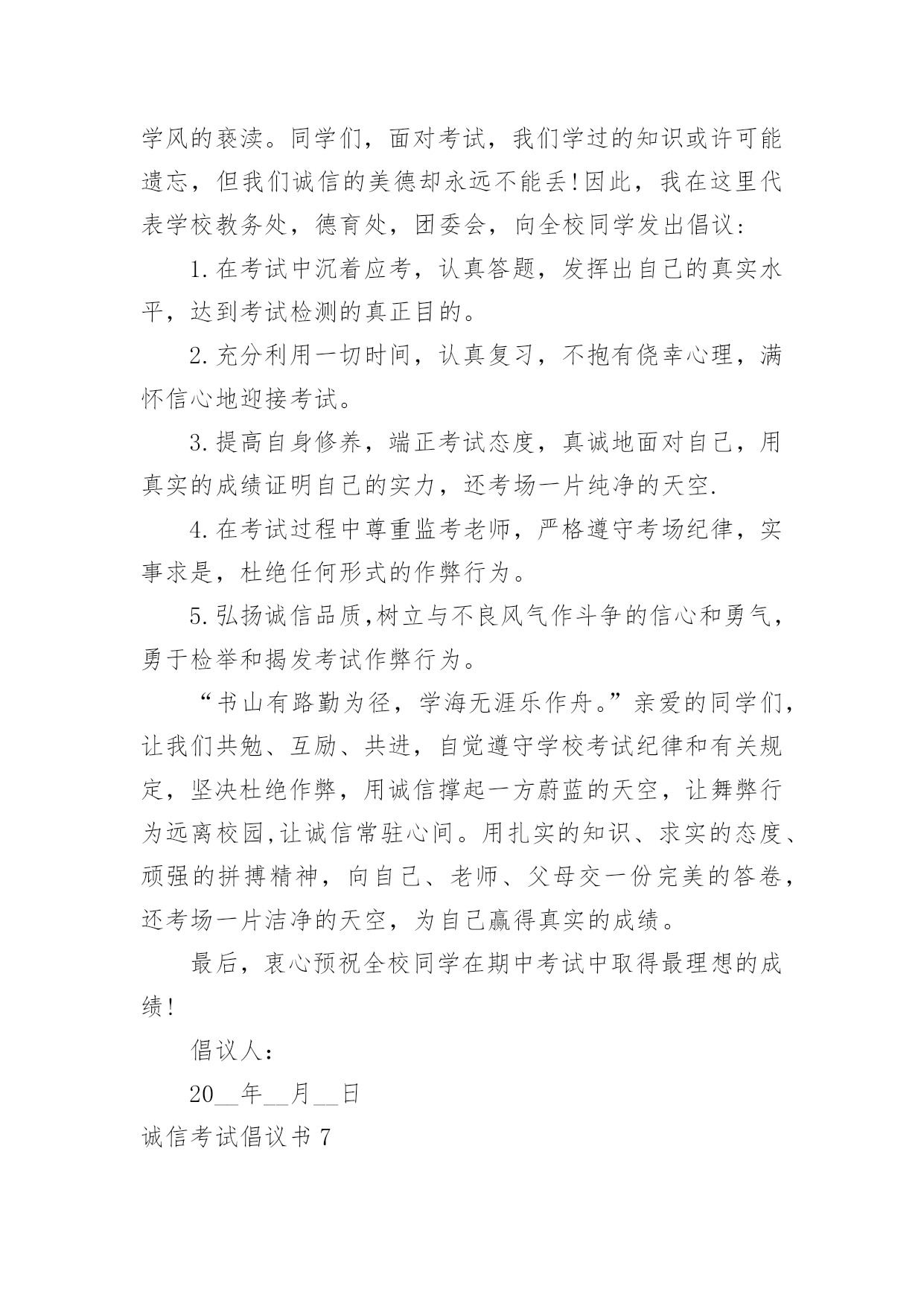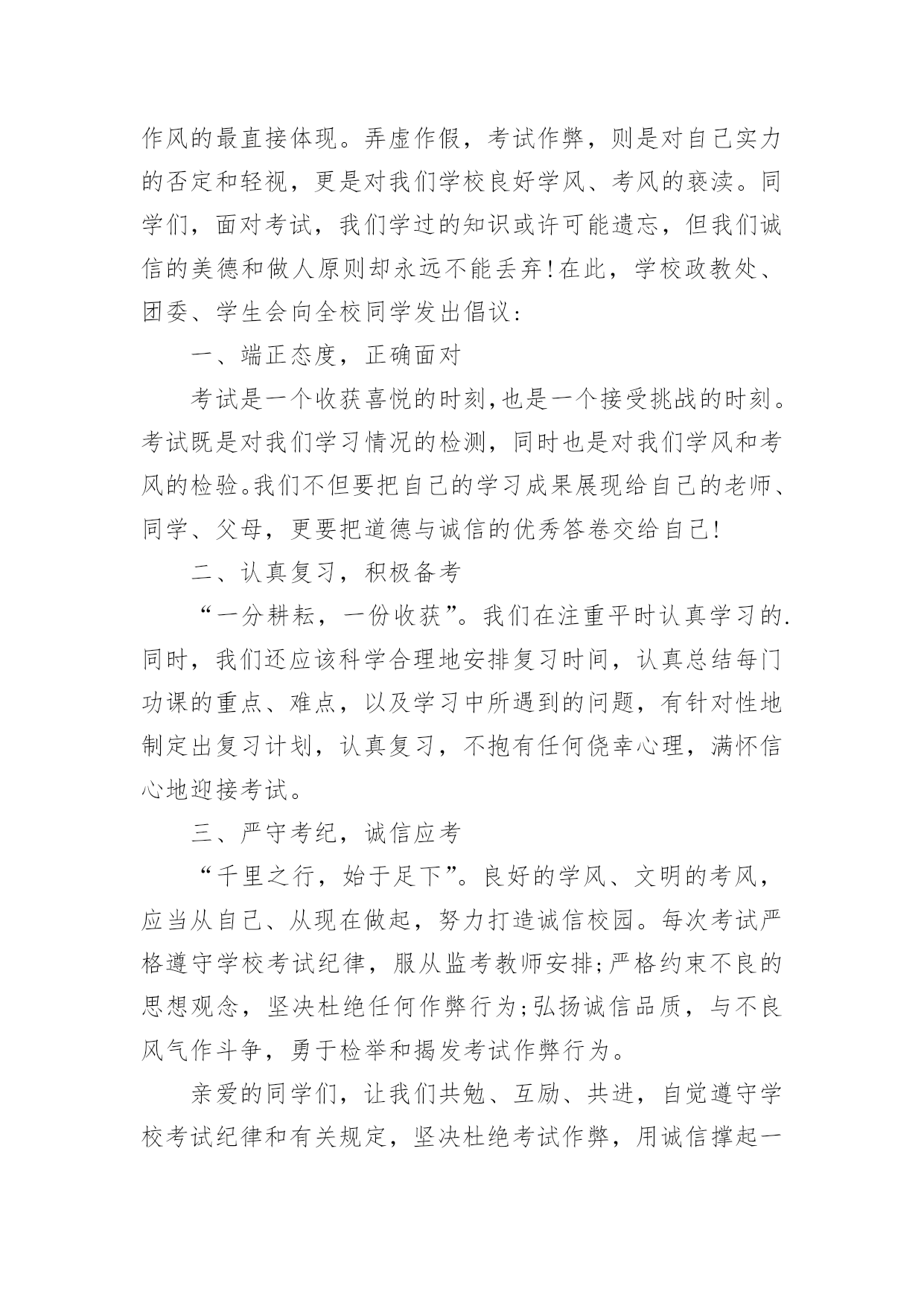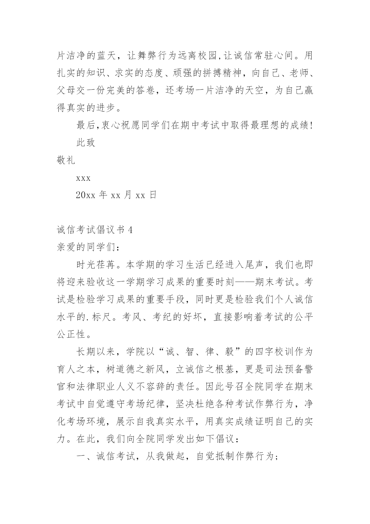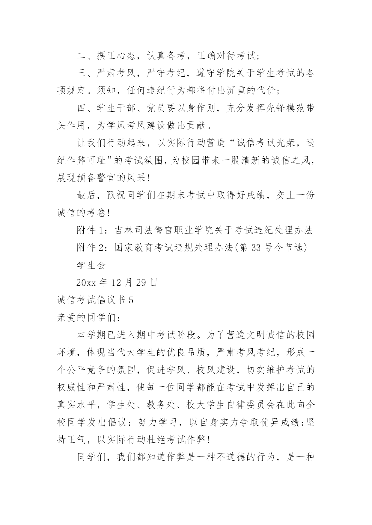 诚信考试倡议书诚信考试倡议书在不断进步的时代,倡议书应用范围愈来愈广泛,倡议书具有公开性的特征,是一种广而告之的书信。来参考自己需要的倡议书吧!下面是小编收集整理的诚信考试倡议书,希望能够帮助到大家。诚信考试倡议书1亲爱的同学们:诚实守信是中华民族的传统美德,是我们每个人的立身之本。时光飞逝,转眼一学期的学习又将告一段落,我们也迎来了20xx—20xx学年度第一学期期末考试,我们要面临的既是一次学习成果的检阅,更是一场道德与诚信的考验。在此,数理学院学生会郑重向广大同学倡议如下:一、排除外界干扰,积极备考。正确认识考试对评价自己的重要性。充分利用时间,认真复习,满怀信心地迎接考试。二、提高自身修养,做一名诚信学生。我们要以诚信的'态度对待每一场考试,考出真实水平。三、严肃考风考纪,端正学习与考试的态度,严格遵守考试规章制度,实事求是,杜绝一切考试作弊形式。?四、弘扬诚信正义。树立与不良风气作斗争的信心和勇气,勇于检举揭发考试作弊行为。树道德之新风,立诚信之根基,以诚信考试为荣,以考试舞弊为耻。希望大家从我做起,严肃考风考纪,抵制不良考风,杜绝舞弊行为,还考场一片纯净的天空,为自己赢得一个真实的成绩!让我们大家行动起来,互相提醒,互相督促,营造一个健康良好的考场考风,交出一份合格的诚信答卷,为促进数理学院学风建设尽自己的一份力量!最后,衷心祝愿所有同学能在一个公平、公正的环境中竞争,在这次期末考试中取得优异的成绩!诚信考试倡议书2亲爱的同学们:“人无信而不立”,一直以来,诚信作为中华民族的传统美德而被传承,被赞颂,而我们,作为华夏儿女,炎黄子孙,理应诚信为本。因而,诚信教育便不可或缺。说到诚信,就要提到以下几点了:⑴文明礼貌:文明礼貌是诚信品质的外在表现。包括各种场合的文明礼仪,文明的行为举止,使用文明礼貌用语等。通过外在的'文明礼貌行为实践养成诚信的内在品质。⑵遵纪守法:自觉遵守社会、学校纪律和法规,是一个人良好社会信誉的标志,遵纪守法教育包括:遵守各种社会法规、教育法规和学校的各种纪律,培养遵纪守法的意识和个人的社会信誉意识。⑶真诚待人和诚实守信:真诚待人、诚实守信,是诚信在人际交往中的表现。包括真诚地理解,看待他人,善待他人,做人要诚实,人际交往中要信守承诺等。通过真诚待人和诚实守信教育,建立和谐的人际关系,体验自尊,提高个人的社会亲和力。⑷言行一致和学会负责:言行一致和学会负责是诚信教育的本质要求和重要内容。包括:说和做相一致,对自己、对家庭和社会负责的意识,做一个负责任的人。⑸诚信立人:诚信立人是诚信教育的核心目标和内容。包括,确立诚信立人的意识,把诚信作为做人的准则。通过诚信立人教育,唤起自我教育和自我完善的意识。当然了,最最重要的就是诚信立人了。在西邮的时光总是特别的快,是不是忽然发现,一个学期已近尾声了呢,面对马上到来的期末考试,是不是有点小紧张?可是,期末考试是见证你一个学期成果的时候啊,所以这个时候更应该秉持诚信立人的原则。既然如此,在最后的的几天,认真复习,好好备考,争取考一个考的成绩。诚信考试倡议书3亲爱的同学们:孔子曰“君子以诚为贵”,孟子亦曰:“车无辕而不行,人无信则不立”。同学们,没有诚信,个人将无法立足;没有诚信,学校将无法发展;没有诚信,国家和社会将不能进步……国家倡导诚信,社会呼唤诚信,校园需要诚信,人人需守诚信。诚实守信是人类基本的价值规范,是中华民族的传统美德,也是每个人做人的基本道德准则。勤奋学习,诚信考试,不仅是我们学校的优良传统,同时也是大学生诚实作风的最直接体现。弄虚作假,考试作弊,则是对自己实力的否定和轻视,更是对我们学校良好学风、考风的亵渎。同学们,面对考试,我们学过的知识或许可能遗忘,但我们诚信的美德和做人原则却永远不能丢弃!在此,学校政教处、团委、学生会向全校同学发出倡议:一、端正态度,正确面对考试是一个收获喜悦的时刻,也是一个接受挑战的时刻。考试既是对我们学习情况的检测,同时也是对我们学风和考风的检验。我们不但要把自己的学习成果展现给自己的老师、同学、父母,更要把道德与诚信的优秀答卷交给自己!二、认真复习,积极备考“一分耕耘,一份收获”。我们在注重平时认真学习的.同时,我们还应该科学合理地安排复习时间,认真总结每门功课的重点、难点,以及学习中所遇到的问题,有针对性地制定出复习计划,认真复习,不抱有任何侥幸心理,满怀信心地迎接考试。三、严守考纪,诚信应考“千里之行,始于足下”。良好的学风、文明的考风,应当从自己、从现在做起,努力打造诚信校园。每次考试严格遵守学校考试纪律,服从监考教师安排;严格约束不良的思想观念,坚决杜绝任何作弊行为;弘扬诚信品质,与不良风气作斗争,勇于检举和揭发考试作弊行为。亲爱的同学们,让我们共勉、互励、共进,自觉遵守学校考试纪律和有关规定,坚决杜绝