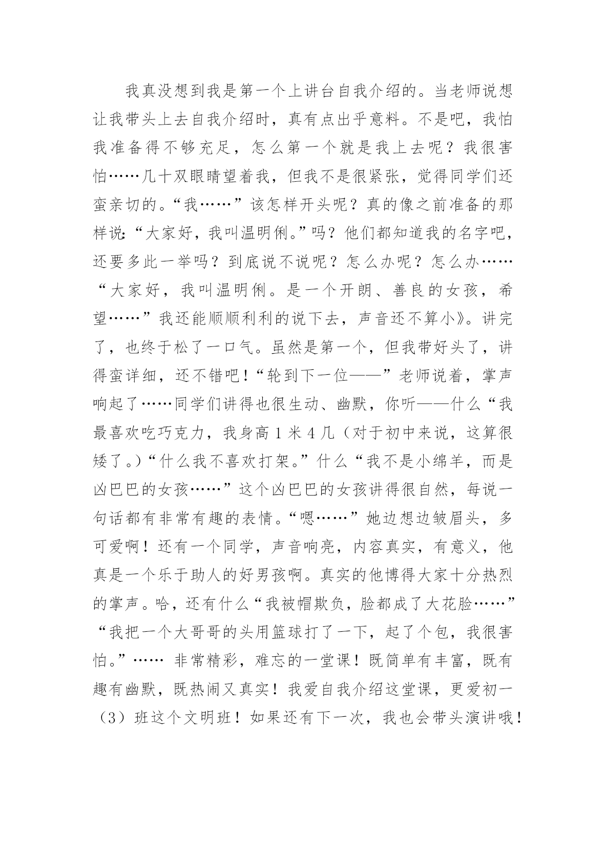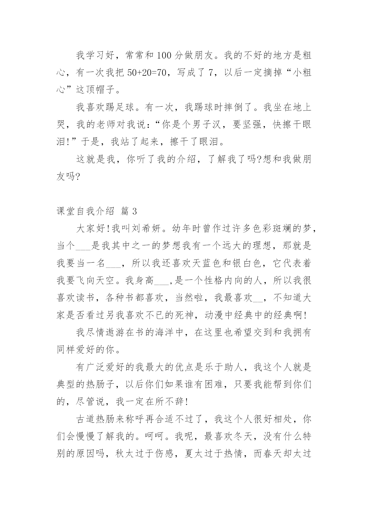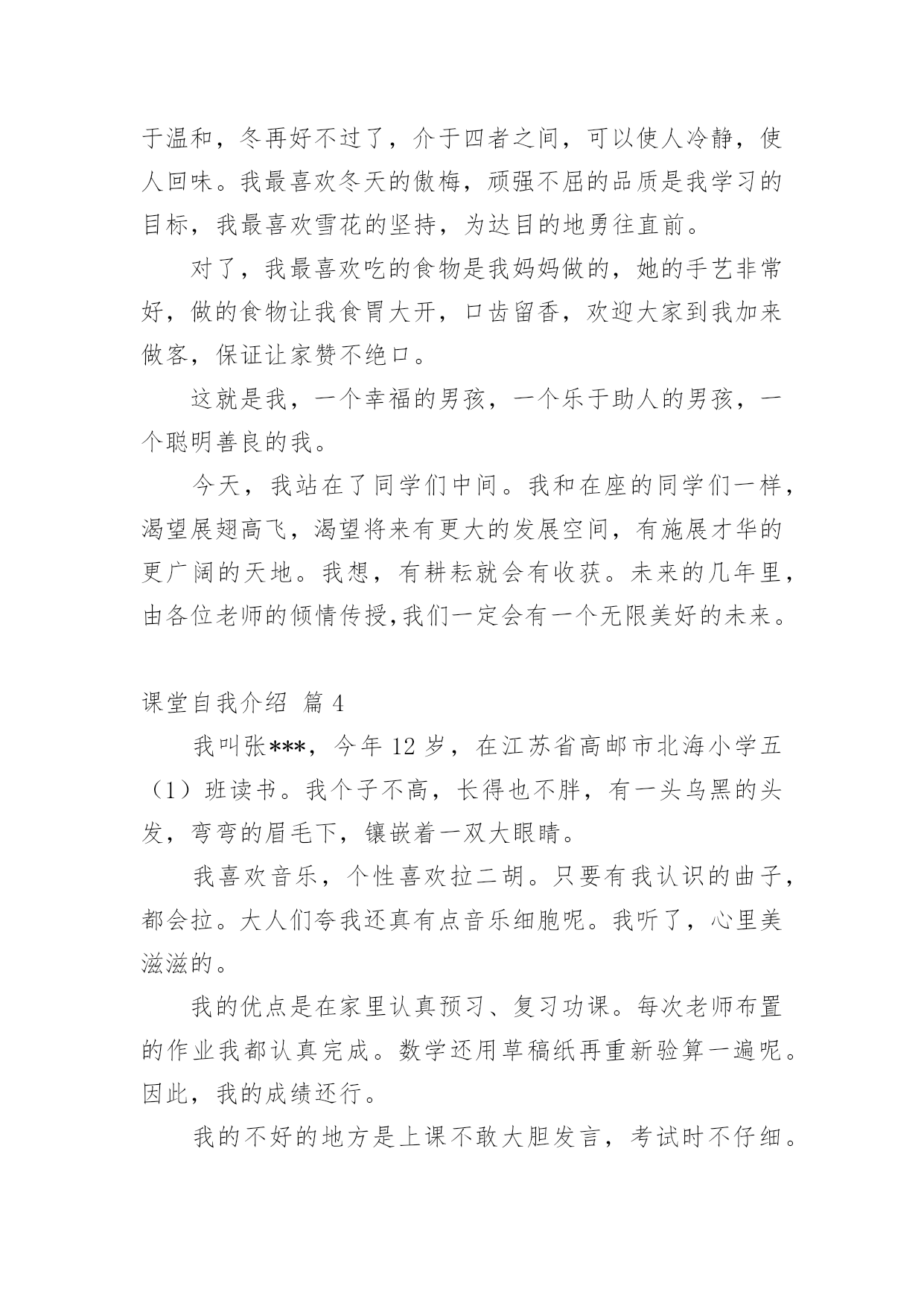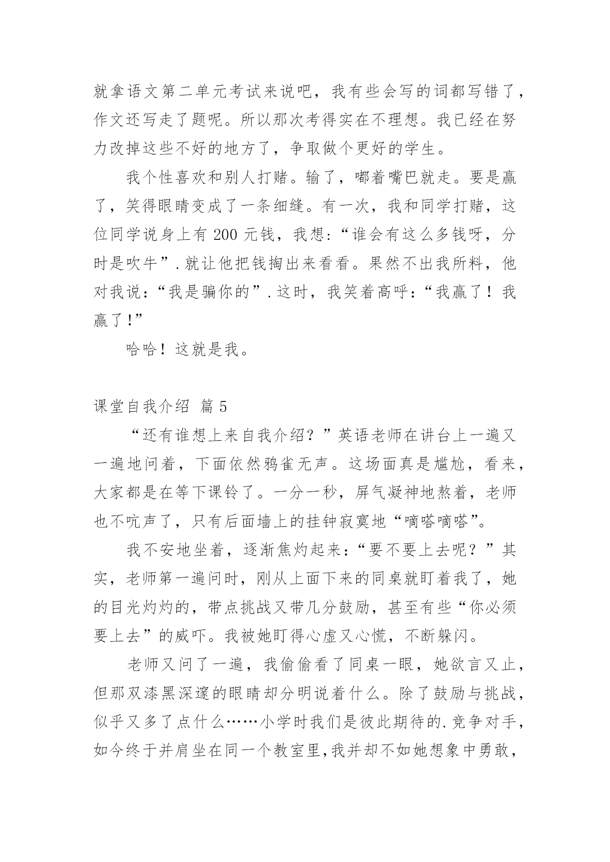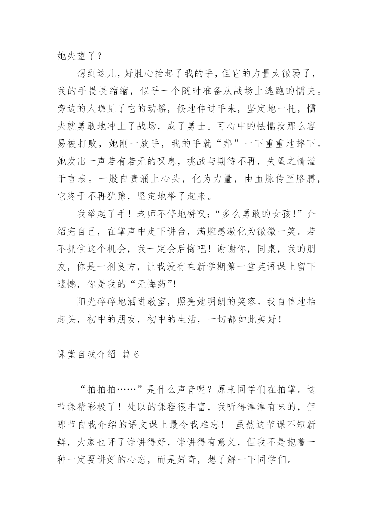 课堂自我介绍课堂自我介绍范文集合6篇当进入一个陌生环境,我们难以避免地要作出自我介绍,自我介绍是我们重新认识自己的开始。那么自我介绍要注意有什么内容呢?以下是小编帮大家整理的课堂自我介绍7篇,仅供参考,欢迎大家阅读。课堂自我介绍篇1大家好!我叫陈悦阳,今年八岁,来自美丽的金张掖。现在是西街小学一名一年级学生。我是一个爱说,爱笑,乐观、开朗的男生,擅长美术,拍篮球,背古诗,讲故事。“做父母的好孩子,做老师的好学生”是我的座右铭。我会努力争取做得更好。谢谢!课堂自我介绍篇2我叫胡金智,今年8岁。我是一个勇敢英俊的小男生,是灌云县实验小学二年级一班少先队员,我家有4口人。我有一头乌黑亮发,身高1。3米,体重25公斤,长着一双浓眉大眼,高高的鼻梁下面是一张樱桃小嘴,我喜欢穿黑色的运动服。我学习好,常常和100分做朋友。我的不好的地方是粗心,有一次我把50+20=70,写成了7,以后一定摘掉“小粗心”这顶帽子。我喜欢踢足球。有一次,我踢球时摔倒了。我坐在地上哭,我的老师对我说:“你是个男子汉,要坚强,快擦干眼泪!”于是,我站了起来,擦干了眼泪。这就是我,你听了我的介绍,了解我了吗?想和我做朋友吗?课堂自我介绍篇3大家好!我叫刘希妍。幼年时曾作过许多色彩斑斓的梦,当个___是我其中之一的梦想我有一个远大的理想,那就是我要当一名___,所以我还喜欢天蓝色和银白色,它代表着我要飞向天空。我身高___,是一个性格内向的人,所以我很喜欢读书,各种书都喜欢,当然啦,我最喜欢__,不知道大家是否看过另我喜欢不已的死神,动漫中经典中的经典啊!我尽情遨游在书的海洋中,在这里也希望交到和我拥有同样爱好的你。有广泛爱好的我最大的优点是乐于助人,我这个人就是典型的热肠子,以后你们如果谁有困难,只要我能帮到你们的,尽管说,我一定在所不辞!古道热肠来称呼再合适不过了,我这个人很好相处,你们会慢慢了解我的。呵呵。我呢,最喜欢冬天,没有什么特别的原因吗,秋太过于伤感,夏太过于热情,而春天却太过于温和,冬再好不过了,介于四者之间,可以使人冷静,使人回味。我最喜欢冬天的傲梅,顽强不屈的品质是我学习的目标,我最喜欢雪花的坚持,为达目的地勇往直前。对了,我最喜欢吃的食物是我妈妈做的,她的手艺非常好,做的食物让我食胃大开,口齿留香,欢迎大家到我加来做客,保证让家赞不绝口。这就是我,一个幸福的男孩,一个乐于助人的男孩,一个聪明善良的我。今天,我站在了同学们中间。我和在座的同学们一样,渴望展翅高飞,渴望将来有更大的发展空间,有施展才华的更广阔的天地。我想,有耕耘就会有收获。未来的几年里,由各位老师的倾情传授,我们一定会有一个无限美好的未来。课堂自我介绍篇4我叫张***,今年12岁,在江苏省高邮市北海小学五(1)班读书。我个子不高,长得也不胖,有一头乌黑的头发,弯弯的眉毛下,镶嵌着一双大眼睛。我喜欢音乐,个性喜欢拉二胡。只要有我认识的曲子,都会拉。大人们夸我还真有点音乐细胞呢。我听了,心里美滋滋的。我的优点是在家里认真预习、复习功课。每次老师布置的作业我都认真完成。数学还用草稿纸再重新验算一遍呢。因此,我的成绩还行。我的不好的地方是上课不敢大胆发言,考试时不仔细。就拿语文第二单元考试来说吧,我有些会写的词都写错了,作文还写走了题呢。所以那次考得实在不理想。我已经在努力改掉这些不好的地方了,争取做个更好的学生。我个性喜欢和别人打赌。输了,嘟着嘴巴就走。要是赢了,笑得眼睛变成了一条细缝。有一次,我和同学打赌,这位同学说身上有200元钱,我想:“谁会有这么多钱呀,分时是吹牛”.就让他把钱掏出来看看。果然不出我所料,他对我说:“我是骗你的”.这时,我笑着高呼:“我赢了!我赢了!”哈哈!这就是我。课堂自我介绍篇5“还有谁想上来自我介绍?”英语老师在讲台上一遍又一遍地问着,下面依然鸦雀无声。这场面真是尴尬,看来,大家都是在等下课铃了。一分一秒,屏气凝神地熬着,老师也不吭声了,只有后面墙上的挂钟寂寞地“嘀嗒嘀嗒”。我不安地坐着,逐渐焦灼起来:“要不要上去呢?”其实,老师第一遍问时,刚从上面下来的同桌就盯着我了,她的目光灼灼的,带点挑战又带几分鼓励,甚至有些“你必须要上去”的威吓。我被她盯得心虚又心慌,不断躲闪。老师又问了一遍,我偷偷看了同桌一眼,她欲言又止,但那双漆黑深邃的眼睛却分明说着什么。除了鼓励与挑战,似乎又多了点什么……小学时我们是彼此期待的.竞争对手,如今终于并肩坐在同一个教室里,我并却不如她想象中勇敢,她失望了?想到这儿,好胜心抬起了我的手,但它的力量太微弱了,我的手畏畏缩缩,似乎一个随时准备从战场上逃跑的懦夫。旁边的人瞧见了它的动摇,倏地伸过手来,坚定地一托,懦夫就勇敢地冲上了战场,成了勇士。可心中的怯懦没那么容易被打败,她刚一放手,我的手就“邦”一下重重地摔下。她发出一声若有若