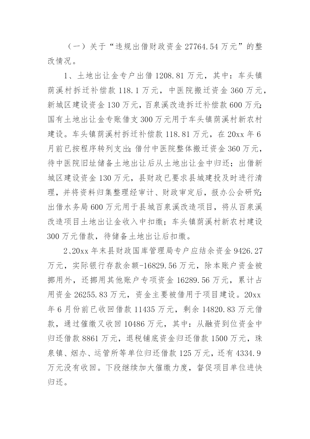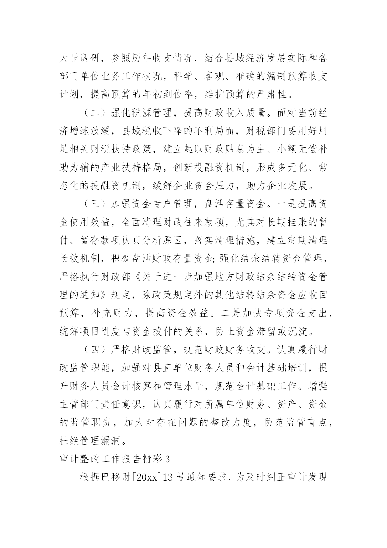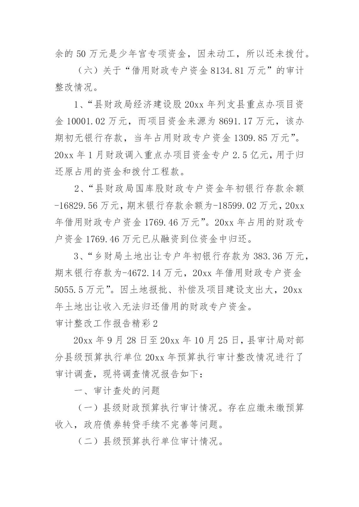 审计整改工作报告精彩审计整改工作报告精彩在现在社会,报告对我们来说并不陌生,不同种类的报告具有不同的用途。那么一般报告是怎么写的呢?以下是小编为大家收集的审计整改工作报告精彩,仅供参考,希望能够帮助到大家。审计整改工作报告精彩1根据会议要求,我就审计报告中涉及我单位的问题向会报告整改情况,请予审议。—、工作开展情况针对审计查出的问题,我局采取了有力措施狠抓整改落实。一是成立了审计整改工作领导小组。由我任组长,其他局领导为副组长,相关股室负责人为成员。组长为审计整改工作第一责任人,副组长负责组织整改工作,股室负责人为直接责任人。同时,多次组织召开局务会和专题会议,部署整改工作。二是制定了审计整改工作方案。明确了工作职责,相关股室确定专人负责审计整改,明确审计整改的责任和期限。三是采取有效措施积极整改。对审计报告指出的问题进行了深刻的剖析和认真细致的研究,并逐条进行整改。对暂时不能整改到位的,制定了整改计划,明确了整改措施,限期整改到位。二、关于嘉人常函(20xx)7号审议意见的办理情况(一)关于“违规出借财政资金27764.54万元”的整改情况。1、土地出让金专户出借1208.81万元,其中:车头镇荫溪村拆迁补偿款118.1万元,中医院搬迁资金360万元,新城区建设资金130万元,百泉溪改造拆迁补偿款600万元;国有土地出让金专账借支300万元用于车头镇荫溪村新农村建设。车头镇荫溪村拆迁补偿款118.81万元,在20xx年6月前已按程序转列支出;借付中医院整体搬迁资金360万元,待中医院旧址储备土地出让后从土地出让金中归还;出借新城区建设资金130万元,县财政已要求县城建投及时进行清理,并将资料归集整理经审计、财政审定后,报办公会研究;出借水务局600万元用于县城百泉溪改造项目,将从百泉溪改造项目土地出让金收入中扣缴;车头镇荫溪村新农村建设300万元借款,待储备土地出让后扣缴。2、20xx年末县财政国库管理局专户应结余资金9426.27万元,实际银行存款余额-16829.56万元,除本账户资金被挪用外,还挪用其他账户专项资金16289.56万元,累计占用资金26255.83万元,资金主要被借用于项目建设。20xx年6月份前已收回借款11435万元,剩余14820.83万元借款,通过催缴又收回10486万元,其中:从融资到位资金中归还借款8861万元,退税铺底资金归还借款1500万元,珠泉镇、烟办、运管所等单位归还借款125万元,还有4334.9万元没有收回。下段继续加大催缴力度,督促项目单位进快归还。(二)关于违规设立会计账户73个的整改情况。已撤销归并不符合设立条件的会计账户73个。按新会计制度规定,5个基建账户补办了手续。(三)关于“往来款项结算不及时”的整改情况。1、国有土地出让金专账暂付款结余13087.3万元。其中:城建投8977.87万元用于支付县城市基础设施建设项目。城建投已对拨入城建投的资金使用情况进行了疏理核对,报县政府审批后将按程序转列项目建设支出,对基础设施建设项目工期长、不能及时结算的,暂时挂往来,待工程结算后销账。国土局借1210.44万元用于征地补偿款和报批费用,正在按程序报批转列土地报批手续成本支出。国有土地基金专户借1400万元用于土地收购储备的征地、报批的前期费用,已收回土地基金专户借款1208.81万元,尾款将尽快归还。县检察院借款99万元待原购土地处置后再结算归还。县城建投公司借1100万元用于归还湖南品诚建设集团有限公司保证金,待融资资金到位后归还。车头镇荫溪村300万元,待该村储备土地出让后归还。2、县财政经建股专项资金专户借出或拨出其他单位资金7866.9万元,至20xx年12月底止未进行结算。经建股专户借出资金7866.9万元,目前已归还6313.7万元。其中,开行贷款专户归还1585.796万元,坦塘工业园归还820万元,公路管理局归还310万元,水利局归还460万元,嘉蓝路指挥部归还986万元,湘运公司归还350万元,嘉金路建设指挥部归还800万元,桂嘉路提质改造指挥部归还500万元。其余借款1553.2万元将督促单位尽快归还。3、借出款项长期不作清理1290.69万元。国土局已与县乡财局衔接,分类进行处理,可转列支出1064.29万元,其中684.29万元列入土地出让成本,380万元业务经费列入土地出让工作经费。(四)关于“政府性债务报表反映不全面。县财政金融债务办提供的政府性债务表未反映BT建设项目形成的`政府性债务”的整改情况。20xx年12月,县财政金融债务办根据《国务院关于加强地方政府性债务管理的意见》(国发[20xx]43号)和《财政部关于地方政府存量债务纳入预算管理清理甄别办法的通知》(财预[20xx]351号),会同审计部门对全县各单位全部债务进行了全面清理,