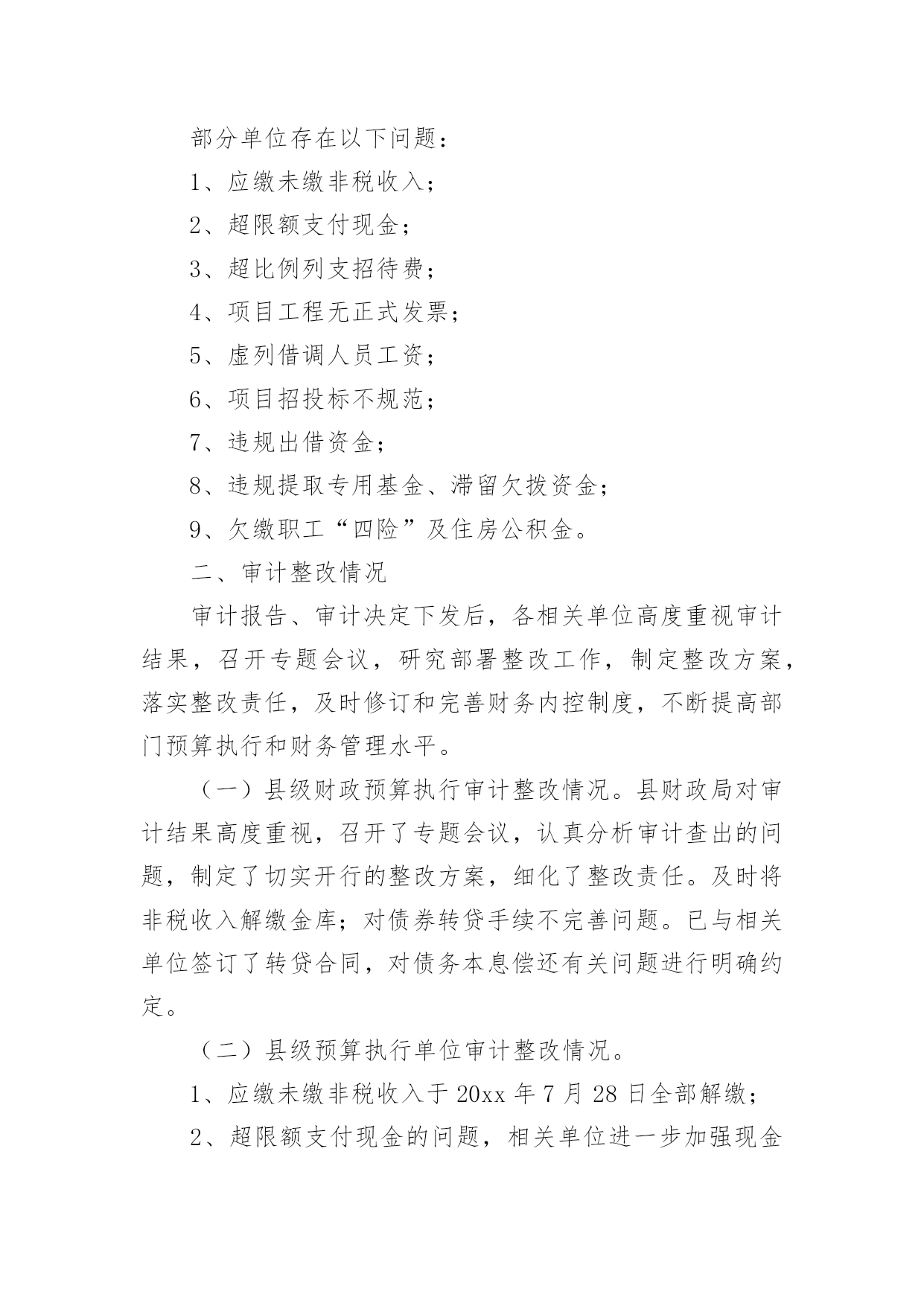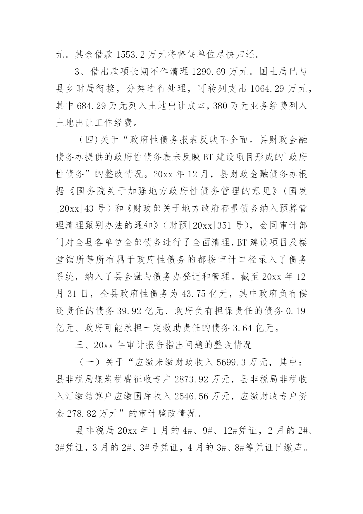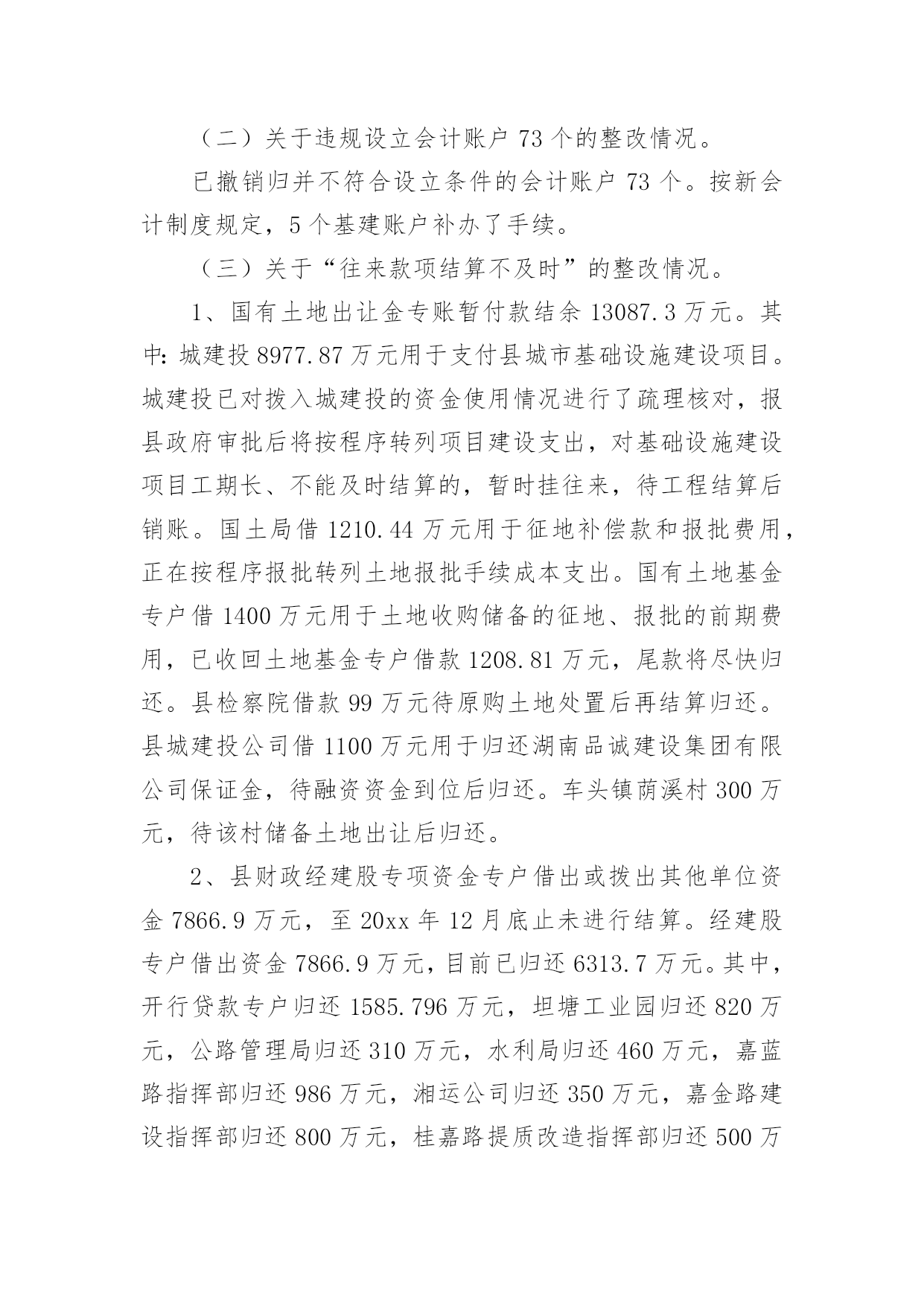 审计整改工作报告精彩审计整改工作报告精彩在现在社会,报告对我们来说并不陌生,不同种类的报告具有不同的用途。那么一般报告是怎么写的呢?以下是小编为大家收集的审计整改工作报告精彩,仅供参考,希望能够帮助到大家。审计整改工作报告精彩1根据会议要求,我就审计报告中涉及我单位的问题向会报告整改情况,请予审议。—、工作开展情况针对审计查出的问题,我局采取了有力措施狠抓整改落实。一是成立了审计整改工作领导小组。由我任组长,其他局领导为副组长,相关股室负责人为成员。组长为审计整改工作第一责任人,副组长负责组织整改工作,股室负责人为直接责任人。同时,多次组织召开局务会和专题会议,部署整改工作。二是制定了审计整改工作方案。明确了工作职责,相关股室确定专人负责审计整改,明确审计整改的责任和期限。三是采取有效措施积极整改。对审计报告指出的问题进行了深刻的剖析和认真细致的研究,并逐条进行整改。对暂时不能整改到位的,制定了整改计划,明确了整改措施,限期整改到位。二、关于嘉人常函(20xx)7号审议意见的办理情况(一)关于“违规出借财政资金27764.54万元”的整改情况。1、土地出让金专户出借1208.81万元,其中:车头镇荫溪村拆迁补偿款118.1万元,中医院搬迁资金360万元,新城区建设资金130万元,百泉溪改造拆迁补偿款600万元;国有土地出让金专账借支300万元用于车头镇荫溪村新农村建设。车头镇荫溪村拆迁补偿款118.81万元,在20xx年6月前已按程序转列支出;借付中医院整体搬迁资金360万元,待中医院旧址储备土地出让后从土地出让金中归还;出借新城区建设资金130万元,县财政已要求县城建投及时进行清理,并将资料归集整理经审计、财政审定后,报办公会研究;出借水务局600万元用于县城百泉溪改造项目,将从百泉溪改造项目土地出让金收入中扣缴;车头镇荫溪村新农村建设300万元借款,待储备土地出让后扣缴。2、20xx年末县财政国库管理局专户应结余资金9426.27万元,实际银行存款余额-16829.56万元,除本账户资金被挪用外,还挪用其他账户专项资金16289.56万元,累计占用资金26255.83万元,资金主要被借用于项目建设。20xx年6月份前已收回借款11435万元,剩余14820.83万元借款,通过催缴又收回10486万元,其中:从融资到位资金中归还借款8861万元,退税铺底资金归还借款1500万元,珠泉镇、烟办、运管所等单位归还借款125万元,还有4334.9万元没有收回。下段继续加大催缴力度,督促项目单位进快归还。(二)关于违规设立会计账户73个的整改情况。已撤销归并不符合设立条件的会计账户73个。按新会计制度规定,5个基建账户补办了手续。(三)关于“往来款项结算不及时”的整改情况。1、国有土地出让金专账暂付款结余13087.3万元。其中:城建投8977.87万元用于支付县城市基础设施建设项目。城建投已对拨入城建投的资金使用情况进行了疏理核对,报县政府审批后将按程序转列项目建设支出,对基础设施建设项目工期长、不能及时结算的,暂时挂往来,待工程结算后销账。国土局借1210.44万元用于征地补偿款和报批费用,正在按程序报批转列土地报批手续成本支出。国有土地基金专户借1400万元用于土地收购储备的征地、报批的前期费用,已收回土地基金专户借款1208.81万元,尾款将尽快归还。县检察院借款99万元待原购土地处置后再结算归还。县城建投公司借1100万元用于归还湖南品诚建设集团有限公司保证金,待融资资金到位后归还。车头镇荫溪村300万元,待该村储备土地出让后归还。2、县财政经建股专项资金专户借出或拨出其他单位资金7866.9万元,至20xx年12月底止未进行结算。经建股专户借出资金7866.9万元,目前已归还6313.7万元。其中,开行贷款专户归还1585.796万元,坦塘工业园归还820万元,公路管理局归还310万元,水利局归还460万元,嘉蓝路指挥部归还986万元,湘运公司归还350万元,嘉金路建设指挥部归还800万元,桂嘉路提质改造指挥部归还500万元。其余借款1553.2万元将督促单位尽快归还。3、借出款项长期不作清理1290.69万元。国土局已与县乡财局衔接,分类进行处理,可转列支出1064.29万元,其中684.29万元列入土地出让成本,380万元业务经费列入土地出让工作经费。(四)关于“政府性债务报表反映不全面。县财政金融债务办提供的政府性债务表未反映BT建设项目形成的`政府性债务”的整改情况。20xx年12月,县财政金融债务办根据《国务院关于加强地方政府性债务管理的意见》(国发[20xx]43号)和《财政部关于地方政府存量债务纳入预算管理清理甄别办法的通知》(财预[20xx]351号),会同审计部门对全县各单位全部债务进行了全面清理,