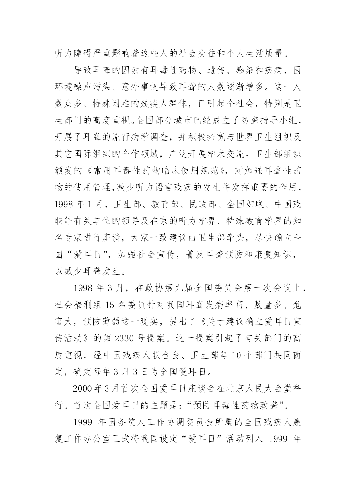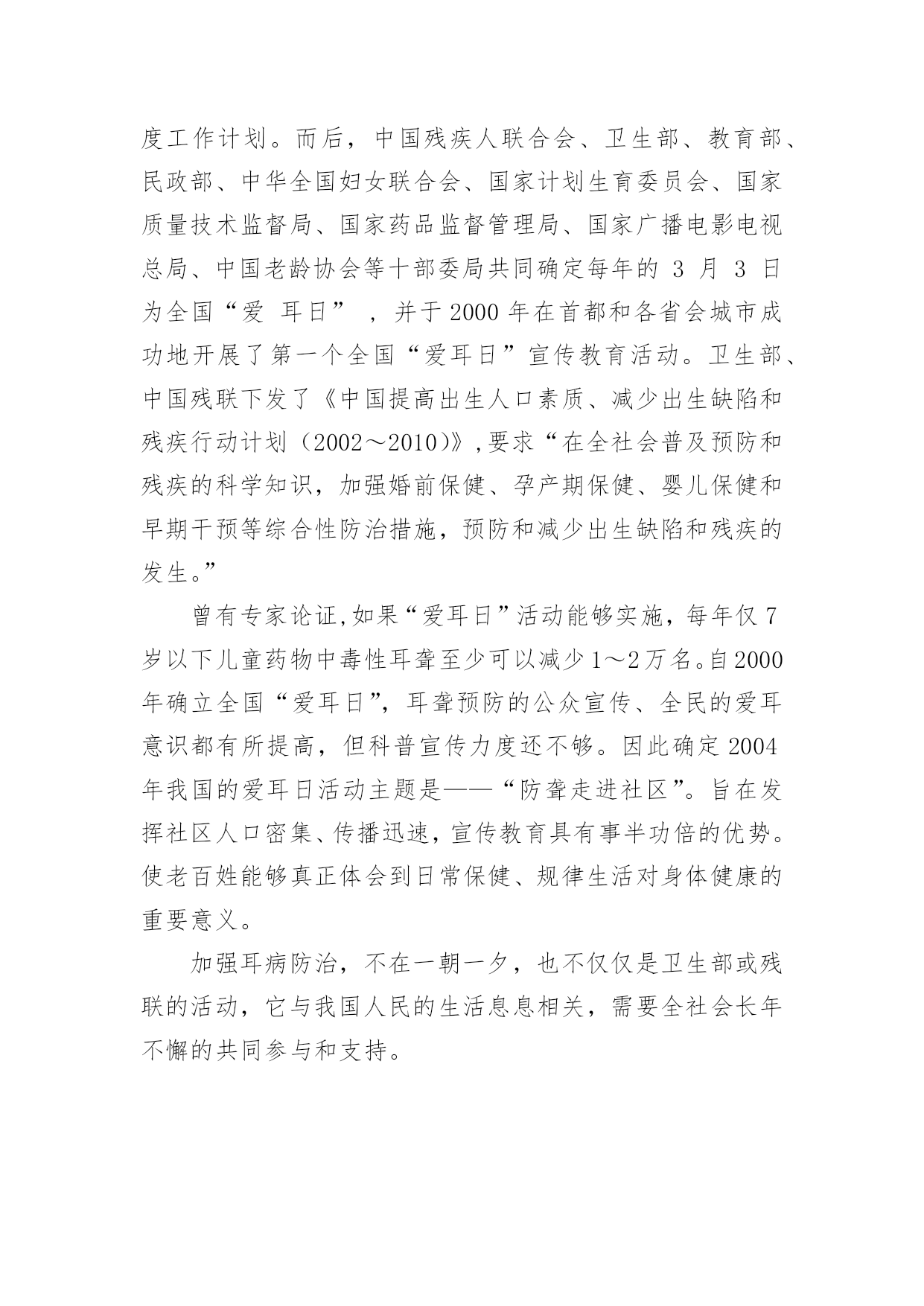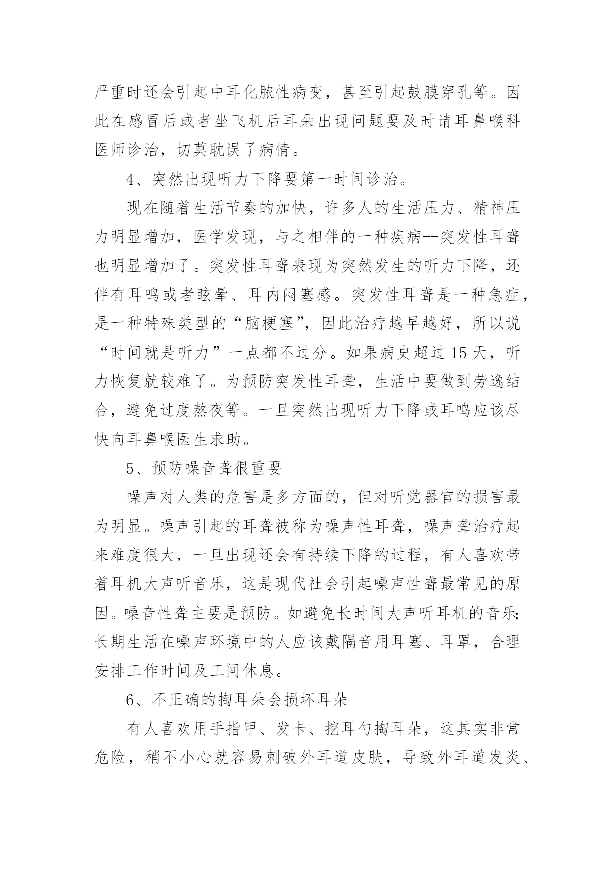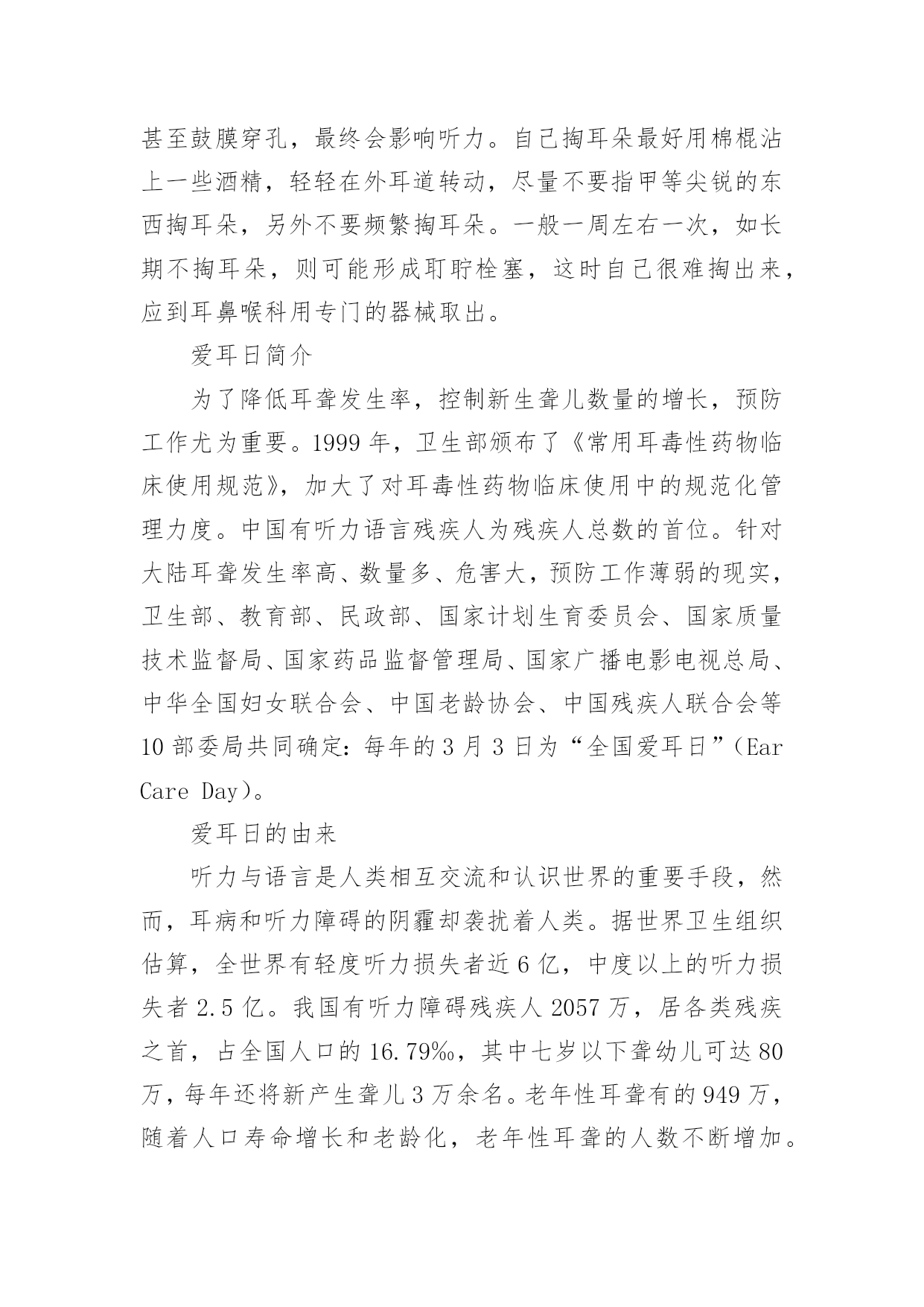 爱耳日手抄报资料耳朵是每个人体的重要器官,因此每个人都有必要了解自己的耳朵、保护自己的耳朵。爱耳日手抄报资料有哪些?以下是小编为您整理的相关资料,欢迎阅读!爱耳日手抄报资料:1、预防耳内进水,防止外耳道发炎我们的外耳道深达2.5-3厘米,而且还不直,外耳道皮肤还有许多纤细的绒毛。游泳或洗澡、洗头时耳内进水,水不容易出来,会诱发急性外耳道炎,如果治疗不及时会导致听力下降。那么,一旦外耳道进水怎么办呢?可以通过单脚垫脚蹦跳的运动让水流出来,或用棉签把水吸出来。2、谨慎用药,防止药物学耳聋我们听觉的产生和耳蜗的结构密切相关,耳蜗结构中有一种毛细胞,他们起到将声波转化为电信号的作用,这些毛细胞非常娇弱,许多药物都会对他们造成伤害,这种药物引起的耳聋被称为药物性耳聋。因此,在使用药物上一定要慎之又慎。3、感冒后或坐飞机后耳朵疼痛要及时治疗我们的耳朵和鼻咽部通过一个叫做咽鼓管的结构相通。咽鼓管的作用是调节耳朵内外的压力。上呼吸道感染可以顺着咽鼓管逆行感染耳朵引起中耳炎。飞机在起飞或降落的时候压力变化过大,咽鼓管不能及时调整耳内压力,也会引起中耳炎。中耳内炎症如果不能及时消除就会引起听力障碍,严重时还会引起中耳化脓性病变,甚至引起鼓膜穿孔等。因此在感冒后或者坐飞机后耳朵出现问题要及时请耳鼻喉科医师诊治,切莫耽误了病情。4、突然出现听力下降要第一时间诊治。现在随着生活节奏的加快,许多人的生活压力、精神压力明显增加,医学发现,与之相伴的一种疾病--突发性耳聋也明显增加了。突发性耳聋表现为突然发生的听力下降,还伴有耳鸣或者眩晕、耳内闷塞感。突发性耳聋是一种急症,是一种特殊类型的“脑梗塞”,因此治疗越早越好,所以说“时间就是听力”一点都不过分。如果病史超过15天,听力恢复就较难了。为预防突发性耳聋,生活中要做到劳逸结合,避免过度熬夜等。一旦突然出现听力下降或耳鸣应该尽快向耳鼻喉医生求助。5、预防噪音聋很重要噪声对人类的危害是多方面的,但对听觉器官的损害最为明显。噪声引起的耳聋被称为噪声性耳聋,噪声聋治疗起来难度很大,一旦出现还会有持续下降的过程,有人喜欢带着耳机大声听音乐,这是现代社会引起噪声性聋最常见的原因。噪音性聋主要是预防。如避免长时间大声听耳机的音乐;长期生活在噪声环境中的人应该戴隔音用耳塞、耳罩,合理安排工作时间及工间休息。6、不正确的掏耳朵会损坏耳朵有人喜欢用手指甲、发卡、挖耳勺掏耳朵,这其实非常危险,稍不小心就容易刺破外耳道皮肤,导致外耳道发炎、甚至鼓膜穿孔,最终会影响听力。自己掏耳朵最好用棉棍沾上一些酒精,轻轻在外耳道转动,尽量不要指甲等尖锐的东西掏耳朵,另外不要频繁掏耳朵。一般一周左右一次,如长期不掏耳朵,则可能形成耵聍栓塞,这时自己很难掏出来,应到耳鼻喉科用专门的器械取出。爱耳日简介为了降低耳聋发生率,控制新生聋儿数量的增长,预防工作尤为重要。1999年,卫生部颁布了《常用耳毒性药物临床使用规范》,加大了对耳毒性药物临床使用中的规范化管理力度。中国有听力语言残疾人为残疾人总数的首位。针对大陆耳聋发生率高、数量多、危害大,预防工作薄弱的现实,卫生部、教育部、民政部、国家计划生育委员会、国家质量技术监督局、国家药品监督管理局、国家广播电影电视总局、中华全国妇女联合会、中国老龄协会、中国残疾人联合会等10部委局共同确定:每年的3月3日为“全国爱耳日”(EarCareDay)。爱耳日的由来听力与语言是人类相互交流和认识世界的重要手段,然而,耳病和听力障碍的阴霾却袭扰着人类。据世界卫生组织估算,全世界有轻度听力损失者近6亿,中度以上的听力损失者2.5亿。我国有听力障碍残疾人2057万,居各类残疾之首,占全国人口的16.79‰,其中七岁以下聋幼儿可达80万,每年还将新产生聋儿3万余名。老年性耳聋有的949万,随着人口寿命增长和老龄化,老年性耳聋的人数不断增加。听力障碍严重影响着这些人的社会交往和个人生活质量。导致耳聋的因素有耳毒性药物、遗传、感染和疾病,因环境噪声污染、意外事故导致耳聋的人数逐渐增多。这一人数众多、特殊困难的残疾人群体,已引起全社会,特别是卫生部门的高度重视。全国部分城市已经成立了防聋指导小组,开展了耳聋的流行病学调查,并积极拓宽与世界卫生组织及其它国际组织的合作领域,广泛开展学术交流。卫生部组织颁发的《常用耳毒性药物临床使用规范》,对加强耳聋性药物的使用管理,减少听力语言残疾的发生将发挥重要的作用,1998年1月,卫生部、教育部、民政部、全国妇联、中国残联等有关单位的领导及在京的听力学界、特殊教育学界的知名专家进行座谈,大家一致建议由卫生部牵头,尽快确立全国“爱耳日”,加强社会宣传,普及耳聋预防和康复知识,以减少耳聋发生。1998年3月,在政协第九届全国委员会第一次会议上,社会福利组15名委员针对我国耳聋发病率高、数量