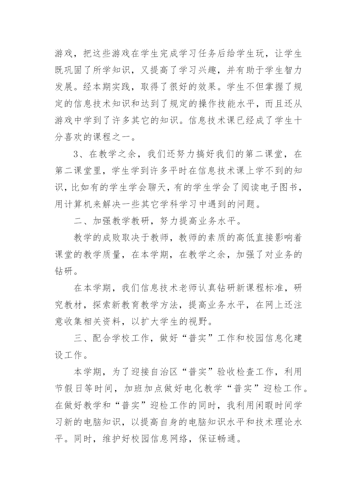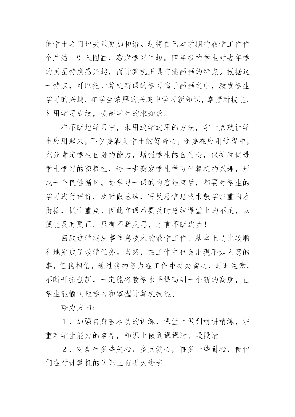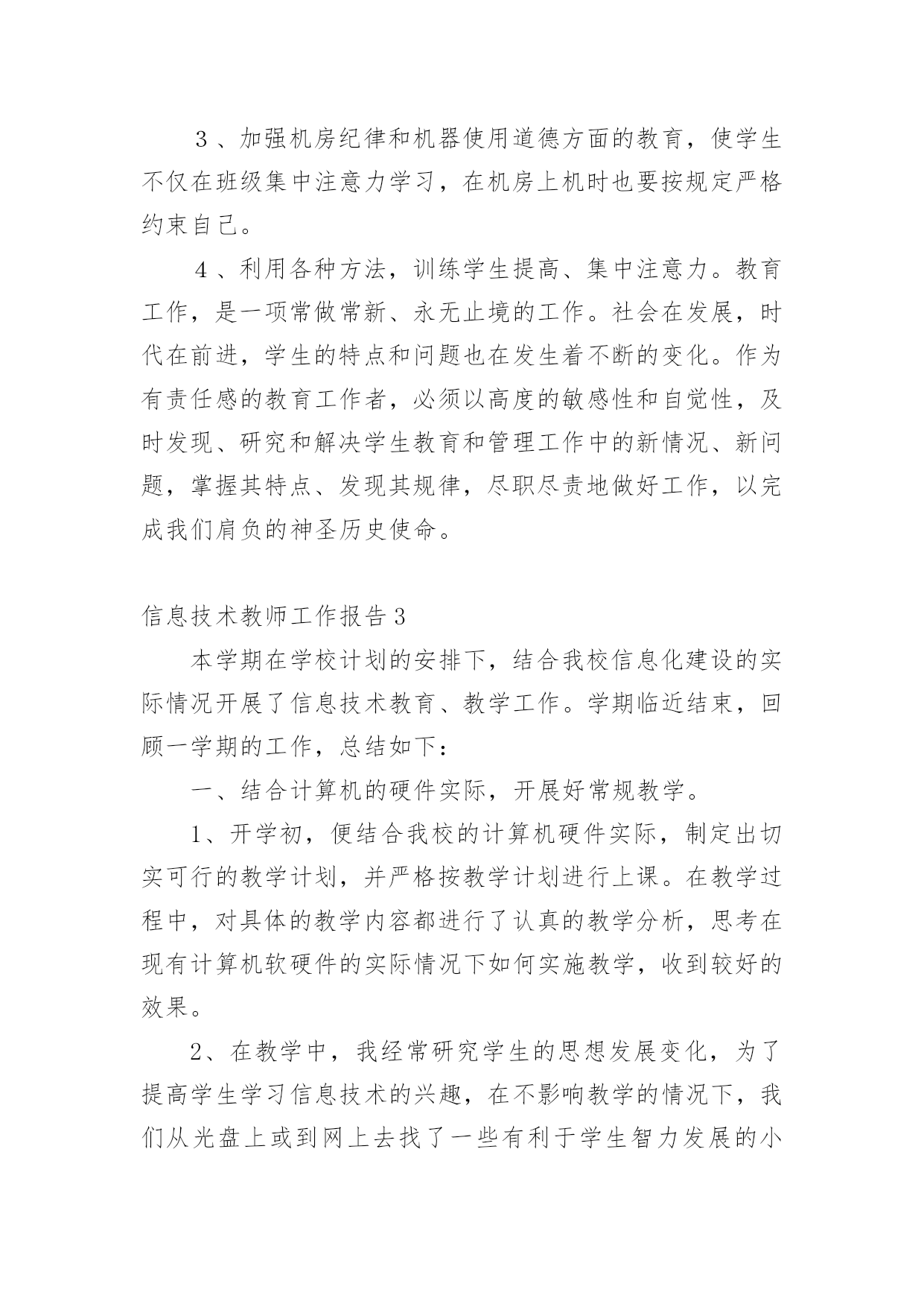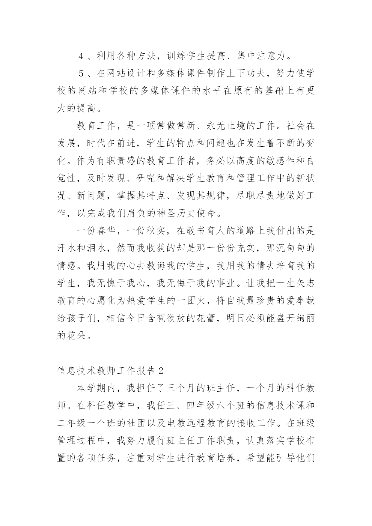 信息技术教师工作报告随着人们自身素质提升,报告使用的次数愈发增长,报告中涉及到专业性术语要解释清楚。一听到写报告就拖延症懒癌齐复发?以下是小编帮大家整理的信息技术教师工作报告,供大家参考借鉴,希望可以帮助到有需要的朋友。信息技术教师工作报告1学期即将结束,回顾这一学期,本人能够努力工作,认真学习,从多方面进行计算机教学和管理工作。有辛勤的耕耘,有收获的喜悦,也有不足与遗憾,现总结如下:一、教学方面1、备课开学初,根据学校要求,认真写好教学计划,提前备好课,写好教案。平时做到周前备课。备课时认真钻研教材,学习好《小学信息技术课程指导纲要》,虚心向老教师学习、请教。力求吃透教材,找准重点、难点。为了上好每一节课,我上网查资料,集中别人的优点确定自我的教学思路,常常工作到深夜。为了学生能更直观地感受所学的知识资料,我用心制作课件,准备各种直观教学软件,搜集制作各知识点优秀案例展示给学生。2、上课上好课的前提是做好课前准备,不打无准备之仗,尤其本学科主要课程都要上机完成,每节都要认真做好上机备课,检查机器状态,有无“不可用机器”,。上课时认真讲课,力求抓住重点,突破难点,精讲精练。运用多种教学方法,从学生的实际出发,注意调动学生学习的用心性和创造性思维,使学生有举一反三的潜力。在学生完成上机任务时,在各台计算机前巡视,注意对学困生进行手把手的辅导,课后及时做课后记,找出不足。3、笔记根据每节课的特点,为学生设计最合理的笔记,既便于学生理解和掌握当堂课的知识。二、个人学习用心学习各种理论,以充实自我,以便在工作中以坚实的理论作为指导,更好地进行教育教学。我还利用业余时间认真学习网络知识,学习制作网站,并于20xx年8月把大农实验小学网站初步建成,为学校的教育教学服务。同时,帮忙其它教师制作多媒体课件,同时负责本学期建成的多媒体教室的日常管理工作。三、努力方向1、加强自身基本功的训练,课堂上做到精讲精练,注重对学生潜力的培养,知识上做到课课清、段段清。2、对差生多些关心,多点爱心,再多一些耐心,使他们在对计算机的认识上有更大提高。3、加强机房纪律和机器使用道德方面的教育,使学生不仅仅在班级集中注意力学习,在机房上机时也要按规定严格约束自我。4、利用各种方法,训练学生提高、集中注意力。5、在网站设计和多媒体课件制作上下功夫,努力使学校的网站和学校的多媒体课件的水平在原有的基础上有更大的提高。教育工作,是一项常做常新、永无止境的工作。社会在发展,时代在前进,学生的特点和问题也在发生着不断的变化。作为有职责感的教育工作者,务必以高度的敏感性和自觉性,及时发现、研究和解决学生教育和管理工作中的新状况、新问题,掌握其特点、发现其规律,尽职尽责地做好工作,以完成我们肩负的神圣历史使命。一份春华,一份秋实,在教书育人的道路上我付出的是汗水和泪水,然而我收获的却是那一份份充实,那沉甸甸的情感。我用我的心去教诲我的学生,我用我的情去培育我的学生,我无愧于我心,我无悔于我的事业。让我把一生矢志教育的心愿化为热爱学生的一团火,将自我最珍贵的爱奉献给孩子们,相信今日含苞欲放的花蕾,明日必须能盛开绚丽的花朵。信息技术教师工作报告2本学期内,我担任了三个月的班主任,一个月的科任教师。在科任教学中,我任三、四年级六个班的信息技术课和二年级一个班的社团以及电教远程教育的接收工作。在班级管理过程中,我努力履行班主任工作职责,认真落实学校布置的各项任务,注重对学生进行教育培养,希望能引导他们健康成长,学一点知识、长一点技能。认真开展创建文明班级活动,积极参与创文明校园活动,在学校组织的多项活动中取得较好的成绩,并荣获学校“队列比赛第一名”、“百题大赛第一名”称号,现将班主任工作总结如下:一、抓好一支队伍建设即进行班干部队伍建设。建设的内容包括思想教育、工作职责教育、工作方法指导。班干部首先要有吃苦耐劳、任劳任怨、为集体奉献的精神,要能以身作则、顾全大局,而这正是独生子女所缺乏的一些品质,所以我把这作为班干部队伍建设的一个重要内容。进行工作职责教育,主要能使班干部责任明确,知道履行什么样的职责,该怎样去做,保持思路清晰。这两类教育主要通过定期召开班委会进行,而工作方法上的指导,主要在实践中进行。对于班干部的工作,不包办,给予他们一个较宽阔的空间,但在工作中我注意监督、观察,不足之处及时指出,并给予指导,如指导对照工作职责,结合班级情况制定阶段性工作计划;如何开展工作等。二、建立二项制度保障制度是保障,除要求学生严格遵守校纪校规,还针对班级的实际情况,特制定了班级卫生要求,保持教室和校园清洁卫生是每个学生的义务,规定了教室值日生每天三小扫(早晨、下午上课前及放学后),室外值日生每堂课前一扫,制度的落实离不开班干部和班主任的监督和表率。班干部首先带头做到、做好,作为班主任,我