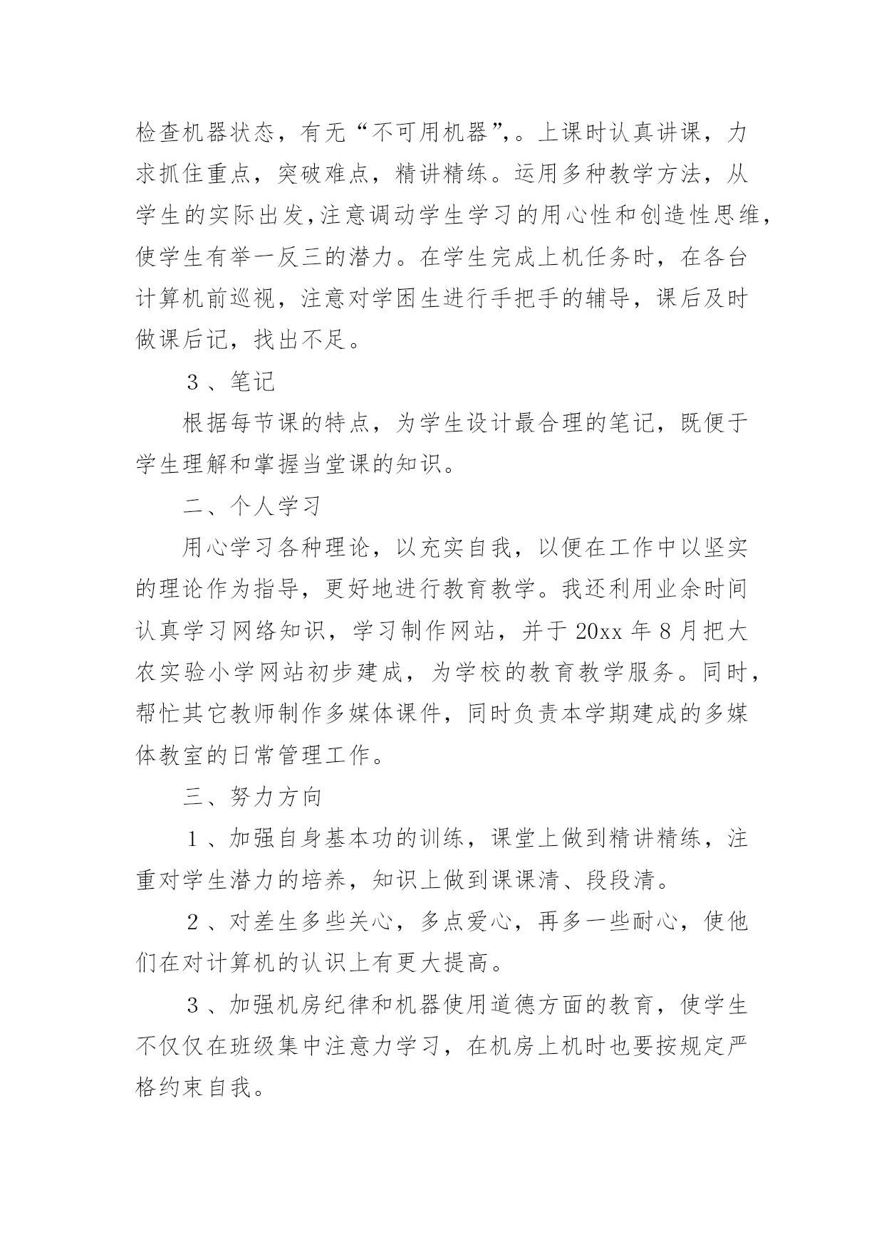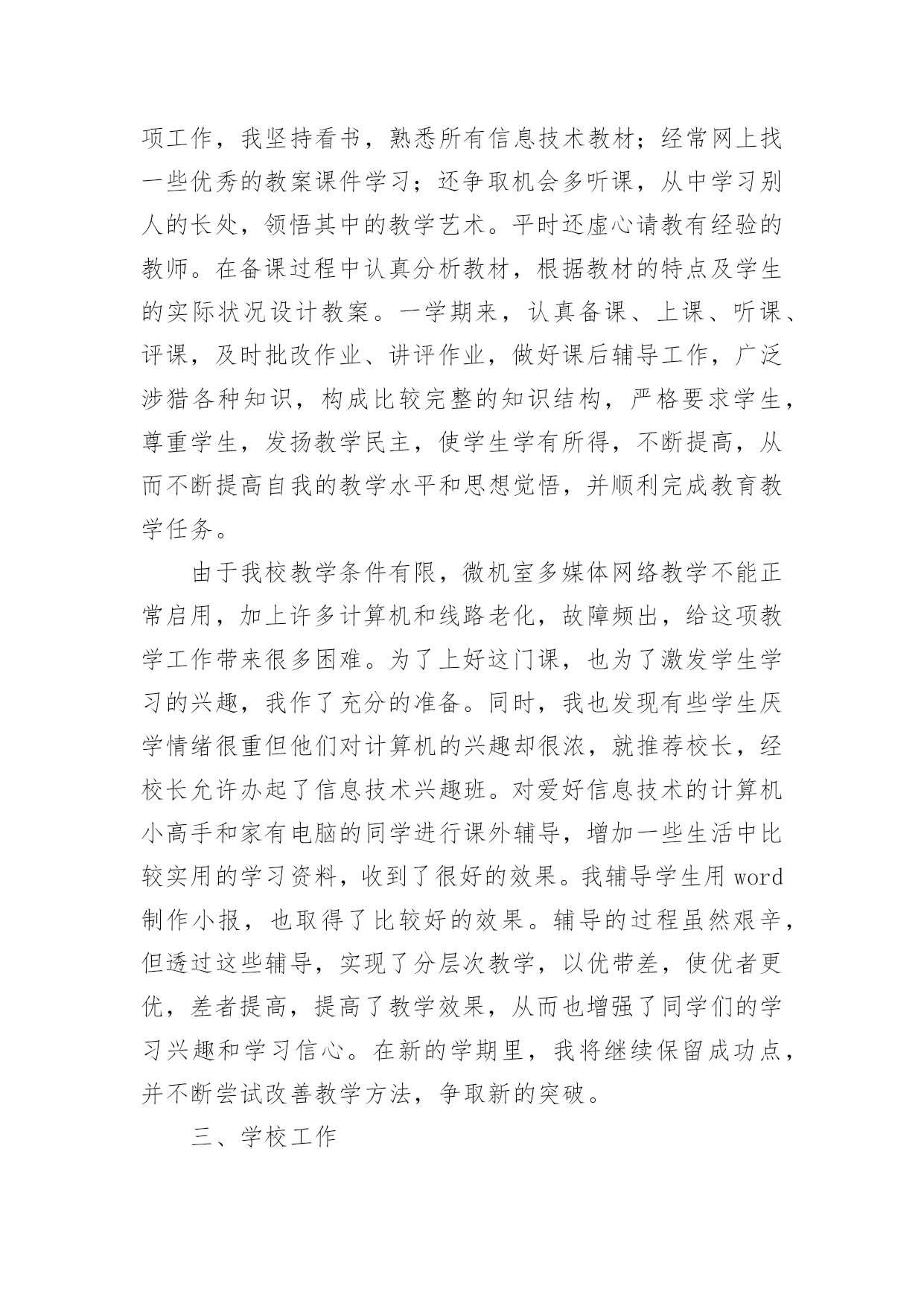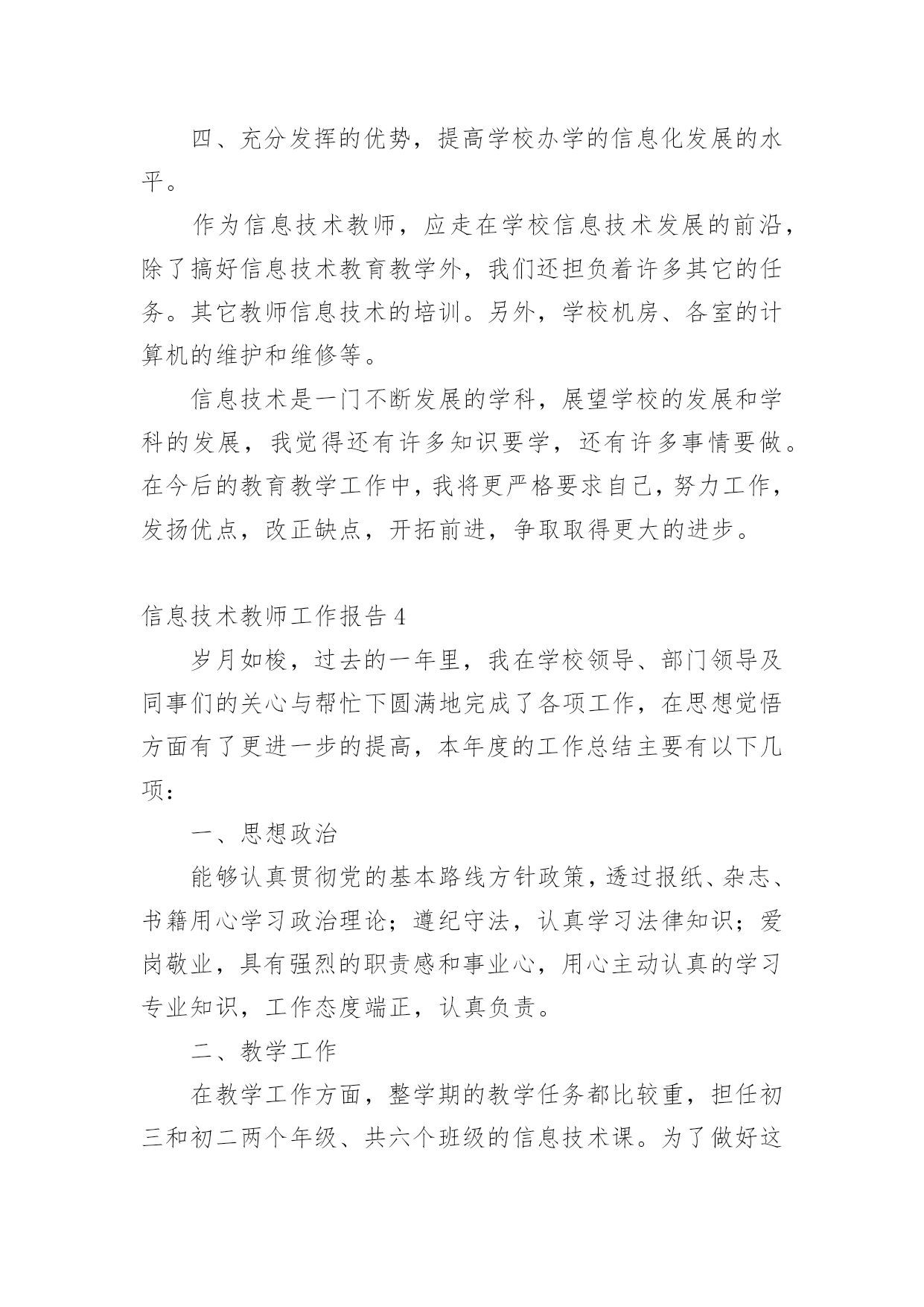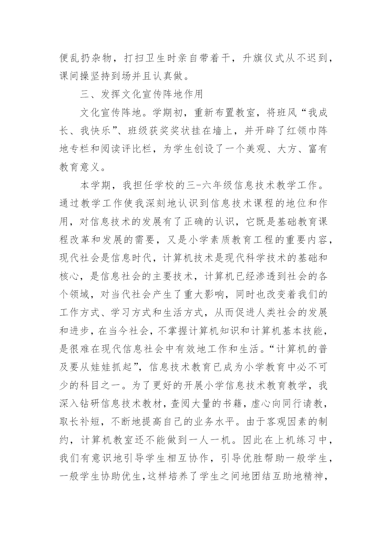 信息技术教师工作报告随着人们自身素质提升,报告使用的次数愈发增长,报告中涉及到专业性术语要解释清楚。一听到写报告就拖延症懒癌齐复发?以下是小编帮大家整理的信息技术教师工作报告,供大家参考借鉴,希望可以帮助到有需要的朋友。信息技术教师工作报告1学期即将结束,回顾这一学期,本人能够努力工作,认真学习,从多方面进行计算机教学和管理工作。有辛勤的耕耘,有收获的喜悦,也有不足与遗憾,现总结如下:一、教学方面1、备课开学初,根据学校要求,认真写好教学计划,提前备好课,写好教案。平时做到周前备课。备课时认真钻研教材,学习好《小学信息技术课程指导纲要》,虚心向老教师学习、请教。力求吃透教材,找准重点、难点。为了上好每一节课,我上网查资料,集中别人的优点确定自我的教学思路,常常工作到深夜。为了学生能更直观地感受所学的知识资料,我用心制作课件,准备各种直观教学软件,搜集制作各知识点优秀案例展示给学生。2、上课上好课的前提是做好课前准备,不打无准备之仗,尤其本学科主要课程都要上机完成,每节都要认真做好上机备课,检查机器状态,有无“不可用机器”,。上课时认真讲课,力求抓住重点,突破难点,精讲精练。运用多种教学方法,从学生的实际出发,注意调动学生学习的用心性和创造性思维,使学生有举一反三的潜力。在学生完成上机任务时,在各台计算机前巡视,注意对学困生进行手把手的辅导,课后及时做课后记,找出不足。3、笔记根据每节课的特点,为学生设计最合理的笔记,既便于学生理解和掌握当堂课的知识。二、个人学习用心学习各种理论,以充实自我,以便在工作中以坚实的理论作为指导,更好地进行教育教学。我还利用业余时间认真学习网络知识,学习制作网站,并于20xx年8月把大农实验小学网站初步建成,为学校的教育教学服务。同时,帮忙其它教师制作多媒体课件,同时负责本学期建成的多媒体教室的日常管理工作。三、努力方向1、加强自身基本功的训练,课堂上做到精讲精练,注重对学生潜力的培养,知识上做到课课清、段段清。2、对差生多些关心,多点爱心,再多一些耐心,使他们在对计算机的认识上有更大提高。3、加强机房纪律和机器使用道德方面的教育,使学生不仅仅在班级集中注意力学习,在机房上机时也要按规定严格约束自我。4、利用各种方法,训练学生提高、集中注意力。5、在网站设计和多媒体课件制作上下功夫,努力使学校的网站和学校的多媒体课件的水平在原有的基础上有更大的提高。教育工作,是一项常做常新、永无止境的工作。社会在发展,时代在前进,学生的特点和问题也在发生着不断的变化。作为有职责感的教育工作者,务必以高度的敏感性和自觉性,及时发现、研究和解决学生教育和管理工作中的新状况、新问题,掌握其特点、发现其规律,尽职尽责地做好工作,以完成我们肩负的神圣历史使命。一份春华,一份秋实,在教书育人的道路上我付出的是汗水和泪水,然而我收获的却是那一份份充实,那沉甸甸的情感。我用我的心去教诲我的学生,我用我的情去培育我的学生,我无愧于我心,我无悔于我的事业。让我把一生矢志教育的心愿化为热爱学生的一团火,将自我最珍贵的爱奉献给孩子们,相信今日含苞欲放的花蕾,明日必须能盛开绚丽的花朵。信息技术教师工作报告2本学期内,我担任了三个月的班主任,一个月的科任教师。在科任教学中,我任三、四年级六个班的信息技术课和二年级一个班的社团以及电教远程教育的接收工作。在班级管理过程中,我努力履行班主任工作职责,认真落实学校布置的各项任务,注重对学生进行教育培养,希望能引导他们健康成长,学一点知识、长一点技能。认真开展创建文明班级活动,积极参与创文明校园活动,在学校组织的多项活动中取得较好的成绩,并荣获学校“队列比赛第一名”、“百题大赛第一名”称号,现将班主任工作总结如下:一、抓好一支队伍建设即进行班干部队伍建设。建设的内容包括思想教育、工作职责教育、工作方法指导。班干部首先要有吃苦耐劳、任劳任怨、为集体奉献的精神,要能以身作则、顾全大局,而这正是独生子女所缺乏的一些品质,所以我把这作为班干部队伍建设的一个重要内容。进行工作职责教育,主要能使班干部责任明确,知道履行什么样的职责,该怎样去做,保持思路清晰。这两类教育主要通过定期召开班委会进行,而工作方法上的指导,主要在实践中进行。对于班干部的工作,不包办,给予他们一个较宽阔的空间,但在工作中我注意监督、观察,不足之处及时指出,并给予指导,如指导对照工作职责,结合班级情况制定阶段性工作计划;如何开展工作等。二、建立二项制度保障制度是保障,除要求学生严格遵守校纪校规,还针对班级的实际情况,特制定了班级卫生要求,保持教室和校园清洁卫生是每个学生的义务,规定了教室值日生每天三小扫(早晨、下午上课前及放学后),室外值日生每堂课前一扫,制度的落实离不开班干部和班主任的监督和表率。班干部首先带头做到、做好,作为班主任,我