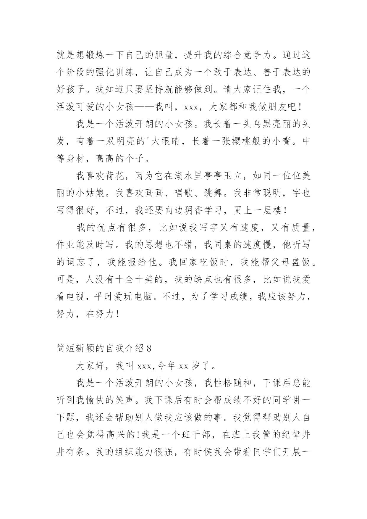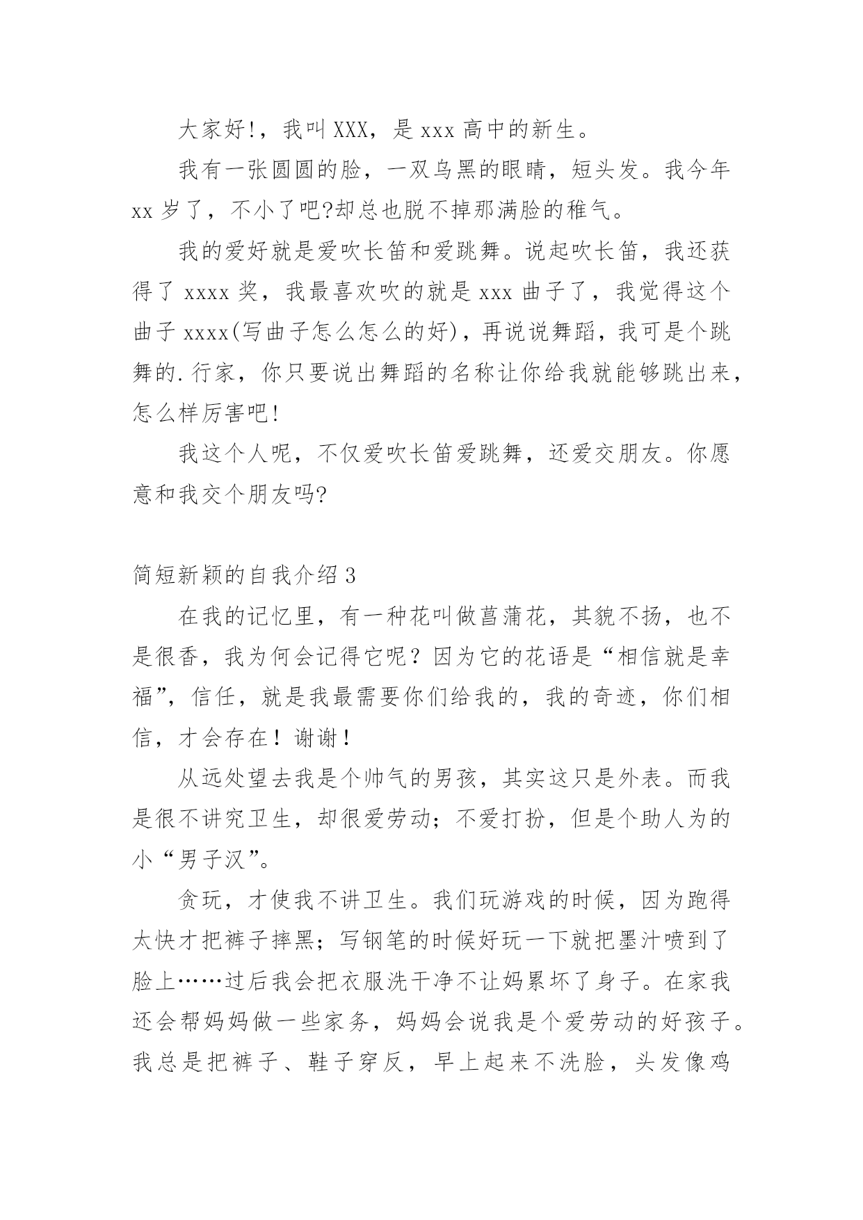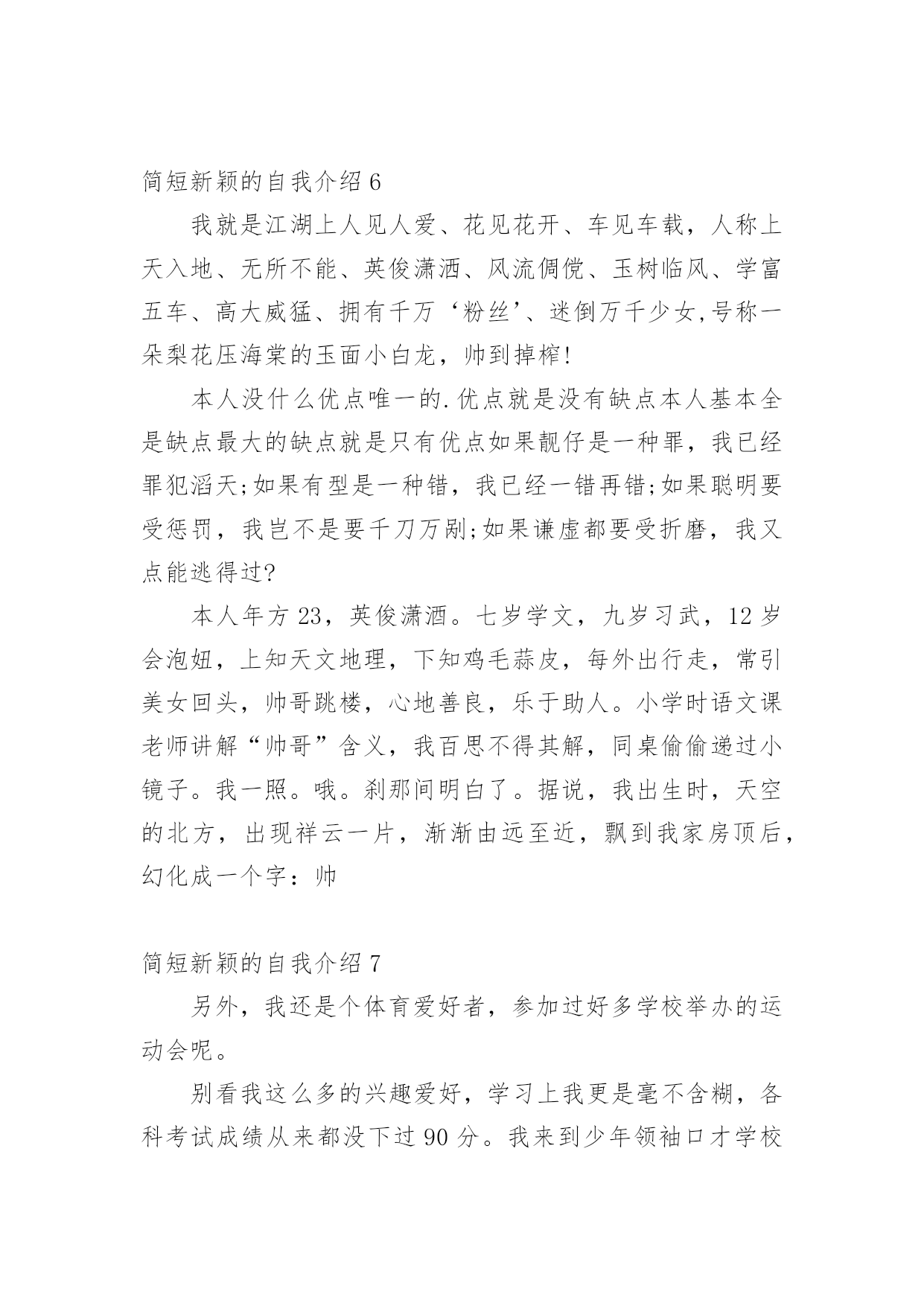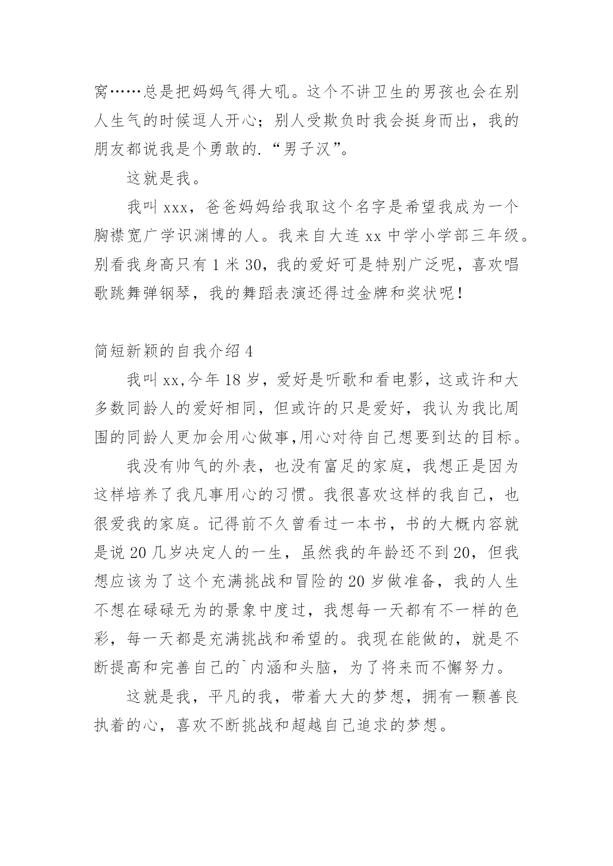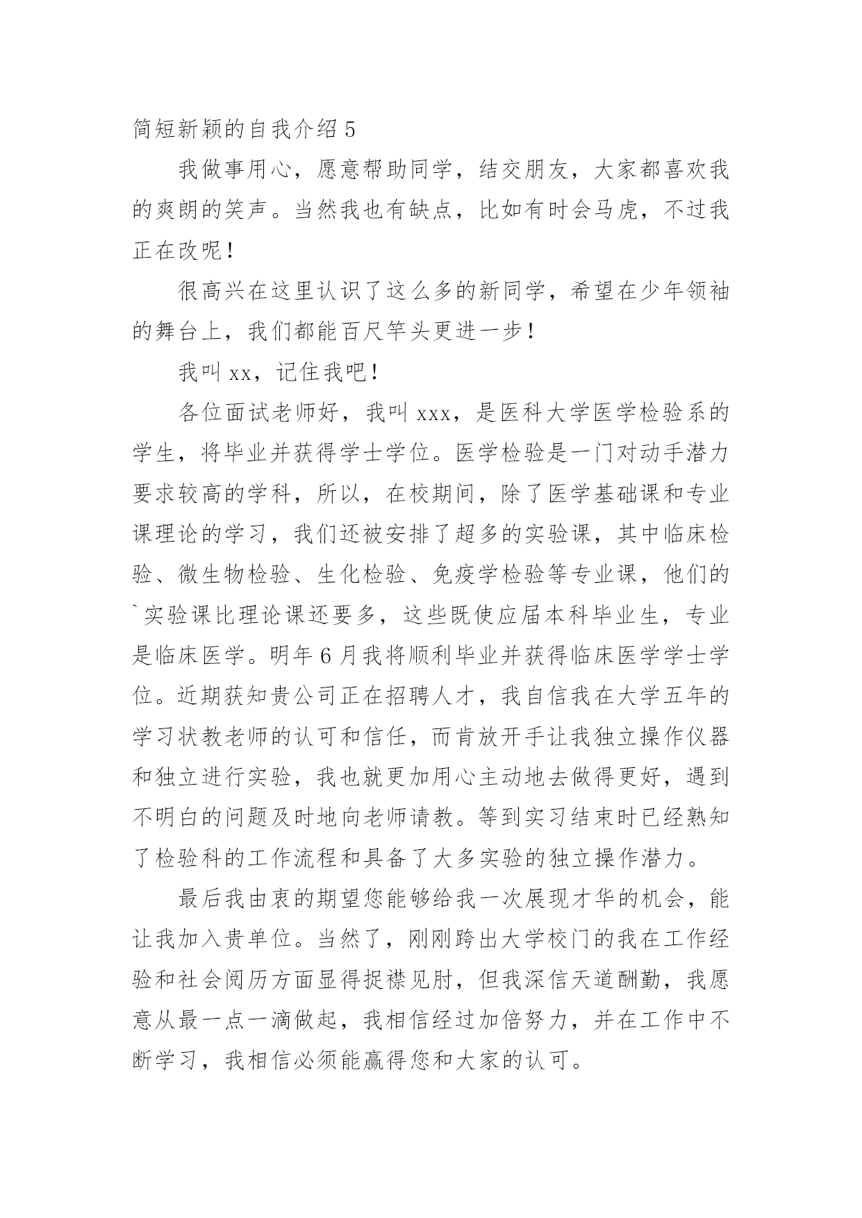 简短新颖的自我介绍来到一个完全陌生的环境,时常要进行自我介绍,通过自我介绍可以让他人了解我们。那么自我介绍要注意有什么内容呢?以下是小编帮大家整理的简短新颖的自我介绍,希望能够帮助到大家。简短新颖的自我介绍1我要去上学时,书包还是要妈妈帮我拎。哎,想起来还真惭愧!我应该要懂事起来。我的体育方面很差,尤其是乒乓球。掂球我最多掂得连70个都不到,而且还是少有的!哎,看来我的体育方面是跟不上了!这就是我,一个可爱的我!我叫xxx,今年十岁,在xx路小学四年级学习。因为我是属猴的,爸爸妈妈希望我的名字里也有一片幽静美丽的'树林,生机盎然,就给我起了个xx这个名字。我生活在一个幸福指数很高的4口之家,有爸爸、妈妈、弟弟和我。我热爱体育,凡是体育课上的体育项目我都喜欢。我还是我们学校长绳队的队员,每年都会代表学校参加大连市的跳长绳比赛,而且每次都能拿到相当不错的战绩。业余时间我还喜欢吹萨克斯,学了刚好一年,吹得不错。简短新颖的自我介绍2大家好!,我叫XXX,是xxx高中的新生。我有一张圆圆的脸,一双乌黑的眼睛,短头发。我今年xx岁了,不小了吧?却总也脱不掉那满脸的稚气。我的爱好就是爱吹长笛和爱跳舞。说起吹长笛,我还获得了xxxx奖,我最喜欢吹的就是xxx曲子了,我觉得这个曲子xxxx(写曲子怎么怎么的好),再说说舞蹈,我可是个跳舞的.行家,你只要说出舞蹈的名称让你给我就能够跳出来,怎么样厉害吧!我这个人呢,不仅爱吹长笛爱跳舞,还爱交朋友。你愿意和我交个朋友吗?简短新颖的自我介绍3在我的记忆里,有一种花叫做菖蒲花,其貌不扬,也不是很香,我为何会记得它呢?因为它的花语是“相信就是幸福”,信任,就是我最需要你们给我的,我的奇迹,你们相信,才会存在!谢谢!从远处望去我是个帅气的男孩,其实这只是外表。而我是很不讲究卫生,却很爱劳动;不爱打扮,但是个助人为的小“男子汉”。贪玩,才使我不讲卫生。我们玩游戏的时候,因为跑得太快才把裤子摔黑;写钢笔的时候好玩一下就把墨汁喷到了脸上……过后我会把衣服洗干净不让妈累坏了身子。在家我还会帮妈妈做一些家务,妈妈会说我是个爱劳动的好孩子。我总是把裤子、鞋子穿反,早上起来不洗脸,头发像鸡窝……总是把妈妈气得大吼。这个不讲卫生的男孩也会在别人生气的时候逗人开心;别人受欺负时我会挺身而出,我的朋友都说我是个勇敢的.“男子汉”。这就是我。我叫xxx,爸爸妈妈给我取这个名字是希望我成为一个胸襟宽广学识渊博的人。我来自大连xx中学小学部三年级。别看我身高只有1米30,我的爱好可是特别广泛呢,喜欢唱歌跳舞弹钢琴,我的舞蹈表演还得过金牌和奖状呢!简短新颖的自我介绍4我叫xx,今年18岁,爱好是听歌和看电影,这或许和大多数同龄人的爱好相同,但或许的只是爱好,我认为我比周围的同龄人更加会用心做事,用心对待自己想要到达的目标。我没有帅气的外表,也没有富足的家庭,我想正是因为这样培养了我凡事用心的习惯。我很喜欢这样的我自己,也很爱我的家庭。记得前不久曾看过一本书,书的大概内容就是说20几岁决定人的一生,虽然我的年龄还不到20,但我想应该为了这个充满挑战和冒险的20岁做准备,我的人生不想在碌碌无为的景象中度过,我想每一天都有不一样的色彩,每一天都是充满挑战和希望的。我现在能做的,就是不断提高和完善自己的`内涵和头脑,为了将来而不懈努力。这就是我,平凡的我,带着大大的梦想,拥有一颗善良执着的心,喜欢不断挑战和超越自己追求的梦想。简短新颖的自我介绍5我做事用心,愿意帮助同学,结交朋友,大家都喜欢我的爽朗的笑声。当然我也有缺点,比如有时会马虎,不过我正在改呢!很高兴在这里认识了这么多的新同学,希望在少年领袖的舞台上,我们都能百尺竿头更进一步!我叫xx,记住我吧!各位面试老师好,我叫xxx,是医科大学医学检验系的学生,将毕业并获得学士学位。医学检验是一门对动手潜力要求较高的学科,所以,在校期间,除了医学基础课和专业课理论的学习,我们还被安排了超多的实验课,其中临床检验、微生物检验、生化检验、免疫学检验等专业课,他们的`实验课比理论课还要多,这些既使应届本科毕业生,专业是临床医学。明年6月我将顺利毕业并获得临床医学学士学位。近期获知贵公司正在招聘人才,我自信我在大学五年的学习状教老师的认可和信任,而肯放开手让我独立操作仪器和独立进行实验,我也就更加用心主动地去做得更好,遇到不明白的问题及时地向老师请教。等到实习结束时已经熟知了检验科的工作流程和具备了大多实验的独立操作潜力。最后我由衷的期望您能够给我一次展现才华的机会,能让我加入贵单位。当然了,刚刚跨出大学校门的我在工作经验和社会阅历方面显得捉襟见肘,但我深信天道酬勤,我愿意从最一点一滴做起,我相信经过加倍努力,并在工作中不断学习,我相信必须能赢得您和大家的认可。简短新颖的自我介绍6我就是江湖上人见