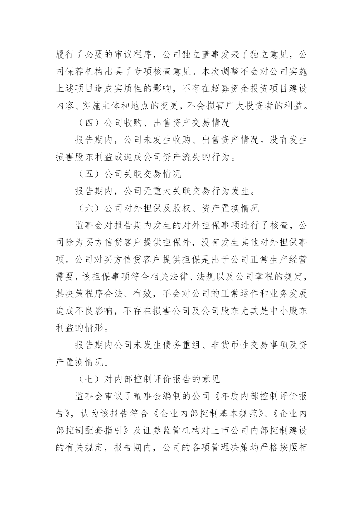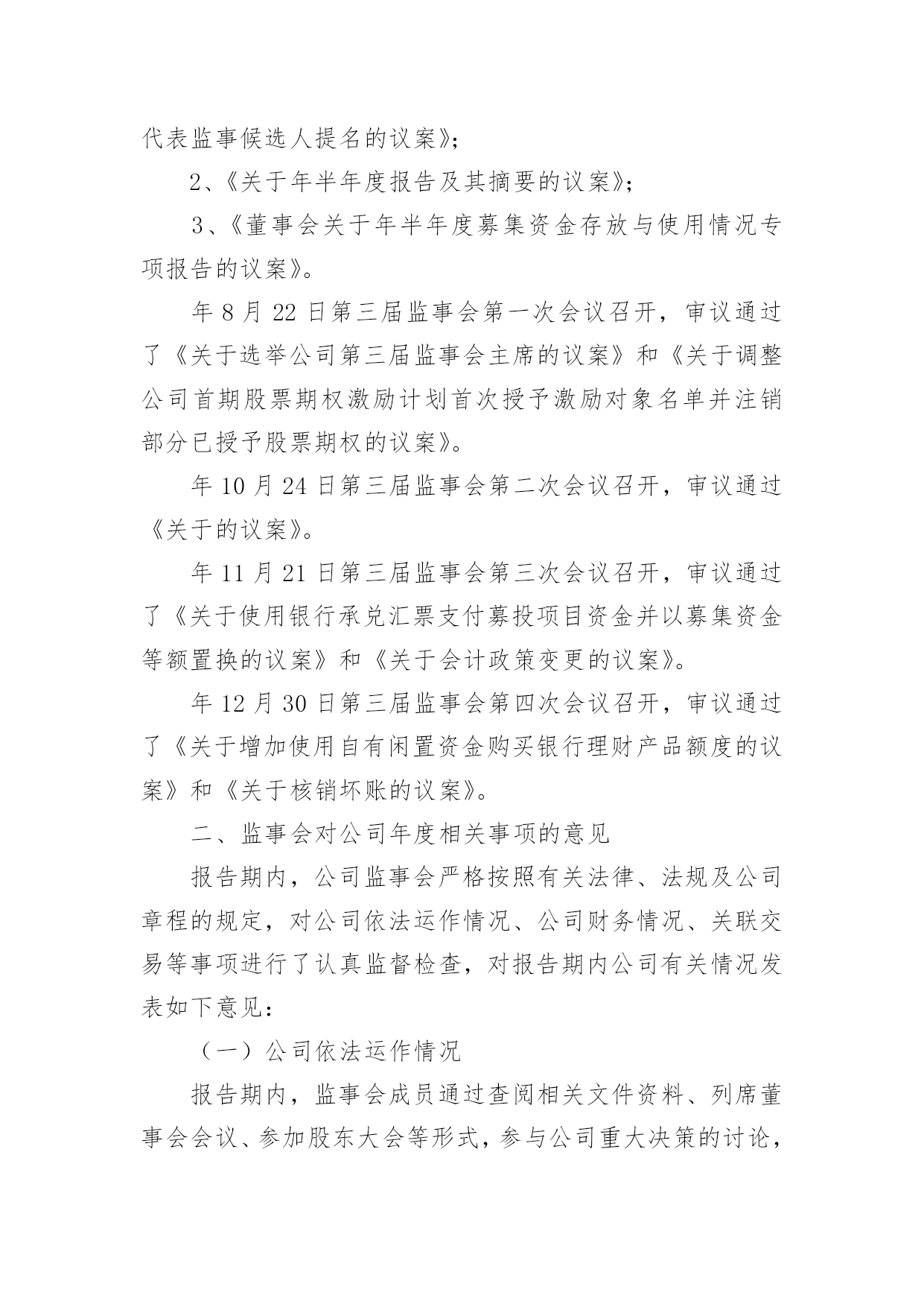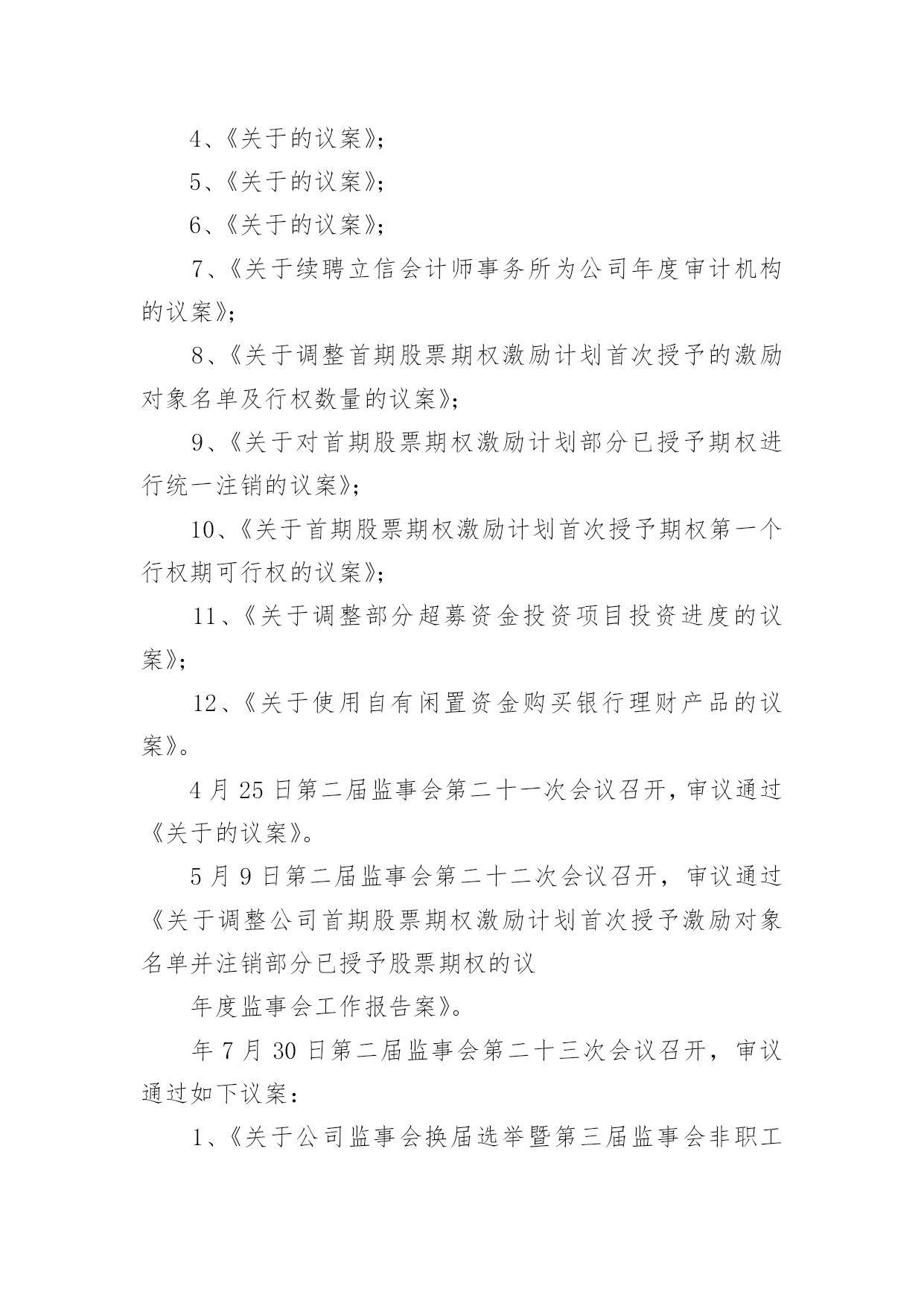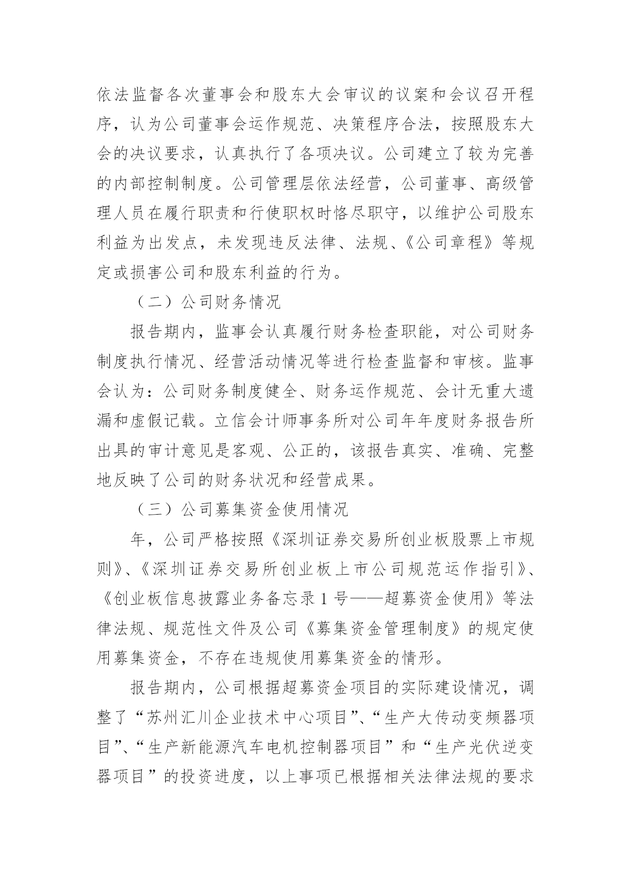 监事会工作报告监事会工作报告随着个人素质的提升,越来越多的事务都会使用到报告,报告中涉及到专业性术语要解释清楚。为了让您不再为写报告头疼,下面是小编为大家整理的监事会工作报告,欢迎大家分享。监事会工作报告篇1年,公司监事会严格按照《公司法》、《证券法》、《公司章程》、《监事会议事规则》和有关法律、法规等的要求,从切实维护公司利益和广大股东权益出发,认真履行了监督职责。现将年工作情况汇报如下:一、监事会会议情况年度监事会共召开9次会议。监事会的召开、审议及会议资料的签署以及监事权利的行使符合《公司法》、《公司章程》和《监事会议事规则》的相关规定,具体情况如下:年1月17日第二届监事会第十九次会议召开,审议通过《关于公司首期股票期权激励计划所涉预留股票期权授予事项的议案》。年3月11日第二届监事会第二十次会议召开,审议通过如下议案:1、《关于及其摘要的议案》;2、《关于的议案》;3、《20xx年度财务决算报告》;4、《关于的议案》;5、《关于的议案》;6、《关于的议案》;7、《关于续聘立信会计师事务所为公司年度审计机构的议案》;8、《关于调整首期股票期权激励计划首次授予的激励对象名单及行权数量的议案》;9、《关于对首期股票期权激励计划部分已授予期权进行统一注销的议案》;10、《关于首期股票期权激励计划首次授予期权第一个行权期可行权的议案》;11、《关于调整部分超募资金投资项目投资进度的议案》;12、《关于使用自有闲置资金购买银行理财产品的议案》。4月25日第二届监事会第二十一次会议召开,审议通过《关于的议案》。5月9日第二届监事会第二十二次会议召开,审议通过《关于调整公司首期股票期权激励计划首次授予激励对象名单并注销部分已授予股票期权的议年度监事会工作报告案》。年7月30日第二届监事会第二十三次会议召开,审议通过如下议案:1、《关于公司监事会换届选举暨第三届监事会非职工代表监事候选人提名的议案》;2、《关于年半年度报告及其摘要的议案》;3、《董事会关于年半年度募集资金存放与使用情况专项报告的议案》。年8月22日第三届监事会第一次会议召开,审议通过了《关于选举公司第三届监事会主席的议案》和《关于调整公司首期股票期权激励计划首次授予激励对象名单并注销部分已授予股票期权的议案》。年10月24日第三届监事会第二次会议召开,审议通过《关于的议案》。年11月21日第三届监事会第三次会议召开,审议通过了《关于使用银行承兑汇票支付募投项目资金并以募集资金等额置换的议案》和《关于会计政策变更的议案》。年12月30日第三届监事会第四次会议召开,审议通过了《关于增加使用自有闲置资金购买银行理财产品额度的议案》和《关于核销坏账的议案》。二、监事会对公司年度相关事项的意见报告期内,公司监事会严格按照有关法律、法规及公司章程的规定,对公司依法运作情况、公司财务情况、关联交易等事项进行了认真监督检查,对报告期内公司有关情况发表如下意见:(一)公司依法运作情况报告期内,监事会成员通过查阅相关文件资料、列席董事会会议、参加股东大会等形式,参与公司重大决策的讨论,依法监督各次董事会和股东大会审议的议案和会议召开程序,认为公司董事会运作规范、决策程序合法,按照股东大会的决议要求,认真执行了各项决议。公司建立了较为完善的内部控制制度。公司管理层依法经营,公司董事、高级管理人员在履行职责和行使职权时恪尽职守,以维护公司股东利益为出发点,未发现违反法律、法规、《公司章程》等规定或损害公司和股东利益的行为。(二)公司财务情况报告期内,监事会认真履行财务检查职能,对公司财务制度执行情况、经营活动情况等进行检查监督和审核。监事会认为:公司财务制度健全、财务运作规范、会计无重大遗漏和虚假记载。立信会计师事务所对公司年年度财务报告所出具的审计意见是客观、公正的,该报告真实、准确、完整地反映了公司的财务状况和经营成果。(三)公司募集资金使用情况年,公司严格按照《深圳证券交易所创业板股票上市规则》、《深圳证券交易所创业板上市公司规范运作指引》、《创业板信息披露业务备忘录1号——超募资金使用》等法律法规、规范性文件及公司《募集资金管理制度》的规定使用募集资金,不存在违规使用募集资金的情形。报告期内,公司根据超募资金项目的实际建设情况,调整了“苏州汇川企业技术中心项目”、“生产大传动变频器项目”、“生产新能源汽车电机控制器项目”和“生产光伏逆变器项目”的投资进度,以上事项已根据相关法律法规的要求履行了必要的审议程序,公司独立董事发表了独立意见,公司保荐机构出具了专项核查意见。本次调整不会对公司实施上述项目造成实质性的影响,不存在超募资金投资项目建设内容、实施主体和地点的变更,不会损害广大投资者的利益。(四)公司收购、出售资产交易情况报告期内,公司未发生收购、出售资产情况。没有发生损害股东
