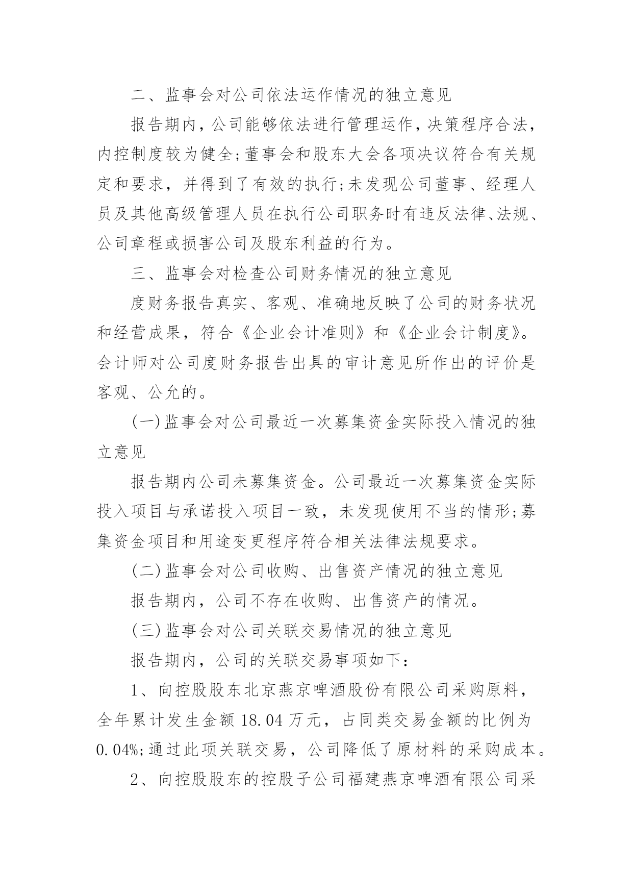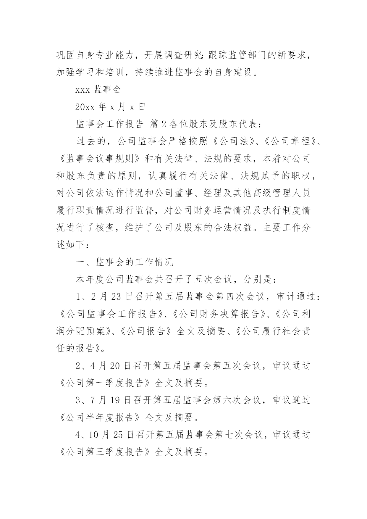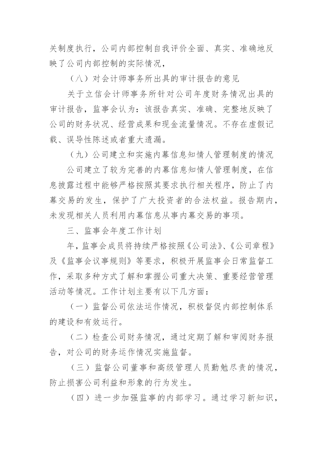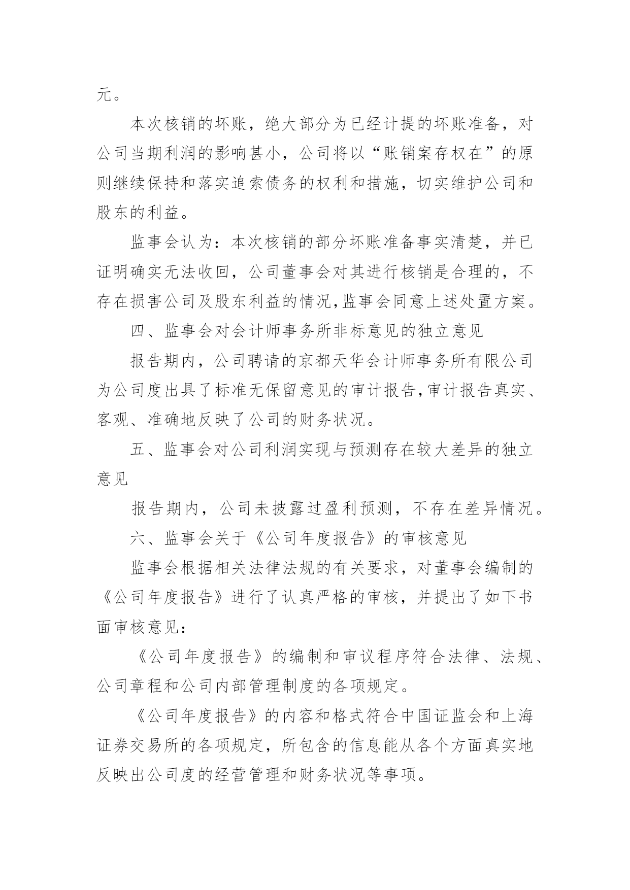 监事会工作报告监事会工作报告随着个人素质的提升,越来越多的事务都会使用到报告,报告中涉及到专业性术语要解释清楚。为了让您不再为写报告头疼,下面是小编为大家整理的监事会工作报告,欢迎大家分享。监事会工作报告篇1年,公司监事会严格按照《公司法》、《证券法》、《公司章程》、《监事会议事规则》和有关法律、法规等的要求,从切实维护公司利益和广大股东权益出发,认真履行了监督职责。现将年工作情况汇报如下:一、监事会会议情况年度监事会共召开9次会议。监事会的召开、审议及会议资料的签署以及监事权利的行使符合《公司法》、《公司章程》和《监事会议事规则》的相关规定,具体情况如下:年1月17日第二届监事会第十九次会议召开,审议通过《关于公司首期股票期权激励计划所涉预留股票期权授予事项的议案》。年3月11日第二届监事会第二十次会议召开,审议通过如下议案:1、《关于及其摘要的议案》;2、《关于的议案》;3、《20xx年度财务决算报告》;4、《关于的议案》;5、《关于的议案》;6、《关于的议案》;7、《关于续聘立信会计师事务所为公司年度审计机构的议案》;8、《关于调整首期股票期权激励计划首次授予的激励对象名单及行权数量的议案》;9、《关于对首期股票期权激励计划部分已授予期权进行统一注销的议案》;10、《关于首期股票期权激励计划首次授予期权第一个行权期可行权的议案》;11、《关于调整部分超募资金投资项目投资进度的议案》;12、《关于使用自有闲置资金购买银行理财产品的议案》。4月25日第二届监事会第二十一次会议召开,审议通过《关于的议案》。5月9日第二届监事会第二十二次会议召开,审议通过《关于调整公司首期股票期权激励计划首次授予激励对象名单并注销部分已授予股票期权的议年度监事会工作报告案》。年7月30日第二届监事会第二十三次会议召开,审议通过如下议案:1、《关于公司监事会换届选举暨第三届监事会非职工代表监事候选人提名的议案》;2、《关于年半年度报告及其摘要的议案》;3、《董事会关于年半年度募集资金存放与使用情况专项报告的议案》。年8月22日第三届监事会第一次会议召开,审议通过了《关于选举公司第三届监事会主席的议案》和《关于调整公司首期股票期权激励计划首次授予激励对象名单并注销部分已授予股票期权的议案》。年10月24日第三届监事会第二次会议召开,审议通过《关于的议案》。年11月21日第三届监事会第三次会议召开,审议通过了《关于使用银行承兑汇票支付募投项目资金并以募集资金等额置换的议案》和《关于会计政策变更的议案》。年12月30日第三届监事会第四次会议召开,审议通过了《关于增加使用自有闲置资金购买银行理财产品额度的议案》和《关于核销坏账的议案》。二、监事会对公司年度相关事项的意见报告期内,公司监事会严格按照有关法律、法规及公司章程的规定,对公司依法运作情况、公司财务情况、关联交易等事项进行了认真监督检查,对报告期内公司有关情况发表如下意见:(一)公司依法运作情况报告期内,监事会成员通过查阅相关文件资料、列席董事会会议、参加股东大会等形式,参与公司重大决策的讨论,依法监督各次董事会和股东大会审议的议案和会议召开程序,认为公司董事会运作规范、决策程序合法,按照股东大会的决议要求,认真执行了各项决议。公司建立了较为完善的内部控制制度。公司管理层依法经营,公司董事、高级管理人员在履行职责和行使职权时恪尽职守,以维护公司股东利益为出发点,未发现违反法律、法规、《公司章程》等规定或损害公司和股东利益的行为。(二)公司财务情况报告期内,监事会认真履行财务检查职能,对公司财务制度执行情况、经营活动情况等进行检查监督和审核。监事会认为:公司财务制度健全、财务运作规范、会计无重大遗漏和虚假记载。立信会计师事务所对公司年年度财务报告所出具的审计意见是客观、公正的,该报告真实、准确、完整地反映了公司的财务状况和经营成果。(三)公司募集资金使用情况年,公司严格按照《深圳证券交易所创业板股票上市规则》、《深圳证券交易所创业板上市公司规范运作指引》、《创业板信息披露业务备忘录1号——超募资金使用》等法律法规、规范性文件及公司《募集资金管理制度》的规定使用募集资金,不存在违规使用募集资金的情形。报告期内,公司根据超募资金项目的实际建设情况,调整了“苏州汇川企业技术中心项目”、“生产大传动变频器项目”、“生产新能源汽车电机控制器项目”和“生产光伏逆变器项目”的投资进度,以上事项已根据相关法律法规的要求履行了必要的审议程序,公司独立董事发表了独立意见,公司保荐机构出具了专项核查意见。本次调整不会对公司实施上述项目造成实质性的影响,不存在超募资金投资项目建设内容、实施主体和地点的变更,不会损害广大投资者的利益。(四)公司收购、出售资产交易情况报告期内,公司未发生收购、出售资产情况。没有发生损害股东