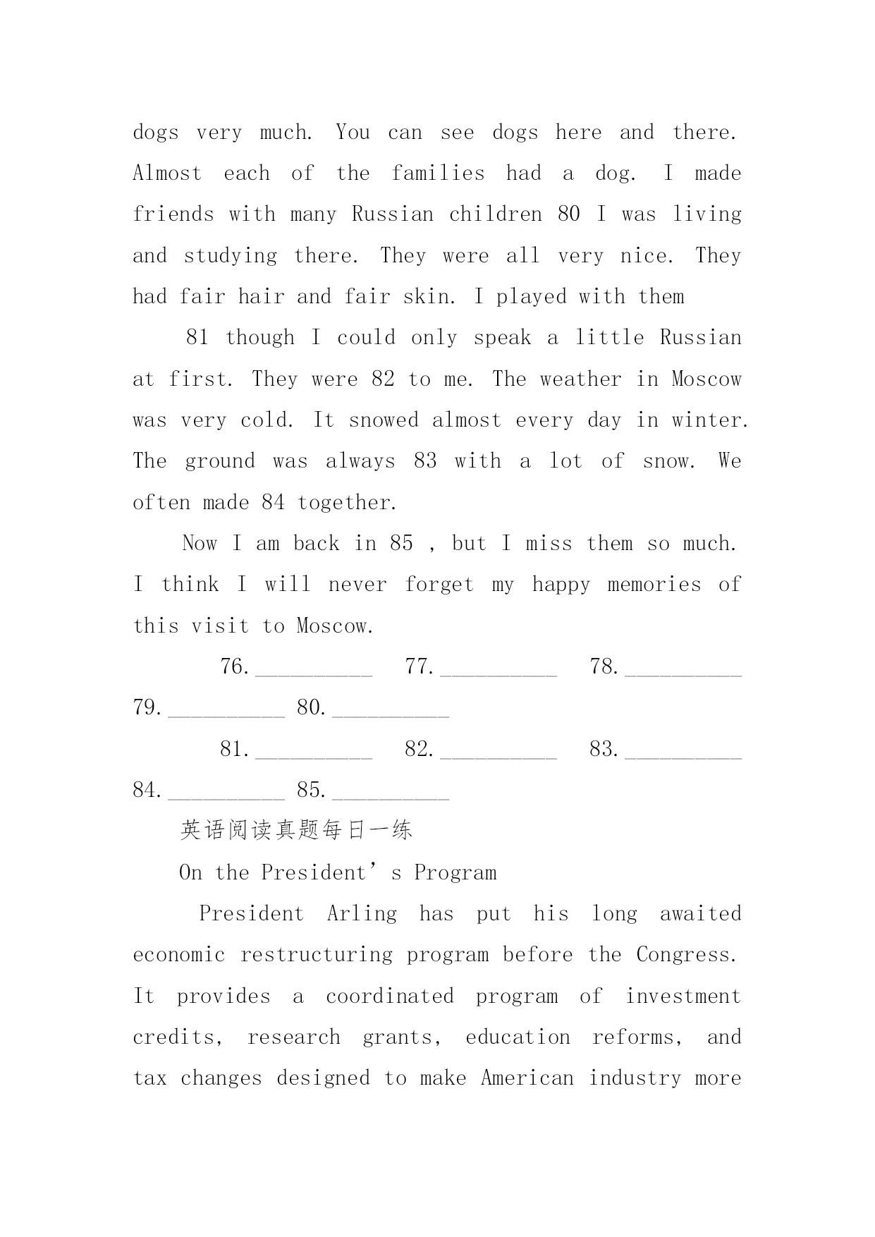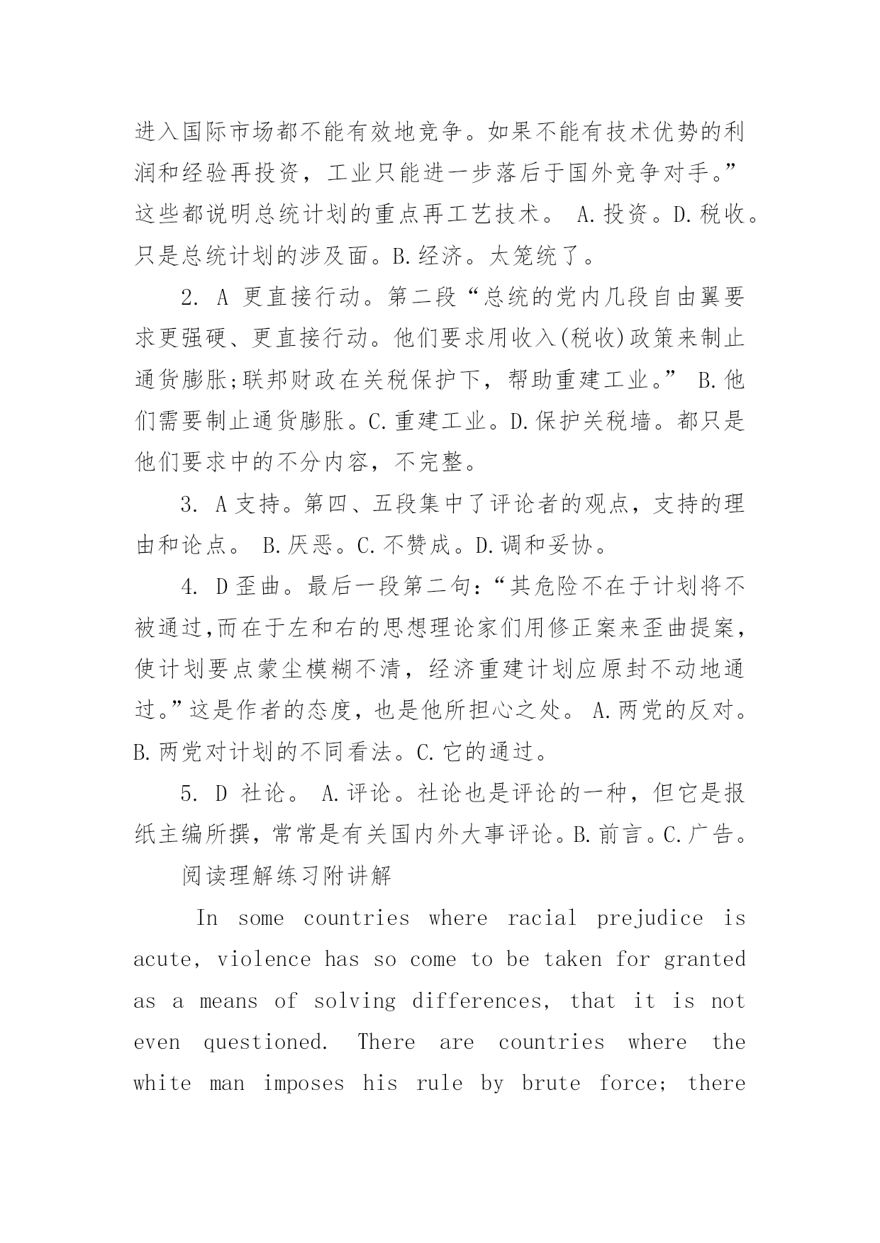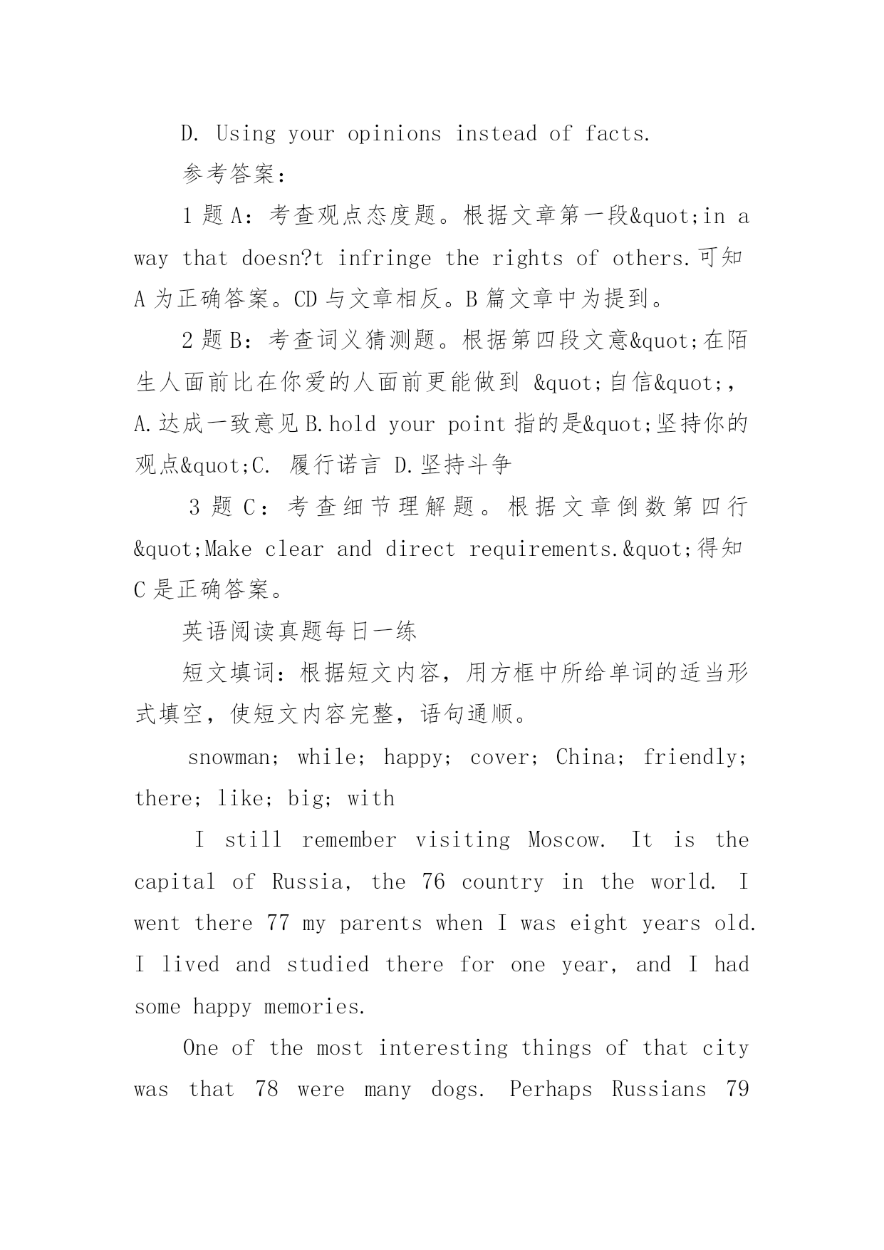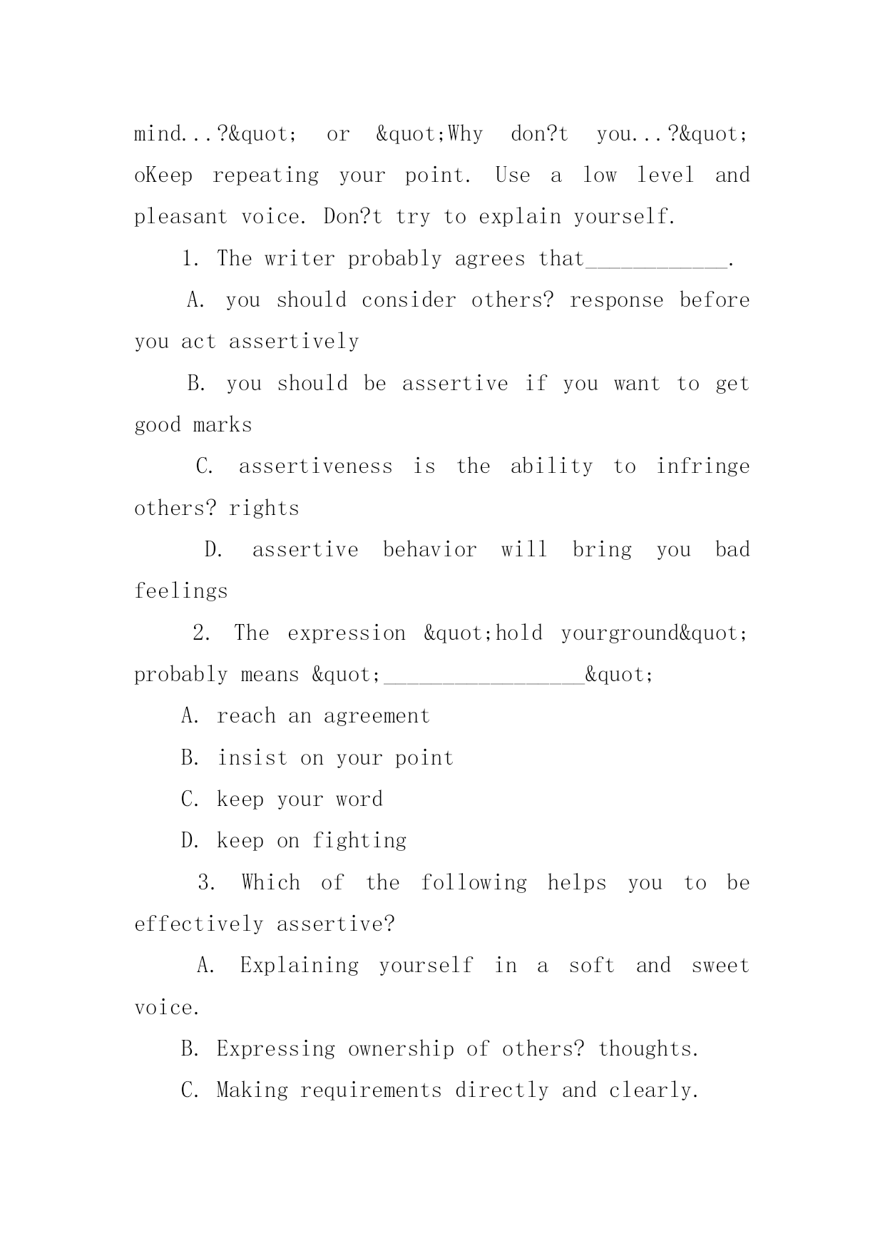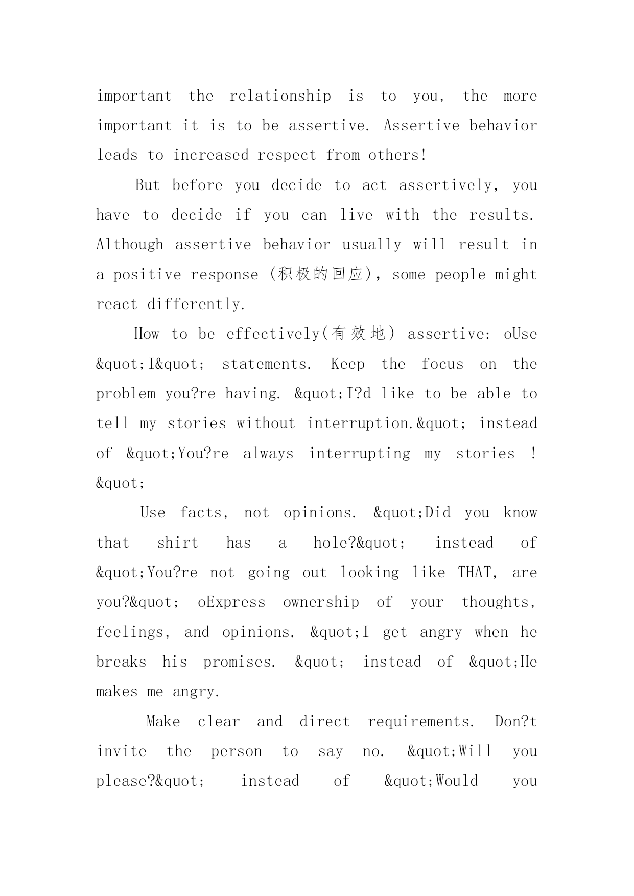 英语阅读真题每日一练英语阅读真题每日一练英语阅读真题每日一练Assertivenessistheabilitytoconfidentlyexpressyouropinions,feelings,attitudes,andrights,inawaythatdoesn?tinfringe(侵犯)therightsofothers.Manyofusaretaughtthatitisnotnicetoconsiderourownneedsabovethoseofothers.Ifsomeonesaysordoessomethingthatwedon?tlike,weshouldjustbequietandtrytostayawayfromthatpersoninthefuture.WhyisAssertivenessimportant?Ifyoudon?tknowhowtobeassertive,youmightexperience:Depression-Anger,asenseofbeinghelpless,hopeless,orofhavingnocontroloveryourlife.oResentment-Angeratothersfortakingadvantageofyou.oFrustration-WhydidIallowthattohappen?Mostpeoplefinditeasiertobeassertiveinsomesituationsthaninothers.Thismakesperfectsense.It?saloteasiertoholdyourgroundwithastrangerthanwithsomeoneyoulove.Butthemoreimportanttherelationshipistoyou,themoreimportantitistobeassertive.Assertivebehaviorleadstoincreasedrespectfromothers!Butbeforeyoudecidetoactassertively,youhavetodecideifyoucanlivewiththeresults.Althoughassertivebehaviorusuallywillresultinapositiveresponse(积极的回应),somepeoplemightreactdifferently.Howtobeeffectively(有效地)assertive:oUse"I"statements.Keepthefocusontheproblemyou?rehaving."I?dliketobeabletotellmystorieswithoutinterruption."insteadof"You?realwaysinterruptingmystories!"Usefacts,notopinions."Didyouknowthatshirthasahole?"insteadof"You?renotgoingoutlookinglikeTHAT,areyou?"oExpressownershipofyourthoughts,feelings,andopinions."Igetangrywhenhebreakshispromises."insteadof"Hemakesmeangry.Makeclearanddirectrequirements.Don?tinvitethepersontosayno."Willyouplease?"insteadof"Wouldyoumind...?"or"Whydon?tyou...?"oKeeprepeatingyourpoint.Usealowlevelandpleasantvoice.Don?ttrytoexplainyourself.1.Thewriterprobablyagreesthat____________.A.youshouldconsiderothers?responsebeforeyouactassertivelyB.youshouldbeassertiveifyouwanttogetgoodmarksC.assertivenessistheabilitytoinfringeothers?rightsD.assertivebehaviorwillbringyoubadfeelings2.Theexpression"hol