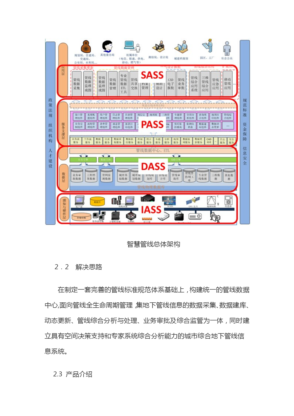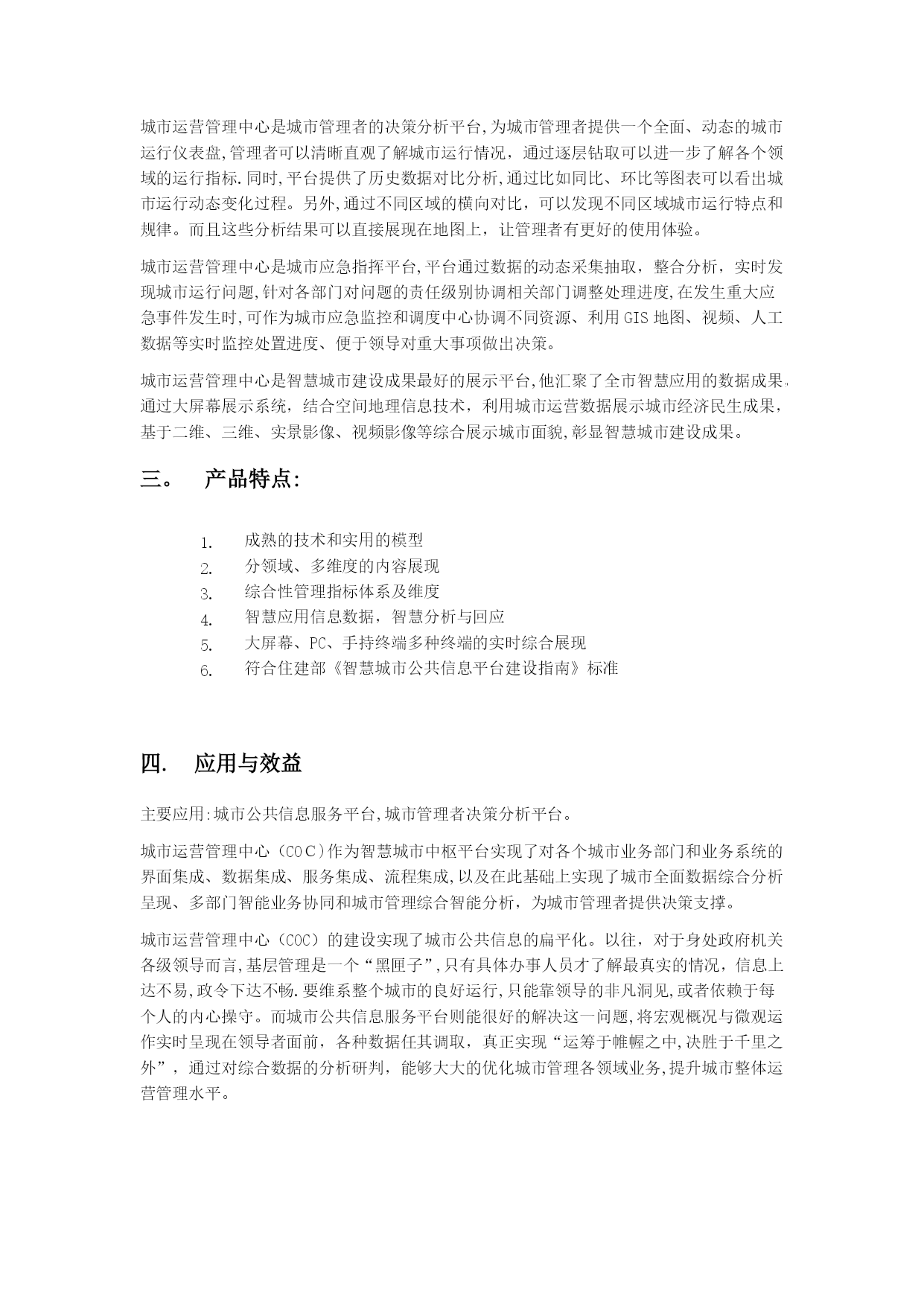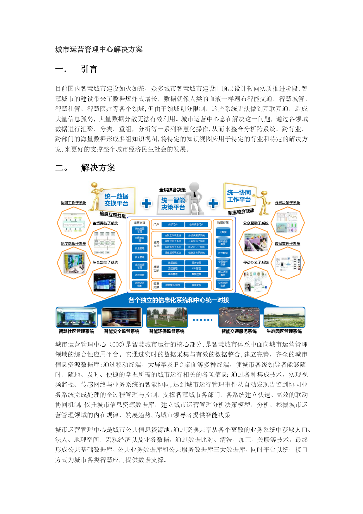 城市运营管理中心解决方案(完整资料)(可以直接使用,可编辑优秀版资料,欢迎下载)城市运营管理中心解决方案一.引言目前国内智慧城市建设如火如荼,众多城市智慧城市建设由顶层设计转向实质推进阶段,智慧城市的建设带来了数据爆炸式增长,数据就像人类的血液一样遍布智能交通、智慧城管、智慧社管、智慧医疗等各个领域,但由于领域划分限制,这些系统无法做到互联互通,造成大量信息孤岛,大量数据分散无法有效利用。城市运营中心意在解决这一问题,通过各领域数据进行汇聚、分类、重组,分析等一系列智慧化操作,从而来整合分析跨系统、跨行业、跨部门的海量数据形成多组知识视图,将特定的知识视图应用于特定的行业和特定的解决方案,来更好的支撑整个城市经济民生社会的发展。二。解决方案城市运营管理中心(COC)是智慧城市运行的核心部分,是智慧城市体系中面向城市运营管理领域的综合性应用平台。它通过实时的数据采集与有效的数据整合,建立完善、齐全的城市信息资源数据库;通过移动终端、大屏幕及PC桌面等多种终端,使城市各级领导者能够随时、随地、及时、便捷的掌握所需的城市运行相关的各项信息;通过各种集成技术,实现视频监控、传感网络与业务系统的智能协同,达到城市运行管理事件从自动发现告警到协同业务系统完成处理的全过程管理与控制,支撑智慧城市各部门、各系统建立快速、高效的联动协同机制;依托城市信息资源数据库,建立城市运营管理分析决策模型,分析、挖掘城市运营管理领域的内在规律、发展趋势,为城市领导者提供智能决策。城市运营管理中心是城市公共信息资源池,通过交换共享从各个离散的业务系统中获取人口、法人、地理空间、宏观经济以及业务数据,通过数据比对、清洗、加工、关联等技术,最终形成公共基础数据库、公共业务数据库和公共服务数据库三大数据库,同时平台以统一接口方式为城市各类智慧应用提供数据支撑。城市运营管理中心是城市管理者的决策分析平台,为城市管理者提供一个全面、动态的城市运行仪表盘,管理者可以清晰直观了解城市运行情况,通过逐层钻取可以进一步了解各个领域的运行指标.同时,平台提供了历史数据对比分析,通过比如同比、环比等图表可以看出城市运行动态变化过程。另外,通过不同区域的横向对比,可以发现不同区域城市运行特点和规律。而且这些分析结果可以直接展现在地图上,让管理者有更好的使用体验。城市运营管理中心是城市应急指挥平台,平台通过数据的动态采集抽取,整合分析,实时发现城市运行问题,针对各部门对问题的责任级别协调相关部门调整处理进度,在发生重大应急事件发生时,可作为城市应急监控和调度中心协调不同资源、利用GIS地图、视频、人工数据等实时监控处置进度、便于领导对重大事项做出决策。城市运营管理中心是智慧城市建设成果最好的展示平台,他汇聚了全市智慧应用的数据成果,通过大屏幕展示系统,结合空间地理信息技术,利用城市运营数据展示城市经济民生成果,基于二维、三维、实景影像、视频影像等综合展示城市面貌,彰显智慧城市建设成果。三。产品特点:成熟的技术和实用的模型分领域、多维度的内容展现综合性管理指标体系及维度智慧应用信息数据,智慧分析与回应大屏幕、PC、手持终端多种终端的实时综合展现符合住建部《智慧城市公共信息平台建设指南》标准四.应用与效益主要应用:城市公共信息服务平台,城市管理者决策分析平台。城市运营管理中心(COC)作为智慧城市中枢平台实现了对各个城市业务部门和业务系统的界面集成、数据集成、服务集成、流程集成,以及在此基础上实现了城市全面数据综合分析呈现、多部门智能业务协同和城市管理综合智能分析,为城市管理者提供决策支撑。城市运营管理中心(COC)的建设实现了城市公共信息的扁平化。以往,对于身处政府机关各级领导而言,基层管理是一个“黑匣子”,只有具体办事人员才了解最真实的情况,信息上达不易,政令下达不畅.要维系整个城市的良好运行,只能靠领导的非凡洞见,或者依赖于每个人的内心操守。而城市公共信息服务平台则能很好的解决这一问题,将宏观概况与微观运作实时呈现在领导者面前,各种数据任其调取,真正实现“运筹于帷幄之中,决胜于千里之外”,通过对综合数据的分析研判,能够大大的优化城市管理各领域业务,提升城市整体运营管理水平。城信所“智慧管线”解决方案来源:3sNews2014-08-1216:02:071建设背景地下管线是保障城市正常运行的重要基础设施.随着城市功能的调整和城市建设的迅速发展,地下管线日益错综复杂,管线信息更新频繁,其管理难度也在不断增大。由于管线信息管理不善,导致道路的改、扩建工程和管线市政工程中各类管线安全事故频发,给社会安全稳定带来隐患。近年来,国家对城市管线的重视力度逐步加深,2013年9月出台的《国务院关于加强城市基础设施建设的意见》强调应“坚持先地