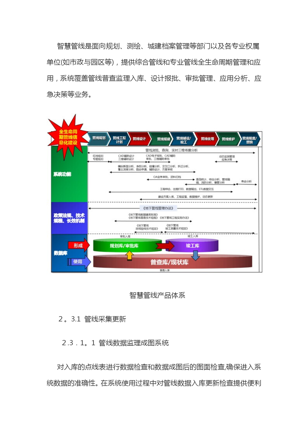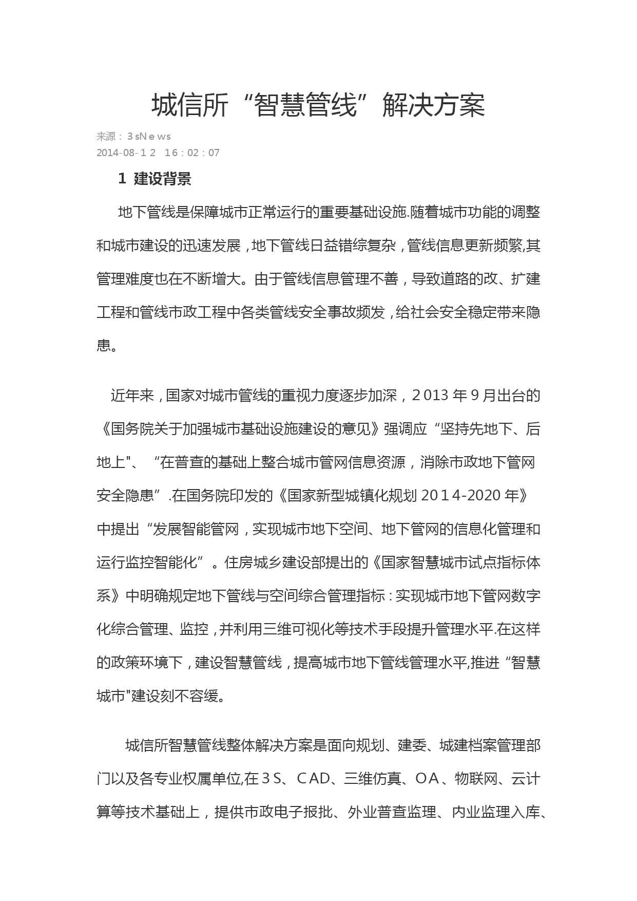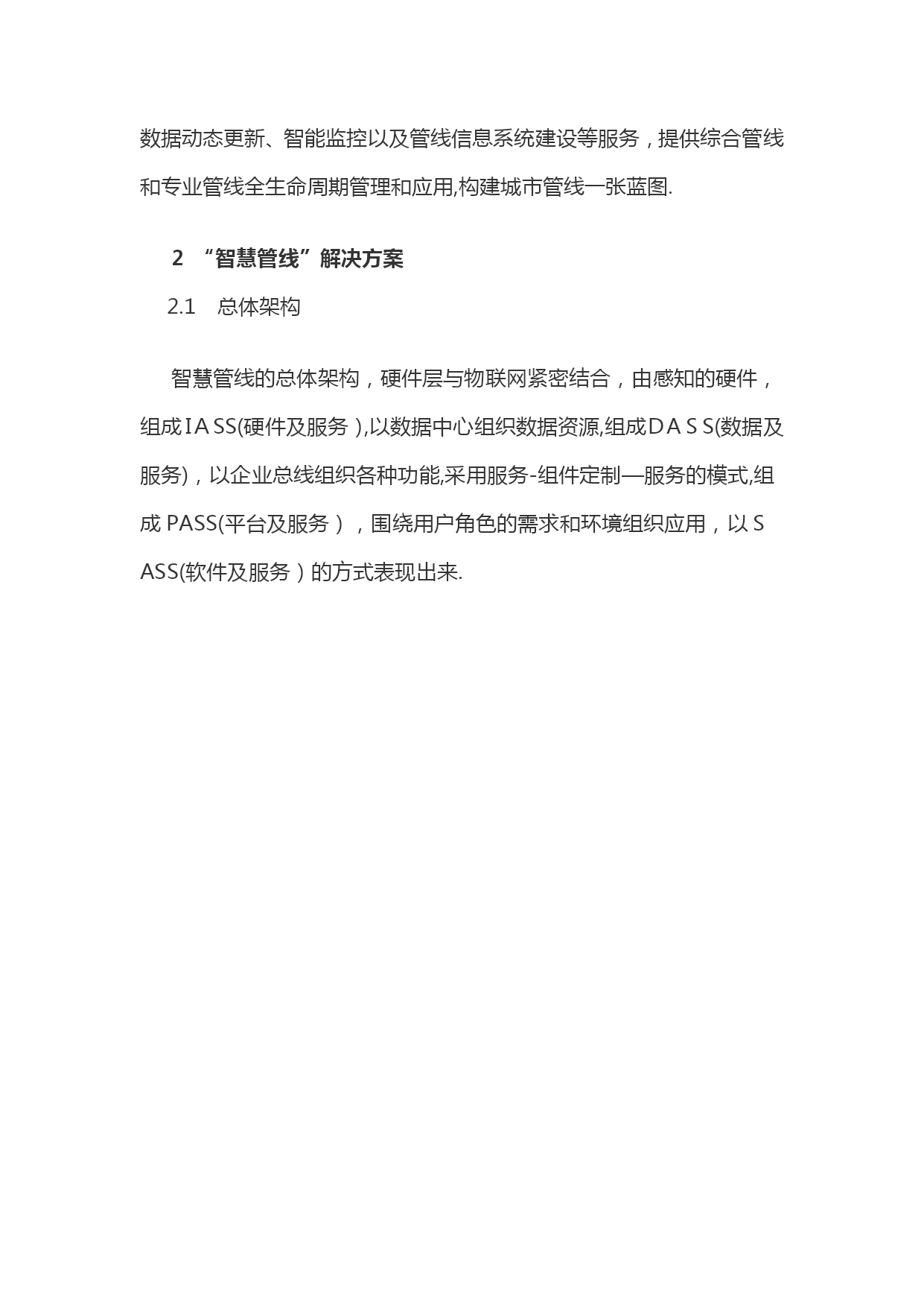 城市运营管理中心解决方案(完整资料)(可以直接使用,可编辑优秀版资料,欢迎下载)城市运营管理中心解决方案一.引言目前国内智慧城市建设如火如荼,众多城市智慧城市建设由顶层设计转向实质推进阶段,智慧城市的建设带来了数据爆炸式增长,数据就像人类的血液一样遍布智能交通、智慧城管、智慧社管、智慧医疗等各个领域,但由于领域划分限制,这些系统无法做到互联互通,造成大量信息孤岛,大量数据分散无法有效利用。城市运营中心意在解决这一问题,通过各领域数据进行汇聚、分类、重组,分析等一系列智慧化操作,从而来整合分析跨系统、跨行业、跨部门的海量数据形成多组知识视图,将特定的知识视图应用于特定的行业和特定的解决方案,来更好的支撑整个城市经济民生社会的发展。二。解决方案城市运营管理中心(COC)是智慧城市运行的核心部分,是智慧城市体系中面向城市运营管理领域的综合性应用平台。它通过实时的数据采集与有效的数据整合,建立完善、齐全的城市信息资源数据库;通过移动终端、大屏幕及PC桌面等多种终端,使城市各级领导者能够随时、随地、及时、便捷的掌握所需的城市运行相关的各项信息;通过各种集成技术,实现视频监控、传感网络与业务系统的智能协同,达到城市运行管理事件从自动发现告警到协同业务系统完成处理的全过程管理与控制,支撑智慧城市各部门、各系统建立快速、高效的联动协同机制;依托城市信息资源数据库,建立城市运营管理分析决策模型,分析、挖掘城市运营管理领域的内在规律、发展趋势,为城市领导者提供智能决策。城市运营管理中心是城市公共信息资源池,通过交换共享从各个离散的业务系统中获取人口、法人、地理空间、宏观经济以及业务数据,通过数据比对、清洗、加工、关联等技术,最终形成公共基础数据库、公共业务数据库和公共服务数据库三大数据库,同时平台以统一接口方式为城市各类智慧应用提供数据支撑。城市运营管理中心是城市管理者的决策分析平台,为城市管理者提供一个全面、动态的城市运行仪表盘,管理者可以清晰直观了解城市运行情况,通过逐层钻取可以进一步了解各个领域的运行指标.同时,平台提供了历史数据对比分析,通过比如同比、环比等图表可以看出城市运行动态变化过程。另外,通过不同区域的横向对比,可以发现不同区域城市运行特点和规律。而且这些分析结果可以直接展现在地图上,让管理者有更好的使用体验。城市运营管理中心是城市应急指挥平台,平台通过数据的动态采集抽取,整合分析,实时发现城市运行问题,针对各部门对问题的责任级别协调相关部门调整处理进度,在发生重大应急事件发生时,可作为城市应急监控和调度中心协调不同资源、利用GIS地图、视频、人工数据等实时监控处置进度、便于领导对重大事项做出决策。城市运营管理中心是智慧城市建设成果最好的展示平台,他汇聚了全市智慧应用的数据成果,通过大屏幕展示系统,结合空间地理信息技术,利用城市运营数据展示城市经济民生成果,基于二维、三维、实景影像、视频影像等综合展示城市面貌,彰显智慧城市建设成果。三。产品特点:成熟的技术和实用的模型分领域、多维度的内容展现综合性管理指标体系及维度智慧应用信息数据,智慧分析与回应大屏幕、PC、手持终端多种终端的实时综合展现符合住建部《智慧城市公共信息平台建设指南》标准四.应用与效益主要应用:城市公共信息服务平台,城市管理者决策分析平台。城市运营管理中心(COC)作为智慧城市中枢平台实现了对各个城市业务部门和业务系统的界面集成、数据集成、服务集成、流程集成,以及在此基础上实现了城市全面数据综合分析呈现、多部门智能业务协同和城市管理综合智能分析,为城市管理者提供决策支撑。城市运营管理中心(COC)的建设实现了城市公共信息的扁平化。以往,对于身处政府机关各级领导而言,基层管理是一个“黑匣子”,只有具体办事人员才了解最真实的情况,信息上达不易,政令下达不畅.要维系整个城市的良好运行,只能靠领导的非凡洞见,或者依赖于每个人的内心操守。而城市公共信息服务平台则能很好的解决这一问题,将宏观概况与微观运作实时呈现在领导者面前,各种数据任其调取,真正实现“运筹于帷幄之中,决胜于千里之外”,通过对综合数据的分析研判,能够大大的优化城市管理各领域业务,提升城市整体运营管理水平。城信所“智慧管线”解决方案来源:3sNews2014-08-1216:02:071建设背景地下管线是保障城市正常运行的重要基础设施.随着城市功能的调整和城市建设的迅速发展,地下管线日益错综复杂,管线信息更新频繁,其管理难度也在不断增大。由于管线信息管理不善,导致道路的改、扩建工程和管线市政工程中各类管线安全事故频发,给社会安全稳定带来隐患。近年来,国家对城市管线的重视力度逐步加深,2013年9月出台的《国务院关于加强城市基础设施建设的意见》强调应“坚持先地