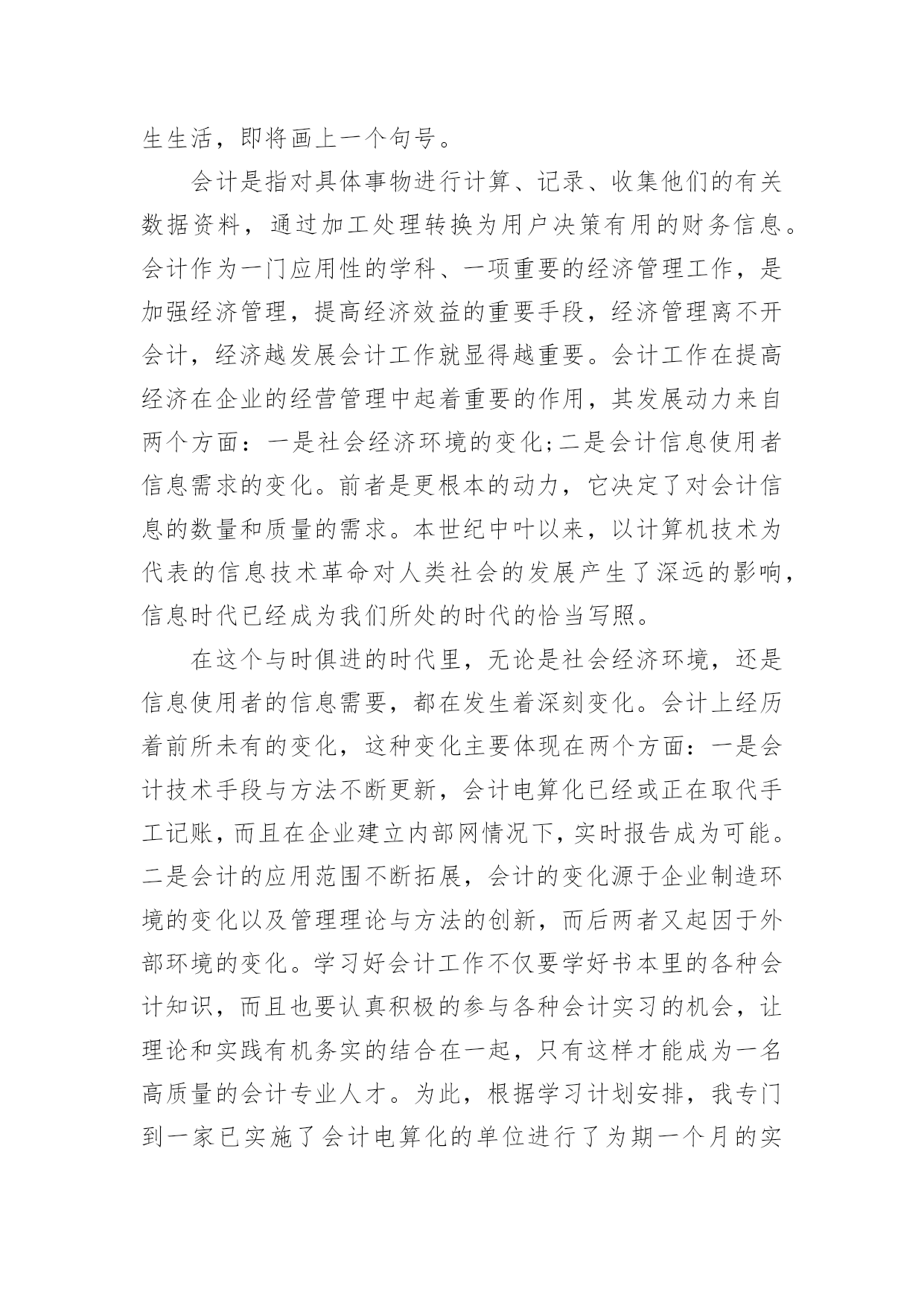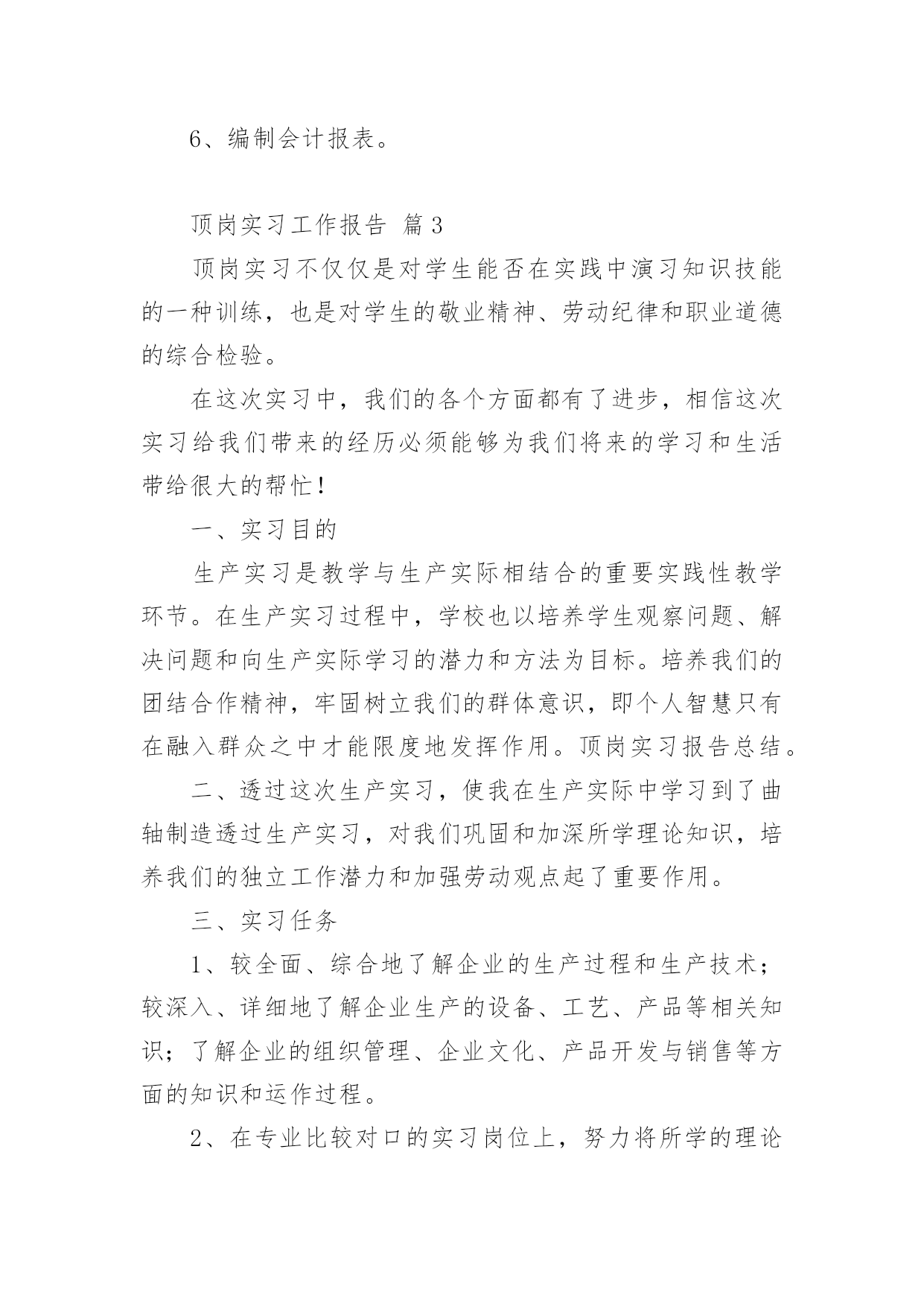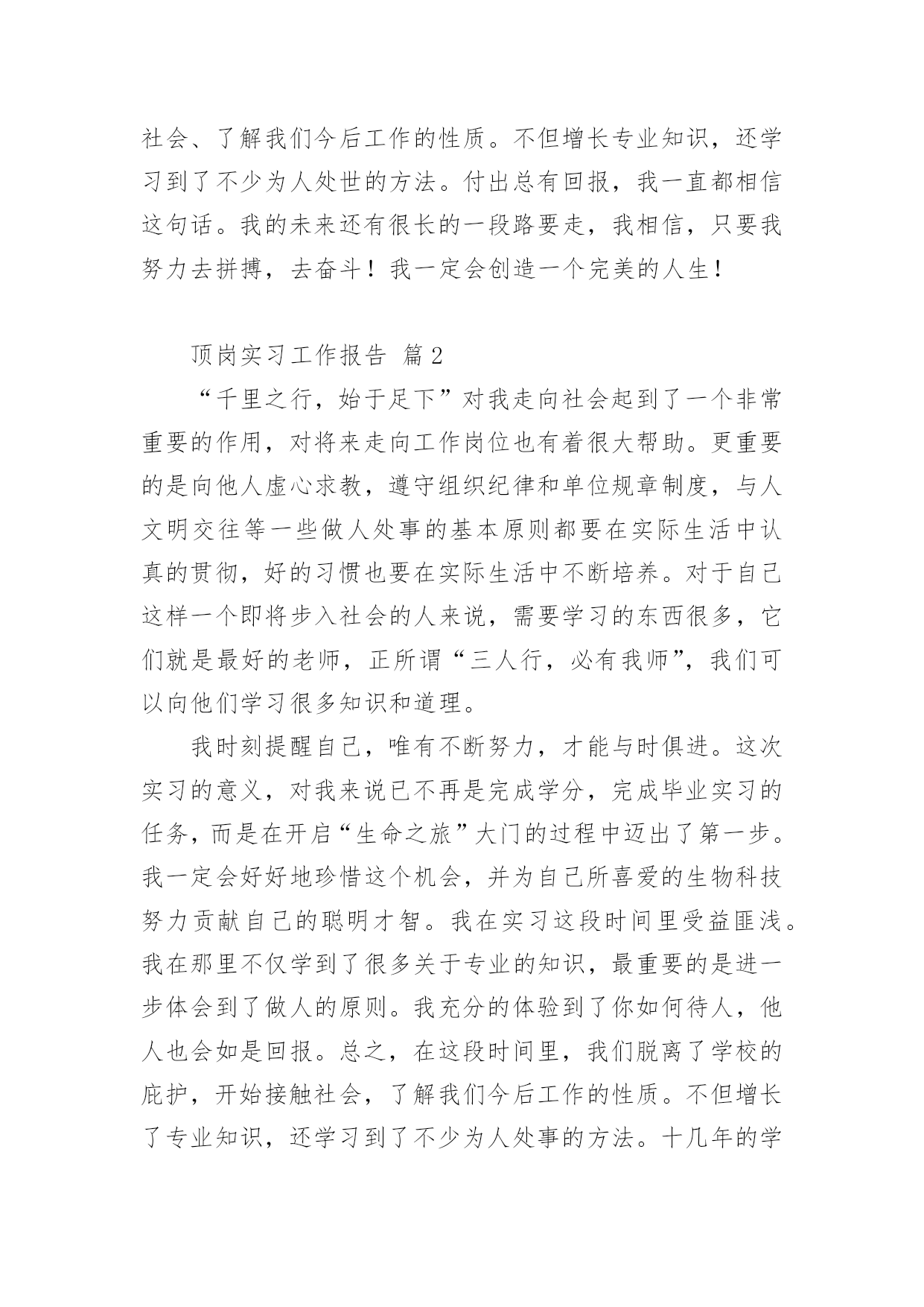 顶岗实习工作报告篇1顶岗实习工作报告随着人们自身素质提升,报告的用途越来越大,报告根据用途的不同也有着不同的类型。为了让您不再为写报告头疼,以下是小编精心整理的顶岗实习工作报告,欢迎阅读与收藏。顶岗实习工作报告篇1漫长的实习生活,使我学到了很多在学校里学不到的知识,也提高了自己的学习,分析和解决问题的能力,认识到了工作的艰辛。无聊且乏味的工作,培养了我吃苦耐劳的精神。长时间的作业时间,洗去了在学校时的那种“娇生惯养”,让我的心志变得更加坚强。现时跟理想的差距,让我有勇气去面对任何事,时间的洗礼,让我明白自己缺少的是什么,今后应该往哪个方向去努力。在这里,我学会了如何将一切微不足道的小事做到完美。这些对我来说都是受益终生的。不知不觉中已经快毕业了,以前,我总是盼望早点到社会参加工作,因为我总觉得工作是一件很容易的事,可是当我离开校园,真的进入社会实习后,才真正体验到--工作,并不是想象中的那样--它又苦又累,可不是件容易的事。从刚开始出来工作感觉人生的'迷茫,无助和恐慌,到现在对追求想、事业的热诚,我感觉到自己开始变的成熟懂事,思维更加的活跃,处理事情的能力也得到了提升。所以走出学校踏入社会真的让我学到了很多在学校在书本上学不到东西。上班第一天,我的心情激动、兴奋、期盼、喜悦。我相信,只要我认真学习,好好把握,做好每件事,肯定会有成绩。然而,现实中却经常会出现一些你意想不到的事情,经常使你手足无措。这时你就要学会沉着、冷静,想办法去求助,解决它。不要抵触,要主动跟别人接触。美国著名人际关系专家戴尔'卡耐基曾这样说:“一个人的成功只有百分之十五是依靠专业技术,而百分之八十五却要依靠人际交往、有效说话等软科学本领。”公司里的人员来自五湖四海,不同地区的人有着不同的生活习惯和生活方式等,不同地区的人相处要讲究不同的方式方法。只有这样,才能营造良好的人际关系。最主要的是,与同事相处一定要礼貌、谦虚、宽容、相互关心、相互帮忙和相互体谅。我始终相信是这次的实习给我很多感悟,虽然艰辛,但收获颇丰,甚至认为对我以后的道路都有很深远的影响,因为我学会了在实习时坚强和坚持。今后的工作还会遇到许多新的东西,这些东西会给我带来新的体验和新的体会,因此,我坚信:只要我用心去发掘,勇敢地去尝试,一定会有更大的收获和启发的,也只有这样才能为自己以后的工作和生活积累更多丰富的知识和宝贵的经验。总之,在富士康科技集团实习工作的这段时间里,我脱离了学校的庇护,开始接触社会、了解我们今后工作的性质。不但增长专业知识,还学习到了不少为人处世的方法。付出总有回报,我一直都相信这句话。我的未来还有很长的一段路要走,我相信,只要我努力去拼搏,去奋斗!我一定会创造一个完美的人生!顶岗实习工作报告篇2“千里之行,始于足下”对我走向社会起到了一个非常重要的作用,对将来走向工作岗位也有着很大帮助。更重要的是向他人虚心求教,遵守组织纪律和单位规章制度,与人文明交往等一些做人处事的基本原则都要在实际生活中认真的贯彻,好的习惯也要在实际生活中不断培养。对于自己这样一个即将步入社会的人来说,需要学习的东西很多,它们就是最好的老师,正所谓“三人行,必有我师”,我们可以向他们学习很多知识和道理。我时刻提醒自己,唯有不断努力,才能与时俱进。这次实习的意义,对我来说已不再是完成学分,完成毕业实习的任务,而是在开启“生命之旅”大门的过程中迈出了第一步。我一定会好好地珍惜这个机会,并为自己所喜爱的生物科技努力贡献自己的聪明才智。我在实习这段时间里受益匪浅。我在那里不仅学到了很多关于专业的知识,最重要的是进一步体会到了做人的原则。我充分的体验到了你如何待人,他人也会如是回报。总之,在这段时间里,我们脱离了学校的庇护,开始接触社会,了解我们今后工作的性质。不但增长了专业知识,还学习到了不少为人处事的方法。十几年的学生生活,即将画上一个句号。会计是指对具体事物进行计算、记录、收集他们的有关数据资料,通过加工处理转换为用户决策有用的财务信息。会计作为一门应用性的学科、一项重要的经济管理工作,是加强经济管理,提高经济效益的重要手段,经济管理离不开会计,经济越发展会计工作就显得越重要。会计工作在提高经济在企业的经营管理中起着重要的作用,其发展动力来自两个方面:一是社会经济环境的变化;二是会计信息使用者信息需求的变化。前者是更根本的动力,它决定了对会计信息的数量和质量的需求。本世纪中叶以来,以计算机技术为代表的信息技术革命对人类社会的发展产生了深远的影响,信息时代已经成为我们所处的时代的恰当写照。在这个与时俱进的时代里,无论是社会经济环境,还是信息使用者的信息需要,都在发生着深刻变化。会计上经历着前所未有的变化,这种变化主要体现在两个方面:一是会计技术手段与方法不断更新,会计电算化已经或正在取代手工记账,而且在