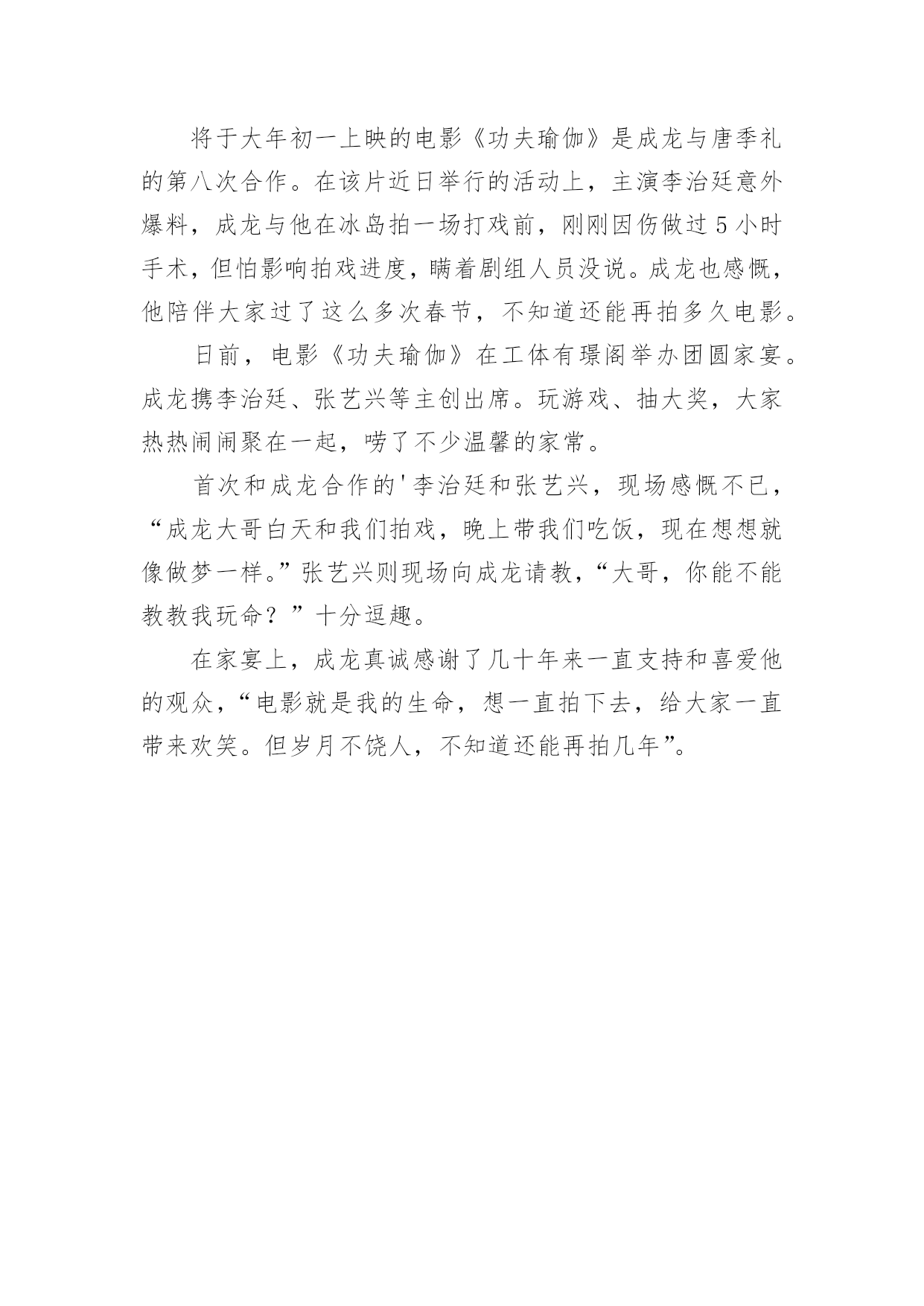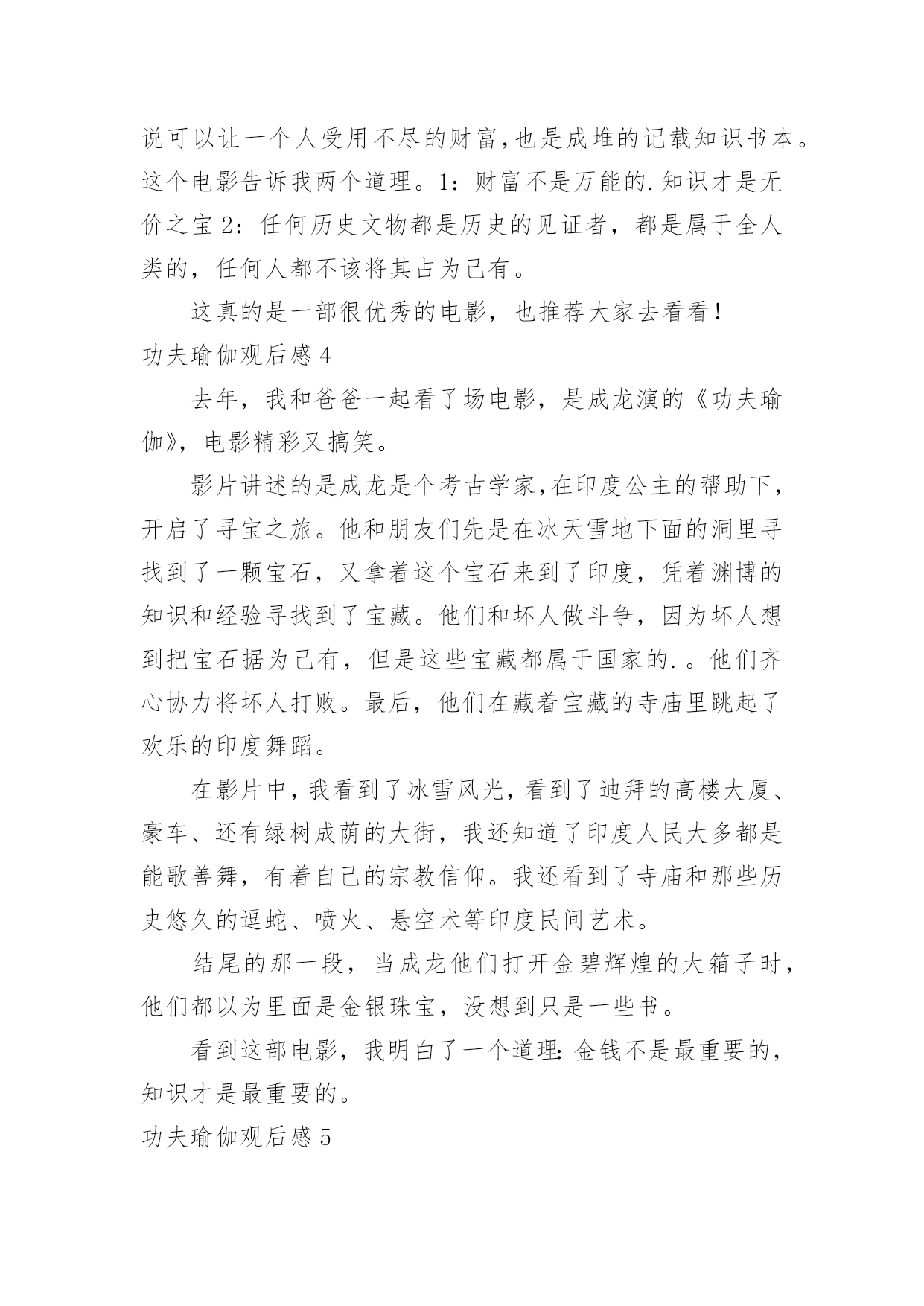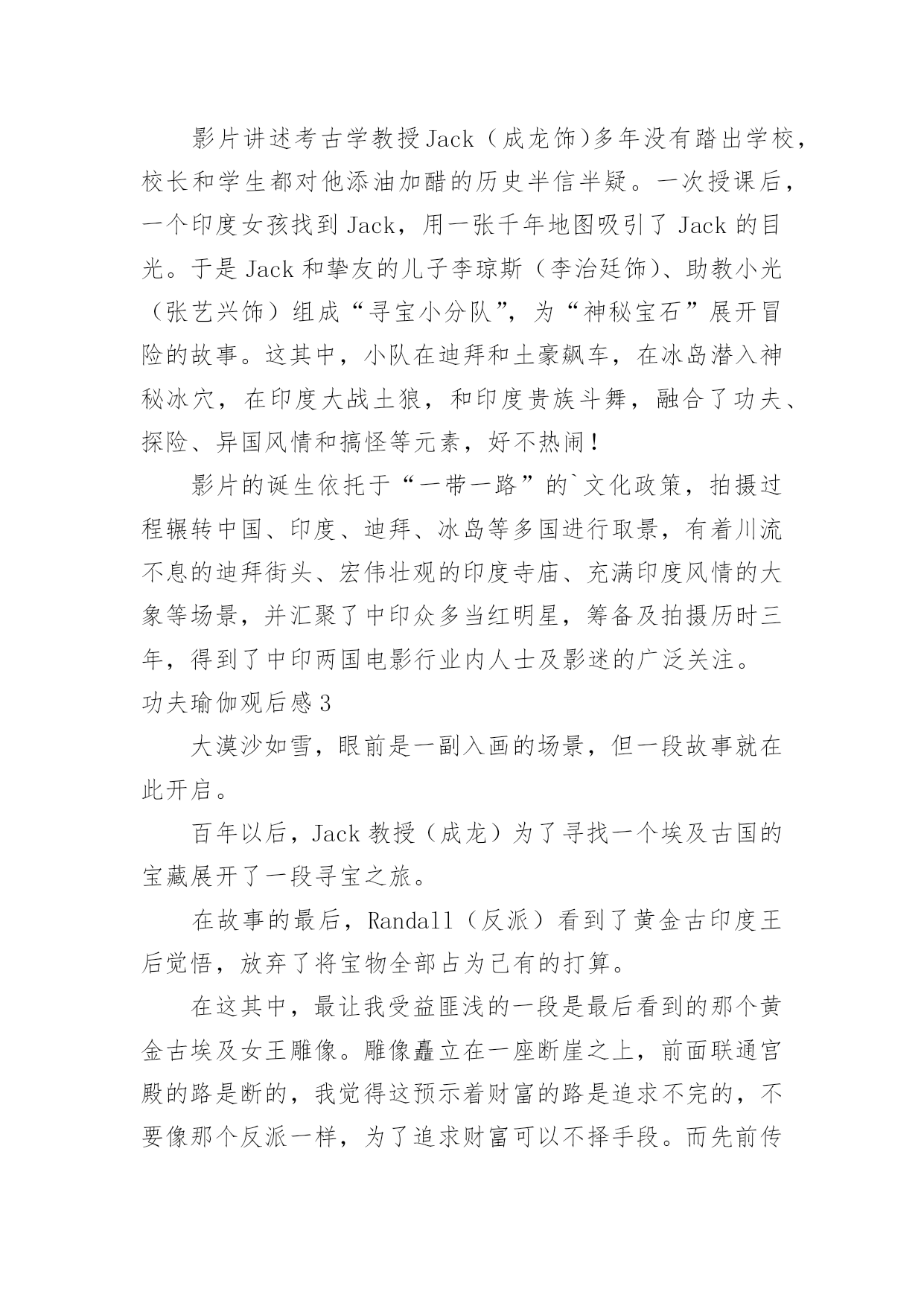 功夫瑜伽观后感功夫瑜伽观后感看完一部作品后,从中我们可以吸收新的思想,不妨坐下来好好写写观后感吧。那要怎么写好观后感呢?以下是小编整理的功夫瑜伽观后感,欢迎大家借鉴与参考,希望对大家有所帮助。功夫瑜伽观后感1《功夫瑜伽》的演员阵容颇具国际化,除了鲜肉男神李治廷和张艺兴的加盟,还吸引了印度宝莱坞人气演员索奴·苏德和迪莎·帕塔尼。索奴·苏德是印度家喻户晓的实力派人气演员,因俊朗帅气的外貌有“印度吴彦祖”之称,多次登上印度型男排行榜。他曾出演了60多部印度电影,塑造了许多令人印象深刻的银幕形象。更是凭借在《青春》、《恶灵古堡》、《因为太爱你》等大火影片中的精彩表演,获得宝莱坞广泛赞誉。迪莎·帕塔尼是20xx届印度小姐比赛的亚军,是宝莱坞冉冉升起的一颗超人气新星。说起参与《功夫瑜伽》的契机,几位印度演员纷纷表示自己是成龙的粉丝,能和成龙合作是一直以来的`梦想。索奴·苏德更透露当得知自己要出演成龙的电影时,激动地立刻告诉了自己的父亲,“我父亲也为我感到骄傲,完全是梦想成真的感觉。”功夫瑜伽观后感2影片讲述考古学教授Jack(成龙饰)多年没有踏出学校,校长和学生都对他添油加醋的历史半信半疑。一次授课后,一个印度女孩找到Jack,用一张千年地图吸引了Jack的目光。于是Jack和挚友的儿子李琼斯(李治廷饰)、助教小光(张艺兴饰)组成“寻宝小分队”,为“神秘宝石”展开冒险的故事。这其中,小队在迪拜和土豪飙车,在冰岛潜入神秘冰穴,在印度大战土狼,和印度贵族斗舞,融合了功夫、探险、异国风情和搞怪等元素,好不热闹!影片的诞生依托于“一带一路”的`文化政策,拍摄过程辗转中国、印度、迪拜、冰岛等多国进行取景,有着川流不息的迪拜街头、宏伟壮观的印度寺庙、充满印度风情的大象等场景,并汇聚了中印众多当红明星,筹备及拍摄历时三年,得到了中印两国电影行业内人士及影迷的广泛关注。功夫瑜伽观后感3大漠沙如雪,眼前是一副入画的场景,但一段故事就在此开启。百年以后,Jack教授(成龙)为了寻找一个埃及古国的宝藏展开了一段寻宝之旅。在故事的最后,Randall(反派)看到了黄金古印度王后觉悟,放弃了将宝物全部占为己有的打算。在这其中,最让我受益匪浅的一段是最后看到的那个黄金古埃及女王雕像。雕像矗立在一座断崖之上,前面联通宫殿的路是断的,我觉得这预示着财富的路是追求不完的,不要像那个反派一样,为了追求财富可以不择手段。而先前传说可以让一个人受用不尽的财富,也是成堆的记载知识书本。这个电影告诉我两个道理。1:财富不是万能的.知识才是无价之宝2:任何历史文物都是历史的见证者,都是属于全人类的,任何人都不该将其占为己有。这真的是一部很优秀的电影,也推荐大家去看看!功夫瑜伽观后感4去年,我和爸爸一起看了场电影,是成龙演的《功夫瑜伽》,电影精彩又搞笑。影片讲述的是成龙是个考古学家,在印度公主的帮助下,开启了寻宝之旅。他和朋友们先是在冰天雪地下面的洞里寻找到了一颗宝石,又拿着这个宝石来到了印度,凭着渊博的知识和经验寻找到了宝藏。他们和坏人做斗争,因为坏人想到把宝石据为己有,但是这些宝藏都属于国家的.。他们齐心协力将坏人打败。最后,他们在藏着宝藏的寺庙里跳起了欢乐的印度舞蹈。在影片中,我看到了冰雪风光,看到了迪拜的高楼大厦、豪车、还有绿树成荫的大街,我还知道了印度人民大多都是能歌善舞,有着自己的宗教信仰。我还看到了寺庙和那些历史悠久的逗蛇、喷火、悬空术等印度民间艺术。结尾的那一段,当成龙他们打开金碧辉煌的大箱子时,他们都以为里面是金银珠宝,没想到只是一些书。看到这部电影,我明白了一个道理:金钱不是最重要的,知识才是最重要的。功夫瑜伽观后感5将于大年初一上映的电影《功夫瑜伽》是成龙与唐季礼的第八次合作。在该片近日举行的活动上,主演李治廷意外爆料,成龙与他在冰岛拍一场打戏前,刚刚因伤做过5小时手术,但怕影响拍戏进度,瞒着剧组人员没说。成龙也感慨,他陪伴大家过了这么多次春节,不知道还能再拍多久电影。日前,电影《功夫瑜伽》在工体有璟阁举办团圆家宴。成龙携李治廷、张艺兴等主创出席。玩游戏、抽大奖,大家热热闹闹聚在一起,唠了不少温馨的家常。首次和成龙合作的'李治廷和张艺兴,现场感慨不已,“成龙大哥白天和我们拍戏,晚上带我们吃饭,现在想想就像做梦一样。”张艺兴则现场向成龙请教,“大哥,你能不能教教我玩命?”十分逗趣。在家宴上,成龙真诚感谢了几十年来一直支持和喜爱他的观众,“电影就是我的生命,想一直拍下去,给大家一直带来欢笑。但岁月不饶人,不知道还能再拍几年”。