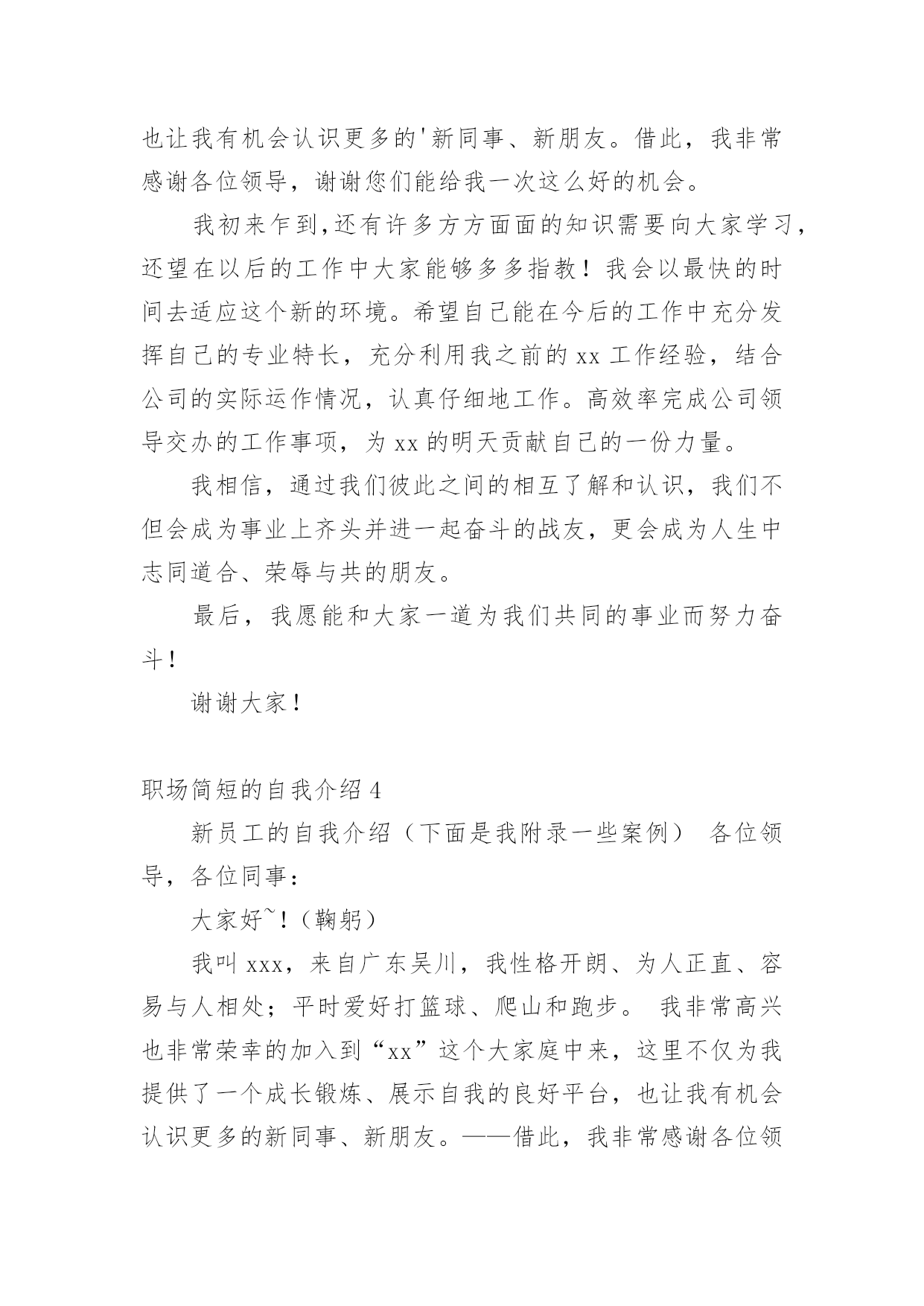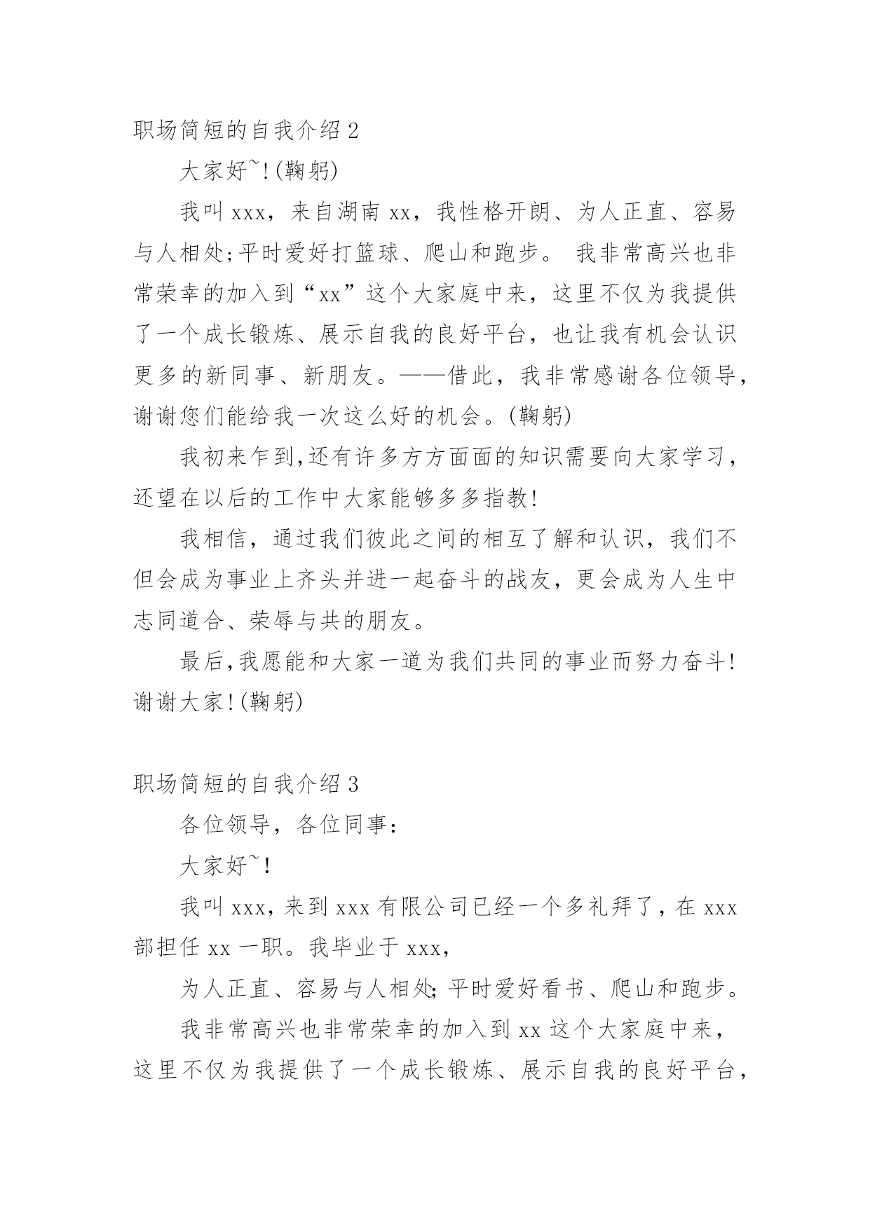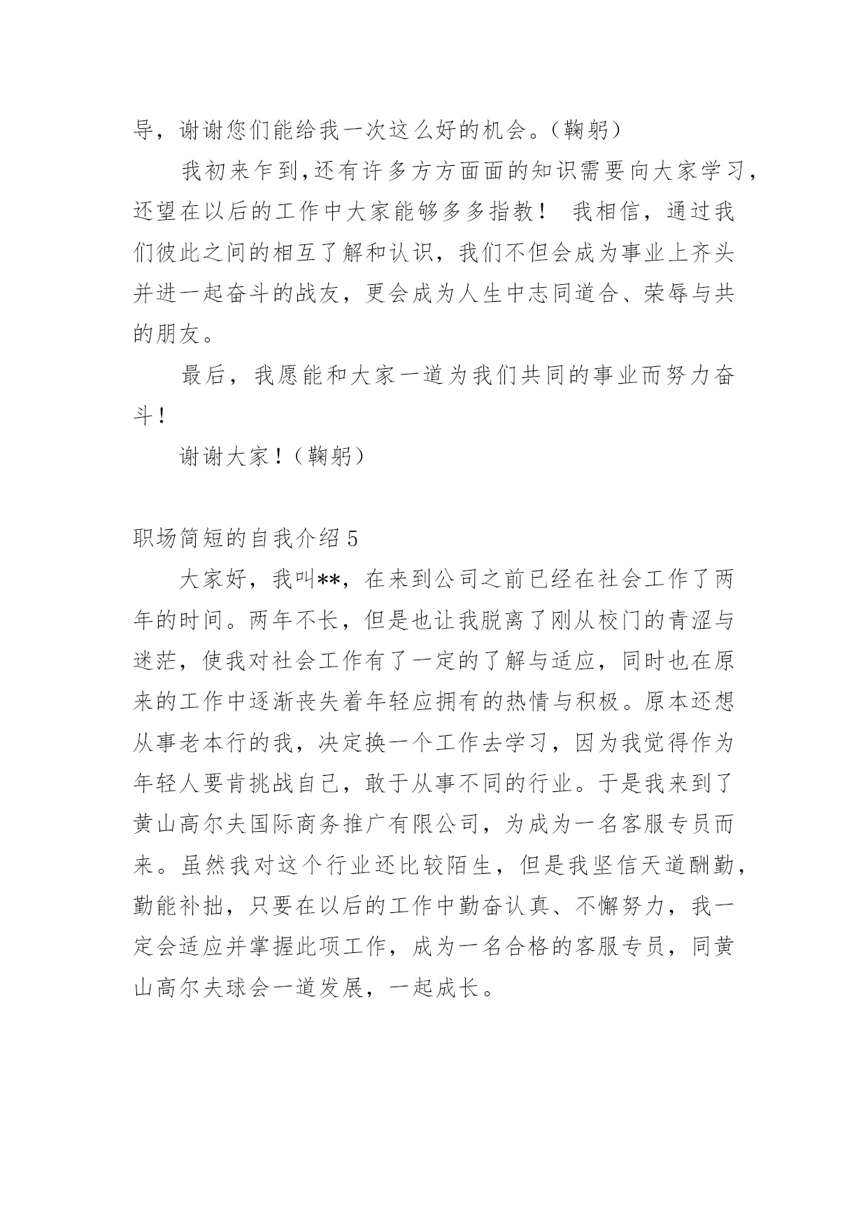 职场简短的自我介绍职场简短的自我介绍5篇职场简短的自我介绍1大家上午好!我叫yjbys,我是浙江杭州人,大家都知道杭州西湖吧,什么时候去玩,我当你们导游,包你们玩得尽兴。我来到博思达已经一个星期了,这一周我们几个新员工都在学习公司的企业文化,以及培训业务能力。非常感谢公司给我这个平台,给我学习、锻炼的机会!我一定好好努力。就像企业文化中所说的:自强不息,坚持到底!作为一名新员工,虽然我之前也有过一些业务经验,但是来到这个新环境,还有很多地方需要学习,到时候还请各位同事不吝赐教。我知道博思达是个人才济济的公司,单就这一周来的培训来说,我就学到很多从来没有学到的东西。如今信息技术飞速发展,要想不被淘汰,学习是关键,多学点知识技能充实自己,才有竞争力。作为新员工,我一定会主动向给位前辈学习,希望能够得到大家的帮助。当然我也会努力完成领导交代的任务!一个人强不是强,大家强才是真的强!我相信在我们的共同努力下一定会把博思达经营得越来越好!谢谢大家!职场简短的自我介绍2大家好~!(鞠躬)我叫xxx,来自湖南xx,我性格开朗、为人正直、容易与人相处;平时爱好打篮球、爬山和跑步。我非常高兴也非常荣幸的加入到“xx”这个大家庭中来,这里不仅为我提供了一个成长锻炼、展示自我的良好平台,也让我有机会认识更多的新同事、新朋友。——借此,我非常感谢各位领导,谢谢您们能给我一次这么好的机会。(鞠躬)我初来乍到,还有许多方方面面的知识需要向大家学习,还望在以后的工作中大家能够多多指教!我相信,通过我们彼此之间的相互了解和认识,我们不但会成为事业上齐头并进一起奋斗的战友,更会成为人生中志同道合、荣辱与共的朋友。最后,我愿能和大家一道为我们共同的事业而努力奋斗!谢谢大家!(鞠躬)职场简短的自我介绍3各位领导,各位同事:大家好~!我叫xxx,来到xxx有限公司已经一个多礼拜了,在xxx部担任xx一职。我毕业于xxx,为人正直、容易与人相处;平时爱好看书、爬山和跑步。我非常高兴也非常荣幸的加入到xx这个大家庭中来,这里不仅为我提供了一个成长锻炼、展示自我的良好平台,也让我有机会认识更多的'新同事、新朋友。借此,我非常感谢各位领导,谢谢您们能给我一次这么好的机会。我初来乍到,还有许多方方面面的知识需要向大家学习,还望在以后的工作中大家能够多多指教!我会以最快的时间去适应这个新的环境。希望自己能在今后的工作中充分发挥自己的专业特长,充分利用我之前的xx工作经验,结合公司的实际运作情况,认真仔细地工作。高效率完成公司领导交办的工作事项,为xx的明天贡献自己的一份力量。我相信,通过我们彼此之间的相互了解和认识,我们不但会成为事业上齐头并进一起奋斗的战友,更会成为人生中志同道合、荣辱与共的朋友。最后,我愿能和大家一道为我们共同的事业而努力奋斗!谢谢大家!职场简短的自我介绍4新员工的自我介绍(下面是我附录一些案例)各位领导,各位同事:大家好~!(鞠躬)我叫xxx,来自广东吴川,我性格开朗、为人正直、容易与人相处;平时爱好打篮球、爬山和跑步。我非常高兴也非常荣幸的加入到“xx”这个大家庭中来,这里不仅为我提供了一个成长锻炼、展示自我的良好平台,也让我有机会认识更多的新同事、新朋友。——借此,我非常感谢各位领导,谢谢您们能给我一次这么好的机会。(鞠躬)我初来乍到,还有许多方方面面的知识需要向大家学习,还望在以后的工作中大家能够多多指教!我相信,通过我们彼此之间的相互了解和认识,我们不但会成为事业上齐头并进一起奋斗的战友,更会成为人生中志同道合、荣辱与共的朋友。最后,我愿能和大家一道为我们共同的事业而努力奋斗!谢谢大家!(鞠躬)职场简短的自我介绍5大家好,我叫**,在来到公司之前已经在社会工作了两年的时间。两年不长,但是也让我脱离了刚从校门的青涩与迷茫,使我对社会工作有了一定的了解与适应,同时也在原来的工作中逐渐丧失着年轻应拥有的热情与积极。原本还想从事老本行的我,决定换一个工作去学习,因为我觉得作为年轻人要肯挑战自己,敢于从事不同的行业。于是我来到了黄山高尔夫国际商务推广有限公司,为成为一名客服专员而来。虽然我对这个行业还比较陌生,但是我坚信天道酬勤,勤能补拙,只要在以后的工作中勤奋认真、不懈努力,我一定会适应并掌握此项工作,成为一名合格的客服专员,同黄山高尔夫球会一道发展,一起成长。