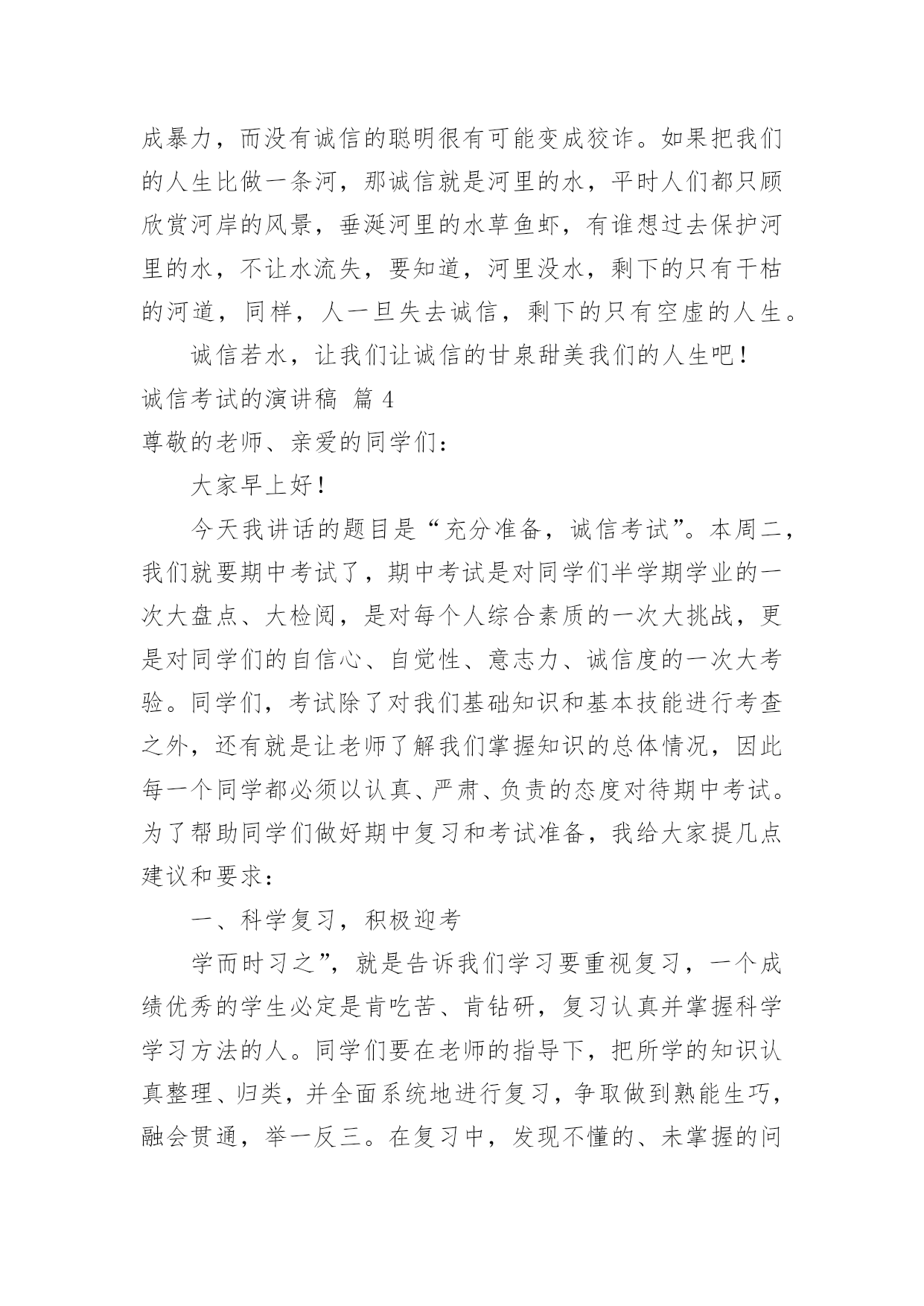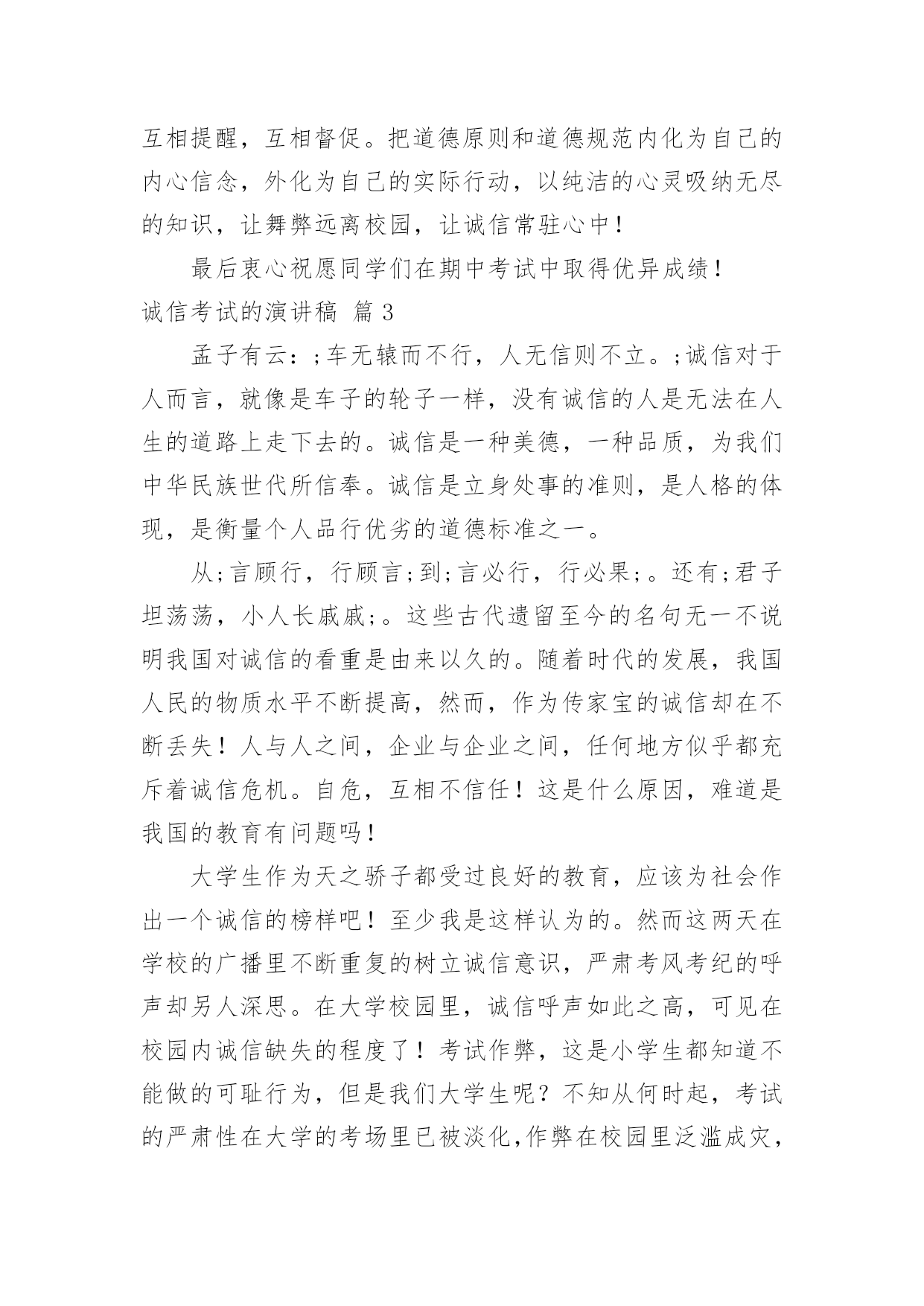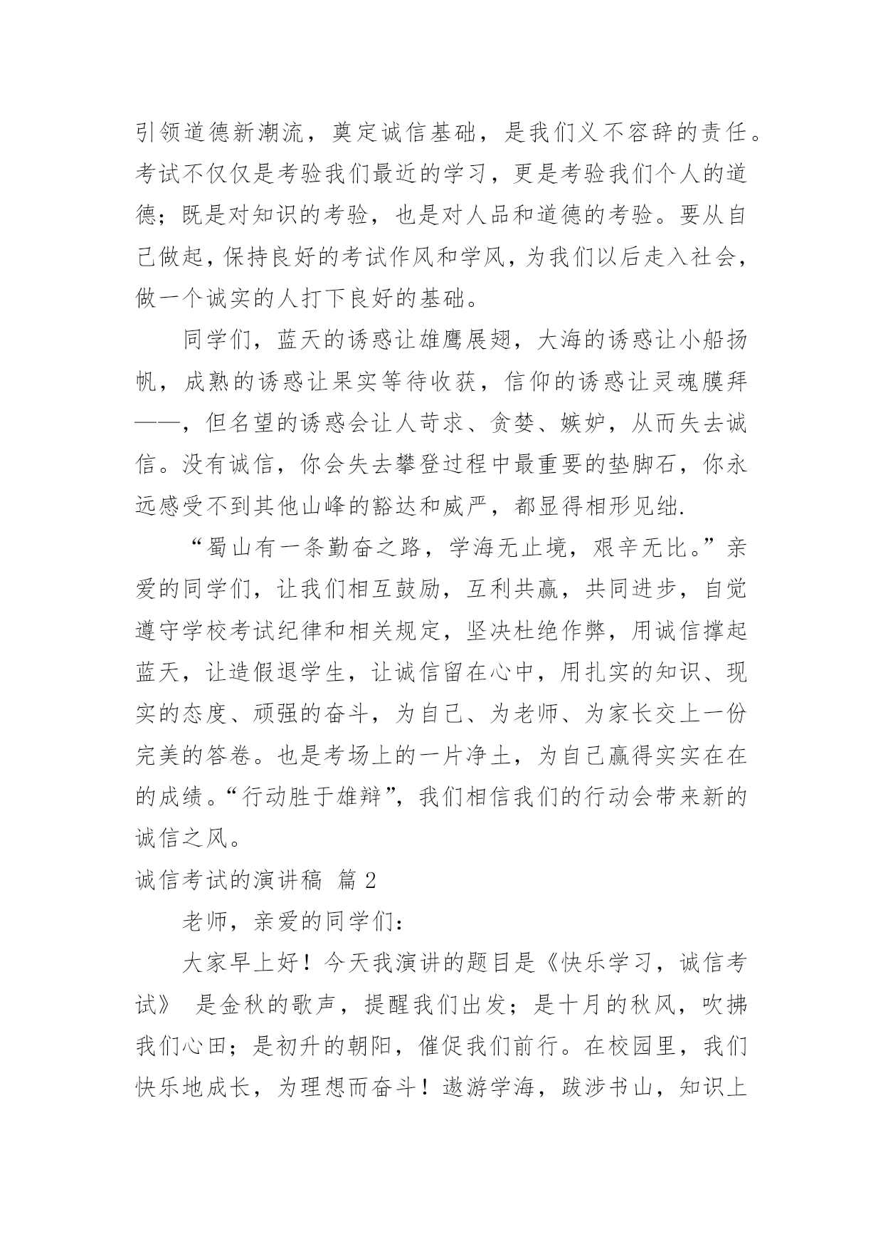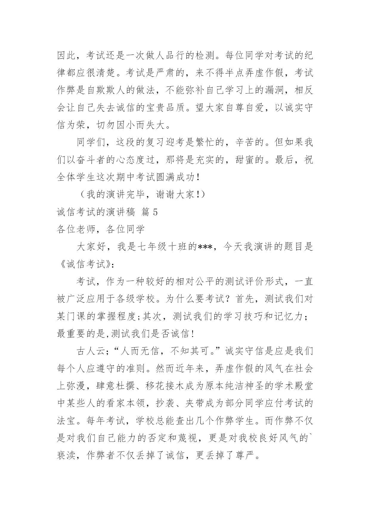 诚信考试的演讲稿关于诚信考试的演讲稿范文汇总7篇演讲稿可以提高演讲人的自信心,有助发言人更好地展现自己。在当下社会,演讲稿对我们的作用越来越大,那要怎么写好演讲稿呢?下面是小编为大家整理的诚信考试的演讲稿7篇,欢迎阅读,希望大家能够喜欢。诚信考试的演讲稿篇1亲爱的老师和同学:大家好!初冬了,期末考试快到了。这时,你是否意识到期末考试已经悄悄来到我们身边?你也悄悄问自己:我准备好期末考试了吗?你是不是也在暗自想:这半个学期我到底收获了什么?我会把什么回馈给亲人和老师?即将到来的期末考试是检验学生学习成绩的最佳时机,也是展示学生良好精神面貌的重要时刻。良好的精神面貌不仅代表着学生对知识学习的坚定态度,也代表着学生以正确的态度和坚持诚实守信原则参加考试的能力。孟子曰:“车无轴不能行,人无信不能立。”诚实守信是中华民族的'优良传统,也是公民的基本道德要求之一。严谨求实的学习态度是我们学校的光荣传统和基础,也是当代大学生廉洁作风最直接的体现。所以,考试作弊不仅是对自身实力的否定和蔑视,也是对我校纯学风的亵渎。大学生作为新世纪的引领者,站在时代的尖端。为进步精神树立榜样,引领道德新潮流,奠定诚信基础,是我们义不容辞的责任。考试不仅仅是考验我们最近的学习,更是考验我们个人的道德;既是对知识的考验,也是对人品和道德的考验。要从自己做起,保持良好的考试作风和学风,为我们以后走入社会,做一个诚实的人打下良好的基础。同学们,蓝天的诱惑让雄鹰展翅,大海的诱惑让小船扬帆,成熟的诱惑让果实等待收获,信仰的诱惑让灵魂膜拜——,但名望的诱惑会让人苛求、贪婪、嫉妒,从而失去诚信。没有诚信,你会失去攀登过程中最重要的垫脚石,你永远感受不到其他山峰的豁达和威严,都显得相形见绌.“蜀山有一条勤奋之路,学海无止境,艰辛无比。”亲爱的同学们,让我们相互鼓励,互利共赢,共同进步,自觉遵守学校考试纪律和相关规定,坚决杜绝作弊,用诚信撑起蓝天,让造假退学生,让诚信留在心中,用扎实的知识、现实的态度、顽强的奋斗,为自己、为老师、为家长交上一份完美的答卷。也是考场上的一片净土,为自己赢得实实在在的成绩。“行动胜于雄辩”,我们相信我们的行动会带来新的诚信之风。诚信考试的演讲稿篇2老师,亲爱的同学们:大家早上好!今天我演讲的题目是《快乐学习,诚信考试》是金秋的歌声,提醒我们出发;是十月的秋风,吹拂我们心田;是初升的朝阳,催促我们前行。在校园里,我们快乐地成长,为理想而奋斗!遨游学海,跋涉书山,知识上的满足给我们快乐;山重水复,曲径通幽,破解难题的柳暗花明给我们快乐;思想境界上的不断开阔,心灵上的不断净化给我们快乐。记得爱因斯坦曾说:千万不要把学习当成一个任务,而应该看成一个令人羡慕的机会。是的,只要我们不辞劳苦,敢于面对学习中的困难,你会发现,学习中自有情趣,更有快乐。快乐学习,快乐收获,收获在这金秋的十月。同学们,期中考试马上来临,半个学期的努力,你,准备好了吗?用自信收获那一滴滴的汗水!收获那一份属于自己的耕耘!收获的不仅有知识,还有人生的答卷——诚信。诚信不仅是一种品行,更是一种责任;不仅是一种道义,更是一种准则;不仅是一种声誉,更是一种资源。“人无信不立,天有日方明。”诚信不是做给别人看的,它是一个正直的人应具备的品质。东汉有位官员叫杨震,一次,他办事经过昌邑县,昌邑县令王密曾收到过杨震的举荐,为了报恩,王密携百两黄金在深夜里找到他,他却不肯收下,王密劝道:“半夜里是不会有人知道的。”杨震却正色道:“天知,地知,你知,我知,怎么能说没人知道呢?”王密听后,惭愧的走了。这个故事告诉我们。诚信在人前人后都要表里如一,在无人监督的情况下,更要抵制诱惑,洁身自好。古人云;“人而无信,不知其可。”诚实守信应是每个学习者所应遵守的准则。然而近年来,弄虚作假的风气在社会上弥漫,也影响到了北附校园。抄袭、夹带成为部分同学应付考试的法宝。每年考试,学校总能查出几个作弊学生。而作弊不仅是对我们自己能力的否定和蔑视,更是对我校良好学风的亵渎,作弊者不仅丢掉了诚信,更丢掉了尊严。同学们,考试不光检验我们的知识水平,同时,也检验我们诚实可信的做人准则。面对一张白纸黑字的考卷,我们是应该诚实地去答题,还是偷偷摸摸地去抄袭?答案不言而喻。是的,我们要诚实地回答每一道题,以正确的态度对待每一次考试,为心灵交上一份诚实的'答卷。这样我们就可以对着天空自信的大喊:“我诚实,我骄傲,我无悔,我交上了一张合格的考卷!”自古以来,读书人都是以节操为本,以诚信为基。北附学子更应该传承民族美德,树道德之新风。学习在于点滴积累,亲手采的蜜最甜,亲自酿的酒最香。期中考试即将开始,值此向全体同学发出倡议:一、排除外界干扰,正确认识考试对评价自己的重要性。充分利用一切时间,认真复习,满怀信心地迎接考试。二、提高自身修养,做一