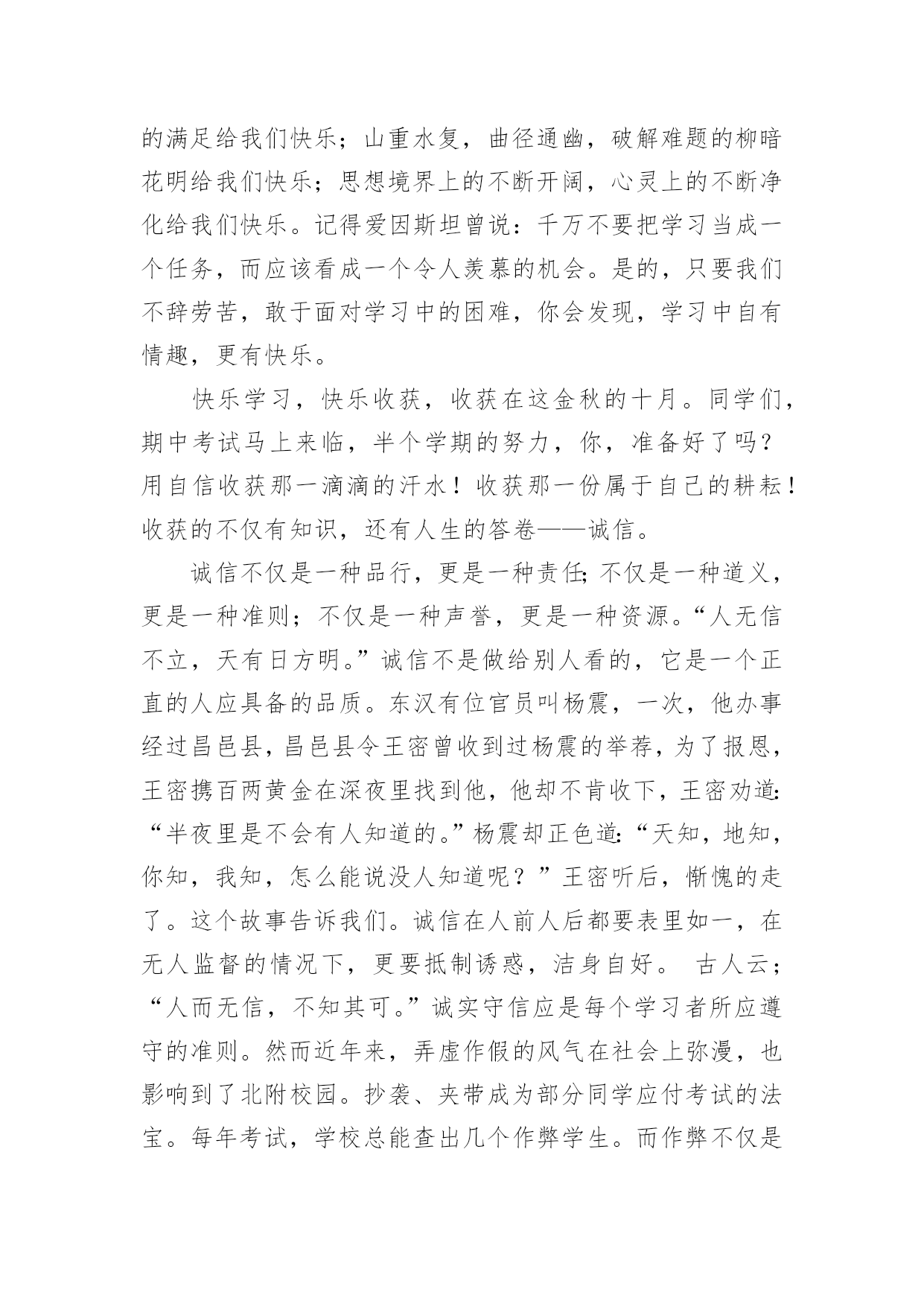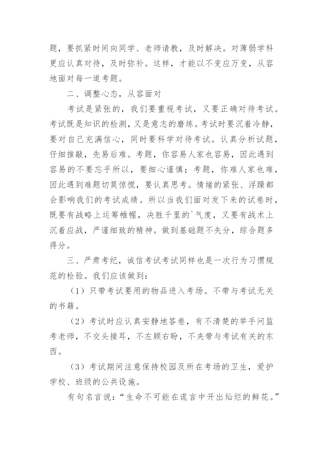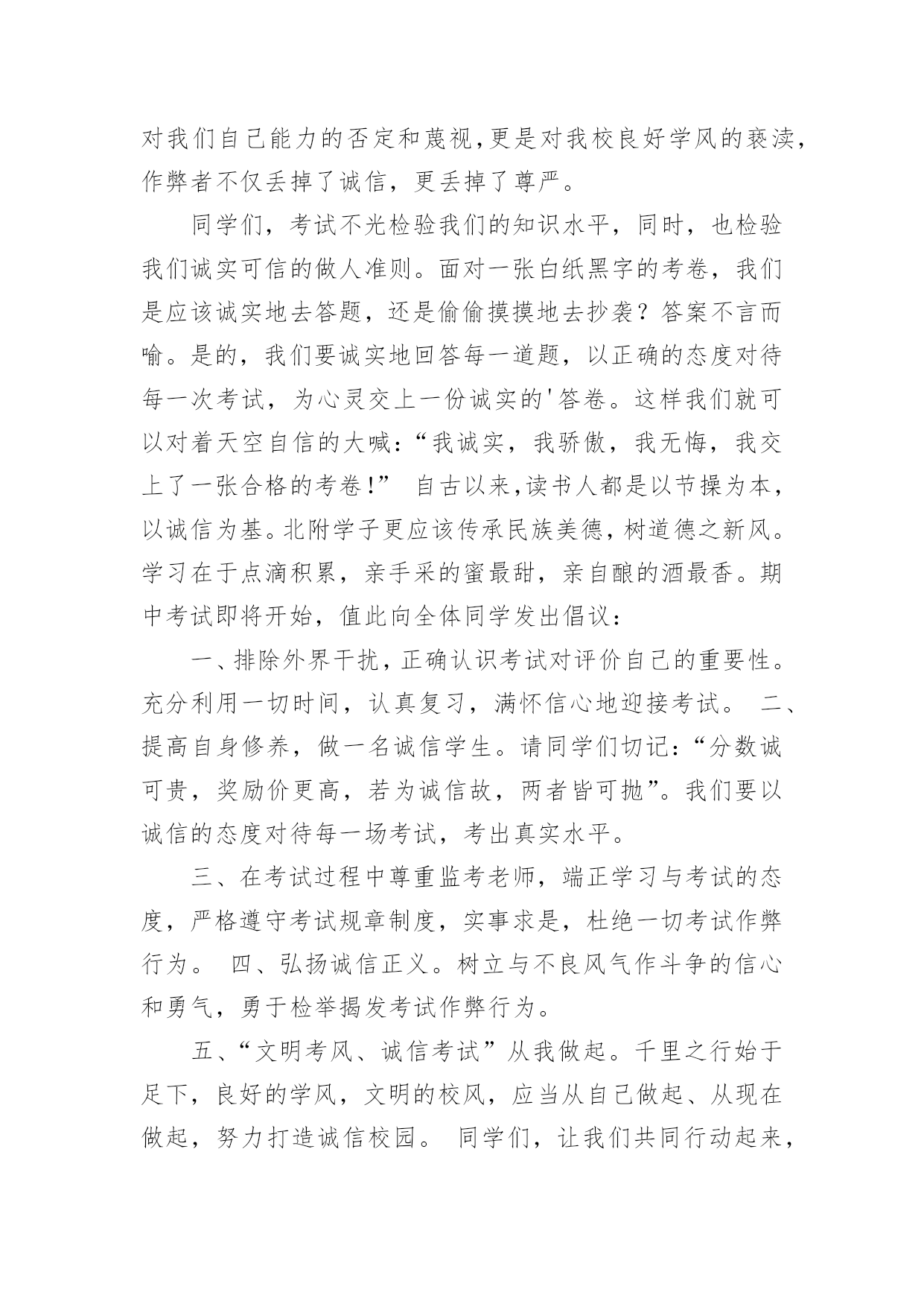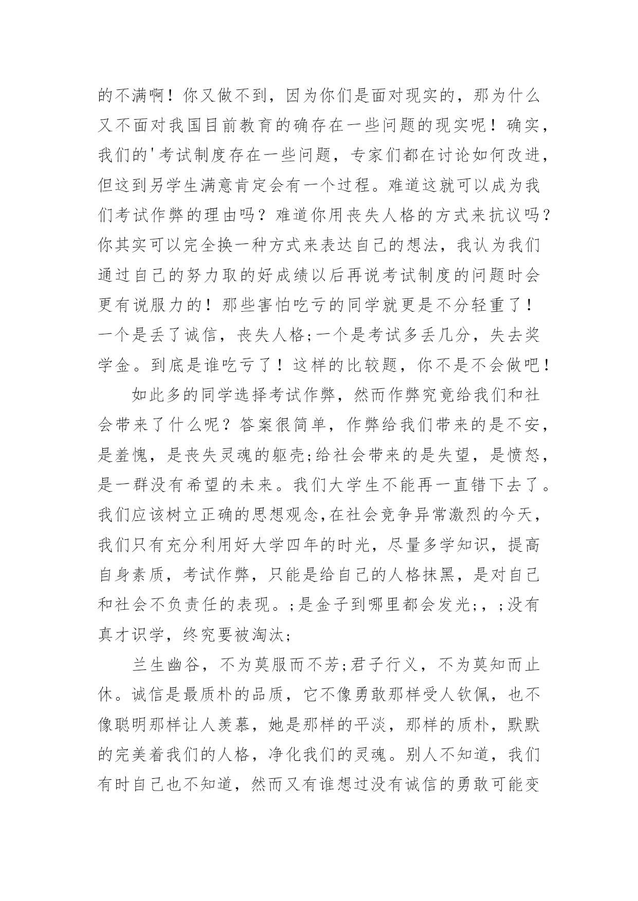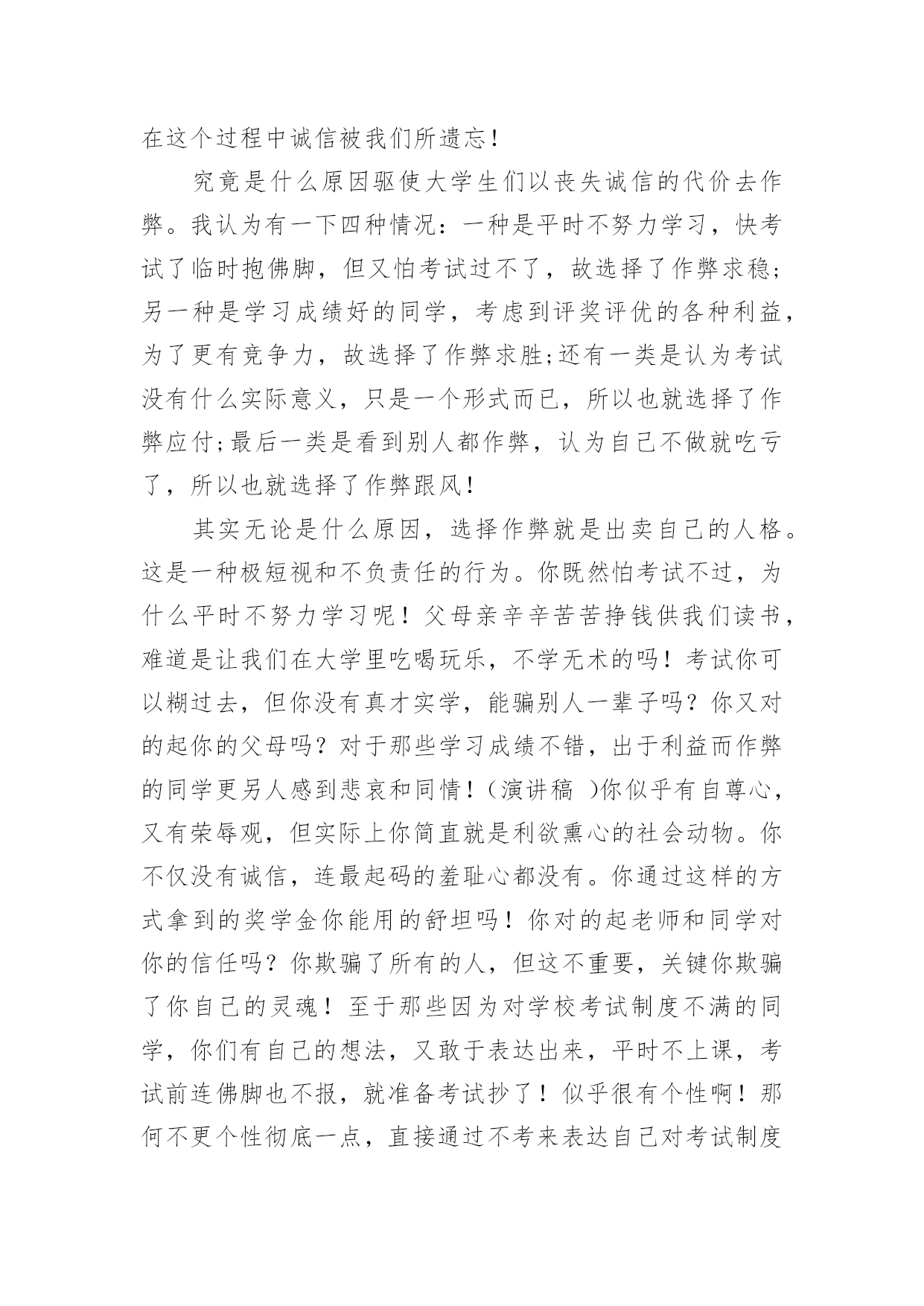诚信考试的演讲稿关于诚信考试的演讲稿范文汇总7篇演讲稿可以提高演讲人的自信心,有助发言人更好地展现自己。在当下社会,演讲稿对我们的作用越来越大,那要怎么写好演讲稿呢?下面是小编为大家整理的诚信考试的演讲稿7篇,欢迎阅读,希望大家能够喜欢。诚信考试的演讲稿篇1亲爱的老师和同学:大家好!初冬了,期末考试快到了。这时,你是否意识到期末考试已经悄悄来到我们身边?你也悄悄问自己:我准备好期末考试了吗?你是不是也在暗自想:这半个学期我到底收获了什么?我会把什么回馈给亲人和老师?即将到来的期末考试是检验学生学习成绩的最佳时机,也是展示学生良好精神面貌的重要时刻。良好的精神面貌不仅代表着学生对知识学习的坚定态度,也代表着学生以正确的态度和坚持诚实守信原则参加考试的能力。孟子曰:“车无轴不能行,人无信不能立。”诚实守信是中华民族的'优良传统,也是公民的基本道德要求之一。严谨求实的学习态度是我们学校的光荣传统和基础,也是当代大学生廉洁作风最直接的体现。所以,考试作弊不仅是对自身实力的否定和蔑视,也是对我校纯学风的亵渎。大学生作为新世纪的引领者,站在时代的尖端。为进步精神树立榜样,引领道德新潮流,奠定诚信基础,是我们义不容辞的责任。考试不仅仅是考验我们最近的学习,更是考验我们个人的道德;既是对知识的考验,也是对人品和道德的考验。要从自己做起,保持良好的考试作风和学风,为我们以后走入社会,做一个诚实的人打下良好的基础。同学们,蓝天的诱惑让雄鹰展翅,大海的诱惑让小船扬帆,成熟的诱惑让果实等待收获,信仰的诱惑让灵魂膜拜——,但名望的诱惑会让人苛求、贪婪、嫉妒,从而失去诚信。没有诚信,你会失去攀登过程中最重要的垫脚石,你永远感受不到其他山峰的豁达和威严,都显得相形见绌.“蜀山有一条勤奋之路,学海无止境,艰辛无比。”亲爱的同学们,让我们相互鼓励,互利共赢,共同进步,自觉遵守学校考试纪律和相关规定,坚决杜绝作弊,用诚信撑起蓝天,让造假退学生,让诚信留在心中,用扎实的知识、现实的态度、顽强的奋斗,为自己、为老师、为家长交上一份完美的答卷。也是考场上的一片净土,为自己赢得实实在在的成绩。“行动胜于雄辩”,我们相信我们的行动会带来新的诚信之风。诚信考试的演讲稿篇2老师,亲爱的同学们:大家早上好!今天我演讲的题目是《快乐学习,诚信考试》是金秋的歌声,提醒我们出发;是十月的秋风,吹拂我们心田;是初升的朝阳,催促我们前行。在校园里,我们快乐地成长,为理想而奋斗!遨游学海,跋涉书山,知识上的满足给我们快乐;山重水复,曲径通幽,破解难题的柳暗花明给我们快乐;思想境界上的不断开阔,心灵上的不断净化给我们快乐。记得爱因斯坦曾说:千万不要把学习当成一个任务,而应该看成一个令人羡慕的机会。是的,只要我们不辞劳苦,敢于面对学习中的困难,你会发现,学习中自有情趣,更有快乐。快乐学习,快乐收获,收获在这金秋的十月。同学们,期中考试马上来临,半个学期的努力,你,准备好了吗?用自信收获那一滴滴的汗水!收获那一份属于自己的耕耘!收获的不仅有知识,还有人生的答卷——诚信。诚信不仅是一种品行,更是一种责任;不仅是一种道义,更是一种准则;不仅是一种声誉,更是一种资源。“人无信不立,天有日方明。”诚信不是做给别人看的,它是一个正直的人应具备的品质。东汉有位官员叫杨震,一次,他办事经过昌邑县,昌邑县令王密曾收到过杨震的举荐,为了报恩,王密携百两黄金在深夜里找到他,他却不肯收下,王密劝道:“半夜里是不会有人知道的。”杨震却正色道:“天知,地知,你知,我知,怎么能说没人知道呢?”王密听后,惭愧的走了。这个故事告诉我们。诚信在人前人后都要表里如一,在无人监督的情况下,更要抵制诱惑,洁身自好。古人云;“人而无信,不知其可。”诚实守信应是每个学习者所应遵守的准则。然而近年来,弄虚作假的风气在社会上弥漫,也影响到了北附校园。抄袭、夹带成为部分同学应付考试的法宝。每年考试,学校总能查出几个作弊学生。而作弊不仅是对我们自己能力的否定和蔑视,更是对我校良好学风的亵渎,作弊者不仅丢掉了诚信,更丢掉了尊严。同学们,考试不光检验我们的知识水平,同时,也检验我们诚实可信的做人准则。面对一张白纸黑字的考卷,我们是应该诚实地去答题,还是偷偷摸摸地去抄袭?答案不言而喻。是的,我们要诚实地回答每一道题,以正确的态度对待每一次考试,为心灵交上一份诚实的'答卷。这样我们就可以对着天空自信的大喊:“我诚实,我骄傲,我无悔,我交上了一张合格的考卷!”自古以来,读书人都是以节操为本,以诚信为基。北附学子更应该传承民族美德,树道德之新风。学习在于点滴积累,亲手采的蜜最甜,亲自酿的酒最香。期中考试即将开始,值此向全体同学发出倡议:一、排除外界干扰,正确认识考试对评价自己的重要性。充分利用一切时间,认真复习,满怀信心地迎接考试。二、提高自身修养,做一