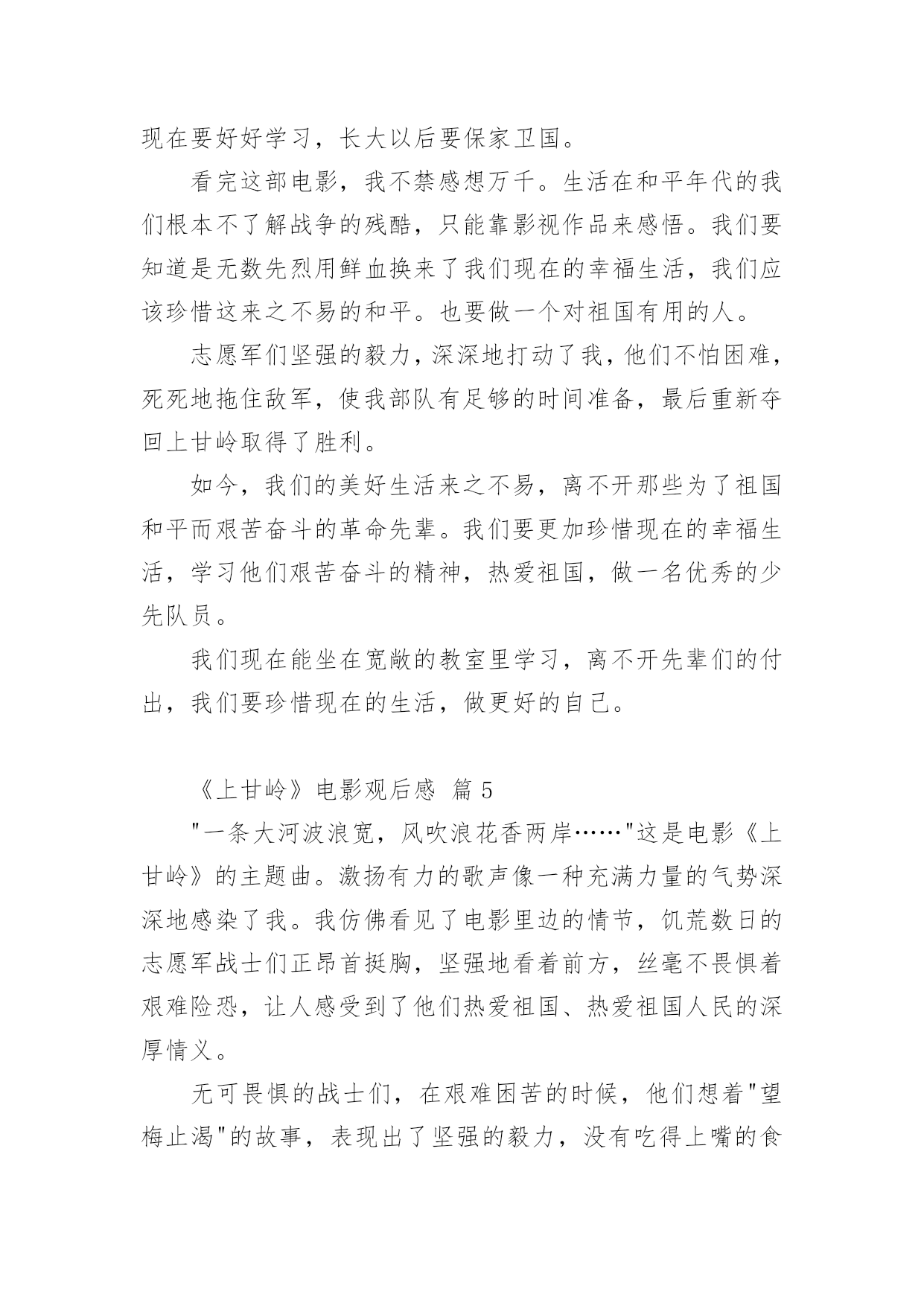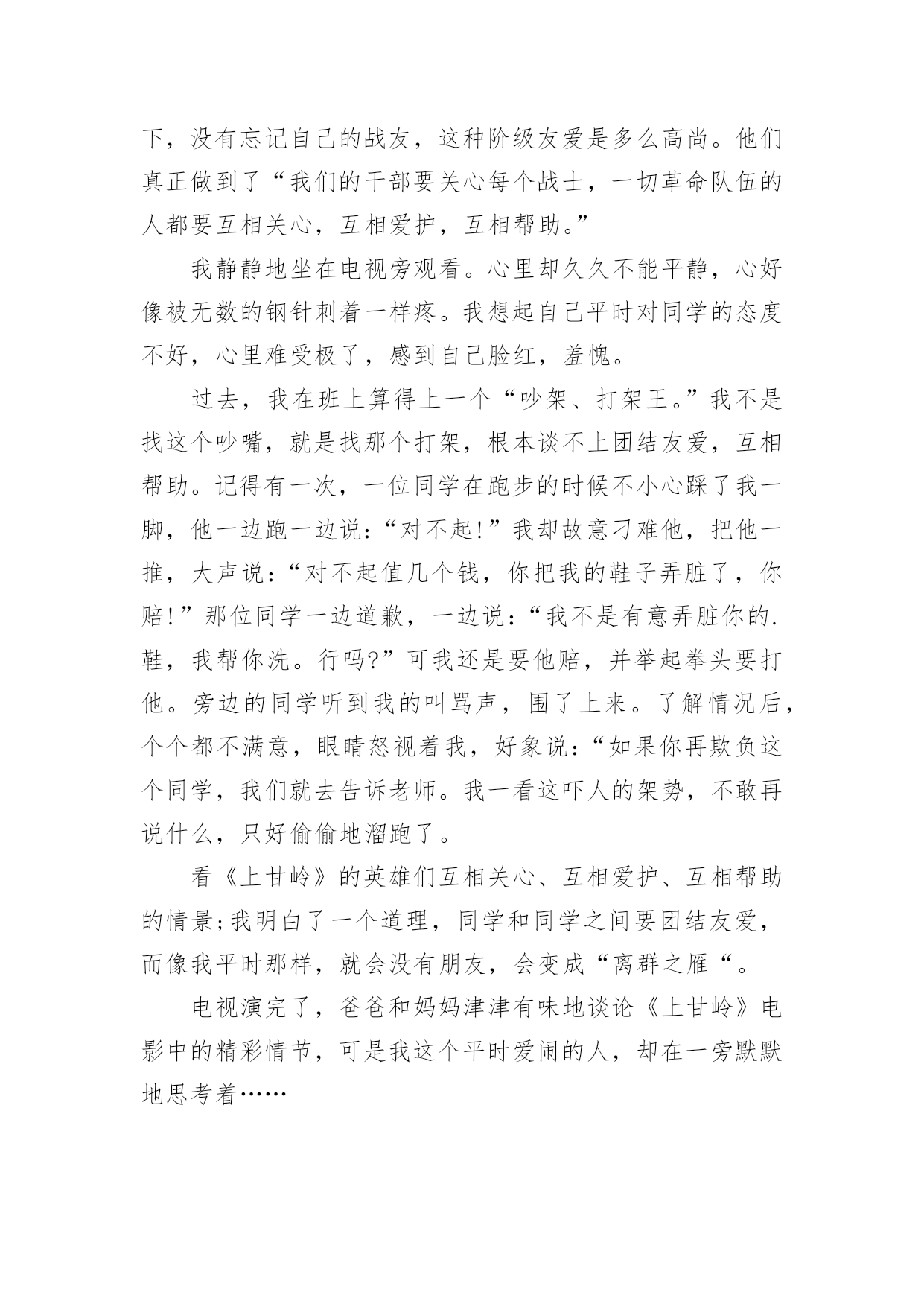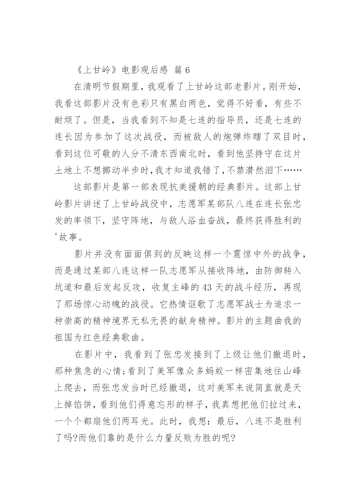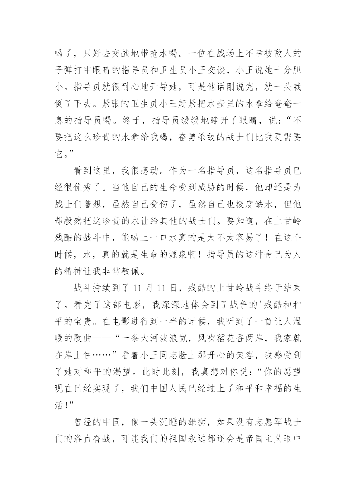 《上甘岭》电影观后感《上甘岭》电影观后感6篇当品味完一部影视作品后,相信大家有很多值得分享的东西吧,是时候写一篇观后感好好记录一下了。那么你真的会写观后感吗?以下是小编收集整理的《上甘岭》电影观后感,仅供参考,欢迎大家阅读。《上甘岭》电影观后感篇1昨日晚上,按照主题教育的统一计划,咱们师直属队的全体官兵在师电影场观看了《上甘岭》,这是我第三次观看这部电影了,每次看每次都有不一样的感受。《上甘岭》是部说朝鲜战争的战争片,片中集中反映了我人民解放军某连在上甘岭为了吸引敌人,为我军大部队集结创造时刻而英勇战斗的一幕幕生动故事,主人翁张茂才身为一名连长,在整个影片中被刻画得淋漓尽致,是一名出色的基层指挥军官,是我领悟的楷模。影片中最让我震撼的是对水的特写,由于地理环境因素,八连的同志们常常与后方失去联系,被困在坑道里,在将近一个月的时刻里,他们最难熬的不是敌人的疯狂冲锋,不是敌人的炸弹、毒气,而是那水的缺乏,他们仅有的水是每个人随身携带的水壶里那很少量的水,但是他们仍然发扬革命乐观主义精神,互相谦让的革命美德,战士们把水节约起来让给伤病员,伤病员把水坚决让给战斗员,那种场面让人震撼和感动,就是师长送给连长的两个苹果也被让了个遍,最后切成小块,每人都尝一尝。在性命最艰苦的时候,大家的嘴唇都干裂了,饼干都不能下咽的`时候,“望梅止渴”的故事又让战士们欢呼雀跃,如果问他们:“什么是最珍重的?”他们肯定会说:“那是水!”正因为了水,他们不得不到山下去抢水,但是敌人的子弹是无情的,刚打满的水壶就被敌人的流弹打得全漏了,牺牲了性命也换不回那一壶水,在性命的极限里,很多人似乎都出现了幻觉,幻想水的世界,水的完美。看到那里,我不禁想起自我平时对水的慷慨和浪费,此刻我国很多地区都缺水,而在罗浮山,咱们遇到旱季也是经常停水,此刻咱们为了那恶劣的水的质量而抱怨,却从来没有问自我一句:“为什么?”我想正是咱们每一个人对水的浪费、滥用和忽视造就了这天的社会现实,未来有一天,或许咱们也会为了一滴水而战斗,那为什么此刻咱们不能从珍惜每一滴水做起呢?让咱们每个人携起手来节约每一滴水,杜绝长流水的现象。“一滴水里包含全世界”,就让咱们从节约一滴水开始,让中国人真正走向世界,走向未来。《上甘岭》电影观后感篇2今天,学校组织我们看了一部红色电影,名字叫《上甘岭》。在这部电影中,对我触动最大的地方是:战士们没有水喝了,只好去交战地带抢水喝。一位在战场上不幸被敌人的子弹打中眼睛的指导员和卫生员小王交谈,小王说她十分胆小。指导员就很耐心地开导她,可是他话刚说完,就一头栽倒了下去。紧张的卫生员小王赶紧把水壶里的水拿给奄奄一息的指导员喝。终于,指导员缓缓地睁开了眼睛,说:“不要把这么珍贵的水拿给我喝,奋勇杀敌的战士们比我更需要它。”看到这里,我很感动。作为一名指导员,这名指导员已经很优秀了。当他自己的生命受到威胁的时候,他却还是为战士们着想,虽然自己受伤了,虽然自己也极度缺水,但他却毅然把这珍贵的水让给其他的战士们。要知道,在上甘岭残酷的战斗中,能喝上一口水真的是太不太容易了!在这个时候,水,真的就是生命的源泉啊!指导员的这种舍己为人的精神让我非常敬佩。战斗持续到了11月11日,残酷的上甘岭战斗终于结束了。看完了这部电影,我深深地体会到了战争的'残酷和和平的宝贵。在电影进行到一半的时候,我听到了一首让人温暖的歌曲——“一条大河波浪宽,风吹稻花香两岸,我家就在岸上住……”看着小王同志脸上那开心的笑容,我感受到了她对和平的渴望。此时此刻,我真想对你说:“你的愿望现在已经实现了,我们中国人民已经过上了和平和幸福的生活!”曾经的中国,像一头沉睡的雄狮,如果没有志愿军战士们的浴血奋战,可能我们的祖国永远都还会是帝国主义眼中的“东亚病夫”!如今,经过一代又一代中国优秀儿女的共同努力,中国这头沉睡的雄狮终于彻底苏醒了,我们的祖国正在朝着繁荣富强的康庄大道上大步迈进!少年智则国智,少年富则国富,少年强则国强。看完了这部电影,我的心中反复回想着一句振聋发聩的话——“勿忘国耻,振兴中华,为中华之崛起而读书!”我们小学生是祖国的花朵,是我们民族的未来,中华民族的复兴就要靠我们了!祝我们伟大的祖国越来越强大!《上甘岭》电影观后感篇3谁没有年轻的生命?谁不珍惜这宝贵的年华?谁不渴望幸福的生活?可是在战场上,我们的英雄,却用他们年轻的热血与生命去换取了战斗的胜利。电影《上甘岭》讲的是志愿军在朝鲜战场上抗击美帝侵略者的一次战役。在这场战役中,八连已经在山上抗道里坚持战斗了一个月。由于敌人的封锁,部队严重缺水,战士们的嘴唇都干裂了。上级领导派来送水的小分队,队员们一个个牺牲。为了保存实力,八连战士们又得下山去抢水。但是,战士们刚装好水,就被敌人的流弹打中了。后来,师长派人历尽千辛万苦才送上一些萝卜,并特意送给