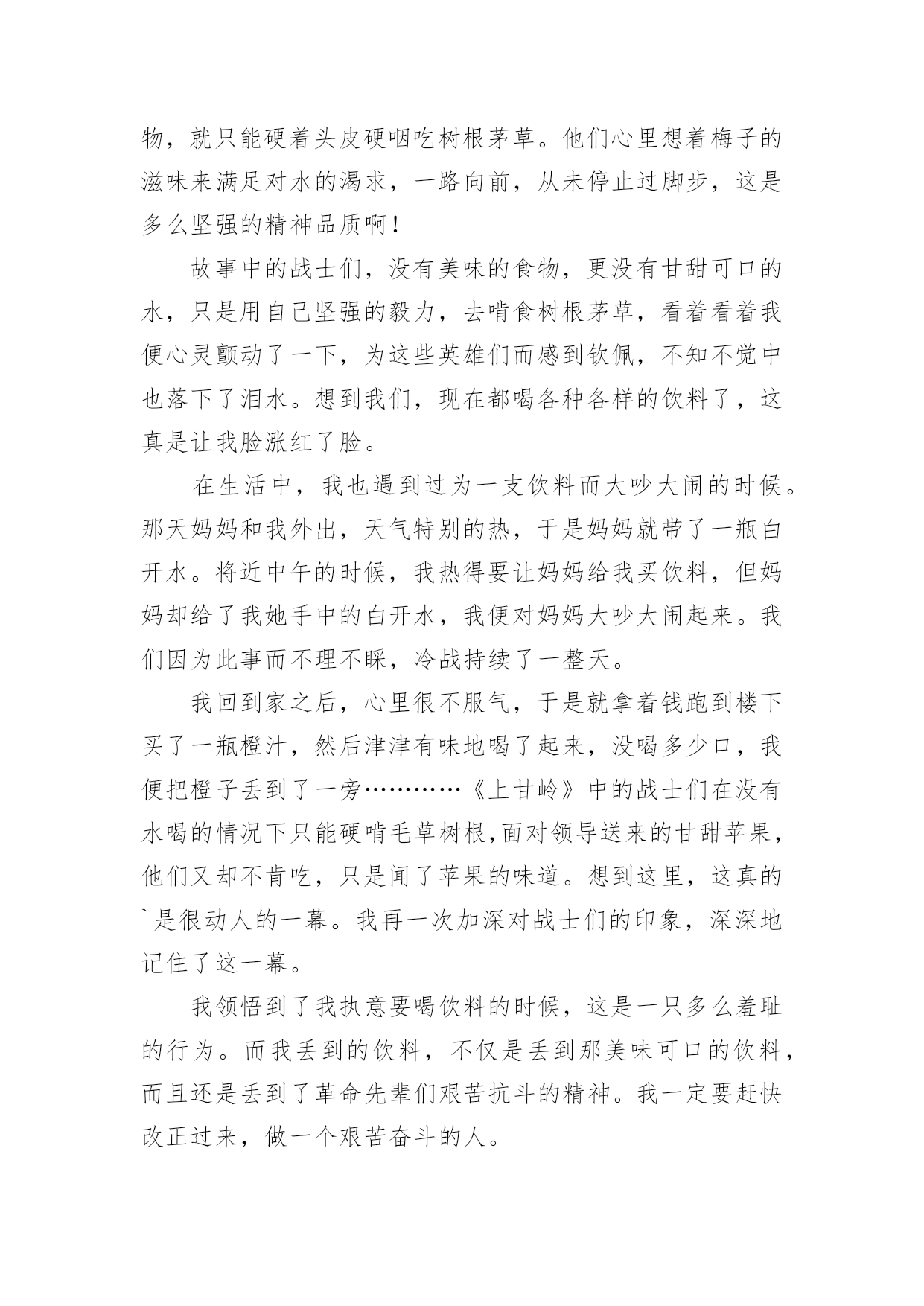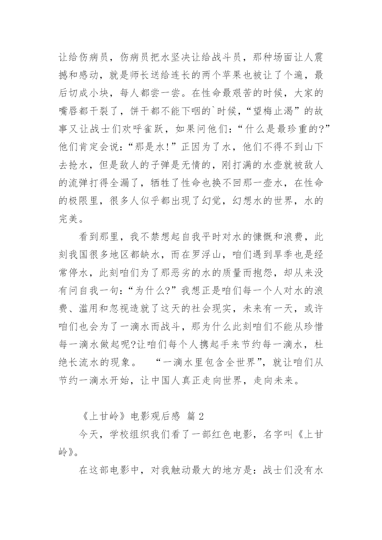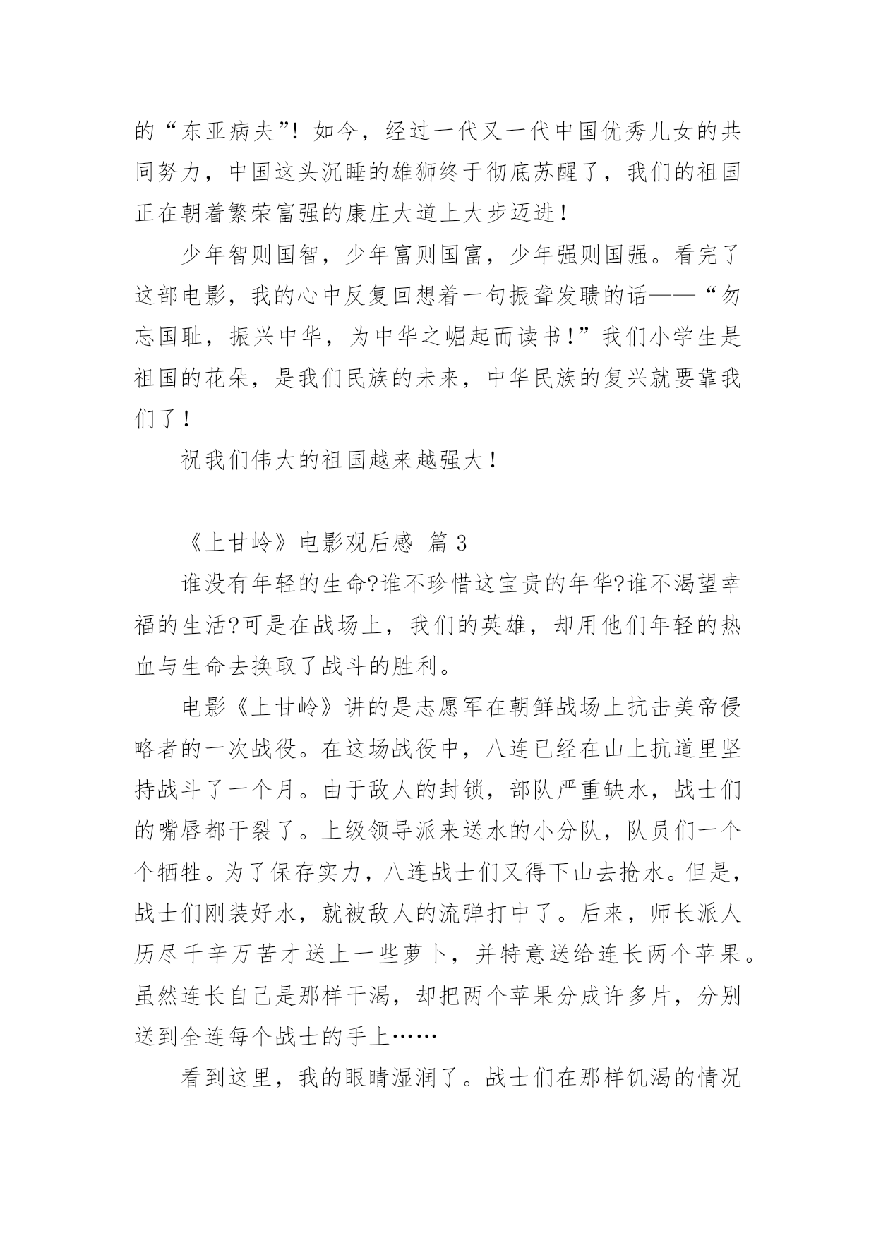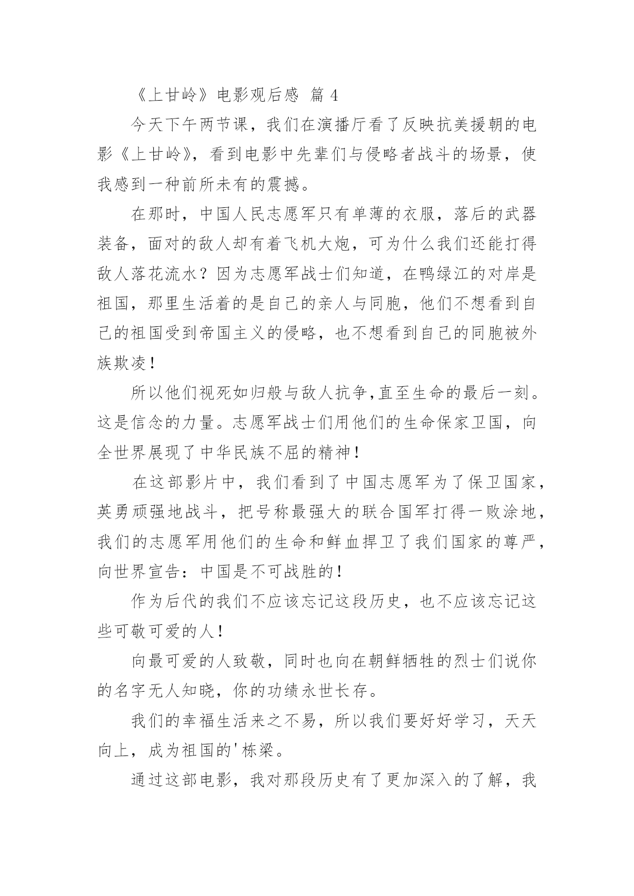 《上甘岭》电影观后感《上甘岭》电影观后感6篇当品味完一部影视作品后,相信大家有很多值得分享的东西吧,是时候写一篇观后感好好记录一下了。那么你真的会写观后感吗?以下是小编收集整理的《上甘岭》电影观后感,仅供参考,欢迎大家阅读。《上甘岭》电影观后感篇1昨日晚上,按照主题教育的统一计划,咱们师直属队的全体官兵在师电影场观看了《上甘岭》,这是我第三次观看这部电影了,每次看每次都有不一样的感受。《上甘岭》是部说朝鲜战争的战争片,片中集中反映了我人民解放军某连在上甘岭为了吸引敌人,为我军大部队集结创造时刻而英勇战斗的一幕幕生动故事,主人翁张茂才身为一名连长,在整个影片中被刻画得淋漓尽致,是一名出色的基层指挥军官,是我领悟的楷模。影片中最让我震撼的是对水的特写,由于地理环境因素,八连的同志们常常与后方失去联系,被困在坑道里,在将近一个月的时刻里,他们最难熬的不是敌人的疯狂冲锋,不是敌人的炸弹、毒气,而是那水的缺乏,他们仅有的水是每个人随身携带的水壶里那很少量的水,但是他们仍然发扬革命乐观主义精神,互相谦让的革命美德,战士们把水节约起来让给伤病员,伤病员把水坚决让给战斗员,那种场面让人震撼和感动,就是师长送给连长的两个苹果也被让了个遍,最后切成小块,每人都尝一尝。在性命最艰苦的时候,大家的嘴唇都干裂了,饼干都不能下咽的`时候,“望梅止渴”的故事又让战士们欢呼雀跃,如果问他们:“什么是最珍重的?”他们肯定会说:“那是水!”正因为了水,他们不得不到山下去抢水,但是敌人的子弹是无情的,刚打满的水壶就被敌人的流弹打得全漏了,牺牲了性命也换不回那一壶水,在性命的极限里,很多人似乎都出现了幻觉,幻想水的世界,水的完美。看到那里,我不禁想起自我平时对水的慷慨和浪费,此刻我国很多地区都缺水,而在罗浮山,咱们遇到旱季也是经常停水,此刻咱们为了那恶劣的水的质量而抱怨,却从来没有问自我一句:“为什么?”我想正是咱们每一个人对水的浪费、滥用和忽视造就了这天的社会现实,未来有一天,或许咱们也会为了一滴水而战斗,那为什么此刻咱们不能从珍惜每一滴水做起呢?让咱们每个人携起手来节约每一滴水,杜绝长流水的现象。“一滴水里包含全世界”,就让咱们从节约一滴水开始,让中国人真正走向世界,走向未来。《上甘岭》电影观后感篇2今天,学校组织我们看了一部红色电影,名字叫《上甘岭》。在这部电影中,对我触动最大的地方是:战士们没有水喝了,只好去交战地带抢水喝。一位在战场上不幸被敌人的子弹打中眼睛的指导员和卫生员小王交谈,小王说她十分胆小。指导员就很耐心地开导她,可是他话刚说完,就一头栽倒了下去。紧张的卫生员小王赶紧把水壶里的水拿给奄奄一息的指导员喝。终于,指导员缓缓地睁开了眼睛,说:“不要把这么珍贵的水拿给我喝,奋勇杀敌的战士们比我更需要它。”看到这里,我很感动。作为一名指导员,这名指导员已经很优秀了。当他自己的生命受到威胁的时候,他却还是为战士们着想,虽然自己受伤了,虽然自己也极度缺水,但他却毅然把这珍贵的水让给其他的战士们。要知道,在上甘岭残酷的战斗中,能喝上一口水真的是太不太容易了!在这个时候,水,真的就是生命的源泉啊!指导员的这种舍己为人的精神让我非常敬佩。战斗持续到了11月11日,残酷的上甘岭战斗终于结束了。看完了这部电影,我深深地体会到了战争的'残酷和和平的宝贵。在电影进行到一半的时候,我听到了一首让人温暖的歌曲——“一条大河波浪宽,风吹稻花香两岸,我家就在岸上住……”看着小王同志脸上那开心的笑容,我感受到了她对和平的渴望。此时此刻,我真想对你说:“你的愿望现在已经实现了,我们中国人民已经过上了和平和幸福的生活!”曾经的中国,像一头沉睡的雄狮,如果没有志愿军战士们的浴血奋战,可能我们的祖国永远都还会是帝国主义眼中的“东亚病夫”!如今,经过一代又一代中国优秀儿女的共同努力,中国这头沉睡的雄狮终于彻底苏醒了,我们的祖国正在朝着繁荣富强的康庄大道上大步迈进!少年智则国智,少年富则国富,少年强则国强。看完了这部电影,我的心中反复回想着一句振聋发聩的话——“勿忘国耻,振兴中华,为中华之崛起而读书!”我们小学生是祖国的花朵,是我们民族的未来,中华民族的复兴就要靠我们了!祝我们伟大的祖国越来越强大!《上甘岭》电影观后感篇3谁没有年轻的生命?谁不珍惜这宝贵的年华?谁不渴望幸福的生活?可是在战场上,我们的英雄,却用他们年轻的热血与生命去换取了战斗的胜利。电影《上甘岭》讲的是志愿军在朝鲜战场上抗击美帝侵略者的一次战役。在这场战役中,八连已经在山上抗道里坚持战斗了一个月。由于敌人的封锁,部队严重缺水,战士们的嘴唇都干裂了。上级领导派来送水的小分队,队员们一个个牺牲。为了保存实力,八连战士们又得下山去抢水。但是,战士们刚装好水,就被敌人的流弹打中了。后来,师长派人历尽千辛万苦才送上一些萝卜,并特意送给