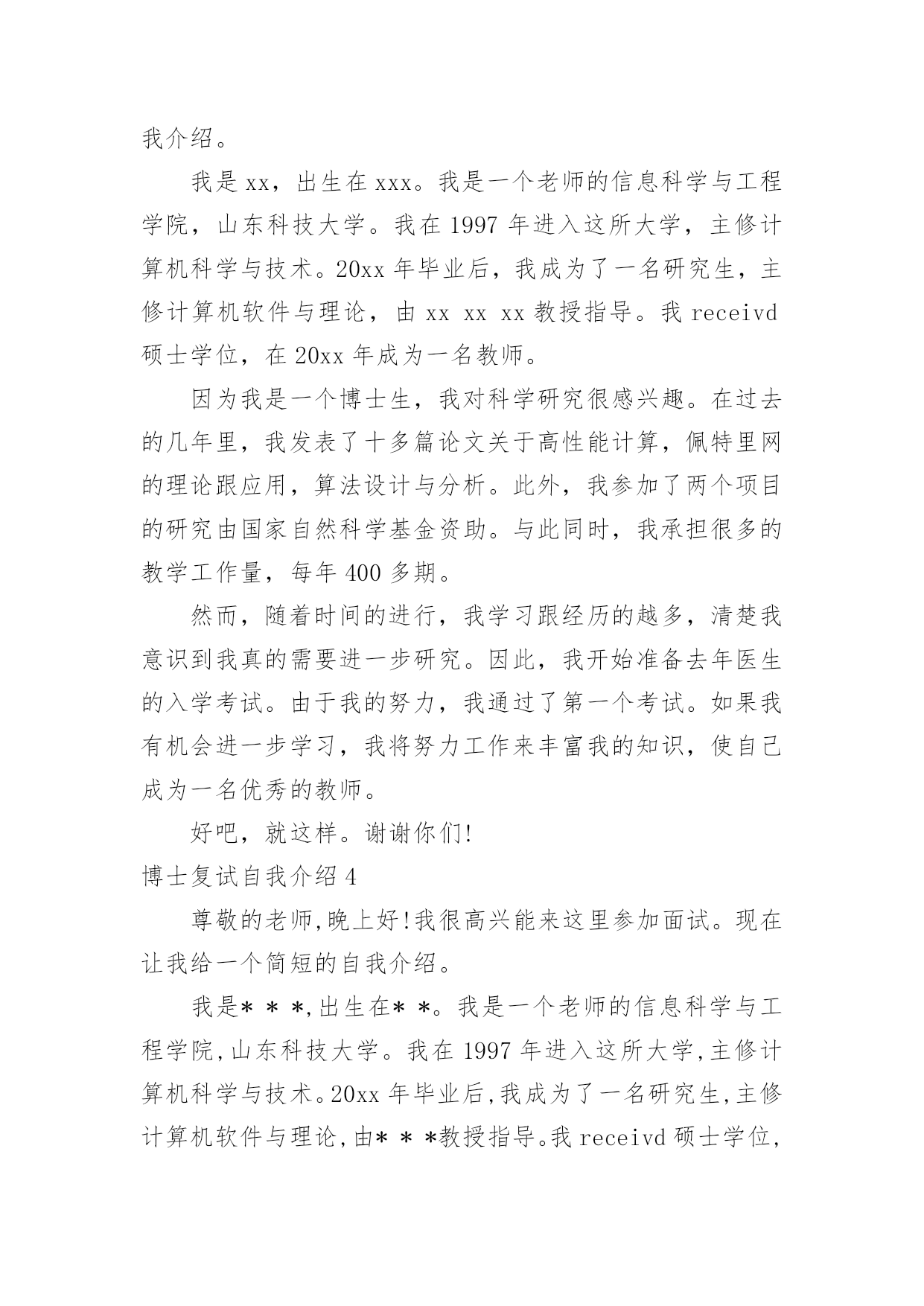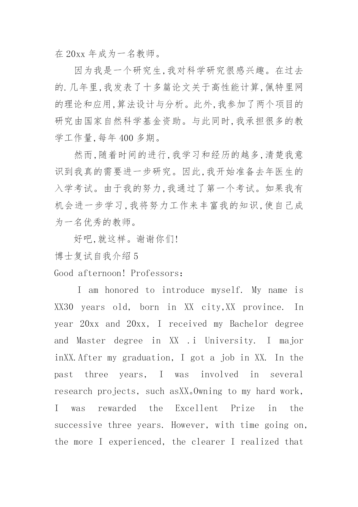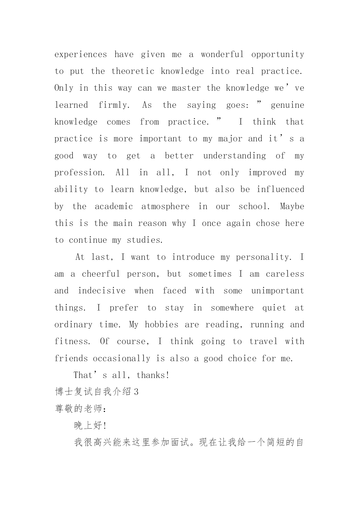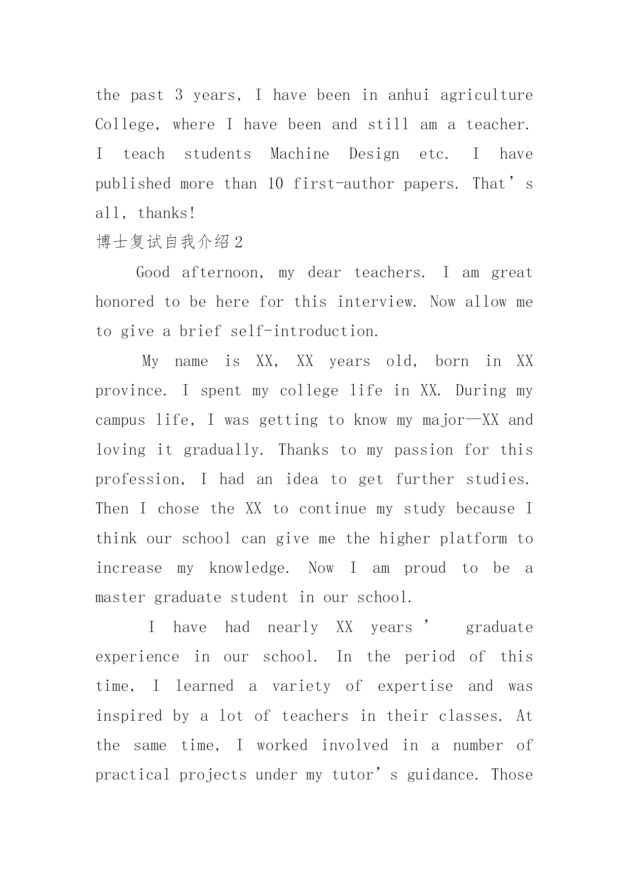 博士复试自我介绍博士复试自我介绍初到一个新的环境,常常需要我们进行自我介绍,通过自我介绍可以让别人认识自己。那么自我介绍有什么格式呢?以下是小编精心整理的博士复试自我介绍,仅供参考,大家一起来看看吧。博士复试自我介绍1Goodmorning,DearProfessors:It’smyhonortointroducemyself.Mynameischenchen,IamfromqingyangCountyanhuiProvince,April6Iwasborninacommonfamily,andmyparentsareworkers,Iloveandrespectthemverymuch.WeweredelightwithmybecomingafreshmaninSeptember1994.Luckily,Iwaspermittedtobeagraduatestudentafter5yearscolorfullifeoncampus.IreceivedmyBachelordegree20xxinanhuiagricultureuniversityInstituteof(Collegeof)ResourcesandEnvironmentalScience,thenaMasterdegree20xxinanhuiagricltureUniversityofScienceandTechnology.Forthose7yearsmymajorwasDieDesign.BeforeIreceivedmyMasterdegree,Ihaddonethesubjectofmeteorology.Forthepast3years,IhavebeeninanhuiagricultureCollege,whereIhavebeenandstillamateacher.IteachstudentsMachineDesignetc.Ihavepublishedmorethan10first-authorpapers.That’sall,thanks!博士复试自我介绍2Goodafternoon,mydearteachers.Iamgreathonoredtobehereforthisinterview.Nowallowmetogiveabriefself-introduction.MynameisXX,XXyearsold,borninXXprovince.IspentmycollegelifeinXX.Duringmycampuslife,Iwasgettingtoknowmymajor—XXandlovingitgradually.Thankstomypassionforthisprofession,Ihadanideatogetfurtherstudies.ThenIchosetheXXtocontinuemystudybecauseIthinkourschoolcangivemethehigherplatformtoincreasemyknowledge.NowIamproudtobeamastergraduatestudentinourschool.IhavehadnearlyXXyears’graduateexperienceinourschool.Intheperiodofthistime,Ilearnedavarietyofexpertiseandwasinspiredbyalotofteachersintheirclasses.Atthesametime,Iworkedinvolvedinanumberofpracticalprojectsundermytutor’sguidance.Thoseexperienceshavegivenmeawonderfulopportunitytoputthetheoreticknowledgeintorealpractice.Onlyinthiswaycanwemastertheknowledgewe’velearnedfirmly.Asthesayinggoes:”genuineknowledgecomesfrompractice.”Ithinkthatpracticeismoreimportanttomymajorandit’sagoodwaytogetabetterunderstandingofmyprofession.Allinall,Inotonlyimprovedmyabilitytolearnknowledge,butalsobeinfluencedbytheacademicatmosphereinourschool.MaybethisisthemainreasonwhyIon
