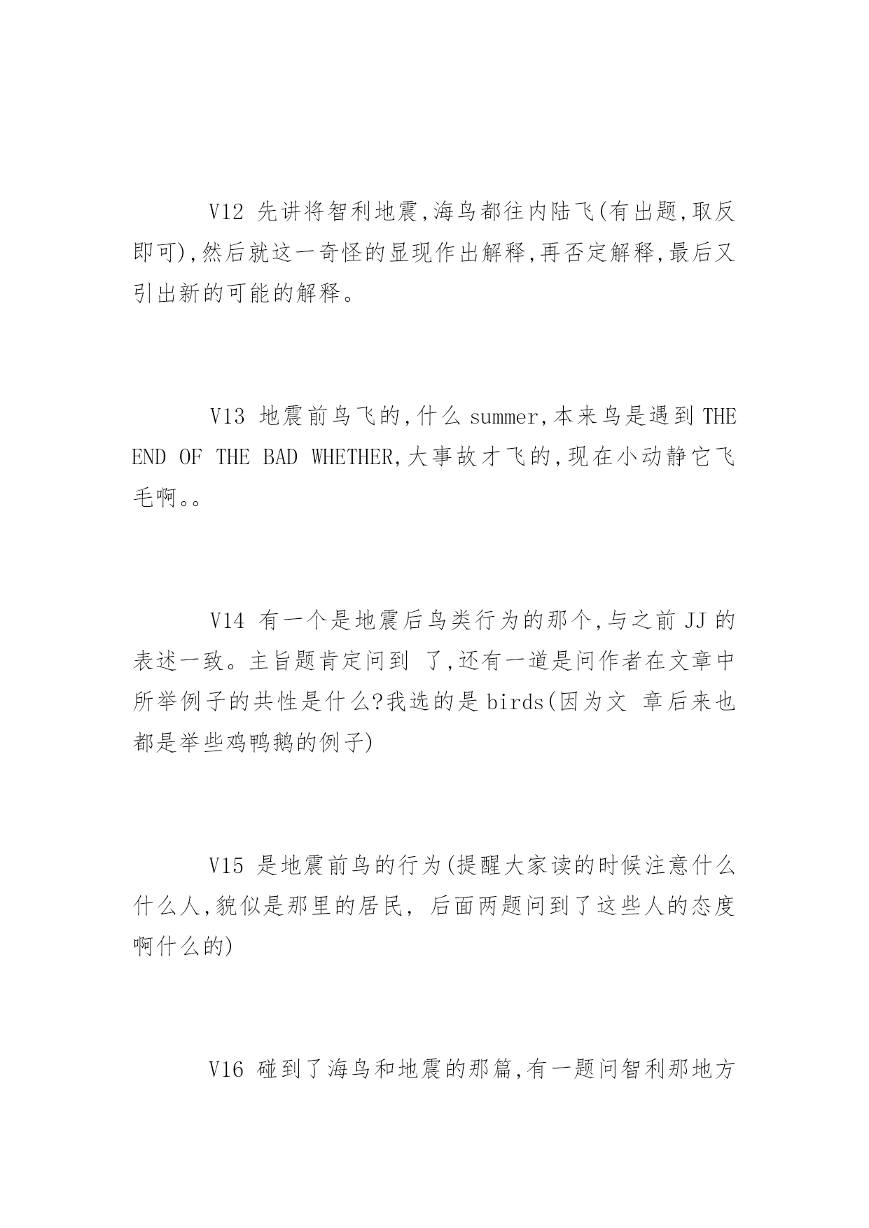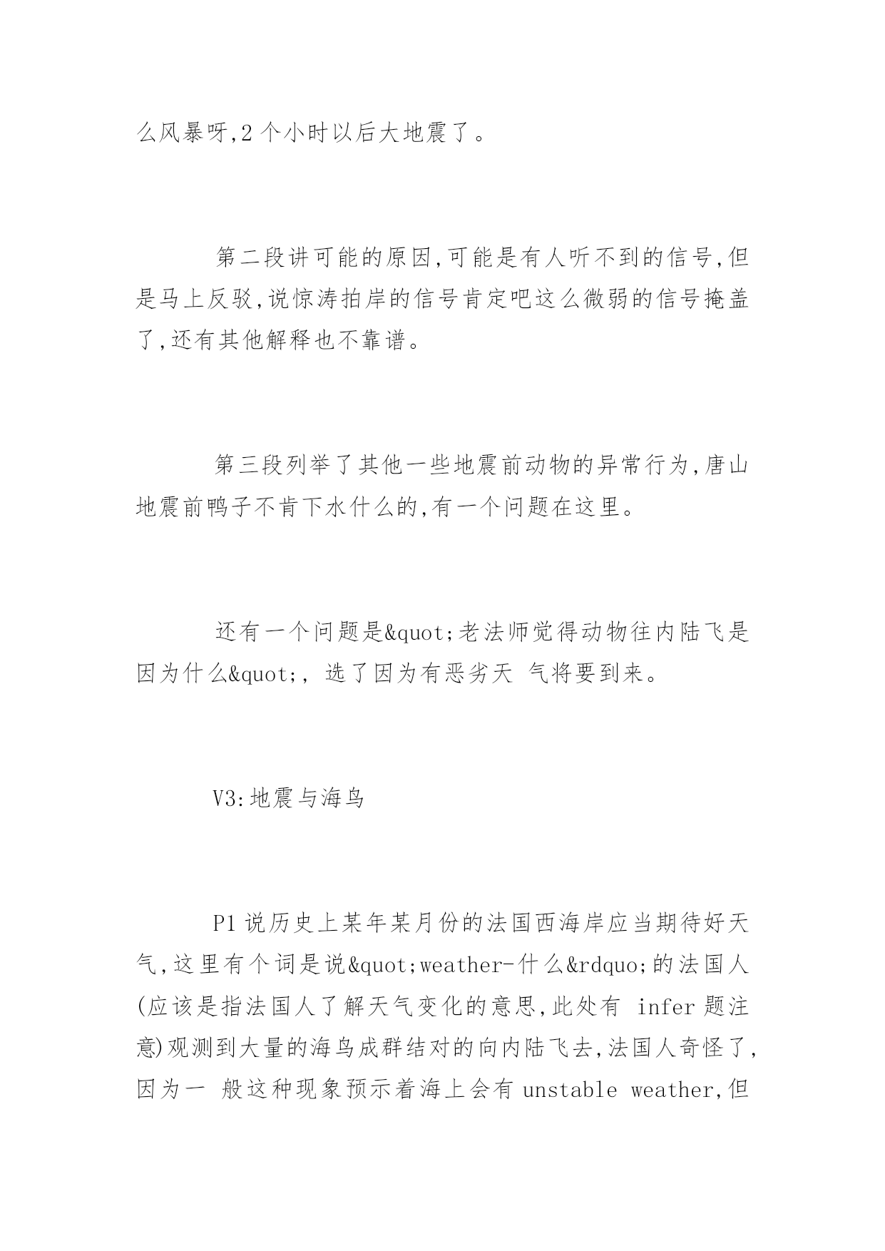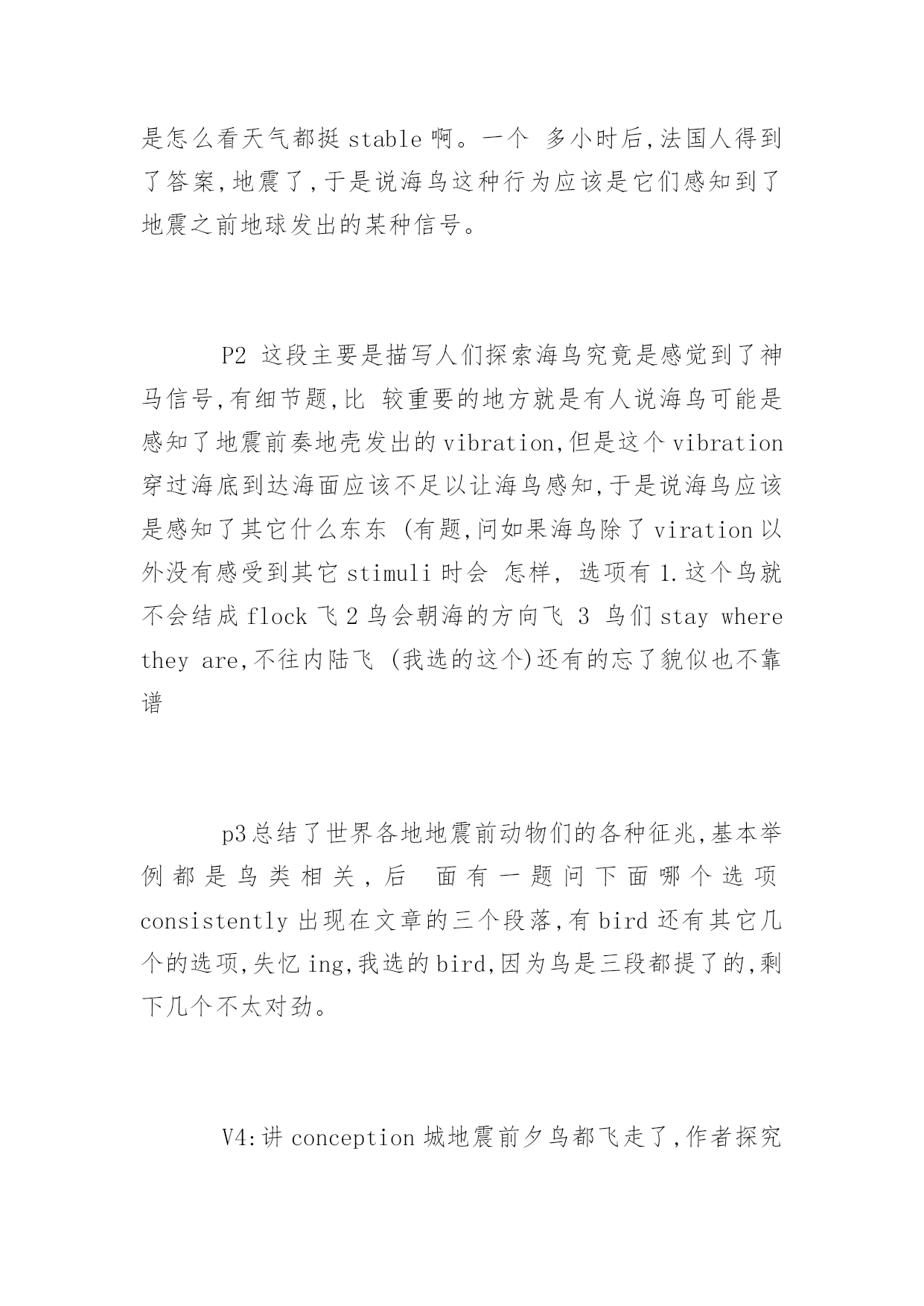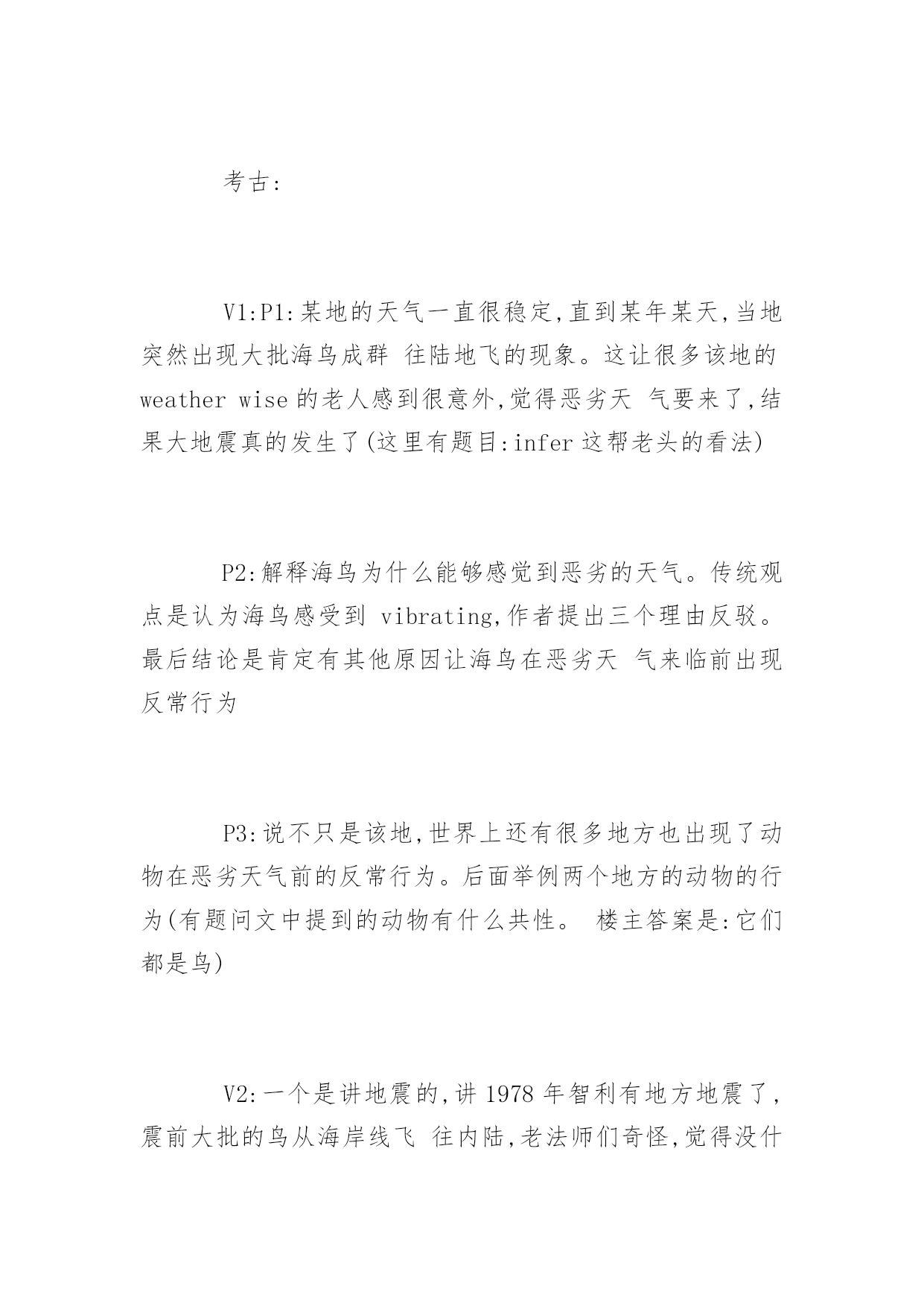 GMAT考试机经阅读历年真题GMAT考试机经阅读历年真题在练习中自己总结出考试出题规律,比听别人讲更牢固。下面是小编整理的GMAT考试机经阅读历年真题,希望对大家有用,更多消息请关注应届毕业生网。P1展开背景,3月(或者是二月或者一月)是智利的夏季,但是1890年的夏季稍微有一点不一样,因为这个月某一天突然之间一大群海鸟铺天盖地般从海岸边飞到内陆去。1小时40分钟之后,发生了大地震。这个时候作者设想,到底海鸟得到了什么信号才开始往内陆飞;这个逻辑在于,如果海鸟的听觉足够敏锐可以听到地震前的地壳底部的声音或者感觉到地面的细微震动,换句话说,如果海鸟感知到是地震的话,那么海鸟应该停留在海岸才对,因为在地震的时候内陆比海岸更加不安全。P2给出了一段解释,说海鸟感知到的可能不是地震,而是storm。其中解释了很多,具体已经记不起来。P3又开始列举世界其他地方(如中国)的类似的动物对地震先知先觉的案例。包括鸭子和天鹅不下水、家禽主要是chicken不进入鸡圈等来论证动物确实可以提前感觉地震。最后无端的得出结论说地震前肯定是大气磁场已经发生了变化。这个结论很奇怪。题目暂时不在赘述,因为我也不知道我是否答对,所以不想误导大家。V2:第一段说地震前一小时四十分钟有大量的鸟从海上飞到内陆,老人都很奇怪,因为除非天气剧烈变化,鸟群是不会有这种反常行为的,后来就大地震了。这种现象历史上还观察到几次。第二段提供了一个解释,说可能是地震波从陆地上传到海上,鸟群感受到了什么的。然后这一段质疑这个观点,列举123为什么这个是不对的。中间好像还有一段,又失忆了?反正就算有东西也没考题最后一段是说,这种现象不是孤立的,在中国也有类似的现象,比如鸡不肯进笼子什么的。这里都是例子,没有考题。有道题问文章的作用是什么,选的是一个areporton一个现象之类的。V3:一开始人们认为鸟的行为反映了stableweather什么的,后来突然一次鸟对地震前期vibrationalchaos反应剧烈,剧烈的不正常,formflocksinterior。解释这个现象的原因associatedwith什么别的,有问道在之前wise-weather的人的行为依据,还有后来高亮了vibrationalchaos这个词的作用是什么考古:V1:P1:某地的天气一直很稳定,直到某年某天,当地突然出现大批海鸟成群往陆地飞的现象。这让很多该地的weatherwise的老人感到很意外,觉得恶劣天气要来了,结果大地震真的发生了(这里有题目:infer这帮老头的看法)P2:解释海鸟为什么能够感觉到恶劣的天气。传统观点是认为海鸟感受到vibrating,作者提出三个理由反驳。最后结论是肯定有其他原因让海鸟在恶劣天气来临前出现反常行为P3:说不只是该地,世界上还有很多地方也出现了动物在恶劣天气前的反常行为。后面举例两个地方的动物的行为(有题问文中提到的动物有什么共性。楼主答案是:它们都是鸟)V2:一个是讲地震的,讲1978年智利有地方地震了,震前大批的鸟从海岸线飞往内陆,老法师们奇怪,觉得没什么风暴呀,2个小时以后大地震了。第二段讲可能的原因,可能是有人听不到的信号,但是马上反驳,说惊涛拍岸的信号肯定吧这么微弱的信号掩盖了,还有其他解释也不靠谱。第三段列举了其他一些地震前动物的异常行为,唐山地震前鸭子不肯下水什么的,有一个问题在这里。还有一个问题是"老法师觉得动物往内陆飞是因为什么",选了因为有恶劣天气将要到来。V3:地震与海鸟P1说历史上某年某月份的法国西海岸应当期待好天气,这里有个词是说"weather-什么”的法国人(应该是指法国人了解天气变化的意思,此处有infer题注意)观测到大量的海鸟成群结对的向内陆飞去,法国人奇怪了,因为一般这种现象预示着海上会有unstableweather,但是怎么看天气都挺stable啊。一个多小时后,法国人得到了答案,地震了,于是说海鸟这种行为应该是它们感知到了地震之前地球发出的某种信号。P2这段主要是描写人们探索海鸟究竟是感觉到了神马信号,有细节题,比较重要的地方就是有人说海鸟可能是感知了地震前奏地壳发出的vibration,但是这个vibration穿过海底到达海面应该不足以让海鸟感知,于是说海鸟应该是感知了其它什么东东(有题,问如果海鸟除了viration以外没有感受到其它stimuli时会怎样,选项有1.这个鸟就不会结成flock飞2鸟会朝海的方向飞3鸟们staywheretheyare,不往内陆飞(我选的这个)还有的忘了貌似也不靠谱p3总结了世界各地地震前动物们的各种征兆,基本举例都是鸟类相关,后面有一题问下面哪个选项consistently出现在文章的三个