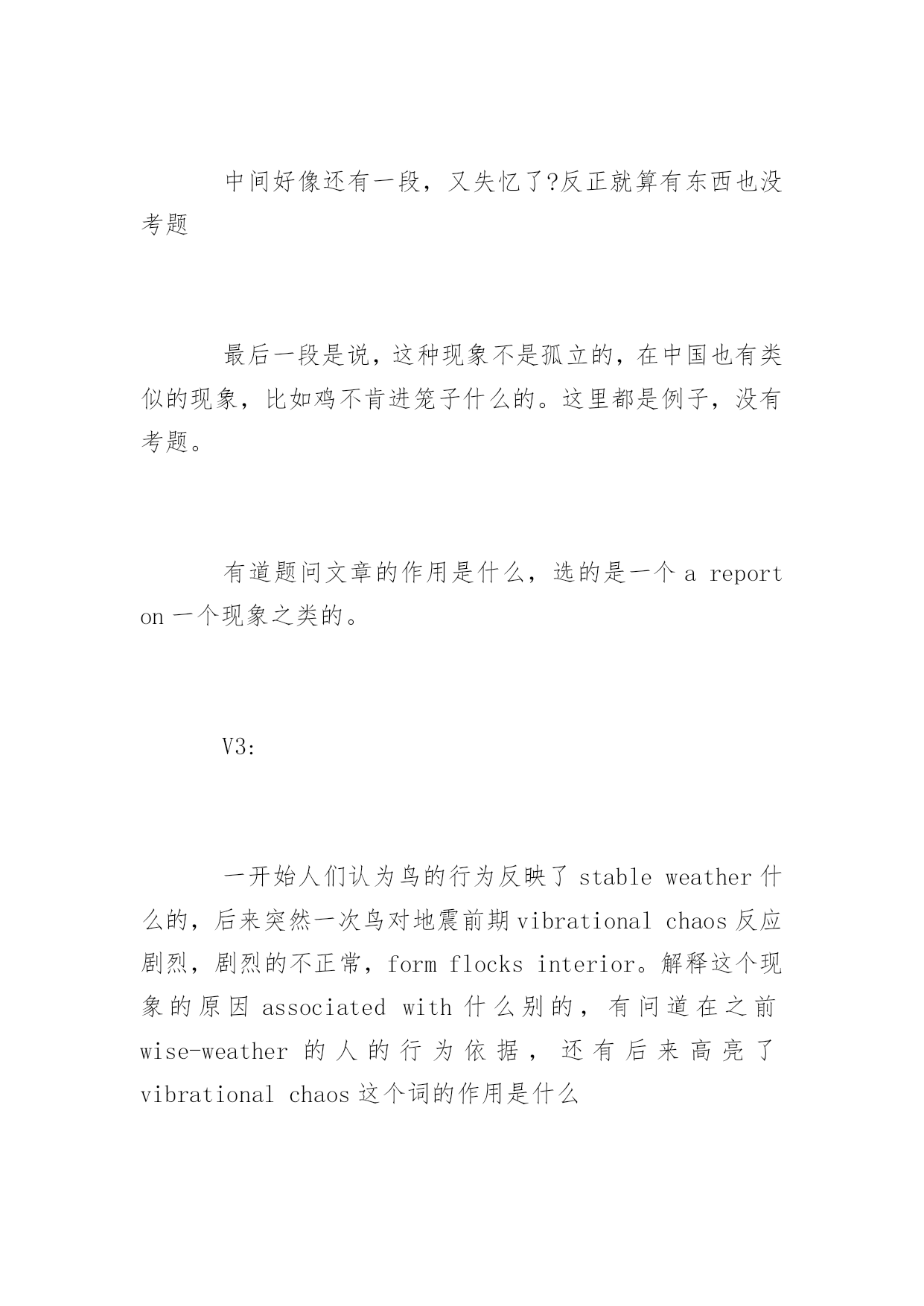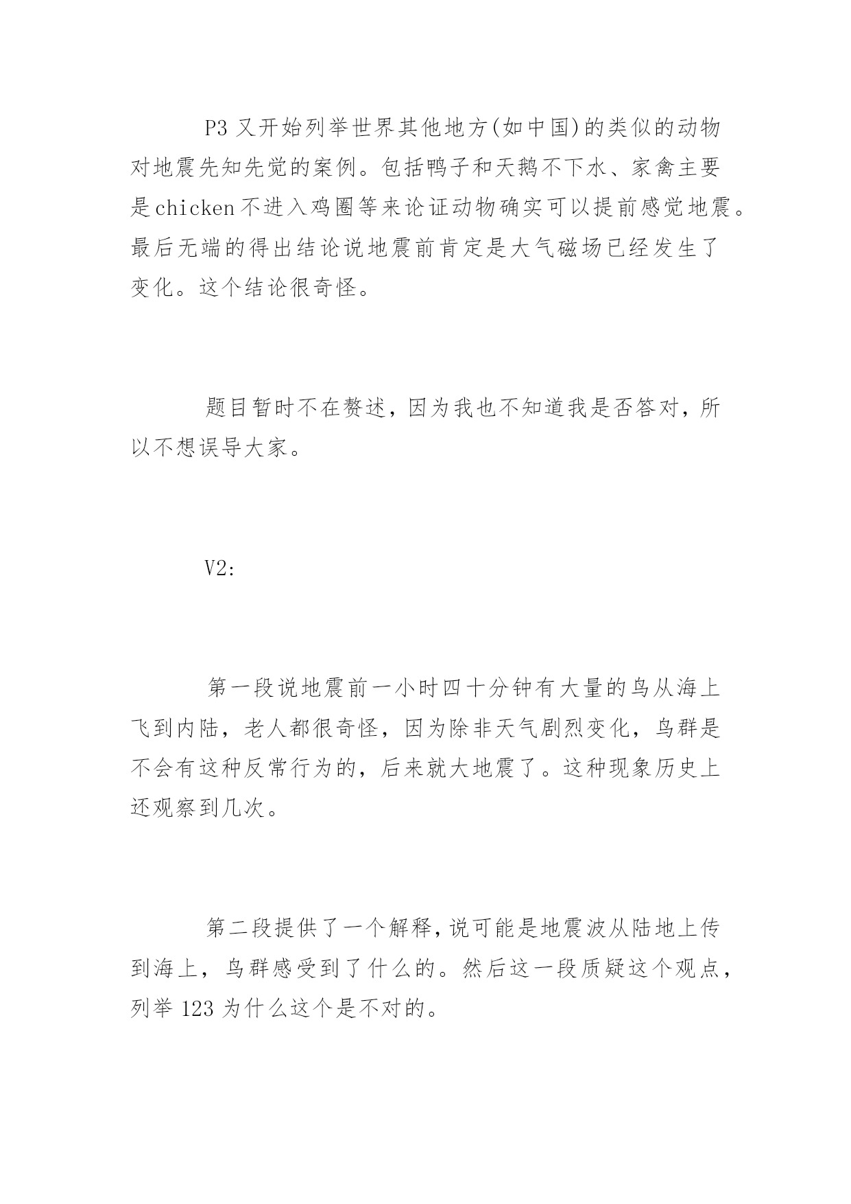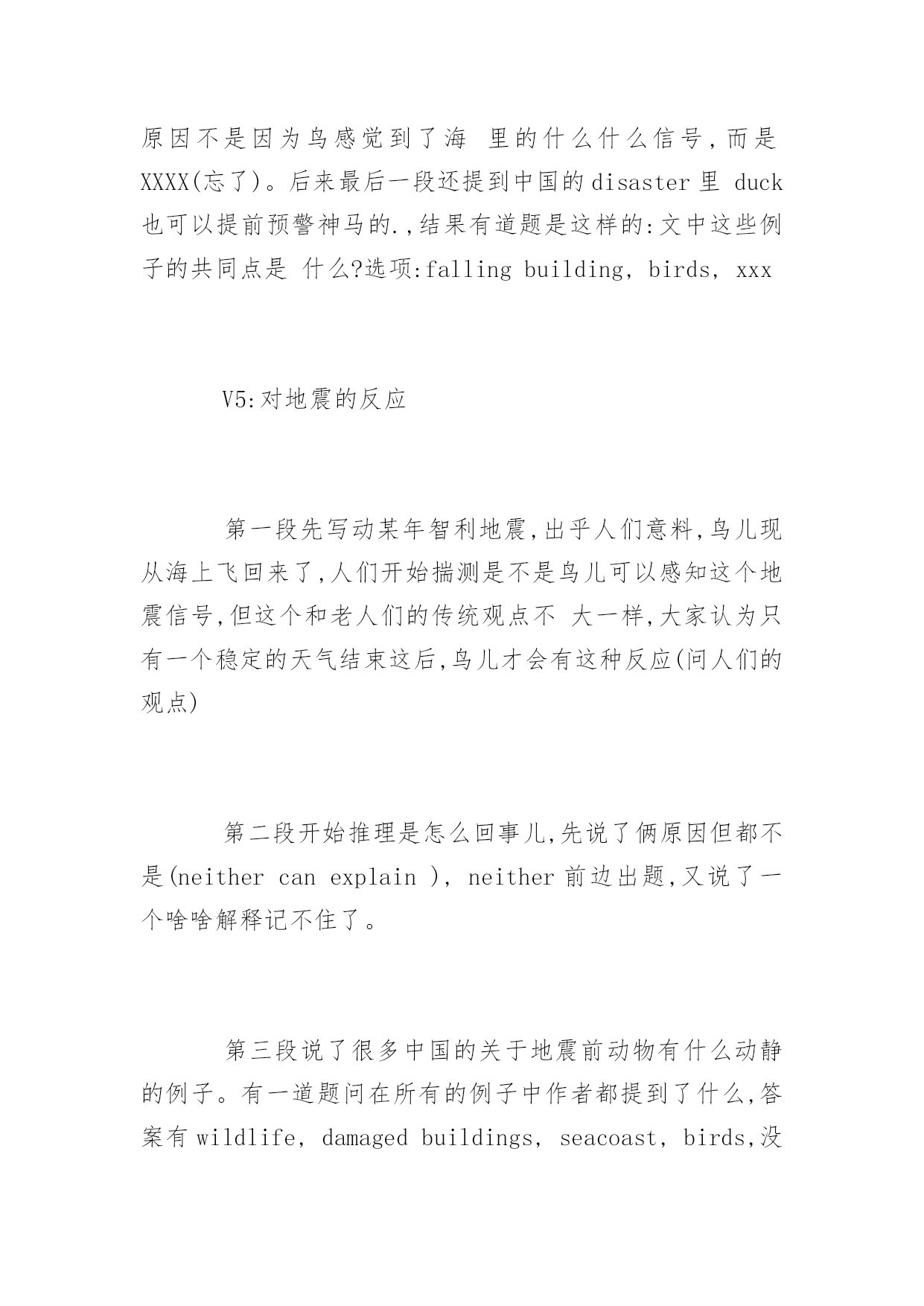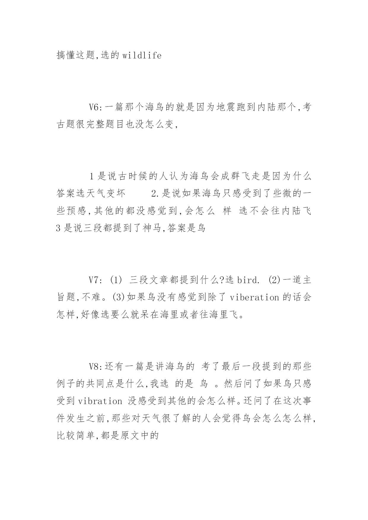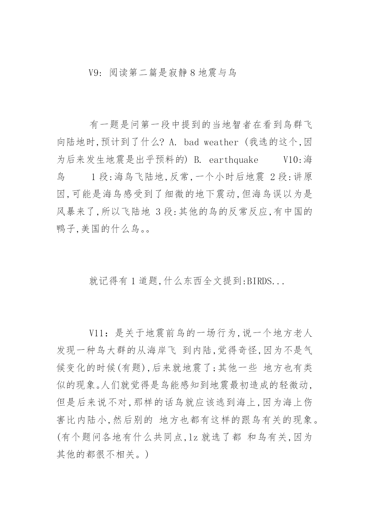 GMAT考试机经阅读历年真题GMAT考试机经阅读历年真题在练习中自己总结出考试出题规律,比听别人讲更牢固。下面是小编整理的GMAT考试机经阅读历年真题,希望对大家有用,更多消息请关注应届毕业生网。P1展开背景,3月(或者是二月或者一月)是智利的夏季,但是1890年的夏季稍微有一点不一样,因为这个月某一天突然之间一大群海鸟铺天盖地般从海岸边飞到内陆去。1小时40分钟之后,发生了大地震。这个时候作者设想,到底海鸟得到了什么信号才开始往内陆飞;这个逻辑在于,如果海鸟的听觉足够敏锐可以听到地震前的地壳底部的声音或者感觉到地面的细微震动,换句话说,如果海鸟感知到是地震的话,那么海鸟应该停留在海岸才对,因为在地震的时候内陆比海岸更加不安全。P2给出了一段解释,说海鸟感知到的可能不是地震,而是storm。其中解释了很多,具体已经记不起来。P3又开始列举世界其他地方(如中国)的类似的动物对地震先知先觉的案例。包括鸭子和天鹅不下水、家禽主要是chicken不进入鸡圈等来论证动物确实可以提前感觉地震。最后无端的得出结论说地震前肯定是大气磁场已经发生了变化。这个结论很奇怪。题目暂时不在赘述,因为我也不知道我是否答对,所以不想误导大家。V2:第一段说地震前一小时四十分钟有大量的鸟从海上飞到内陆,老人都很奇怪,因为除非天气剧烈变化,鸟群是不会有这种反常行为的,后来就大地震了。这种现象历史上还观察到几次。第二段提供了一个解释,说可能是地震波从陆地上传到海上,鸟群感受到了什么的。然后这一段质疑这个观点,列举123为什么这个是不对的。中间好像还有一段,又失忆了?反正就算有东西也没考题最后一段是说,这种现象不是孤立的,在中国也有类似的现象,比如鸡不肯进笼子什么的。这里都是例子,没有考题。有道题问文章的作用是什么,选的是一个areporton一个现象之类的。V3:一开始人们认为鸟的行为反映了stableweather什么的,后来突然一次鸟对地震前期vibrationalchaos反应剧烈,剧烈的不正常,formflocksinterior。解释这个现象的原因associatedwith什么别的,有问道在之前wise-weather的人的行为依据,还有后来高亮了vibrationalchaos这个词的作用是什么考古:V1:P1:某地的天气一直很稳定,直到某年某天,当地突然出现大批海鸟成群往陆地飞的现象。这让很多该地的weatherwise的老人感到很意外,觉得恶劣天气要来了,结果大地震真的发生了(这里有题目:infer这帮老头的看法)P2:解释海鸟为什么能够感觉到恶劣的天气。传统观点是认为海鸟感受到vibrating,作者提出三个理由反驳。最后结论是肯定有其他原因让海鸟在恶劣天气来临前出现反常行为P3:说不只是该地,世界上还有很多地方也出现了动物在恶劣天气前的反常行为。后面举例两个地方的动物的行为(有题问文中提到的动物有什么共性。楼主答案是:它们都是鸟)V2:一个是讲地震的,讲1978年智利有地方地震了,震前大批的鸟从海岸线飞往内陆,老法师们奇怪,觉得没什么风暴呀,2个小时以后大地震了。第二段讲可能的原因,可能是有人听不到的信号,但是马上反驳,说惊涛拍岸的信号肯定吧这么微弱的信号掩盖了,还有其他解释也不靠谱。第三段列举了其他一些地震前动物的异常行为,唐山地震前鸭子不肯下水什么的,有一个问题在这里。还有一个问题是"老法师觉得动物往内陆飞是因为什么",选了因为有恶劣天气将要到来。V3:地震与海鸟P1说历史上某年某月份的法国西海岸应当期待好天气,这里有个词是说"weather-什么”的法国人(应该是指法国人了解天气变化的意思,此处有infer题注意)观测到大量的海鸟成群结对的向内陆飞去,法国人奇怪了,因为一般这种现象预示着海上会有unstableweather,但是怎么看天气都挺stable啊。一个多小时后,法国人得到了答案,地震了,于是说海鸟这种行为应该是它们感知到了地震之前地球发出的某种信号。P2这段主要是描写人们探索海鸟究竟是感觉到了神马信号,有细节题,比较重要的地方就是有人说海鸟可能是感知了地震前奏地壳发出的vibration,但是这个vibration穿过海底到达海面应该不足以让海鸟感知,于是说海鸟应该是感知了其它什么东东(有题,问如果海鸟除了viration以外没有感受到其它stimuli时会怎样,选项有1.这个鸟就不会结成flock飞2鸟会朝海的方向飞3鸟们staywheretheyare,不往内陆飞(我选的这个)还有的忘了貌似也不靠谱p3总结了世界各地地震前动物们的各种征兆,基本举例都是鸟类相关,后面有一题问下面哪个选项consistently出现在文章的三个