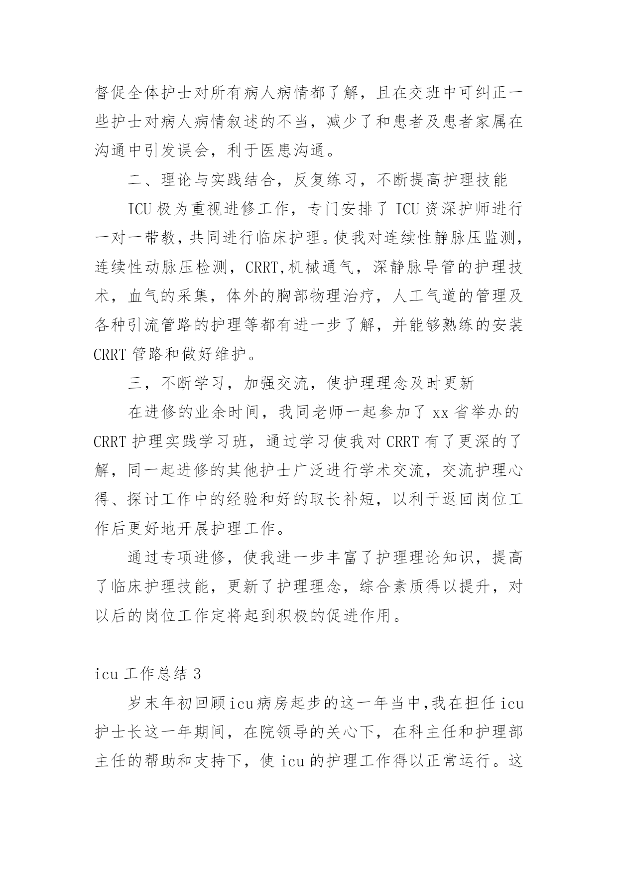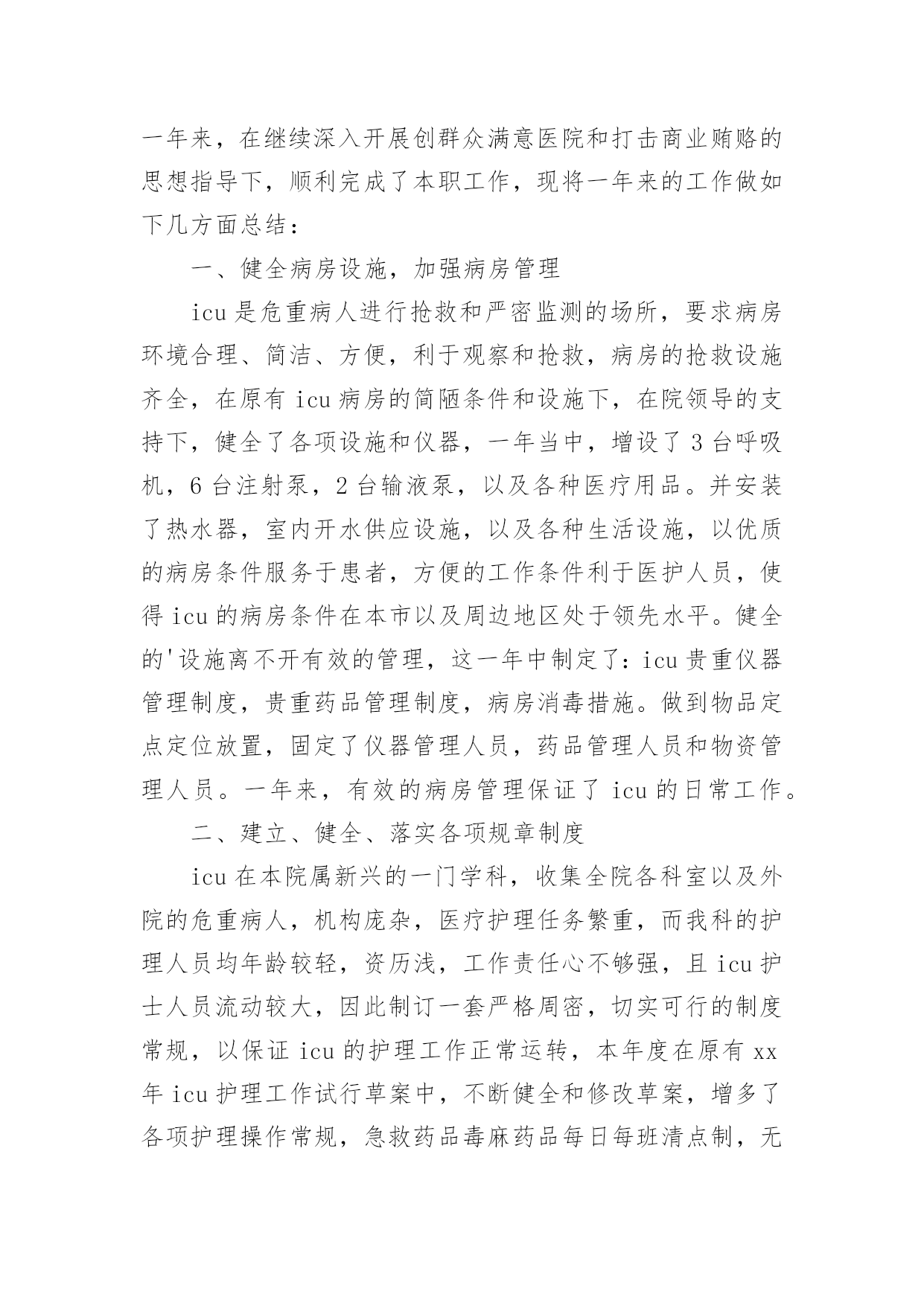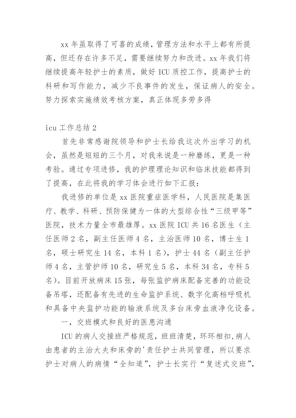 icu工作总结总结是指社会团体、企业单位和个人对某一阶段的学习、工作或其完成情况加以回顾和分析,得出教训和一些规律性认识的一种书面材料,它可以帮助我们有寻找学习和工作中的规律,我想我们需要写一份总结了吧。那么我们该怎么去写总结呢?以下是小编帮大家整理的icu工作总结,欢迎阅读与收藏。icu工作总结1今年是不平凡的一年,除了迎接每年卫生系统的各种例行检查之外,我们还经历了等级医院的中期复核评价。ICU是必查科室,所以压力很大,在短短的一个月当中,我们付出很多,在全体护理人员的共同努力下,顺利通过检查,虽然检查结果不理想,但是我们也从中找到了差距,知道今后努力的方向,同时也得到了锻炼、成长和提高。检查不是目的,目的是使各项流程、制度、规范不断的修订和护理管理方面:根据等级医院复核评价检查中的不足,我们修订了气管插管病人口腔护理流程、气囊压力监测流程、声门下吸引流程、CVC、PICC维护流程和规范。今后将年轻护士素质提高方面:ICU年轻护士较多,培训较困难,而且培训效果不明显,为了提高年轻护士的素质及迎检经验,我们联合呼吸科、神经内科、急诊科和护理部,由护士长组成考核组,每周四进行互查,科护士长或护理部主任参加每月考核一次。经考核和调查,这种考核方法,既能提高护士的知识水平,促进护士主动学习的欲望,也能提高护士的迎质控方面:ICU均收治危重病人,护理工作繁多,质控困难,光靠护士长的督促和检查效果不明显,为了让每位护士均参与质控工作,而且变为主动参与,我们以组为单位,组长为主要质控员,每个人都有质控任务,达到每天每项质控内容均有人检查并签名,每天护士长抽查,每月检查两次,每月底召开质控会议一次,并通报当月发生的不良事件,分析存在的问题,提护士的教育和培养:ICU主要收治危重病人,要求护士既要有扎实的理论基础知识和专科知识,还要有熟练的操作技能和敏锐的观察能力。护理部要求每周必须业务学习一次,科室年初也制定了学习计划,每月也按时学习,只不过是安排到每个组,,每组自行安排学习时间,经过调查,这样的学习方式,一点效果没有,一个人读完后,听过的人还不知道读什么。为了改变这种状态,每月底安排一个护士将这个月的四次业务学习的主要内容,需要护士掌握的内容,再做成PPD,在当月的月底,开质控会议的'时候讲课,所有护士均参加,帮助护士提高学习效果。除了学习基础和专科知识以外,我们还讲述护理法律科研方面:xx年科研方面获得了可喜的成绩:获徐州市卫生局新技术引进三等奖一项,发表论文六篇,今后将继续努xx年虽取得了可喜的成绩,管理方法和水平上都有所提高,但还存在许多不足,需要继续努力和改进。xx年我们将继续提高年轻护士的素质,做好ICU质控工作,提高护士的科研和写作能力,减少不良事件的发生,保证病人的安全。努力探索实施绩效考核方案,真正体现多劳多得icu工作总结2首先非常感谢院领导和护士长给我这次外出学习的机会,虽然是短短的三个月,对我来说是一种磨练,更是一种考验。通过专项进修,我的护理理论知识和临床技能都得到了提高,在此将我的学习体会进行如下汇报:我进修的单位是xx医院重症医学科,人民医院是集医疗、教学、科研、预防保健为一体的大型综合性“三级甲等”医院,技术力量全市最雄厚。xx医院ICU共16名医生(主任医师2名,副主任医师4名,主治医师10名,博士生1名,硕士研究生14名,本科1名),护士44名(副主任护师4名,主管护师10名,研究生5名,本科34名,专科5名)。目前开放病床15张,每张监护病床配备完善的功能设备吊塔,还配备有先进的生命监护系统、数字化高档呼吸机和具备中央监护功能的输液系统及多台床旁血液净化设备。一,交班模式和良好的医患沟通ICU的病人交接班严格规范,班班清楚,环环相扣,病人由患者的主治大夫和床旁的'责任护士共同管理,所以要求护士对病人的病情“全知道”,护士长实行“复述式交班”,督促全体护士对所有病人病情都了解,且在交班中可纠正一些护士对病人病情叙述的不当,减少了和患者及患者家属在沟通中引发误会,利于医患沟通。二、理论与实践结合,反复练习,不断提高护理技能ICU极为重视进修工作,专门安排了ICU资深护师进行一对一带教,共同进行临床护理。使我对连续性静脉压监测,连续性动脉压检测,CRRT,机械通气,深静脉导管的护理技术,血气的采集,体外的胸部物理治疗,人工气道的管理及各种引流管路的护理等都有进一步了解,并能够熟练的安装CRRT管路和做好维护。三,不断学习,加强交流,使护理理念及时更新在进修的业余时间,我同老师一起参加了xx省举办的CRRT护理实践学习班,通过学习使我对CRRT有了更深的了解,同一起进修的其他护士广泛进行学术交流,交流护理心得、探讨工作中的经验和好的取长补短,以利于返回岗位工作后更好地开展护理工作。通过专项进修,使我进一步