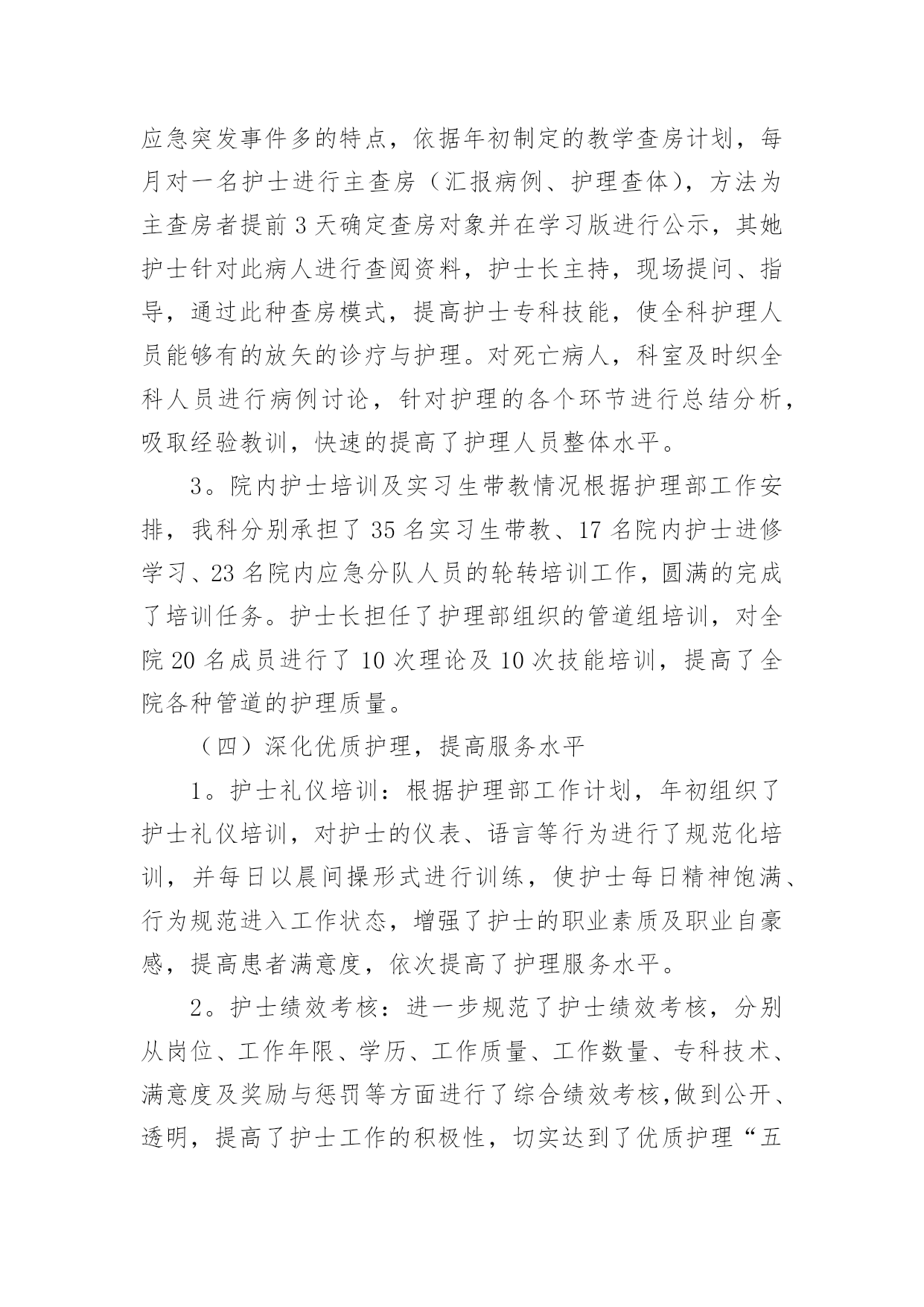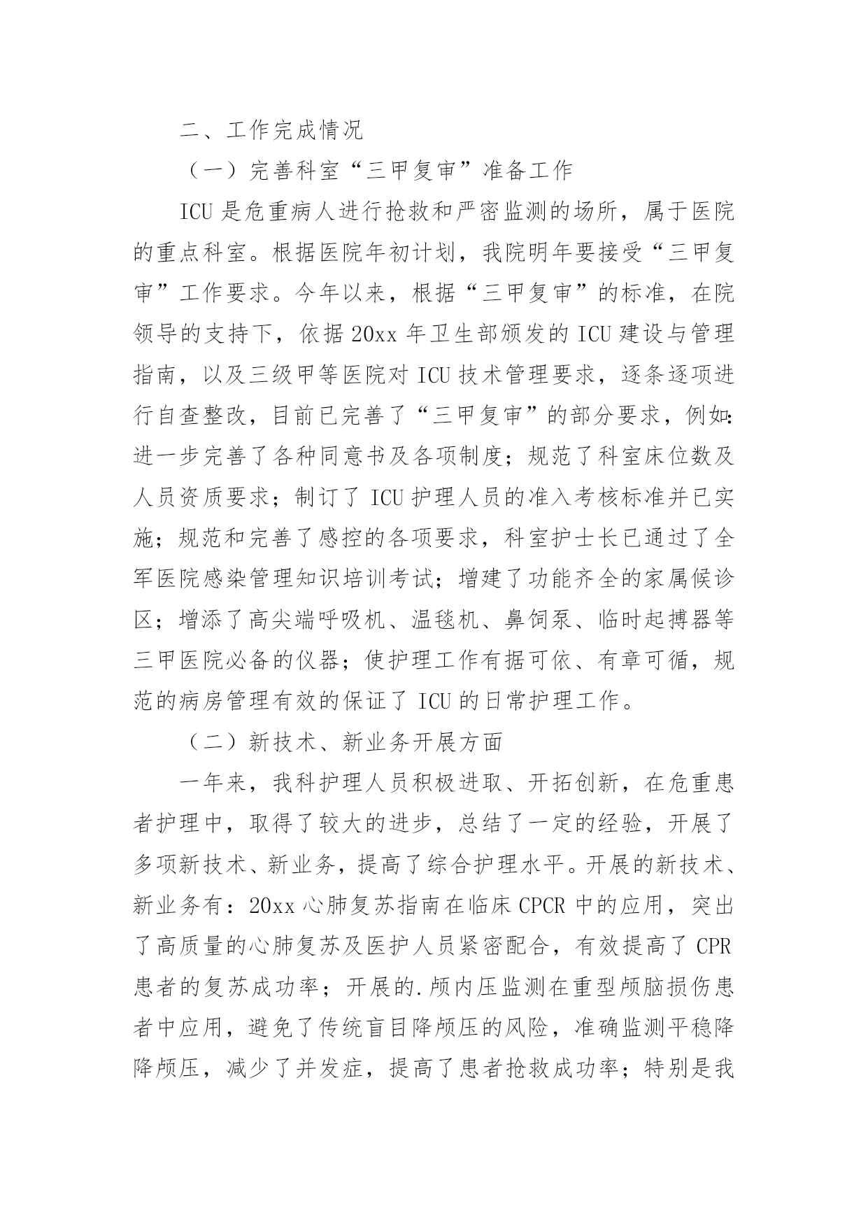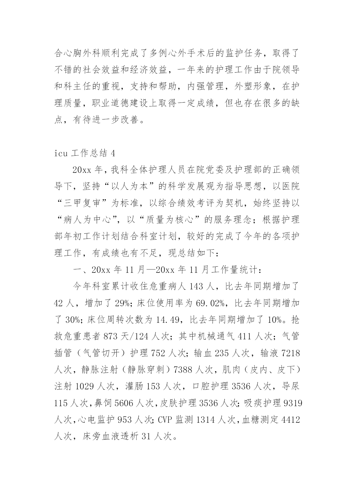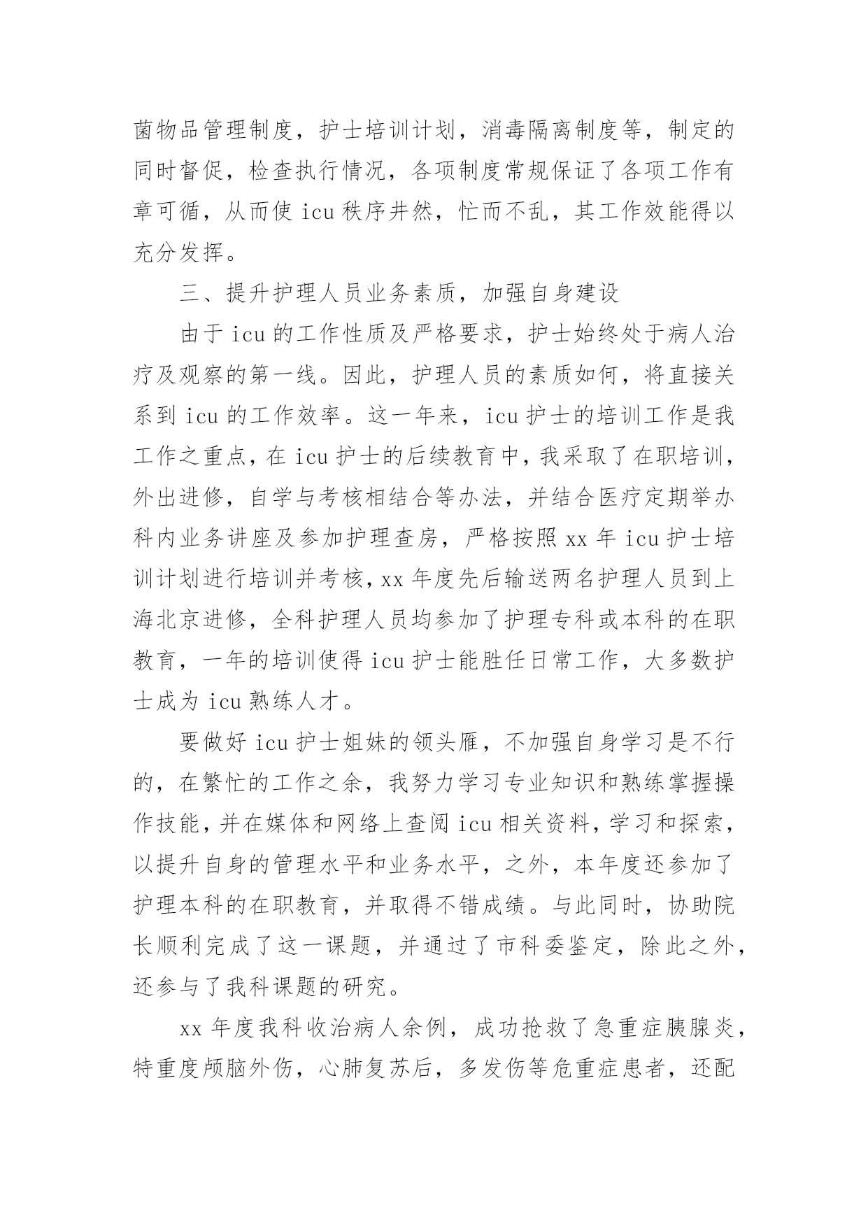 icu工作总结总结是指社会团体、企业单位和个人对某一阶段的学习、工作或其完成情况加以回顾和分析,得出教训和一些规律性认识的一种书面材料,它可以帮助我们有寻找学习和工作中的规律,我想我们需要写一份总结了吧。那么我们该怎么去写总结呢?以下是小编帮大家整理的icu工作总结,欢迎阅读与收藏。icu工作总结1今年是不平凡的一年,除了迎接每年卫生系统的各种例行检查之外,我们还经历了等级医院的中期复核评价。ICU是必查科室,所以压力很大,在短短的一个月当中,我们付出很多,在全体护理人员的共同努力下,顺利通过检查,虽然检查结果不理想,但是我们也从中找到了差距,知道今后努力的方向,同时也得到了锻炼、成长和提高。检查不是目的,目的是使各项流程、制度、规范不断的修订和护理管理方面:根据等级医院复核评价检查中的不足,我们修订了气管插管病人口腔护理流程、气囊压力监测流程、声门下吸引流程、CVC、PICC维护流程和规范。今后将年轻护士素质提高方面:ICU年轻护士较多,培训较困难,而且培训效果不明显,为了提高年轻护士的素质及迎检经验,我们联合呼吸科、神经内科、急诊科和护理部,由护士长组成考核组,每周四进行互查,科护士长或护理部主任参加每月考核一次。经考核和调查,这种考核方法,既能提高护士的知识水平,促进护士主动学习的欲望,也能提高护士的迎质控方面:ICU均收治危重病人,护理工作繁多,质控困难,光靠护士长的督促和检查效果不明显,为了让每位护士均参与质控工作,而且变为主动参与,我们以组为单位,组长为主要质控员,每个人都有质控任务,达到每天每项质控内容均有人检查并签名,每天护士长抽查,每月检查两次,每月底召开质控会议一次,并通报当月发生的不良事件,分析存在的问题,提护士的教育和培养:ICU主要收治危重病人,要求护士既要有扎实的理论基础知识和专科知识,还要有熟练的操作技能和敏锐的观察能力。护理部要求每周必须业务学习一次,科室年初也制定了学习计划,每月也按时学习,只不过是安排到每个组,,每组自行安排学习时间,经过调查,这样的学习方式,一点效果没有,一个人读完后,听过的人还不知道读什么。为了改变这种状态,每月底安排一个护士将这个月的四次业务学习的主要内容,需要护士掌握的内容,再做成PPD,在当月的月底,开质控会议的'时候讲课,所有护士均参加,帮助护士提高学习效果。除了学习基础和专科知识以外,我们还讲述护理法律科研方面:xx年科研方面获得了可喜的成绩:获徐州市卫生局新技术引进三等奖一项,发表论文六篇,今后将继续努xx年虽取得了可喜的成绩,管理方法和水平上都有所提高,但还存在许多不足,需要继续努力和改进。xx年我们将继续提高年轻护士的素质,做好ICU质控工作,提高护士的科研和写作能力,减少不良事件的发生,保证病人的安全。努力探索实施绩效考核方案,真正体现多劳多得icu工作总结2首先非常感谢院领导和护士长给我这次外出学习的机会,虽然是短短的三个月,对我来说是一种磨练,更是一种考验。通过专项进修,我的护理理论知识和临床技能都得到了提高,在此将我的学习体会进行如下汇报:我进修的单位是xx医院重症医学科,人民医院是集医疗、教学、科研、预防保健为一体的大型综合性“三级甲等”医院,技术力量全市最雄厚。xx医院ICU共16名医生(主任医师2名,副主任医师4名,主治医师10名,博士生1名,硕士研究生14名,本科1名),护士44名(副主任护师4名,主管护师10名,研究生5名,本科34名,专科5名)。目前开放病床15张,每张监护病床配备完善的功能设备吊塔,还配备有先进的生命监护系统、数字化高档呼吸机和具备中央监护功能的输液系统及多台床旁血液净化设备。一,交班模式和良好的医患沟通ICU的病人交接班严格规范,班班清楚,环环相扣,病人由患者的主治大夫和床旁的'责任护士共同管理,所以要求护士对病人的病情“全知道”,护士长实行“复述式交班”,督促全体护士对所有病人病情都了解,且在交班中可纠正一些护士对病人病情叙述的不当,减少了和患者及患者家属在沟通中引发误会,利于医患沟通。二、理论与实践结合,反复练习,不断提高护理技能ICU极为重视进修工作,专门安排了ICU资深护师进行一对一带教,共同进行临床护理。使我对连续性静脉压监测,连续性动脉压检测,CRRT,机械通气,深静脉导管的护理技术,血气的采集,体外的胸部物理治疗,人工气道的管理及各种引流管路的护理等都有进一步了解,并能够熟练的安装CRRT管路和做好维护。三,不断学习,加强交流,使护理理念及时更新在进修的业余时间,我同老师一起参加了xx省举办的CRRT护理实践学习班,通过学习使我对CRRT有了更深的了解,同一起进修的其他护士广泛进行学术交流,交流护理心得、探讨工作中的经验和好的取长补短,以利于返回岗位工作后更好地开展护理工作。通过专项进修,使我进一步
