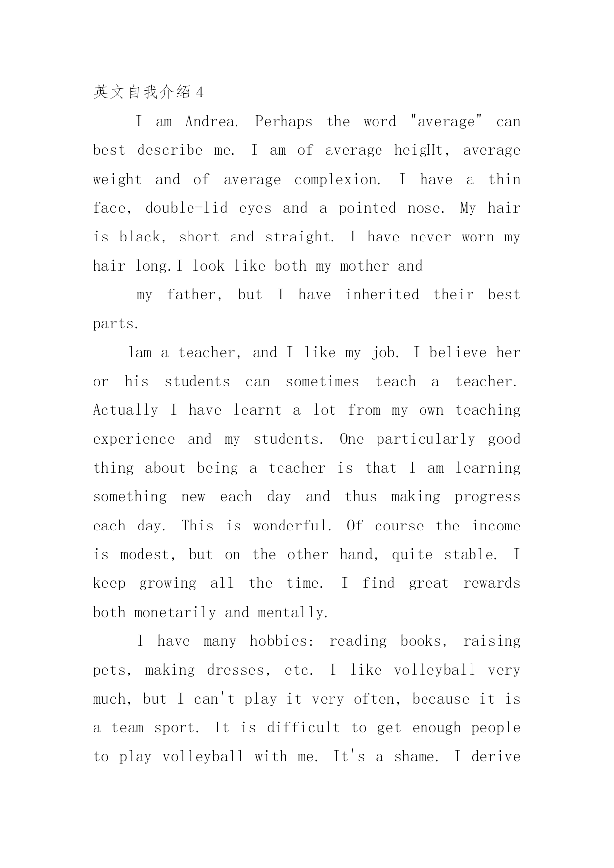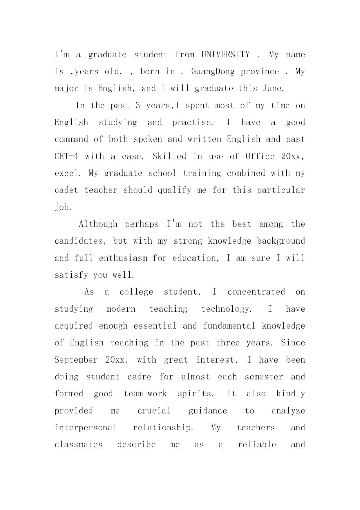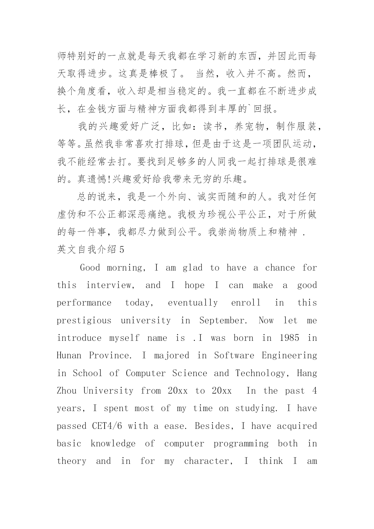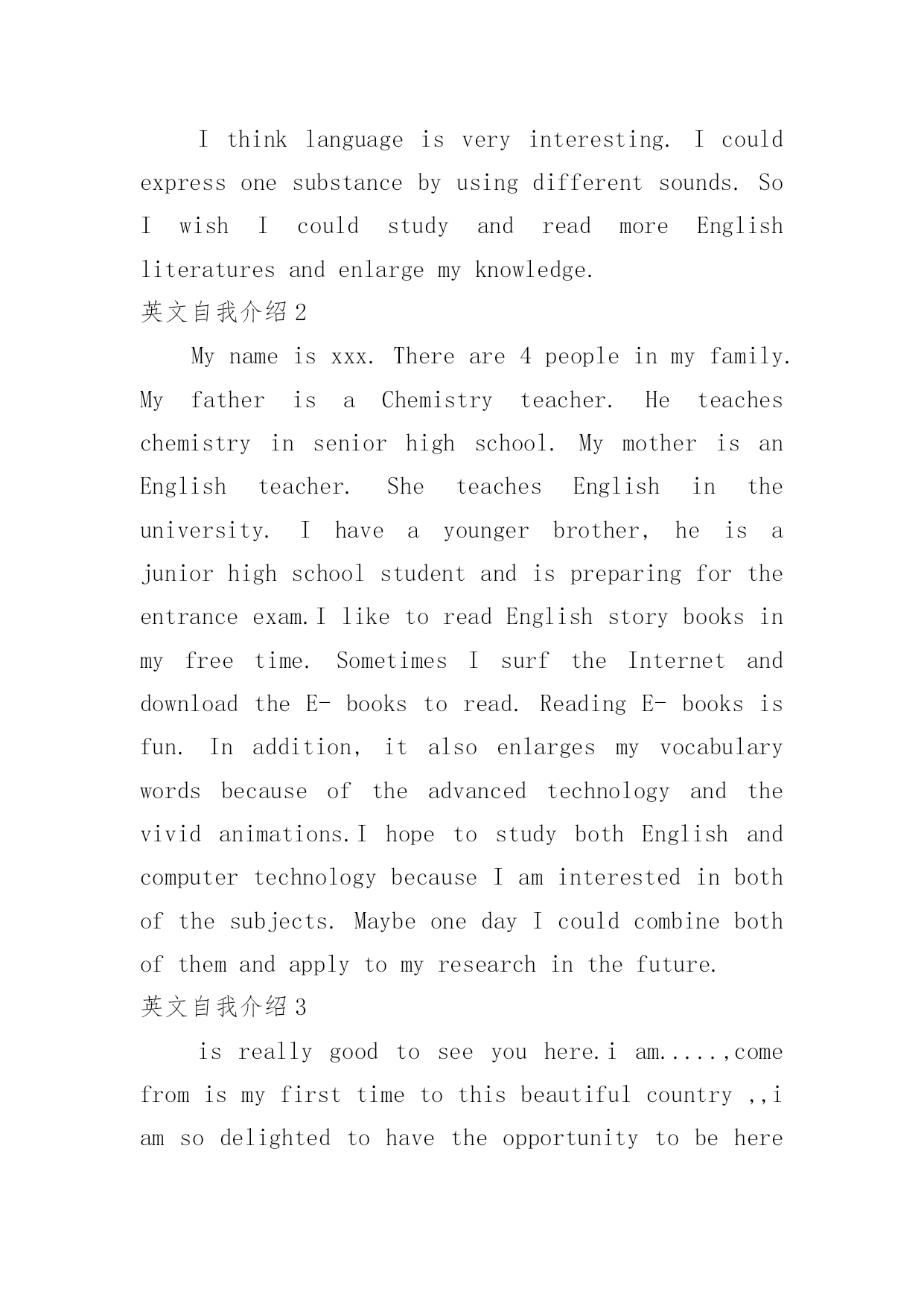 英文自我介绍英文自我介绍来到一个陌生的地方时,我们往往需要进行适当的自我介绍,通过自我介绍可以得到他人的欣赏。写起自我介绍来就毫无头绪?下面是小编帮大家整理的英文自我介绍,欢迎阅读,希望大家能够喜欢。英文自我介绍1Iamxxx.Iwasbornin.IgraduatefromseniorhighschoolandmajorinEnglish.IstartedlearningEnglishsinceIwas12yearsold.MyparentshavealotofAmericanfriends.That'swhyIhavenoproblemcommunicatingwithAmericansorothersbyspeakingEnglish.Inmysparetime,IliketodoanythingrelatingtoEnglishsuchaslisteningtoEnglishsongs,watchingEnglishmoviesorTVprograms,orevenattendingtheactivitiesheldbysomeEnglishclubsorinstitutes.Iusedtogoabroadforashort-termEnglishstudy.Duringthattime,IlearnedalotofdailylifeEnglishandsawalotofdifferentthings.Ithinklanguageisveryinteresting.Icouldexpressonesubstancebyusingdifferentsounds.SoIwishIcouldstudyandreadmoreEnglishliteraturesandenlargemyknowledge.英文自我介绍2Mynameisxxx.Thereare4peopleinmyfamily.MyfatherisaChemistryteacher.Heteacheschemistryinseniorhighschool.MymotherisanEnglishteacher.SheteachesEnglishintheuniversity.Ihaveayoungerbrother,heisajuniorhighschoolstudentandispreparingfortheentranceexam.IliketoreadEnglishstorybooksinmyfreetime.SometimesIsurftheInternetanddownloadtheE-bookstoread.ReadingE-booksisfun.Inaddition,italsoenlargesmyvocabularywordsbecauseoftheadvancedtechnologyandthevividanimations.IhopetostudybothEnglishandcomputertechnologybecauseIaminterestedinbothofthesubjects.MaybeonedayIcouldcombinebothofthemandapplytomyresearchinthefuture.英文自我介绍3isreallygoodtoseeyouhere.iam.....,comefromismyfirsttimetothisbeautifulcountry,,iamsodelightedtohavetheopportunitytobeherewithyouguys.ijustfinishedmystudyinhighschool,andiwouldliketofurthermystudymyenglishisnotthatgood,ineedyourhelpay,ihopewecanenjoyourselvesbeingtogetherkyouGeneralIntroductionIamathirdyearmastermajorinautomationatShanghaiJiaoTongUniversity,P.R.China.WithtremendousinterestinIndustrialEngineering,IamwritingtoapplyforacceptanceintoyourPh.D.graduateprogram.EducationbackgroundIn1995,IenteredtheNanjingUniversityofScience&Technology(NUST)--widelyconsideredoneoftheChina’sbestengineeringschools.Duringt