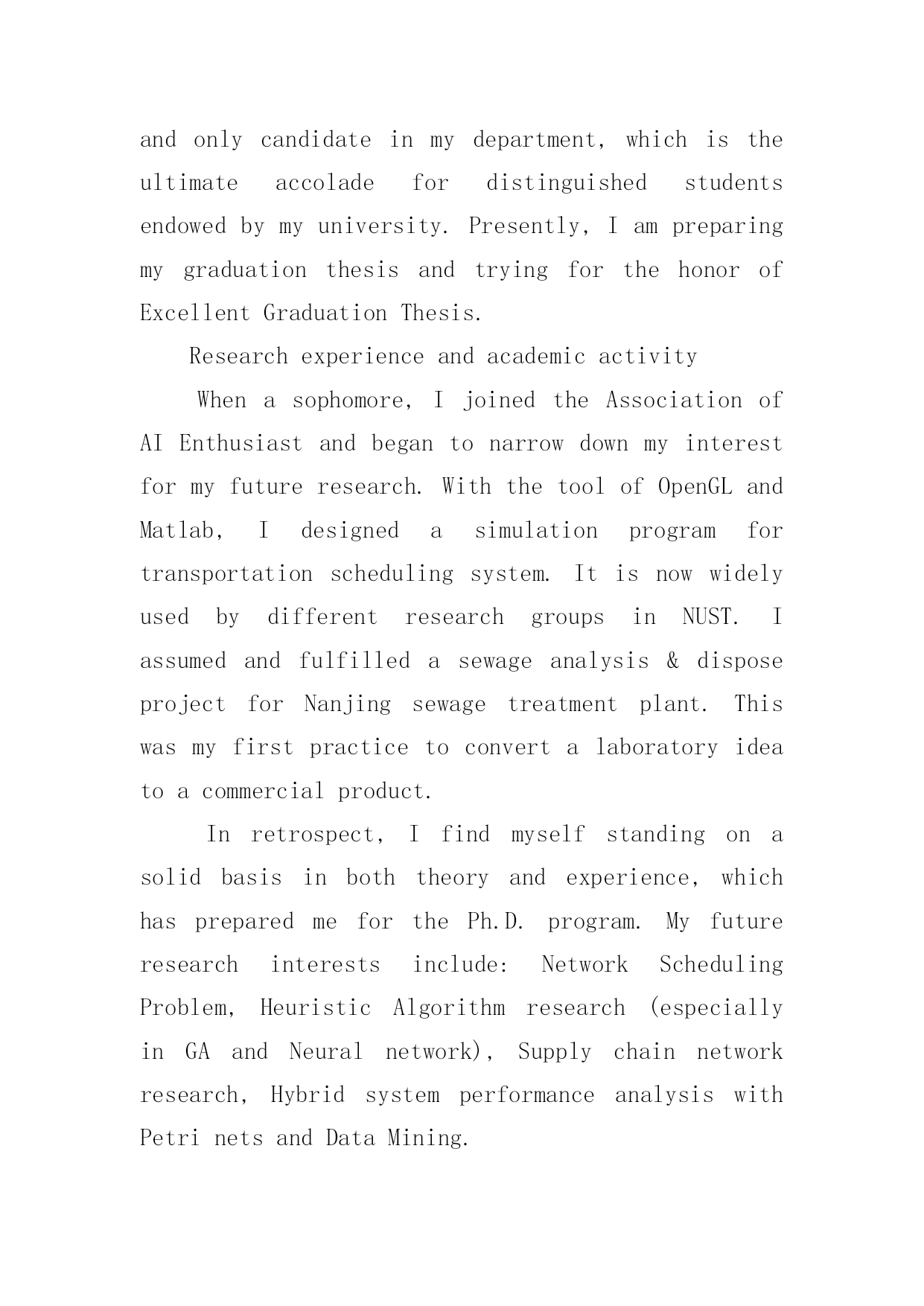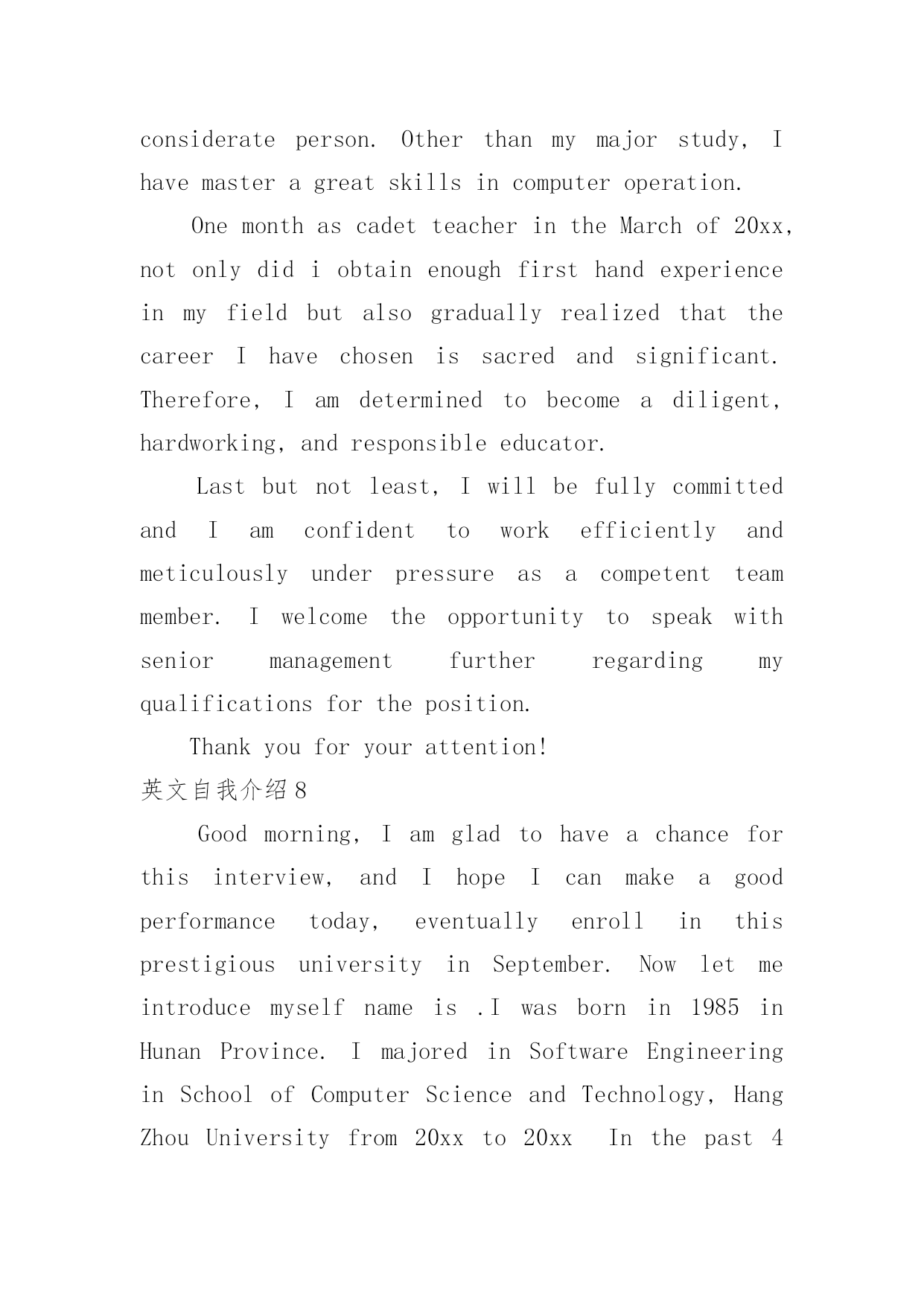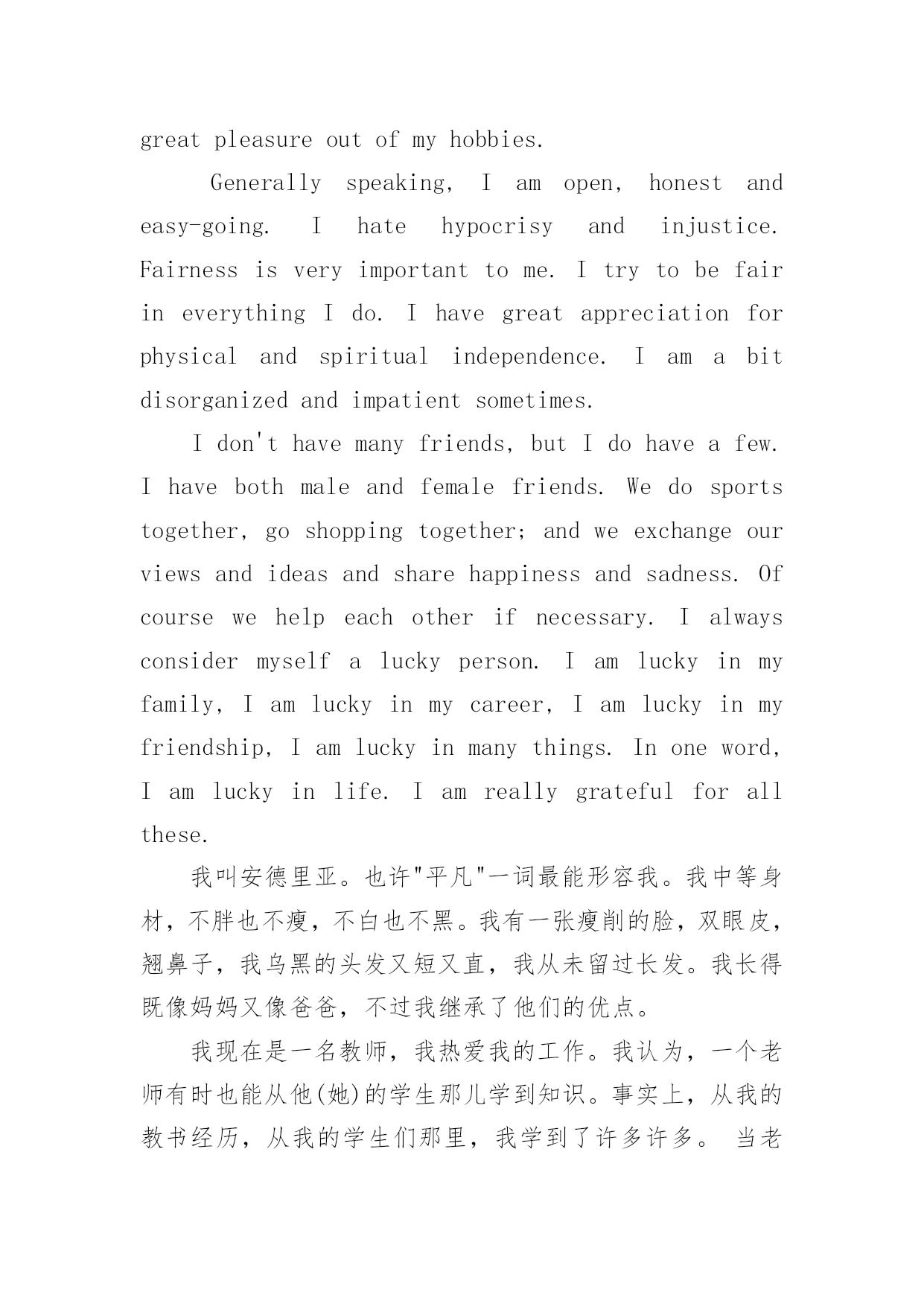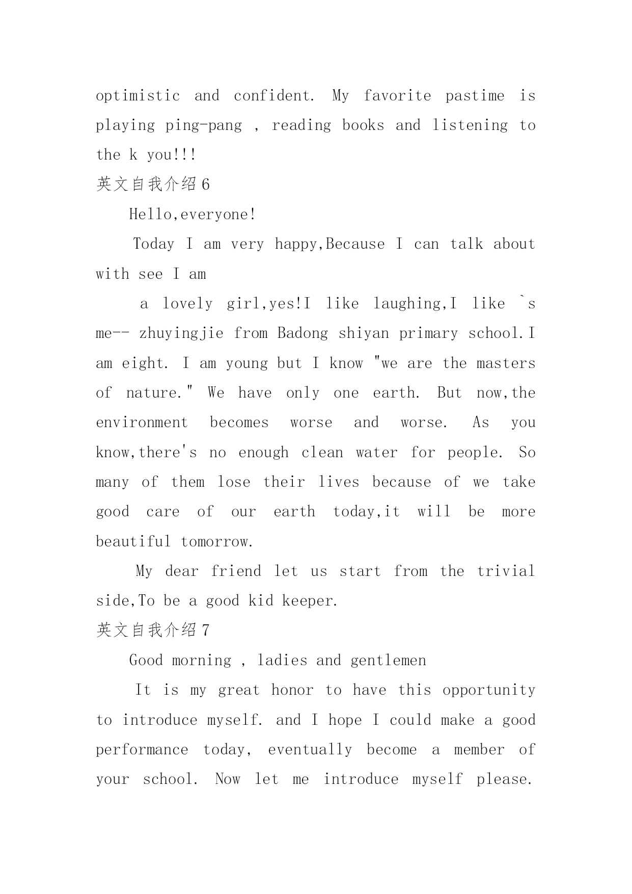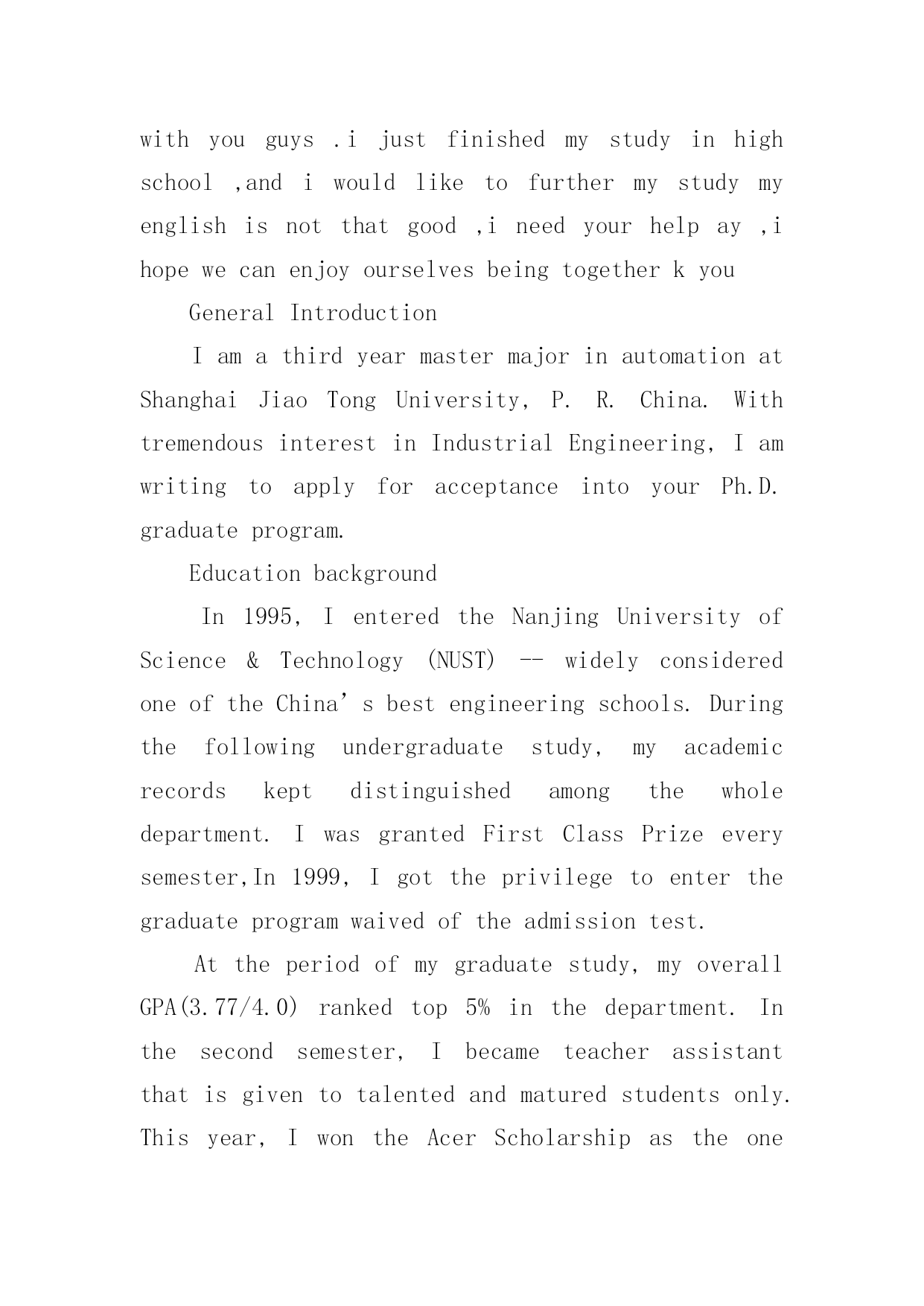 英文自我介绍英文自我介绍来到一个陌生的地方时,我们往往需要进行适当的自我介绍,通过自我介绍可以得到他人的欣赏。写起自我介绍来就毫无头绪?下面是小编帮大家整理的英文自我介绍,欢迎阅读,希望大家能够喜欢。英文自我介绍1Iamxxx.Iwasbornin.IgraduatefromseniorhighschoolandmajorinEnglish.IstartedlearningEnglishsinceIwas12yearsold.MyparentshavealotofAmericanfriends.That'swhyIhavenoproblemcommunicatingwithAmericansorothersbyspeakingEnglish.Inmysparetime,IliketodoanythingrelatingtoEnglishsuchaslisteningtoEnglishsongs,watchingEnglishmoviesorTVprograms,orevenattendingtheactivitiesheldbysomeEnglishclubsorinstitutes.Iusedtogoabroadforashort-termEnglishstudy.Duringthattime,IlearnedalotofdailylifeEnglishandsawalotofdifferentthings.Ithinklanguageisveryinteresting.Icouldexpressonesubstancebyusingdifferentsounds.SoIwishIcouldstudyandreadmoreEnglishliteraturesandenlargemyknowledge.英文自我介绍2Mynameisxxx.Thereare4peopleinmyfamily.MyfatherisaChemistryteacher.Heteacheschemistryinseniorhighschool.MymotherisanEnglishteacher.SheteachesEnglishintheuniversity.Ihaveayoungerbrother,heisajuniorhighschoolstudentandispreparingfortheentranceexam.IliketoreadEnglishstorybooksinmyfreetime.SometimesIsurftheInternetanddownloadtheE-bookstoread.ReadingE-booksisfun.Inaddition,italsoenlargesmyvocabularywordsbecauseoftheadvancedtechnologyandthevividanimations.IhopetostudybothEnglishandcomputertechnologybecauseIaminterestedinbothofthesubjects.MaybeonedayIcouldcombinebothofthemandapplytomyresearchinthefuture.英文自我介绍3isreallygoodtoseeyouhere.iam.....,comefromismyfirsttimetothisbeautifulcountry,,iamsodelightedtohavetheopportunitytobeherewithyouguys.ijustfinishedmystudyinhighschool,andiwouldliketofurthermystudymyenglishisnotthatgood,ineedyourhelpay,ihopewecanenjoyourselvesbeingtogetherkyouGeneralIntroductionIamathirdyearmastermajorinautomationatShanghaiJiaoTongUniversity,P.R.China.WithtremendousinterestinIndustrialEngineering,IamwritingtoapplyforacceptanceintoyourPh.D.graduateprogram.EducationbackgroundIn1995,IenteredtheNanjingUniversityofScience&Technology(NUST)--widelyconsideredoneoftheChina’sbestengineeringschools.Duringt