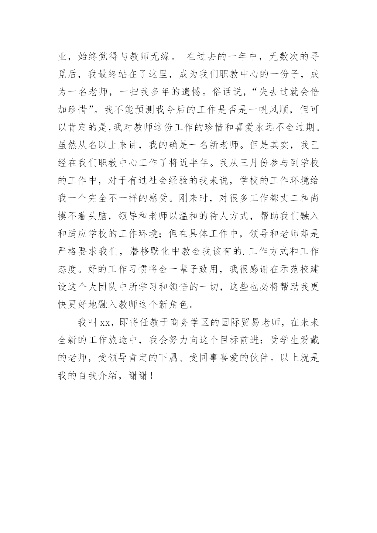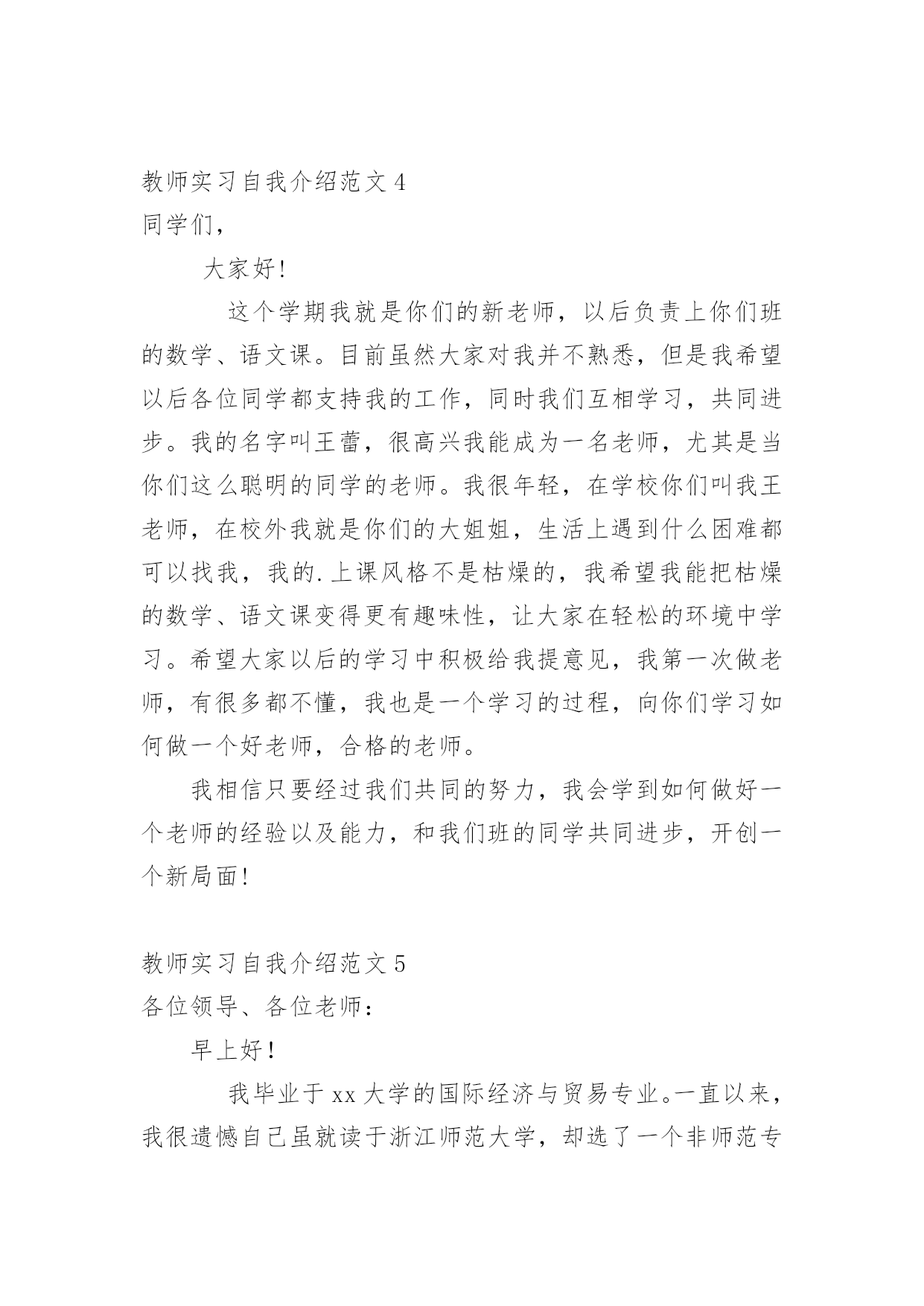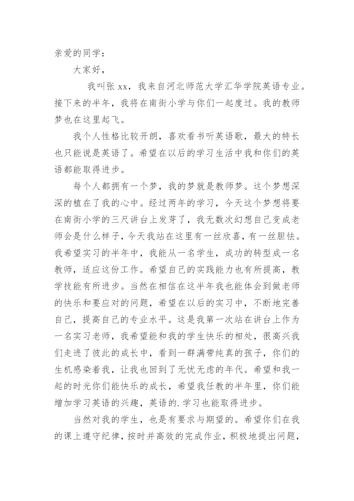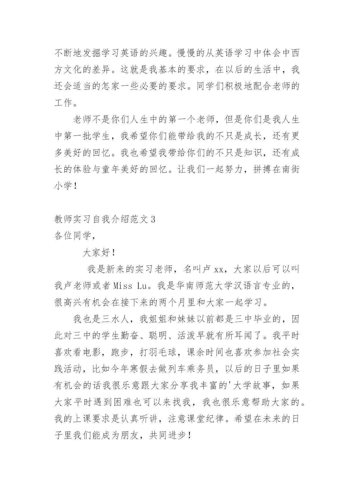 教师实习自我介绍教师实习自我介绍范文当我们在一个陌生场合中,通常需要用到自我介绍,自我介绍可以给陌生人留下一个好的印象。那么自我介绍有什么格式呢?下面是小编精心整理的教师实习自我介绍范文,希望能够帮助到大家。教师实习自我介绍范文1亲爱的宝宝和各位家长朋友:您好!很高兴也很激动能来到红豆豆班!因为我一直希望能够从托班一直带到毕业,现在终于有这样的机会!相信我会很珍惜这个机会!我会尽我自己最大的努力将每一位宝宝带好。全心投入这份爱的'事业与您一起,构筑孩子金色的童年!!我叫xx,20xx年毕业于xx幼儿师范学校。曾就职于xx幼儿园,在幼儿园有6年的工作经验。持有幼儿园教师资格证普通话等级证我希望在以后的日子里,能利用自己在专业上的优势,实施良好的教育,希望能将每一位宝宝培养成全面发展的孩子,当然,也希望能得到各位家长的全力配合和支持!祝各位宝宝身体健康、茁壮成长、天天开心。教师实习自我介绍范文2亲爱的同学:大家好,我叫张xx,我来自河北师范大学汇华学院英语专业。接下来的半年,我将在南街小学与你们一起度过。我的教师梦也在这里起飞。我个人性格比较开朗,喜欢看书听英语歌,最大的特长也只能说是英语了。希望在以后的学习生活中我和你们的英语都能取得进步。每个人都拥有一个梦,我的梦就是教师梦。这个梦想深深的植在了我的心中。经过两年的学习,今天这个梦想将要在南街小学的三尺讲台上发芽了,我无数次幻想自己变成老师会是什么样子,今天我站在这里有一丝欣喜,有一丝胆怯。我希望实习的半年中,我能从一名学生,成功的转型成一名教师,适应这份工作。希望自己的实践能力也有所提高,教学技能有所进步。当然在相信在这半年我也能体会到做老师的快乐和要应对的问题,希望在以后的实习中,不断地完善自己,提高自己的专业水平。这是我第一次站在讲台上作为一名实习老师,我希望能和我的学生快乐的相处,很高兴我们走进了彼此的成长中,看到一群满带纯真的孩子,你们的生机感染着我,让我也回到了无忧无虑的年代。希望和我一起的时光你们能快乐的成长,希望我任教的半年里,你们能增加学习英语的兴趣,英语的.学习也能取得进步。当然对我的学生,也是有要求与期望的。希望你们在我的课上遵守纪律,按时并高效的完成作业,积极地提出问题,不断地发掘学习英语的兴趣。慢慢的从英语学习中体会中西方文化的差异。这就是我基本的要求,在以后的生活中,我还会适当的怎家一些必要的要求。同学们积极地配合老师的工作。老师不是你们人生中的第一个老师,但是你们是我人生中第一批学生,我希望你们能带给我的不只是成长,还有更多美好的回忆。我也希望我带给你们的不只是知识,还有成长的体验与童年美好的回忆。让我们一起努力,拼搏在南街小学!教师实习自我介绍范文3各位同学,大家好!我是新来的实习老师,名叫卢xx,大家以后可以叫我卢老师或者MissLu。我是华南师范大学汉语言专业的,很高兴有机会在接下来的两个月里和大家一起学习。我也是三水人,我姐姐和妹妹以前都是三中毕业的,因此对三中的学生勤奋、聪明、活泼早就有所耳闻了。我平时喜欢看电影,跑步,打羽毛球,课余时间也喜欢参加社会实践活动,比如今年寒假去做列车乘务员,以后的日子里如果有机会的话我很乐意跟大家分享我丰富的'大学故事,如果大家平时遇到困难也可以来找我,我也很乐意帮助大家的。我的上课要求是认真听讲,注意课堂纪律。希望在未来的日子里我们能成为朋友,共同进步!教师实习自我介绍范文4同学们,大家好!这个学期我就是你们的新老师,以后负责上你们班的数学、语文课。目前虽然大家对我并不熟悉,但是我希望以后各位同学都支持我的工作,同时我们互相学习,共同进步。我的名字叫王蕾,很高兴我能成为一名老师,尤其是当你们这么聪明的同学的老师。我很年轻,在学校你们叫我王老师,在校外我就是你们的大姐姐,生活上遇到什么困难都可以找我,我的.上课风格不是枯燥的,我希望我能把枯燥的数学、语文课变得更有趣味性,让大家在轻松的环境中学习。希望大家以后的学习中积极给我提意见,我第一次做老师,有很多都不懂,我也是一个学习的过程,向你们学习如何做一个好老师,合格的老师。我相信只要经过我们共同的努力,我会学到如何做好一个老师的经验以及能力,和我们班的同学共同进步,开创一个新局面!教师实习自我介绍范文5各位领导、各位老师:早上好!我毕业于xx大学的国际经济与贸易专业。一直以来,我很遗憾自己虽就读于浙江师范大学,却选了一个非师范专业,始终觉得与教师无缘。在过去的一年中,无数次的寻觅后,我最终站在了这里,成为我们职教中心的一份子,成为一名老师,一扫我多年的遗憾。俗话说,“失去过就会倍加珍惜”。我不能预测我今后的工作是否是一帆风顺,但可以肯定的是,我对教师这份工作的珍惜和喜爱永远不会过期。虽然从名以上来讲,我的确是一名新老师。但是其实,我已经在我们职教中心工作