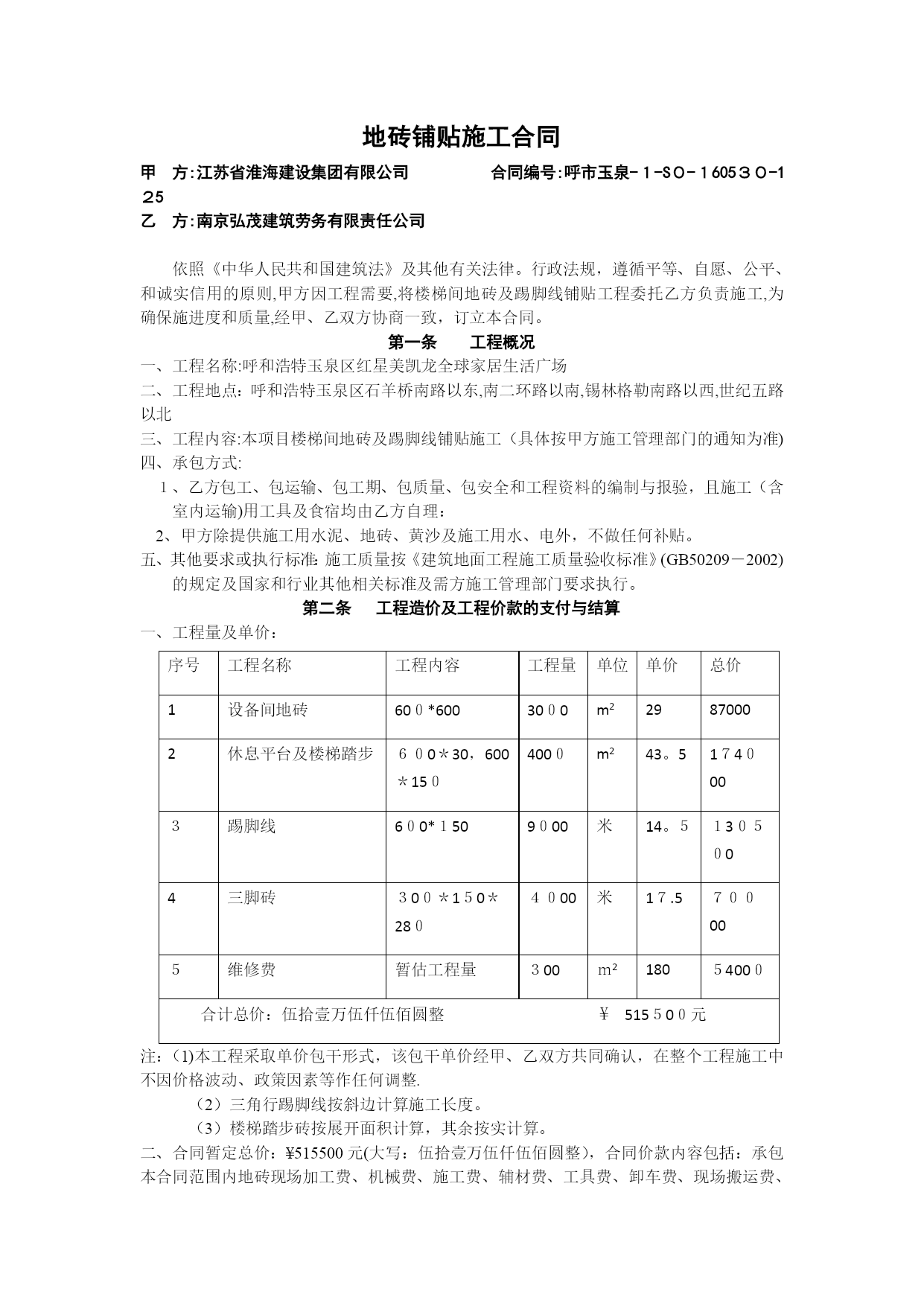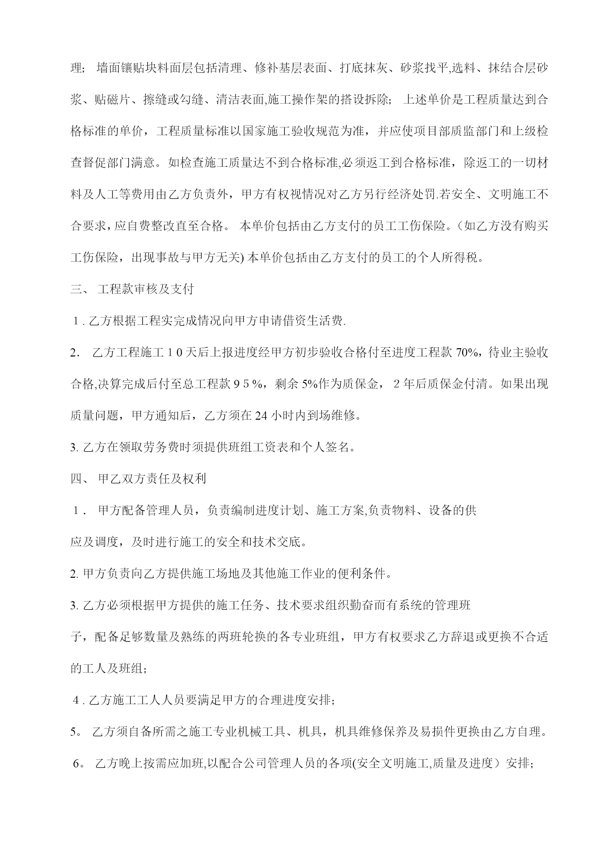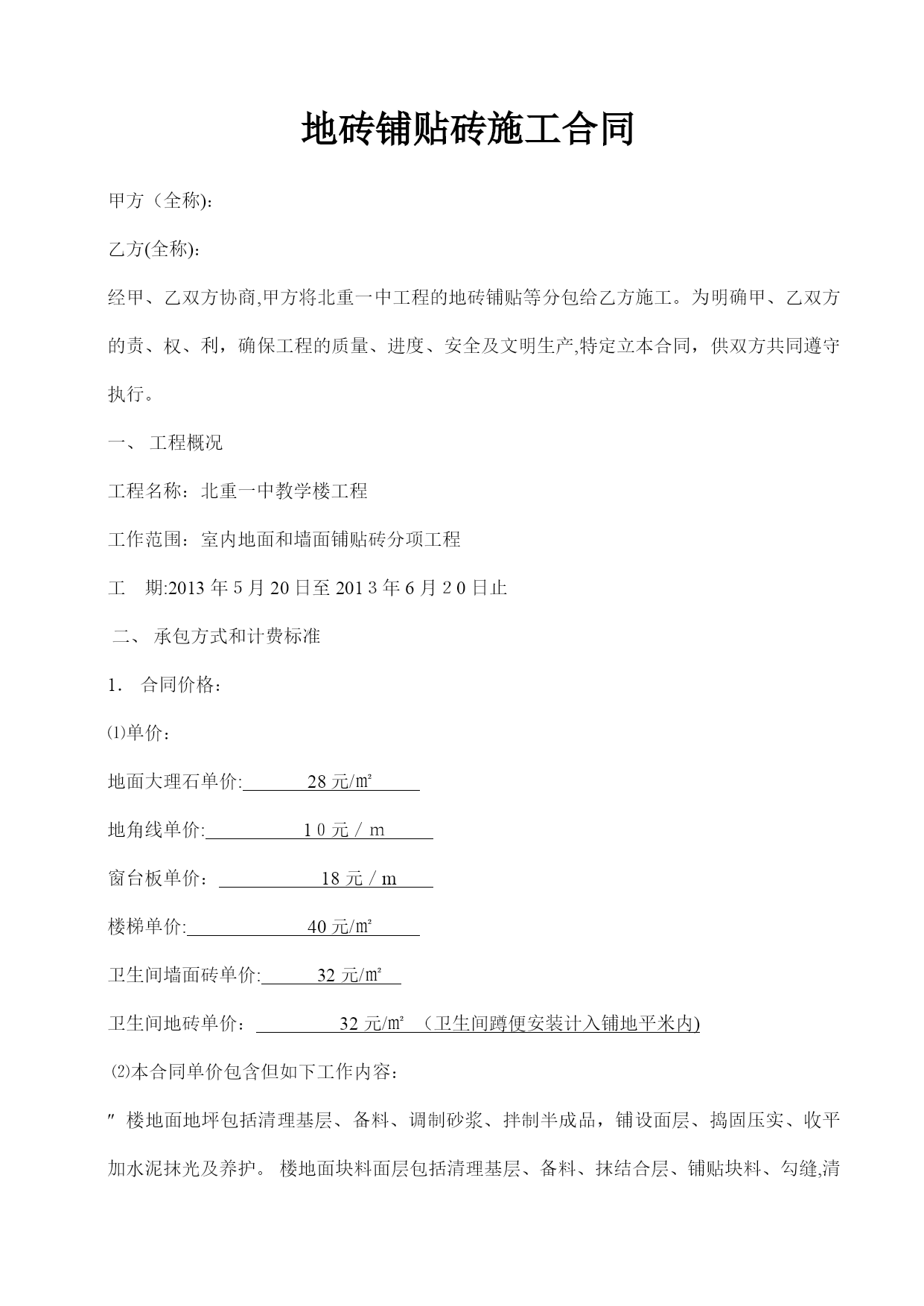 地砖铺贴砖施工合同(完整资料)(可以直接使用,可编辑优秀版资料,欢迎下载)地砖铺贴砖施工合同甲方(全称):乙方(全称):经甲、乙双方协商,甲方将北重一中工程的地砖铺贴等分包给乙方施工。为明确甲、乙双方的责、权、利,确保工程的质量、进度、安全及文明生产,特定立本合同,供双方共同遵守执行。一、工程概况工程名称:北重一中教学楼工程工作范围:室内地面和墙面铺贴砖分项工程工期:2013年5月20日至2013年6月20日止二、承包方式和计费标准1.合同价格:⑴单价:地面大理石单价:28元/㎡地角线单价:10元/m窗台板单价:18元/m楼梯单价:40元/㎡卫生间墙面砖单价:32元/㎡卫生间地砖单价:32元/㎡(卫生间蹲便安装计入铺地平米内)⑵本合同单价包含但如下工作内容:楼地面地坪包括清理基层、备料、调制砂浆、拌制半成品,铺设面层、捣固压实、收平加水泥抹光及养护。楼地面块料面层包括清理基层、备料、抹结合层、铺贴块料、勾缝,清理;墙面镶贴块料面层包括清理、修补基层表面、打底抹灰、砂浆找平,选料、抹结合层砂浆、贴磁片、擦缝或勾缝、清洁表面,施工操作架的搭设拆除;上述单价是工程质量达到合格标准的单价,工程质量标准以国家施工验收规范为准,并应使项目部质监部门和上级检查督促部门满意。如检查施工质量达不到合格标准,必须返工到合格标准,除返工的一切材料及人工等费用由乙方负责外,甲方有权视情况对乙方另行经济处罚.若安全、文明施工不合要求,应自费整改直至合格。本单价包括由乙方支付的员工工伤保险。(如乙方没有购买工伤保险,出现事故与甲方无关)本单价包括由乙方支付的员工的个人所得税。三、工程款审核及支付1.乙方根据工程实完成情况向甲方申请借资生活费.2.乙方工程施工10天后上报进度经甲方初步验收合格付至进度工程款70%,待业主验收合格,决算完成后付至总工程款95%,剩余5%作为质保金,2年后质保金付清。如果出现质量问题,甲方通知后,乙方须在24小时内到场维修。乙方在领取劳务费时须提供班组工资表和个人签名。四、甲乙双方责任及权利1.甲方配备管理人员,负责编制进度计划、施工方案,负责物料、设备的供应及调度,及时进行施工的安全和技术交底。2.甲方负责向乙方提供施工场地及其他施工作业的便利条件。3.乙方必须根据甲方提供的施工任务、技术要求组织勤奋而有系统的管理班子,配备足够数量及熟练的两班轮换的各专业班组,甲方有权要求乙方辞退或更换不合适的工人及班组;4.乙方施工工人人员要满足甲方的合理进度安排;5。乙方须自备所需之施工专业机械工具、机具,机具维修保养及易损件更换由乙方自理。6。乙方晚上按需应加班,以配合公司管理人员的各项(安全文明施工,质量及进度)安排;7。乙方有义务对交叉施工的其他班组进行配合,为其提供工作面及其他施工之便利条件;8。乙方必须服从甲方管理人员在安全、技术、进度、材料、劳动力、文明施工等诸方面的安排,保证工完场清,达到公司有关文明生产的要求;若乙方拒绝或漠视甲方对文明施工的要求,甲方可安排工人另行完成,费用由乙方承担。9。乙方在施工期间应合理用材、节约用材,各种材料的损耗应控制在1。5--2%以内.如超出规定范围应在乙方工程款中扣除,如控制在2%以下给予奖励。10.乙方工人施工期间患病、因病身亡或残废等费用由乙方自理.五、工期、质量及安全生产工期为2013年6月10日之前全面完工(按需满足甲方赶工要求),如因乙方劳动力不足、组织不力等因素影响工期,甲方可予以经济处罚。2.若乙方不能增加工人,甲方可联系另外队伍进场施工,由此发生的一切费用(含额外增加费用)由乙方承担。3.乙方须确保工程质量达到合格标准,若乙方在施工过程中出现质量问题,除无偿返工和赔偿材料损失外,甲方也有权予以经济处罚.若造成重大质量事故,甲方有权取消合同且对乙方已完成施工量不予结算,以赔偿损失。4。乙方开始任何一个分项施工前须先进行样板施工,若样板施工达不到质量标准(或合同约定标准),则乙方不得进行下一步施工;5.施工过程中,乙方应随时接受甲方的检查,发现施工质量不符合要求的应及时整改;6。乙方应切实加强安全生产管理,确保达到甲方的安全生产责任目标要求,否则甲方有权依据相关规定予以处罚。《安全生产责任管理目标》及《安全生产责任目标管理分解》详见)六、治安文明管理1.乙方须对其所有工人的治安负完全责任,若发生打架斗殴或其他刑事案件,其后果与甲方无关.同时甲方可根据《安全文明施工条例》和肇事者对工地造成直接或间接损失情况,对乙方予以经济处罚。2.乙方须对工人进行现场文明教育,包括宿舍内和施工场地的清洁卫生、大小便等方面的规定;若有发生,甲方可根据《安全文明施工条例》中的有关条款予以处罚。