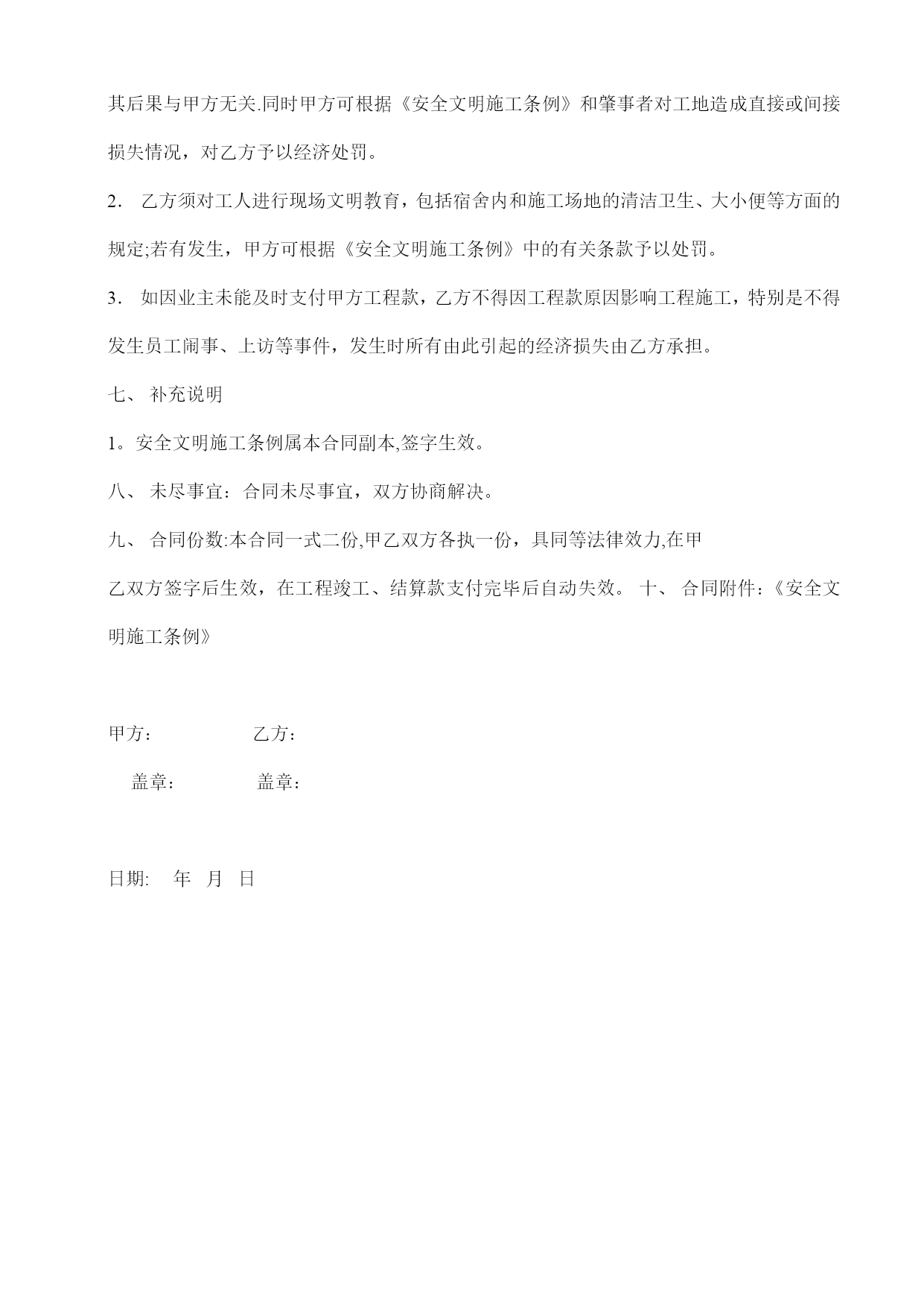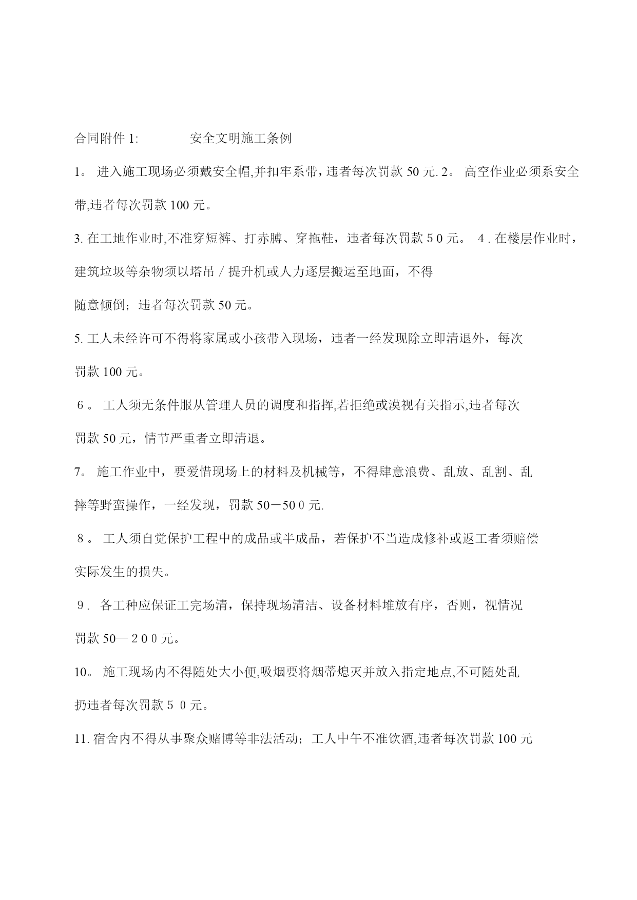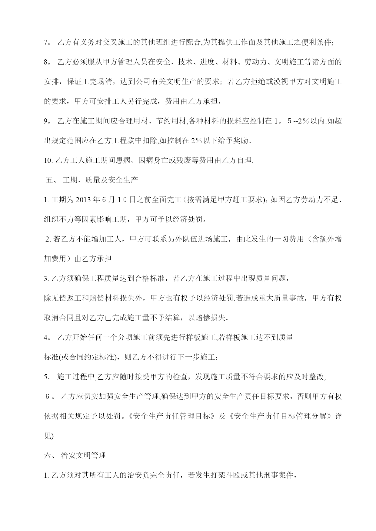 地砖铺贴砖施工合同(完整资料)(可以直接使用,可编辑优秀版资料,欢迎下载)地砖铺贴砖施工合同甲方(全称):乙方(全称):经甲、乙双方协商,甲方将北重一中工程的地砖铺贴等分包给乙方施工。为明确甲、乙双方的责、权、利,确保工程的质量、进度、安全及文明生产,特定立本合同,供双方共同遵守执行。一、工程概况工程名称:北重一中教学楼工程工作范围:室内地面和墙面铺贴砖分项工程工期:2013年5月20日至2013年6月20日止二、承包方式和计费标准1.合同价格:⑴单价:地面大理石单价:28元/㎡地角线单价:10元/m窗台板单价:18元/m楼梯单价:40元/㎡卫生间墙面砖单价:32元/㎡卫生间地砖单价:32元/㎡(卫生间蹲便安装计入铺地平米内)⑵本合同单价包含但如下工作内容:楼地面地坪包括清理基层、备料、调制砂浆、拌制半成品,铺设面层、捣固压实、收平加水泥抹光及养护。楼地面块料面层包括清理基层、备料、抹结合层、铺贴块料、勾缝,清理;墙面镶贴块料面层包括清理、修补基层表面、打底抹灰、砂浆找平,选料、抹结合层砂浆、贴磁片、擦缝或勾缝、清洁表面,施工操作架的搭设拆除;上述单价是工程质量达到合格标准的单价,工程质量标准以国家施工验收规范为准,并应使项目部质监部门和上级检查督促部门满意。如检查施工质量达不到合格标准,必须返工到合格标准,除返工的一切材料及人工等费用由乙方负责外,甲方有权视情况对乙方另行经济处罚.若安全、文明施工不合要求,应自费整改直至合格。本单价包括由乙方支付的员工工伤保险。(如乙方没有购买工伤保险,出现事故与甲方无关)本单价包括由乙方支付的员工的个人所得税。三、工程款审核及支付1.乙方根据工程实完成情况向甲方申请借资生活费.2.乙方工程施工10天后上报进度经甲方初步验收合格付至进度工程款70%,待业主验收合格,决算完成后付至总工程款95%,剩余5%作为质保金,2年后质保金付清。如果出现质量问题,甲方通知后,乙方须在24小时内到场维修。乙方在领取劳务费时须提供班组工资表和个人签名。四、甲乙双方责任及权利1.甲方配备管理人员,负责编制进度计划、施工方案,负责物料、设备的供应及调度,及时进行施工的安全和技术交底。2.甲方负责向乙方提供施工场地及其他施工作业的便利条件。3.乙方必须根据甲方提供的施工任务、技术要求组织勤奋而有系统的管理班子,配备足够数量及熟练的两班轮换的各专业班组,甲方有权要求乙方辞退或更换不合适的工人及班组;4.乙方施工工人人员要满足甲方的合理进度安排;5。乙方须自备所需之施工专业机械工具、机具,机具维修保养及易损件更换由乙方自理。6。乙方晚上按需应加班,以配合公司管理人员的各项(安全文明施工,质量及进度)安排;7。乙方有义务对交叉施工的其他班组进行配合,为其提供工作面及其他施工之便利条件;8。乙方必须服从甲方管理人员在安全、技术、进度、材料、劳动力、文明施工等诸方面的安排,保证工完场清,达到公司有关文明生产的要求;若乙方拒绝或漠视甲方对文明施工的要求,甲方可安排工人另行完成,费用由乙方承担。9。乙方在施工期间应合理用材、节约用材,各种材料的损耗应控制在1。5--2%以内.如超出规定范围应在乙方工程款中扣除,如控制在2%以下给予奖励。10.乙方工人施工期间患病、因病身亡或残废等费用由乙方自理.五、工期、质量及安全生产工期为2013年6月10日之前全面完工(按需满足甲方赶工要求),如因乙方劳动力不足、组织不力等因素影响工期,甲方可予以经济处罚。2.若乙方不能增加工人,甲方可联系另外队伍进场施工,由此发生的一切费用(含额外增加费用)由乙方承担。3.乙方须确保工程质量达到合格标准,若乙方在施工过程中出现质量问题,除无偿返工和赔偿材料损失外,甲方也有权予以经济处罚.若造成重大质量事故,甲方有权取消合同且对乙方已完成施工量不予结算,以赔偿损失。4。乙方开始任何一个分项施工前须先进行样板施工,若样板施工达不到质量标准(或合同约定标准),则乙方不得进行下一步施工;5.施工过程中,乙方应随时接受甲方的检查,发现施工质量不符合要求的应及时整改;6。乙方应切实加强安全生产管理,确保达到甲方的安全生产责任目标要求,否则甲方有权依据相关规定予以处罚。《安全生产责任管理目标》及《安全生产责任目标管理分解》详见)六、治安文明管理1.乙方须对其所有工人的治安负完全责任,若发生打架斗殴或其他刑事案件,其后果与甲方无关.同时甲方可根据《安全文明施工条例》和肇事者对工地造成直接或间接损失情况,对乙方予以经济处罚。2.乙方须对工人进行现场文明教育,包括宿舍内和施工场地的清洁卫生、大小便等方面的规定;若有发生,甲方可根据《安全文明施工条例》中的有关条款予以处罚。
