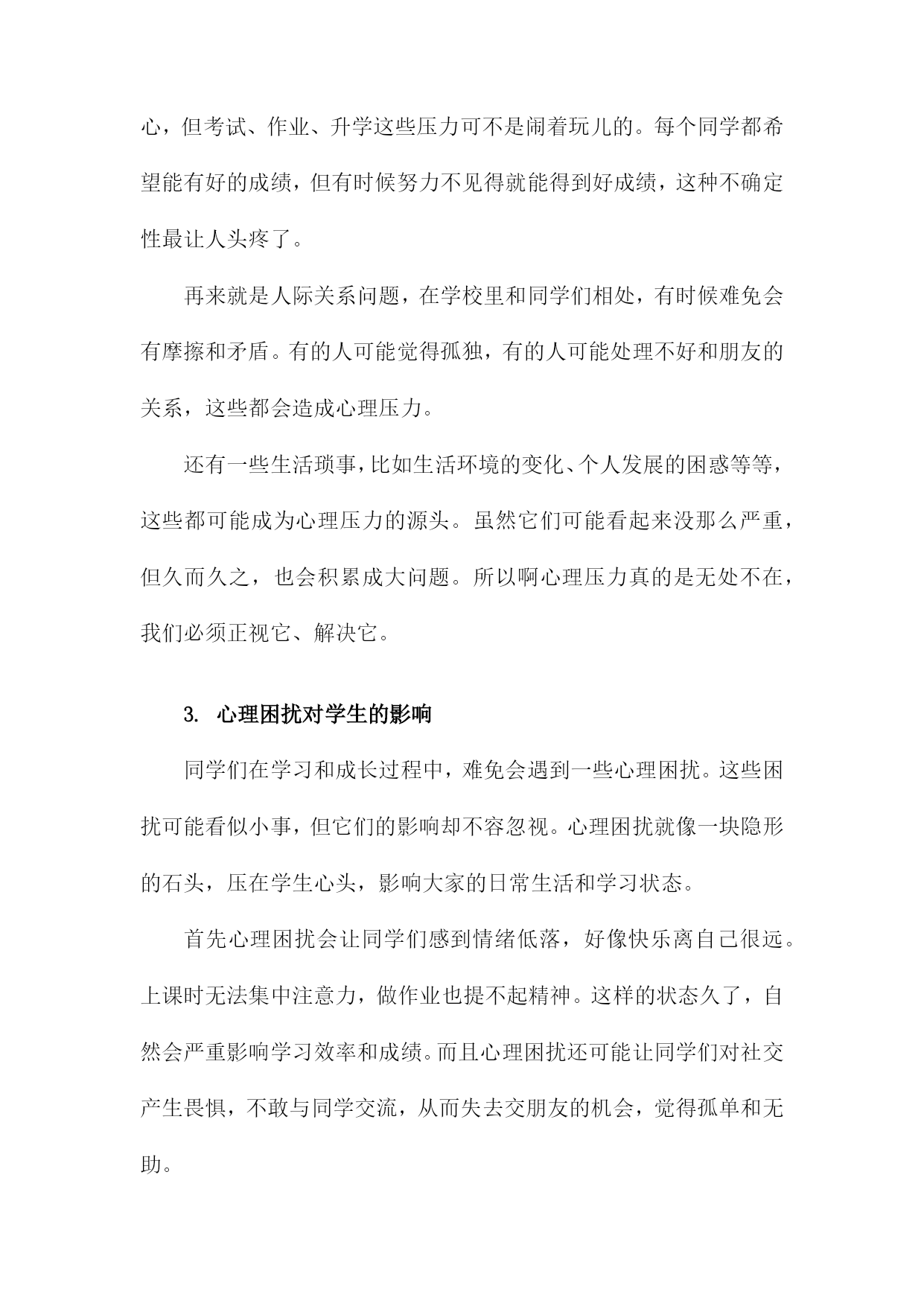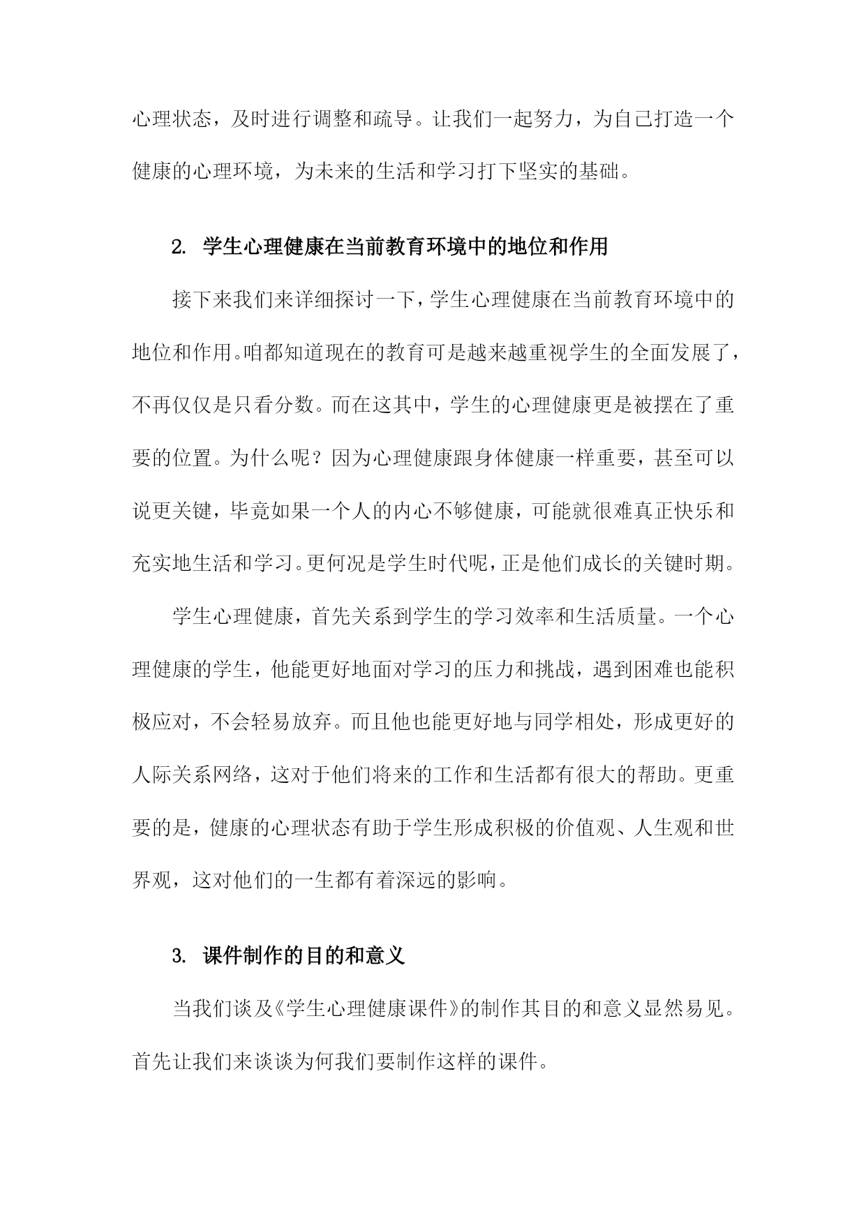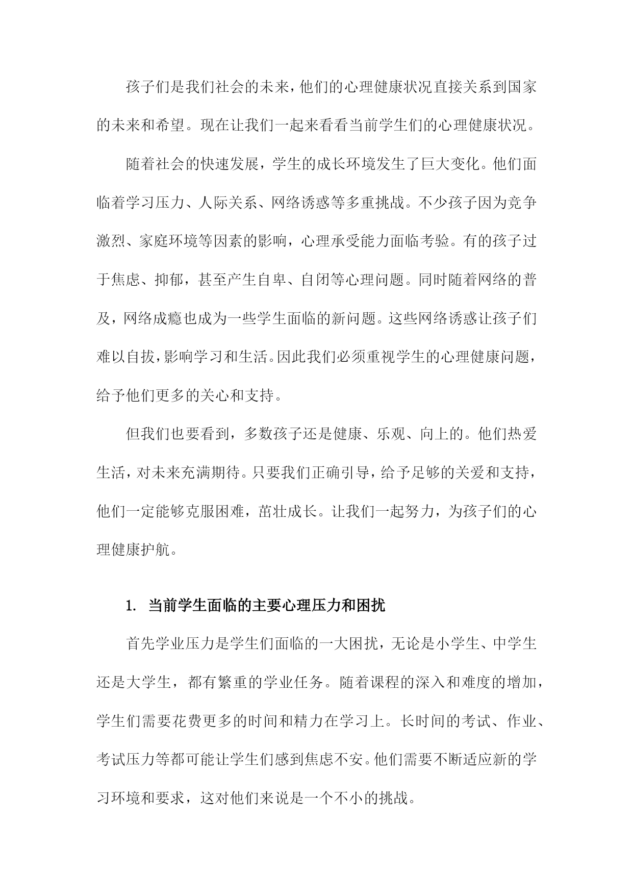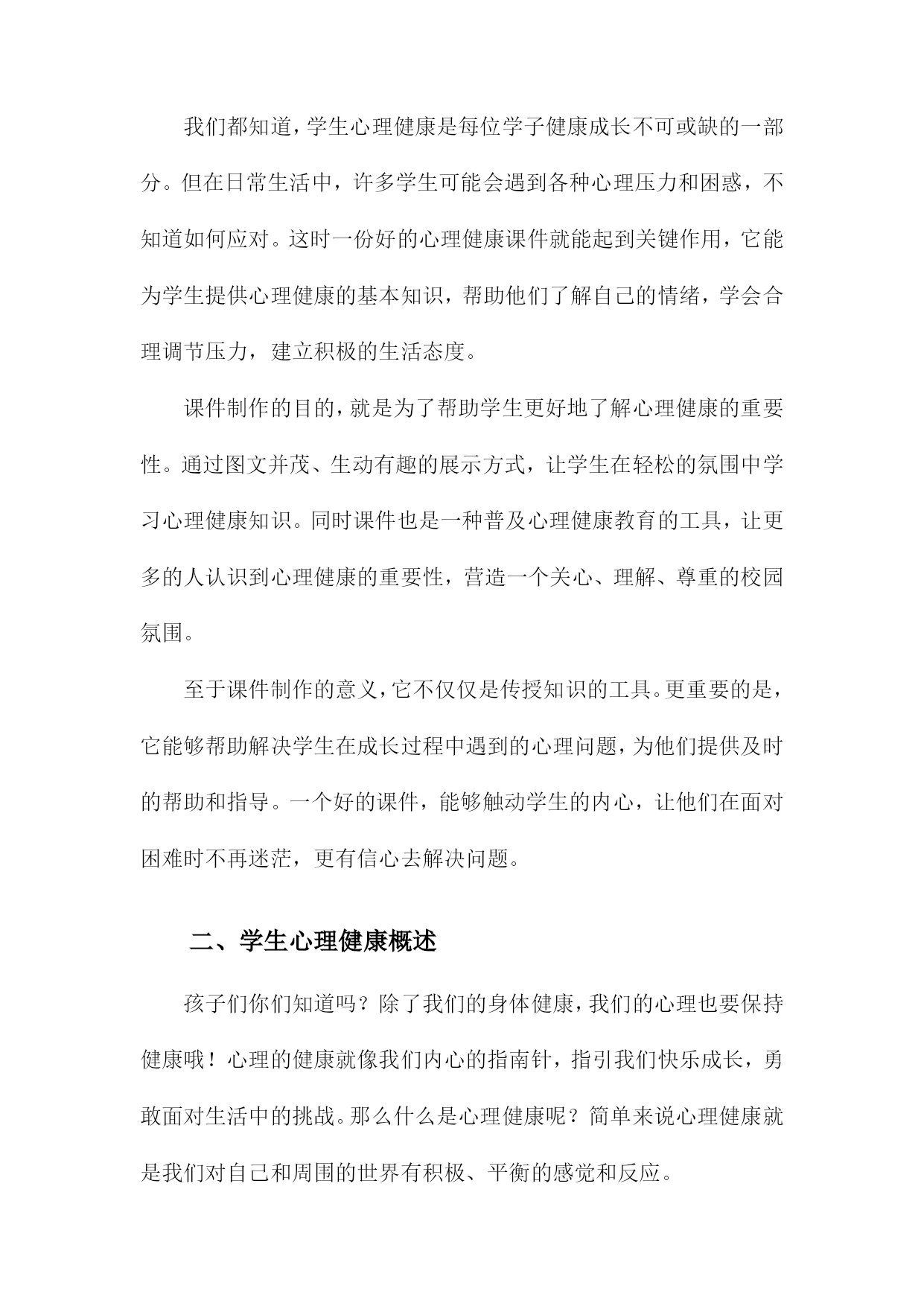 学生心理健康课件一、综述现在的孩子们面临着各种各样的压力,比如学业压力、人际关系压力,还有网络世界的诱惑等等。这些压力和挑战,有时候会让他们感到困惑、焦虑甚至沮丧。所以了解心理健康知识,学会调整心态,对每一个孩子来说都是非常必要的。1.介绍学生心理健康的重要性我们都知道,健康不仅仅是身体上没有疾病,还包括了心理的平衡与和谐。对于正在成长中的学生来说,心理健康的重要性更是不可忽视。想象一下如果我们的心灵像一座房子,那么心理健康就是这座房子的地基。只有地基打得好,房子才能稳稳地立在风雨中。学生们正处在人生中最具活力和探索精神的阶段,也是心理成长和性格形成的关键时期。学习压力、人际关系、自我认知等问题都可能影响到我们的心理状态。一个健康的心理状态能帮助我们更好地面对生活中的挑战,更有效地学习新知识,更积极地融入集体和社会。反之如果心理健康出现问题,可能会影响到我们的日常生活、学习和未来的成长。所以我们要像重视身体健康一样重视心理健康,时刻关注自己的心理状态,及时进行调整和疏导。让我们一起努力,为自己打造一个健康的心理环境,为未来的生活和学习打下坚实的基础。2.学生心理健康在当前教育环境中的地位和作用接下来我们来详细探讨一下,学生心理健康在当前教育环境中的地位和作用。咱都知道现在的教育可是越来越重视学生的全面发展了,不再仅仅是只看分数。而在这其中,学生的心理健康更是被摆在了重要的位置。为什么呢?因为心理健康跟身体健康一样重要,甚至可以说更关键,毕竟如果一个人的内心不够健康,可能就很难真正快乐和充实地生活和学习。更何况是学生时代呢,正是他们成长的关键时期。学生心理健康,首先关系到学生的学习效率和生活质量。一个心理健康的学生,他能更好地面对学习的压力和挑战,遇到困难也能积极应对,不会轻易放弃。而且他也能更好地与同学相处,形成更好的人际关系网络,这对于他们将来的工作和生活都有很大的帮助。更重要的是,健康的心理状态有助于学生形成积极的价值观、人生观和世界观,这对他们的一生都有着深远的影响。3.课件制作的目的和意义当我们谈及《学生心理健康课件》的制作其目的和意义显然易见。首先让我们来谈谈为何我们要制作这样的课件。我们都知道,学生心理健康是每位学子健康成长不可或缺的一部分。但在日常生活中,许多学生可能会遇到各种心理压力和困惑,不知道如何应对。这时一份好的心理健康课件就能起到关键作用,它能为学生提供心理健康的基本知识,帮助他们了解自己的情绪,学会合理调节压力,建立积极的生活态度。课件制作的目的,就是为了帮助学生更好地了解心理健康的重要性。通过图文并茂、生动有趣的展示方式,让学生在轻松的氛围中学习心理健康知识。同时课件也是一种普及心理健康教育的工具,让更多的人认识到心理健康的重要性,营造一个关心、理解、尊重的校园氛围。至于课件制作的意义,它不仅仅是传授知识的工具。更重要的是,它能够帮助解决学生在成长过程中遇到的心理问题,为他们提供及时的帮助和指导。一个好的课件,能够触动学生的内心,让他们在面对困难时不再迷茫,更有信心去解决问题。二、学生心理健康概述孩子们你们知道吗?除了我们的身体健康,我们的心理也要保持健康哦!心理的健康就像我们内心的指南针,指引我们快乐成长,勇敢面对生活中的挑战。那么什么是心理健康呢?简单来说心理健康就是我们对自己和周围的世界有积极、平衡的感觉和反应。在学校里我们可能会遇到很多挑战,比如学习压力、和朋友相处的问题,甚至是一些小小的烦恼。这些都是正常的,因为我们正处在成长的过程中。但是如果我们能够保持良好的心理状态,就能更好地面对这些挑战,找到解决问题的方法。心理健康对我们来说非常重要,它影响我们的情绪、思维和行为,让我们感到快乐、自信和有活力。当我们心理健康时,我们可以更好地学习新知识,和朋友们愉快地相处,面对困难时也更加勇敢。所以孩子们,我们要重视我们的心理健康,像关注我们的身体健康一样。让我们一起学习如何保持心理健康,快乐成长吧!1.心理健康的定义首先心理健康是一种状态,就是我们每天都能保持一个良好的心态,面对生活中的各种挑战和困难时,我们能够积极应对,而不是消极退缩。比如在学习上遇到难题时,我们能保持冷静,积极寻找解决方法;在和朋友发生矛盾时,我们能够冷静沟通,寻求和解。这些表现都说明我们的心理是健康的。另外心理健康也代表着对自己和他人的认识和态度是积极的,这意味着我们能够正确认识自己的优点和不足,也能接纳和尊重他人。不会过于自卑或自负,也不会轻易贬低或伤害他人。这种健康的心理状态,不仅让我们自己过得更好,也能让我们和周围的人都感受到更多的温暖和爱。所以嘛心理健康不只是我们自己的事儿,还关乎我们与他人的关系呢。总的来说呢,心理健康就是一种让我们感到快乐、有自信、能够积极面对生活的状