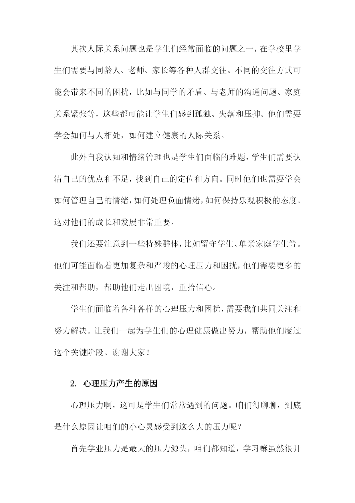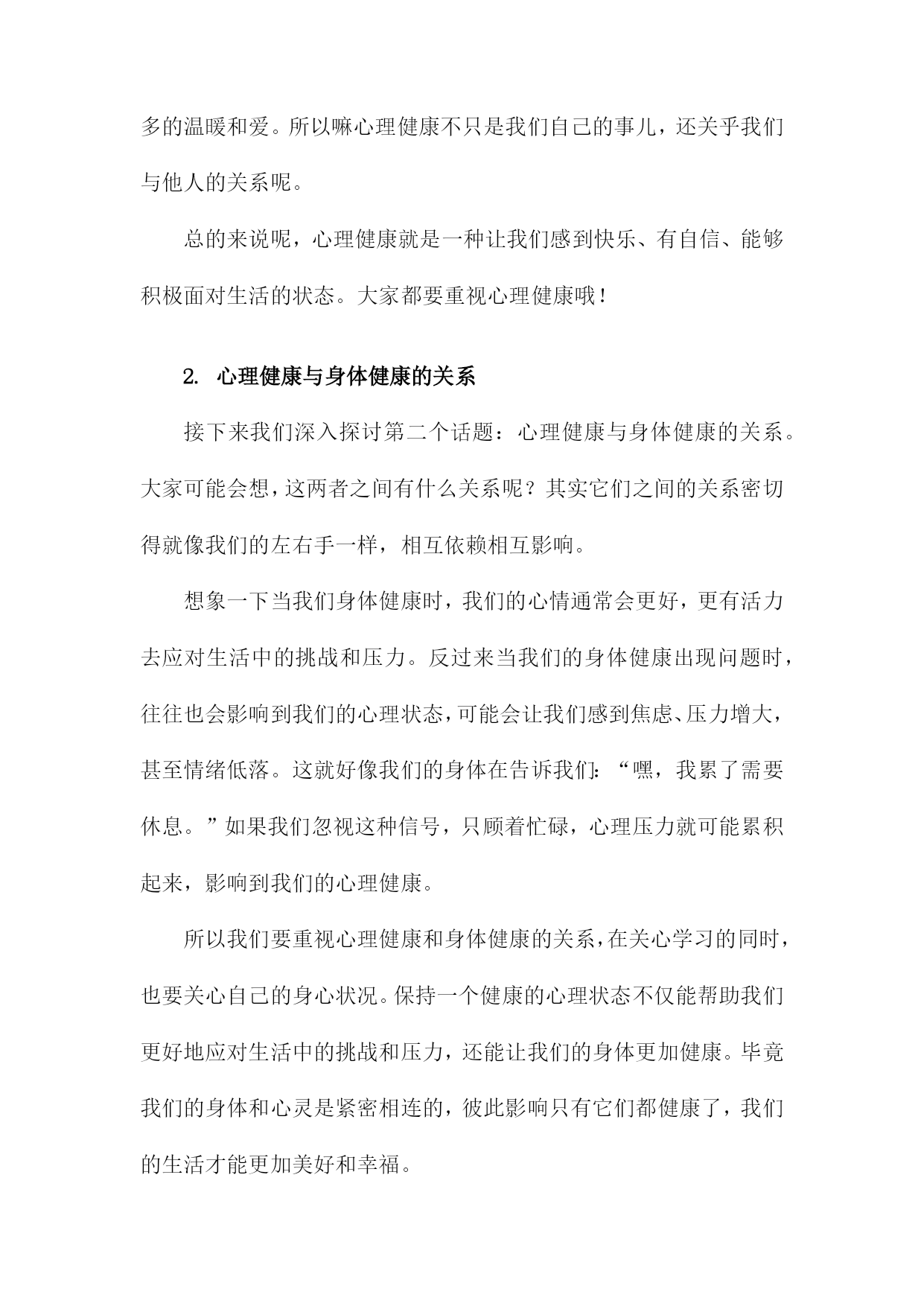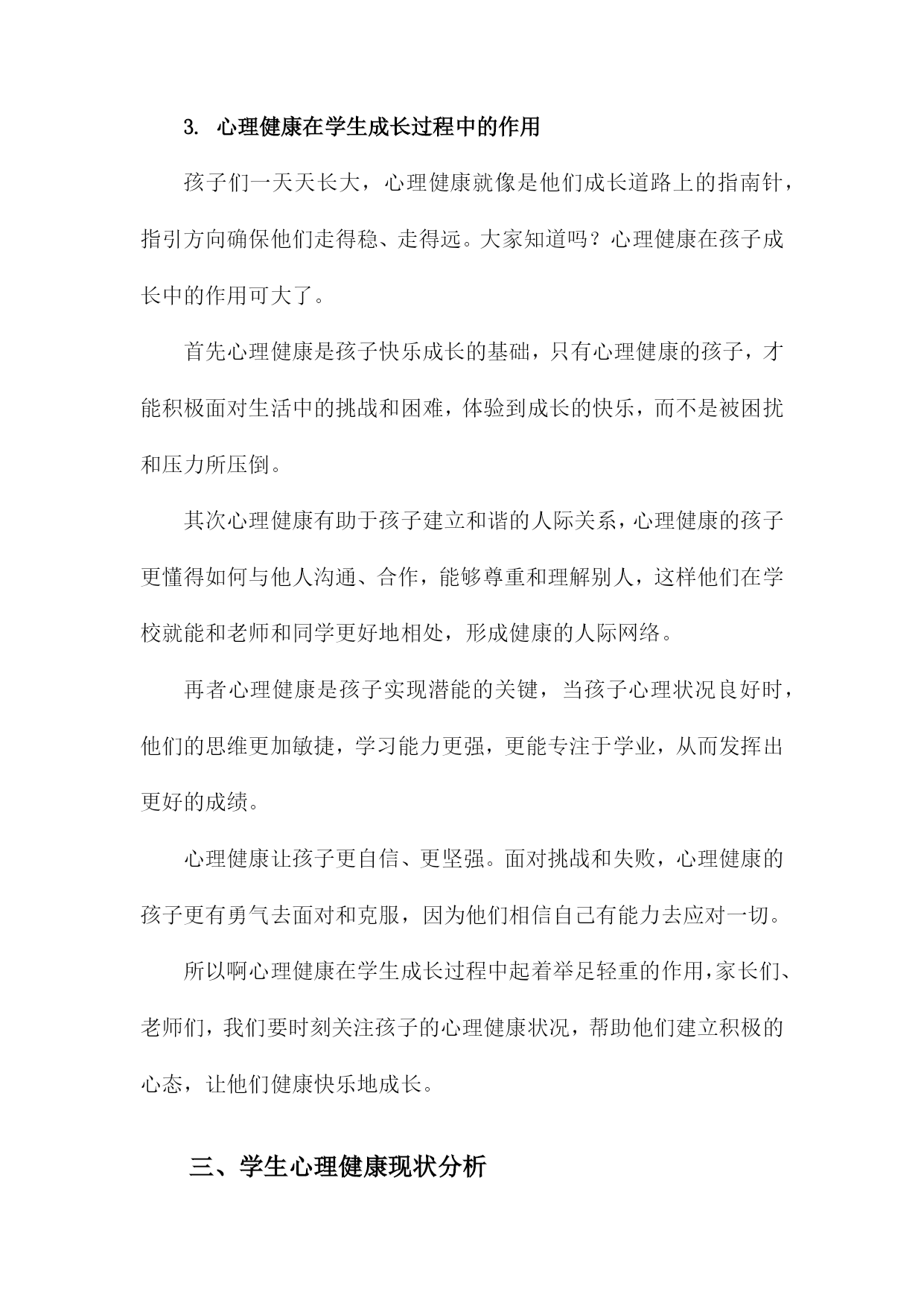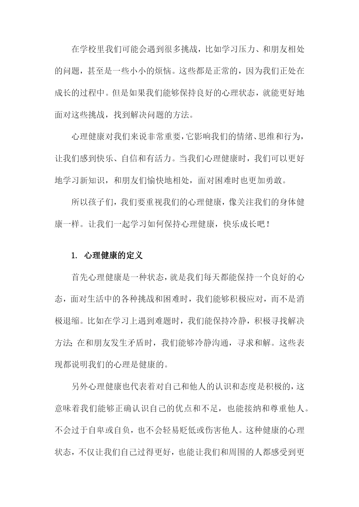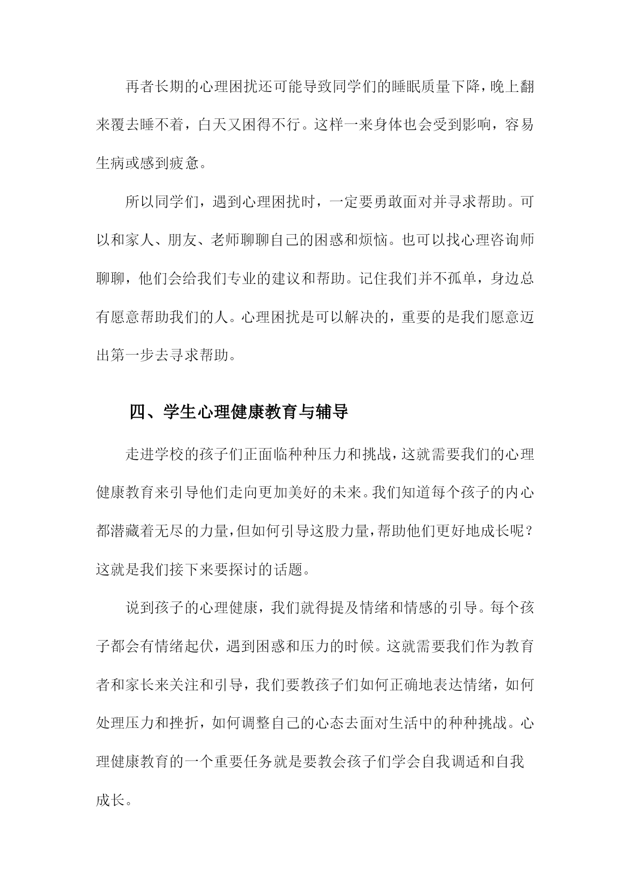 学生心理健康课件一、综述现在的孩子们面临着各种各样的压力,比如学业压力、人际关系压力,还有网络世界的诱惑等等。这些压力和挑战,有时候会让他们感到困惑、焦虑甚至沮丧。所以了解心理健康知识,学会调整心态,对每一个孩子来说都是非常必要的。1.介绍学生心理健康的重要性我们都知道,健康不仅仅是身体上没有疾病,还包括了心理的平衡与和谐。对于正在成长中的学生来说,心理健康的重要性更是不可忽视。想象一下如果我们的心灵像一座房子,那么心理健康就是这座房子的地基。只有地基打得好,房子才能稳稳地立在风雨中。学生们正处在人生中最具活力和探索精神的阶段,也是心理成长和性格形成的关键时期。学习压力、人际关系、自我认知等问题都可能影响到我们的心理状态。一个健康的心理状态能帮助我们更好地面对生活中的挑战,更有效地学习新知识,更积极地融入集体和社会。反之如果心理健康出现问题,可能会影响到我们的日常生活、学习和未来的成长。所以我们要像重视身体健康一样重视心理健康,时刻关注自己的心理状态,及时进行调整和疏导。让我们一起努力,为自己打造一个健康的心理环境,为未来的生活和学习打下坚实的基础。2.学生心理健康在当前教育环境中的地位和作用接下来我们来详细探讨一下,学生心理健康在当前教育环境中的地位和作用。咱都知道现在的教育可是越来越重视学生的全面发展了,不再仅仅是只看分数。而在这其中,学生的心理健康更是被摆在了重要的位置。为什么呢?因为心理健康跟身体健康一样重要,甚至可以说更关键,毕竟如果一个人的内心不够健康,可能就很难真正快乐和充实地生活和学习。更何况是学生时代呢,正是他们成长的关键时期。学生心理健康,首先关系到学生的学习效率和生活质量。一个心理健康的学生,他能更好地面对学习的压力和挑战,遇到困难也能积极应对,不会轻易放弃。而且他也能更好地与同学相处,形成更好的人际关系网络,这对于他们将来的工作和生活都有很大的帮助。更重要的是,健康的心理状态有助于学生形成积极的价值观、人生观和世界观,这对他们的一生都有着深远的影响。3.课件制作的目的和意义当我们谈及《学生心理健康课件》的制作其目的和意义显然易见。首先让我们来谈谈为何我们要制作这样的课件。我们都知道,学生心理健康是每位学子健康成长不可或缺的一部分。但在日常生活中,许多学生可能会遇到各种心理压力和困惑,不知道如何应对。这时一份好的心理健康课件就能起到关键作用,它能为学生提供心理健康的基本知识,帮助他们了解自己的情绪,学会合理调节压力,建立积极的生活态度。课件制作的目的,就是为了帮助学生更好地了解心理健康的重要性。通过图文并茂、生动有趣的展示方式,让学生在轻松的氛围中学习心理健康知识。同时课件也是一种普及心理健康教育的工具,让更多的人认识到心理健康的重要性,营造一个关心、理解、尊重的校园氛围。至于课件制作的意义,它不仅仅是传授知识的工具。更重要的是,它能够帮助解决学生在成长过程中遇到的心理问题,为他们提供及时的帮助和指导。一个好的课件,能够触动学生的内心,让他们在面对困难时不再迷茫,更有信心去解决问题。二、学生心理健康概述孩子们你们知道吗?除了我们的身体健康,我们的心理也要保持健康哦!心理的健康就像我们内心的指南针,指引我们快乐成长,勇敢面对生活中的挑战。那么什么是心理健康呢?简单来说心理健康就是我们对自己和周围的世界有积极、平衡的感觉和反应。在学校里我们可能会遇到很多挑战,比如学习压力、和朋友相处的问题,甚至是一些小小的烦恼。这些都是正常的,因为我们正处在成长的过程中。但是如果我们能够保持良好的心理状态,就能更好地面对这些挑战,找到解决问题的方法。心理健康对我们来说非常重要,它影响我们的情绪、思维和行为,让我们感到快乐、自信和有活力。当我们心理健康时,我们可以更好地学习新知识,和朋友们愉快地相处,面对困难时也更加勇敢。所以孩子们,我们要重视我们的心理健康,像关注我们的身体健康一样。让我们一起学习如何保持心理健康,快乐成长吧!1.心理健康的定义首先心理健康是一种状态,就是我们每天都能保持一个良好的心态,面对生活中的各种挑战和困难时,我们能够积极应对,而不是消极退缩。比如在学习上遇到难题时,我们能保持冷静,积极寻找解决方法;在和朋友发生矛盾时,我们能够冷静沟通,寻求和解。这些表现都说明我们的心理是健康的。另外心理健康也代表着对自己和他人的认识和态度是积极的,这意味着我们能够正确认识自己的优点和不足,也能接纳和尊重他人。不会过于自卑或自负,也不会轻易贬低或伤害他人。这种健康的心理状态,不仅让我们自己过得更好,也能让我们和周围的人都感受到更多的温暖和爱。所以嘛心理健康不只是我们自己的事儿,还关乎我们与他人的关系呢。总的来说呢,心理健康就是一种让我们感到快乐、有自信、能够积极面对生活的状