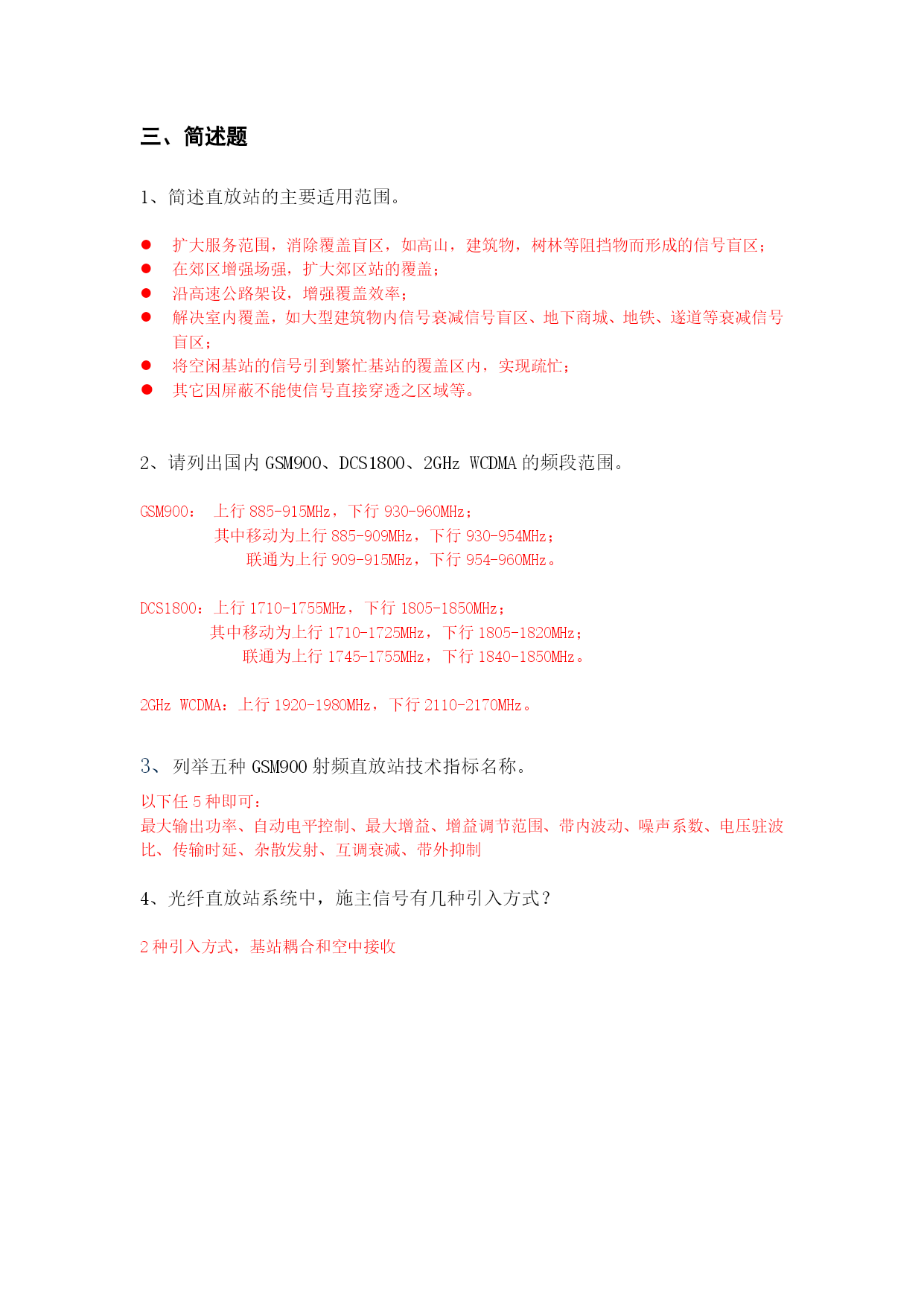 直放站培训试题及答案:一、填空题直放站在通信系统中的主要作用是:解决盲区的信号覆盖。2、公司目前直放站产品按照传输方式可以分为无线传输直放站、光纤传输直放站、直接耦合直放站。3、下图为射频直放站系统组成示意图,指出①~③分别代表什么?BTS②③①①:施主天线②:直放站主机③:重发天线4、光纤直放站包括近端机和远端机两部分。5、直放站增益表明了直放站对信号的放大能力。二、选择题1、射频直放站内部主要有哪几部分构成?(B)A、施主天线、直放站主机、重发天线B、射频链路、控制单元、电源模块C、近端机、远端机2、当被测件输入为两单音信号f1、f2,由于被测件的非线性,输出包含哪些新的频率成分?(C)A、2f1-f2B、2f2-f1C、mf1±nf2三、简述题1、简述直放站的主要适用范围。扩大服务范围,消除覆盖盲区,如高山,建筑物,树林等阻挡物而形成的信号盲区;在郊区增强场强,扩大郊区站的覆盖;沿高速公路架设,增强覆盖效率;解决室内覆盖,如大型建筑物内信号衰减信号盲区、地下商城、地铁、遂道等衰减信号盲区;将空闲基站的信号引到繁忙基站的覆盖区内,实现疏忙;其它因屏蔽不能使信号直接穿透之区域等。2、请列出国内GSM900、DCS1800、2GHzWCDMA的频段范围。GSM900:上行885-915MHz,下行930-960MHz;其中移动为上行885-909MHz,下行930-954MHz;联通为上行909-915MHz,下行954-960MHz。DCS1800:上行1710-1755MHz,下行1805-1850MHz;其中移动为上行1710-1725MHz,下行1805-1820MHz;联通为上行1745-1755MHz,下行1840-1850MHz。2GHzWCDMA:上行1920-1980MHz,下行2110-2170MHz。3、列举五种GSM900射频直放站技术指标名称。以下任5种即可:最大输出功率、自动电平控制、最大增益、增益调节范围、带内波动、噪声系数、电压驻波比、传输时延、杂散发射、互调衰减、带外抑制4、光纤直放站系统中,施主信号有几种引入方式?2种引入方式,基站耦合和空中接收