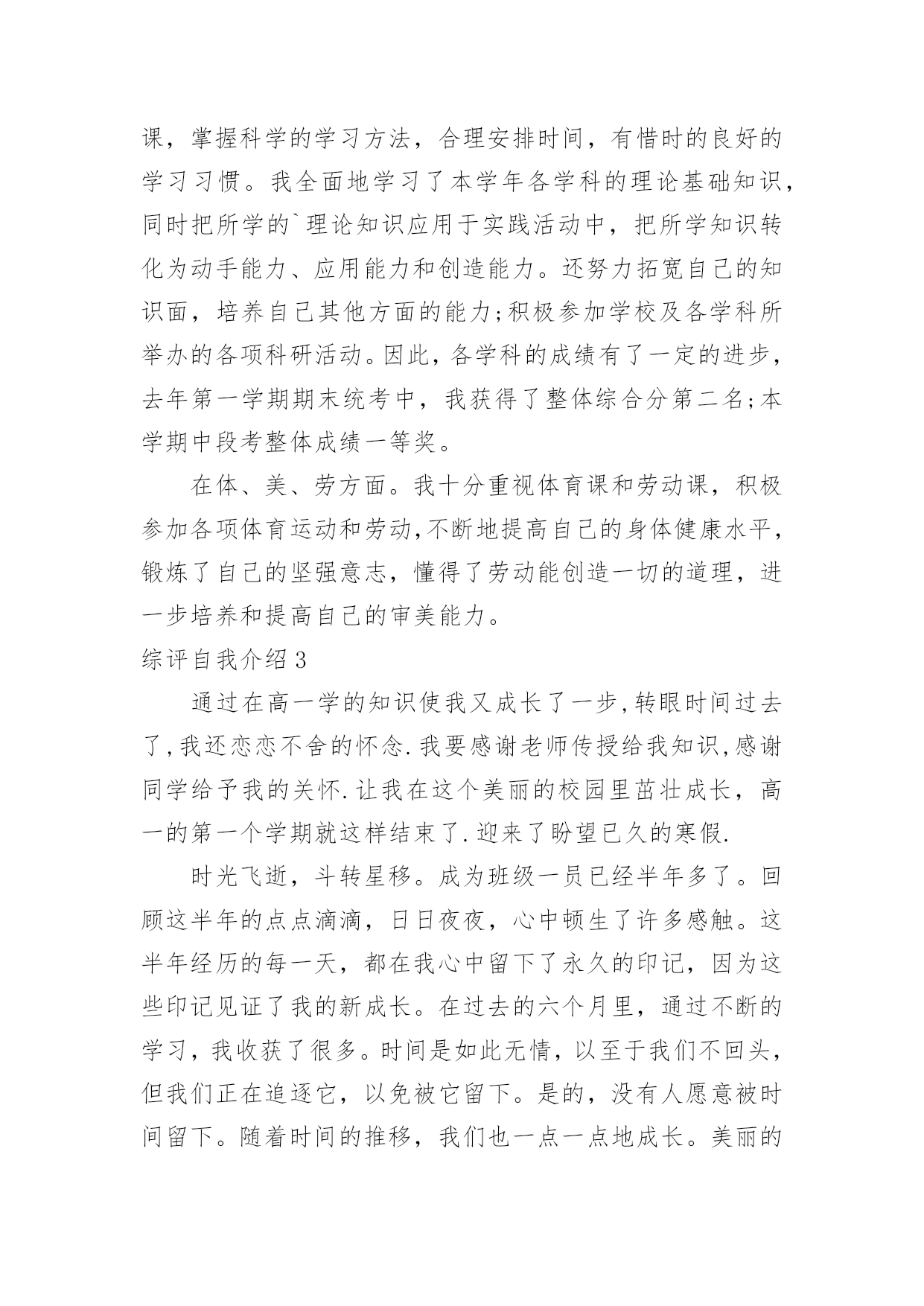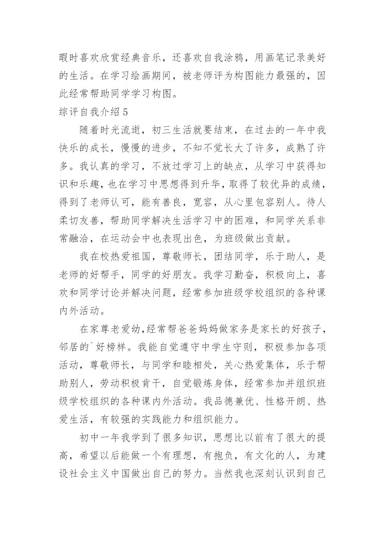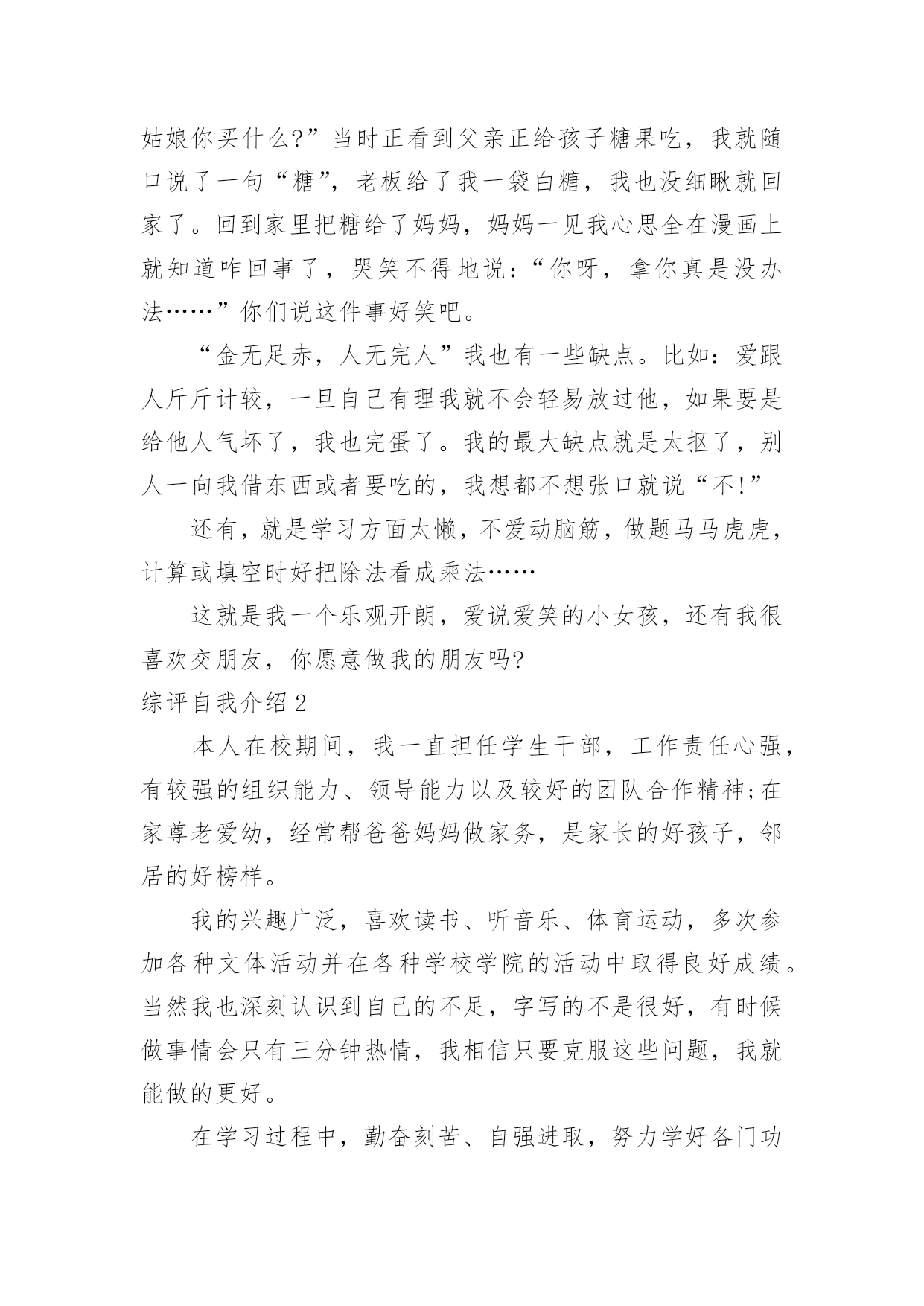 综评自我介绍综评自我介绍当去到一个新环境下,时常需要用到自我介绍,自我介绍可以给陌生人留下一个好的印象。到底应如何写自我介绍呢?以下是小编精心整理的综评自我介绍,希望能够帮助到大家。综评自我介绍1我的性格活泼开朗,爱说爱笑,喜欢跟人开玩笑,我幼稚调皮,异想天开,是个十分乐观的女孩子。我擅长的科目是美术,音乐,语文。我的.数学学的不是很好,我很爱写作文。我的兴趣爱好很广泛,看书,唱歌,跳舞,弹琴。没事时经常看一会儿书,弹一会儿电子琴,再跳一会舞,唱一会儿歌,很少有闲着的时候。也经常模仿电视里的歌手唱歌,有一次我听见一个歌手唱:“村里有个姑娘叫小芳……”我就试着改成了:“我家有只小猫叫小花……”其实我最喜欢的还是和小朋友们玩游戏,这可能是我们孩子共同的爱好。我最爱看的书就是漫画书,记得有一次还因为看漫画入迷弄出了个笑话呢。那是三年级的时候,我在看漫画《父与子》,妈妈让我去买酱油,我就应了一声慢悠悠地拿着漫画下楼去小卖店买酱油。我边走边看,到了小卖店老板问:“小姑娘你买什么?”当时正看到父亲正给孩子糖果吃,我就随口说了一句“糖”,老板给了我一袋白糖,我也没细瞅就回家了。回到家里把糖给了妈妈,妈妈一见我心思全在漫画上就知道咋回事了,哭笑不得地说:“你呀,拿你真是没办法……”你们说这件事好笑吧。“金无足赤,人无完人”我也有一些缺点。比如:爱跟人斤斤计较,一旦自己有理我就不会轻易放过他,如果要是给他人气坏了,我也完蛋了。我的最大缺点就是太抠了,别人一向我借东西或者要吃的,我想都不想张口就说“不!”还有,就是学习方面太懒,不爱动脑筋,做题马马虎虎,计算或填空时好把除法看成乘法……这就是我一个乐观开朗,爱说爱笑的小女孩,还有我很喜欢交朋友,你愿意做我的朋友吗?综评自我介绍2本人在校期间,我一直担任学生干部,工作责任心强,有较强的组织能力、领导能力以及较好的团队合作精神;在家尊老爱幼,经常帮爸爸妈妈做家务,是家长的好孩子,邻居的好榜样。我的兴趣广泛,喜欢读书、听音乐、体育运动,多次参加各种文体活动并在各种学校学院的活动中取得良好成绩。当然我也深刻认识到自己的不足,字写的不是很好,有时候做事情会只有三分钟热情,我相信只要克服这些问题,我就能做的更好。在学习过程中,勤奋刻苦、自强进取,努力学好各门功课,掌握科学的学习方法,合理安排时间,有惜时的良好的学习习惯。我全面地学习了本学年各学科的理论基础知识,同时把所学的`理论知识应用于实践活动中,把所学知识转化为动手能力、应用能力和创造能力。还努力拓宽自己的知识面,培养自己其他方面的能力;积极参加学校及各学科所举办的各项科研活动。因此,各学科的成绩有了一定的进步,去年第一学期期末统考中,我获得了整体综合分第二名;本学期中段考整体成绩一等奖。在体、美、劳方面。我十分重视体育课和劳动课,积极参加各项体育运动和劳动,不断地提高自己的身体健康水平,锻炼了自己的坚强意志,懂得了劳动能创造一切的道理,进一步培养和提高自己的审美能力。综评自我介绍3通过在高一学的知识使我又成长了一步,转眼时间过去了,我还恋恋不舍的怀念.我要感谢老师传授给我知识,感谢同学给予我的关怀.让我在这个美丽的校园里茁壮成长,高一的第一个学期就这样结束了.迎来了盼望已久的寒假.时光飞逝,斗转星移。成为班级一员已经半年多了。回顾这半年的点点滴滴,日日夜夜,心中顿生了许多感触。这半年经历的每一天,都在我心中留下了永久的印记,因为这些印记见证了我的新成长。在过去的六个月里,通过不断的学习,我收获了很多。时间是如此无情,以至于我们不回头,但我们正在追逐它,以免被它留下。是的,没有人愿意被时间留下。随着时间的推移,我们也一点一点地成长。美丽的纯真随着风雨的磨灭而成熟。也许这就是成长的代价。回顾我还是考生的日子,似乎太遥远了。在憧憬中,我懂得了来之不易的珍惜;在思考中,我懂得了酝酿已久的真理;只有收获后,我才知道努力的甜蜜。突然,我觉得我似乎理解了很多事情,但经过仔细思考,情况并非如此......我过去看到和知道的是如此的偏见和肤浅。过去的天真似乎在一瞬间变成了无知和荒谬。我想谁不是这样的?也许我们以后会嘲笑现在的渺小...我们不得不微笑着回顾我们走过的`路.:在学习上:我深知学习的重要性。面对二十一世纪这个知识的时代,面对知识就是力量,科学技术是第一生产力的科学论断,我认为离开了知识将是一个一无是处的废人。以资本为最重要生产力的"资本家"的时代将要过去,以知识为特征的"知本家"的时代即将到来。而高中时代是学习现代科学知识的黄金时代,我应该抓住这个有利的时机,用知识来武装自己的头脑,知识是无价的。在纪律方面,基本可以做到:尊重教师,同学之间可以真诚相待;能遵守学校各项纪律,遵守公共秩序,遵守社会公德;不迟到、不早退、不旷课;上学穿校服;举止文明;有良好的卫
