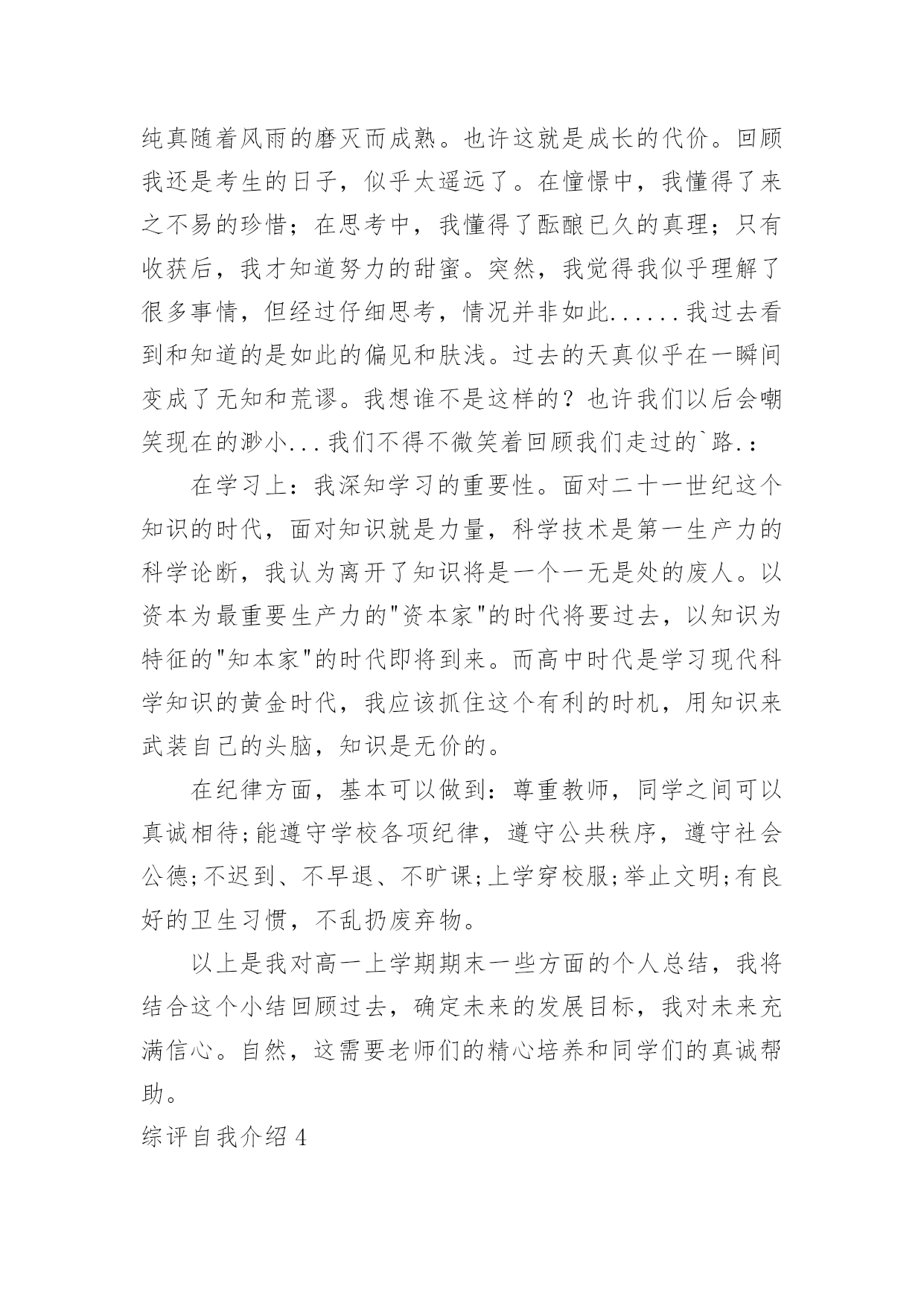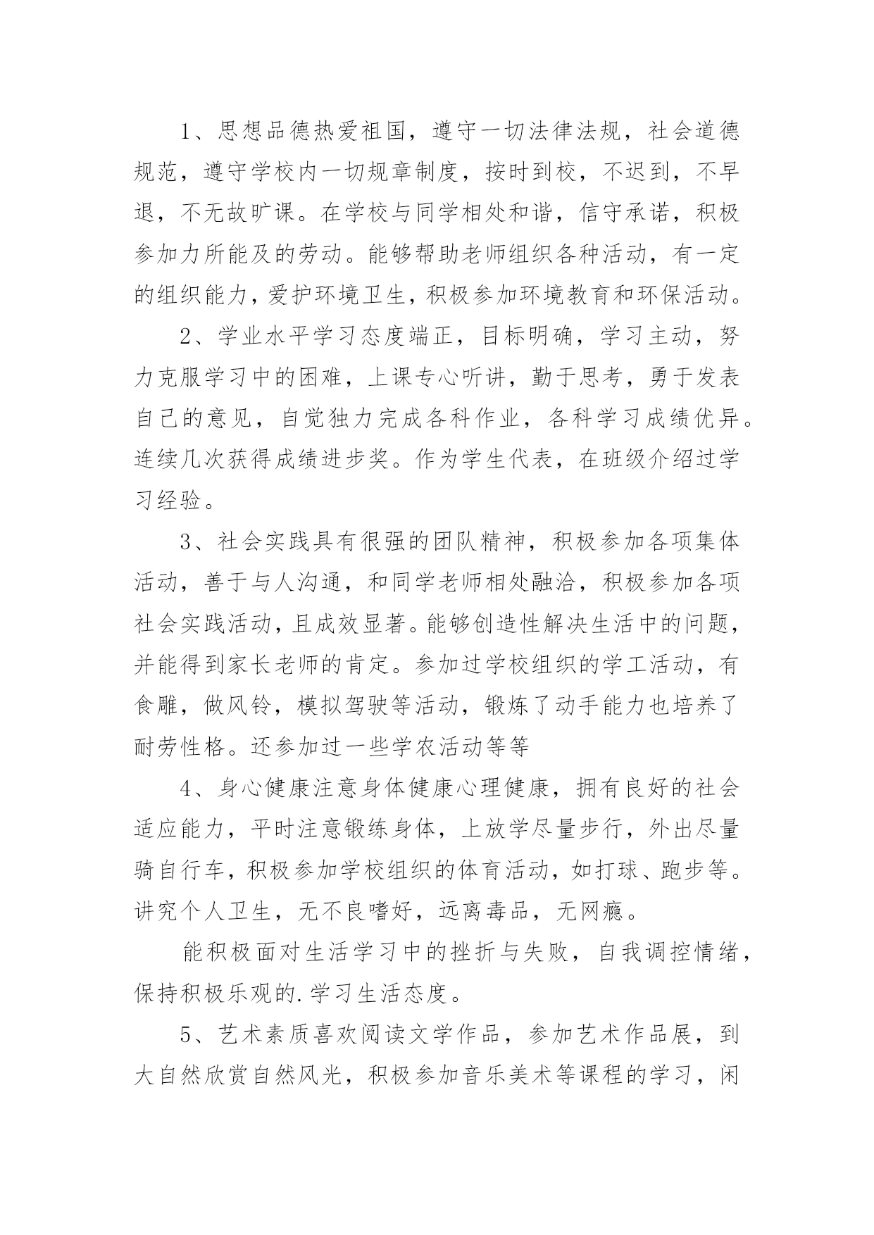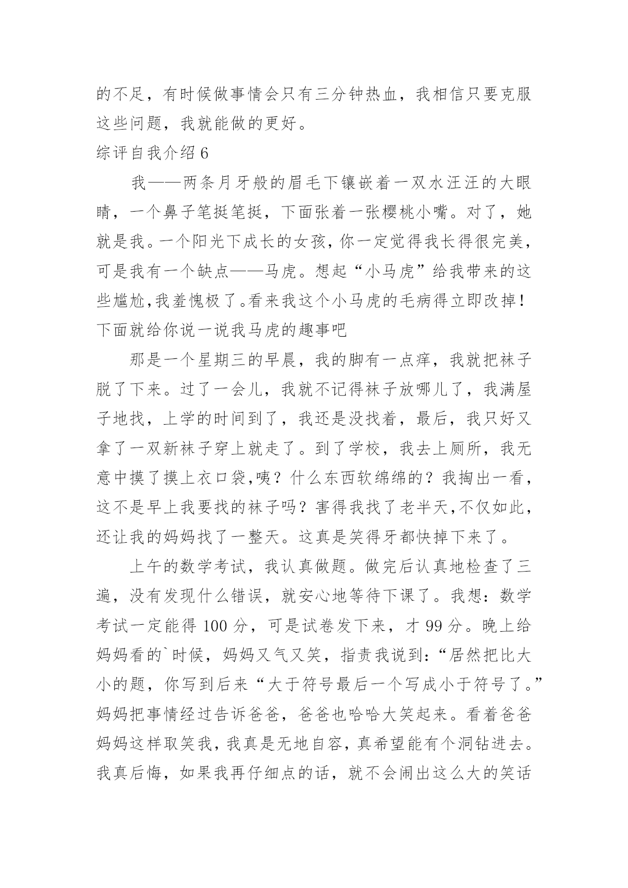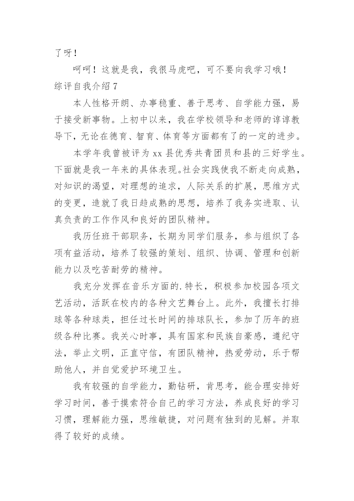 综评自我介绍综评自我介绍当去到一个新环境下,时常需要用到自我介绍,自我介绍可以给陌生人留下一个好的印象。到底应如何写自我介绍呢?以下是小编精心整理的综评自我介绍,希望能够帮助到大家。综评自我介绍1我的性格活泼开朗,爱说爱笑,喜欢跟人开玩笑,我幼稚调皮,异想天开,是个十分乐观的女孩子。我擅长的科目是美术,音乐,语文。我的.数学学的不是很好,我很爱写作文。我的兴趣爱好很广泛,看书,唱歌,跳舞,弹琴。没事时经常看一会儿书,弹一会儿电子琴,再跳一会舞,唱一会儿歌,很少有闲着的时候。也经常模仿电视里的歌手唱歌,有一次我听见一个歌手唱:“村里有个姑娘叫小芳……”我就试着改成了:“我家有只小猫叫小花……”其实我最喜欢的还是和小朋友们玩游戏,这可能是我们孩子共同的爱好。我最爱看的书就是漫画书,记得有一次还因为看漫画入迷弄出了个笑话呢。那是三年级的时候,我在看漫画《父与子》,妈妈让我去买酱油,我就应了一声慢悠悠地拿着漫画下楼去小卖店买酱油。我边走边看,到了小卖店老板问:“小姑娘你买什么?”当时正看到父亲正给孩子糖果吃,我就随口说了一句“糖”,老板给了我一袋白糖,我也没细瞅就回家了。回到家里把糖给了妈妈,妈妈一见我心思全在漫画上就知道咋回事了,哭笑不得地说:“你呀,拿你真是没办法……”你们说这件事好笑吧。“金无足赤,人无完人”我也有一些缺点。比如:爱跟人斤斤计较,一旦自己有理我就不会轻易放过他,如果要是给他人气坏了,我也完蛋了。我的最大缺点就是太抠了,别人一向我借东西或者要吃的,我想都不想张口就说“不!”还有,就是学习方面太懒,不爱动脑筋,做题马马虎虎,计算或填空时好把除法看成乘法……这就是我一个乐观开朗,爱说爱笑的小女孩,还有我很喜欢交朋友,你愿意做我的朋友吗?综评自我介绍2本人在校期间,我一直担任学生干部,工作责任心强,有较强的组织能力、领导能力以及较好的团队合作精神;在家尊老爱幼,经常帮爸爸妈妈做家务,是家长的好孩子,邻居的好榜样。我的兴趣广泛,喜欢读书、听音乐、体育运动,多次参加各种文体活动并在各种学校学院的活动中取得良好成绩。当然我也深刻认识到自己的不足,字写的不是很好,有时候做事情会只有三分钟热情,我相信只要克服这些问题,我就能做的更好。在学习过程中,勤奋刻苦、自强进取,努力学好各门功课,掌握科学的学习方法,合理安排时间,有惜时的良好的学习习惯。我全面地学习了本学年各学科的理论基础知识,同时把所学的`理论知识应用于实践活动中,把所学知识转化为动手能力、应用能力和创造能力。还努力拓宽自己的知识面,培养自己其他方面的能力;积极参加学校及各学科所举办的各项科研活动。因此,各学科的成绩有了一定的进步,去年第一学期期末统考中,我获得了整体综合分第二名;本学期中段考整体成绩一等奖。在体、美、劳方面。我十分重视体育课和劳动课,积极参加各项体育运动和劳动,不断地提高自己的身体健康水平,锻炼了自己的坚强意志,懂得了劳动能创造一切的道理,进一步培养和提高自己的审美能力。综评自我介绍3通过在高一学的知识使我又成长了一步,转眼时间过去了,我还恋恋不舍的怀念.我要感谢老师传授给我知识,感谢同学给予我的关怀.让我在这个美丽的校园里茁壮成长,高一的第一个学期就这样结束了.迎来了盼望已久的寒假.时光飞逝,斗转星移。成为班级一员已经半年多了。回顾这半年的点点滴滴,日日夜夜,心中顿生了许多感触。这半年经历的每一天,都在我心中留下了永久的印记,因为这些印记见证了我的新成长。在过去的六个月里,通过不断的学习,我收获了很多。时间是如此无情,以至于我们不回头,但我们正在追逐它,以免被它留下。是的,没有人愿意被时间留下。随着时间的推移,我们也一点一点地成长。美丽的纯真随着风雨的磨灭而成熟。也许这就是成长的代价。回顾我还是考生的日子,似乎太遥远了。在憧憬中,我懂得了来之不易的珍惜;在思考中,我懂得了酝酿已久的真理;只有收获后,我才知道努力的甜蜜。突然,我觉得我似乎理解了很多事情,但经过仔细思考,情况并非如此......我过去看到和知道的是如此的偏见和肤浅。过去的天真似乎在一瞬间变成了无知和荒谬。我想谁不是这样的?也许我们以后会嘲笑现在的渺小...我们不得不微笑着回顾我们走过的`路.:在学习上:我深知学习的重要性。面对二十一世纪这个知识的时代,面对知识就是力量,科学技术是第一生产力的科学论断,我认为离开了知识将是一个一无是处的废人。以资本为最重要生产力的"资本家"的时代将要过去,以知识为特征的"知本家"的时代即将到来。而高中时代是学习现代科学知识的黄金时代,我应该抓住这个有利的时机,用知识来武装自己的头脑,知识是无价的。在纪律方面,基本可以做到:尊重教师,同学之间可以真诚相待;能遵守学校各项纪律,遵守公共秩序,遵守社会公德;不迟到、不早退、不旷课;上学穿校服;举止文明;有良好的卫