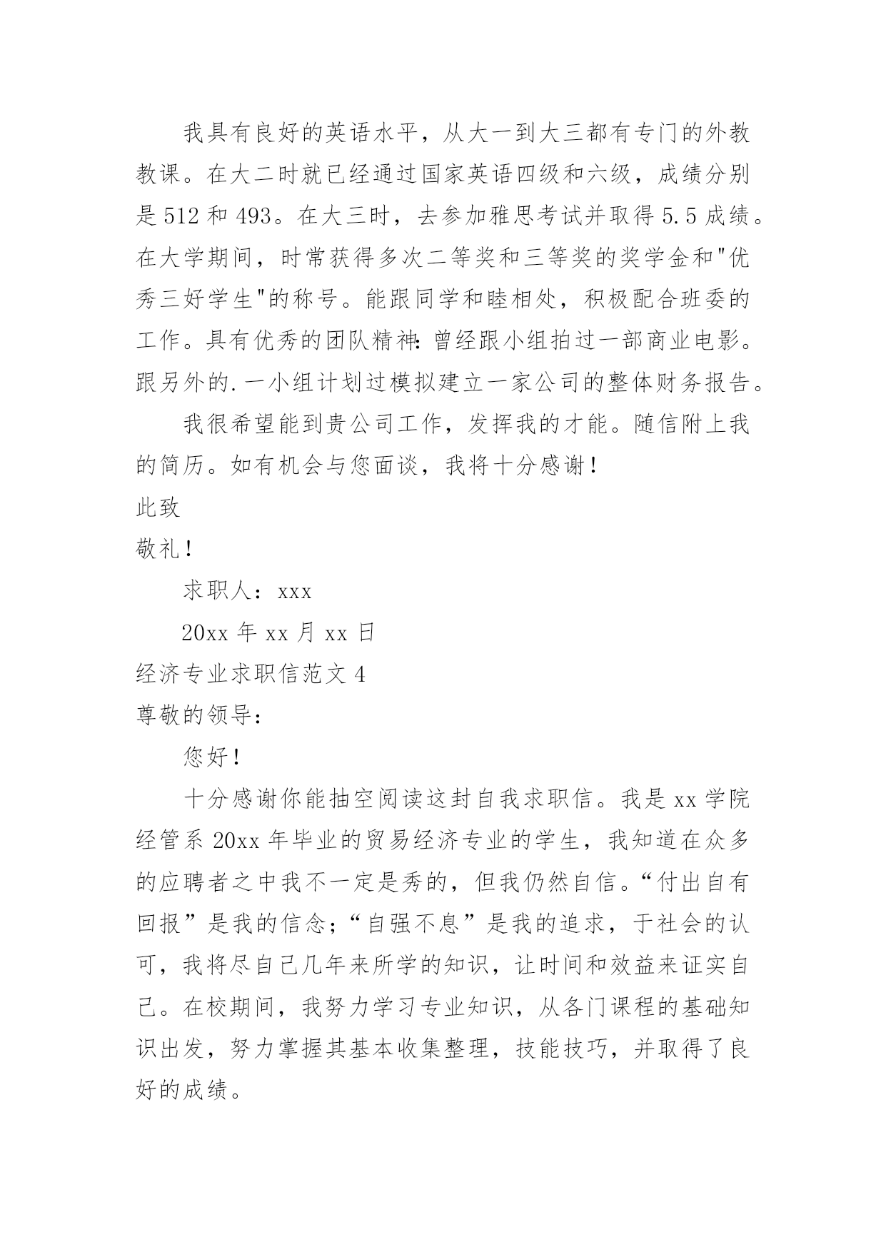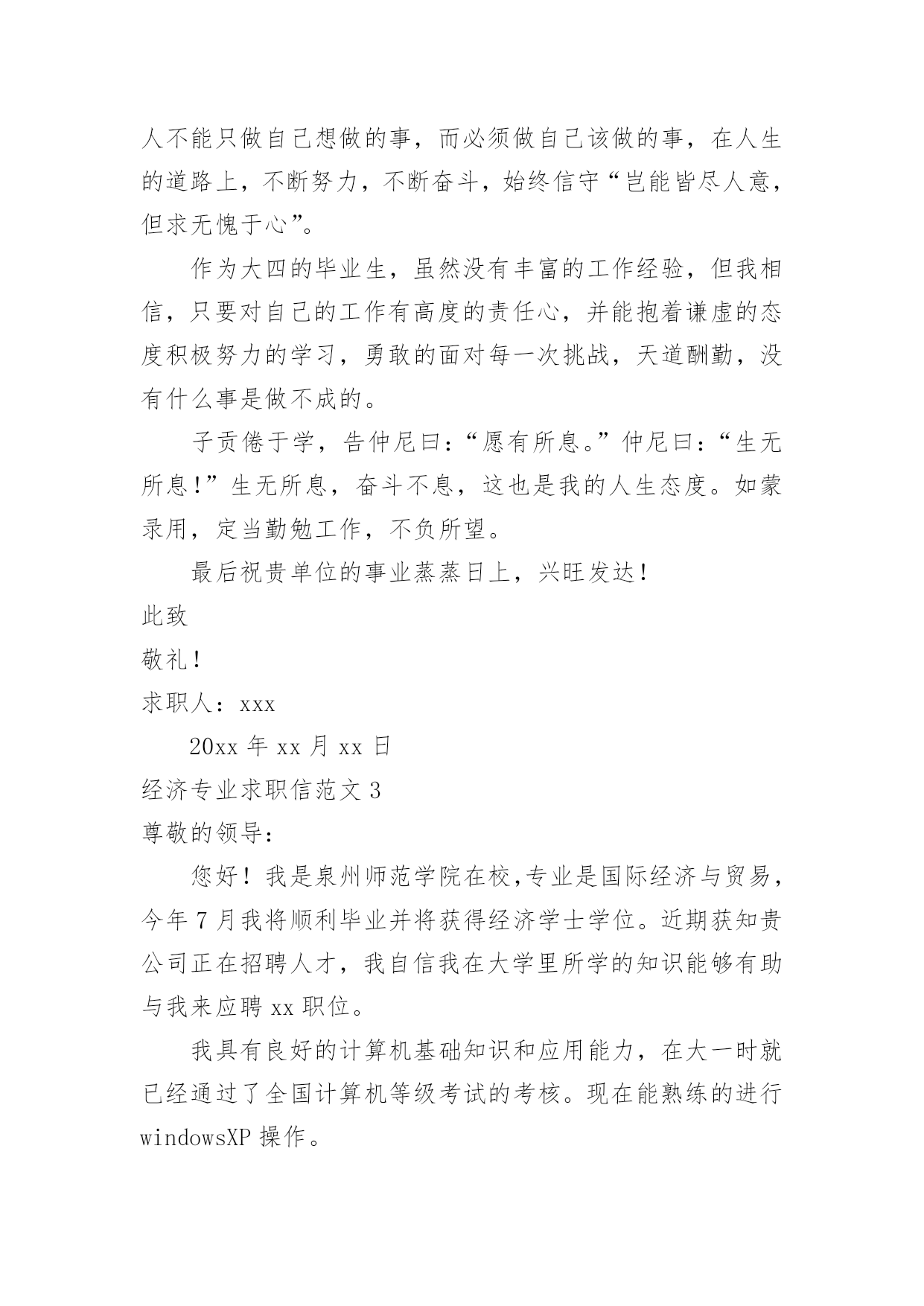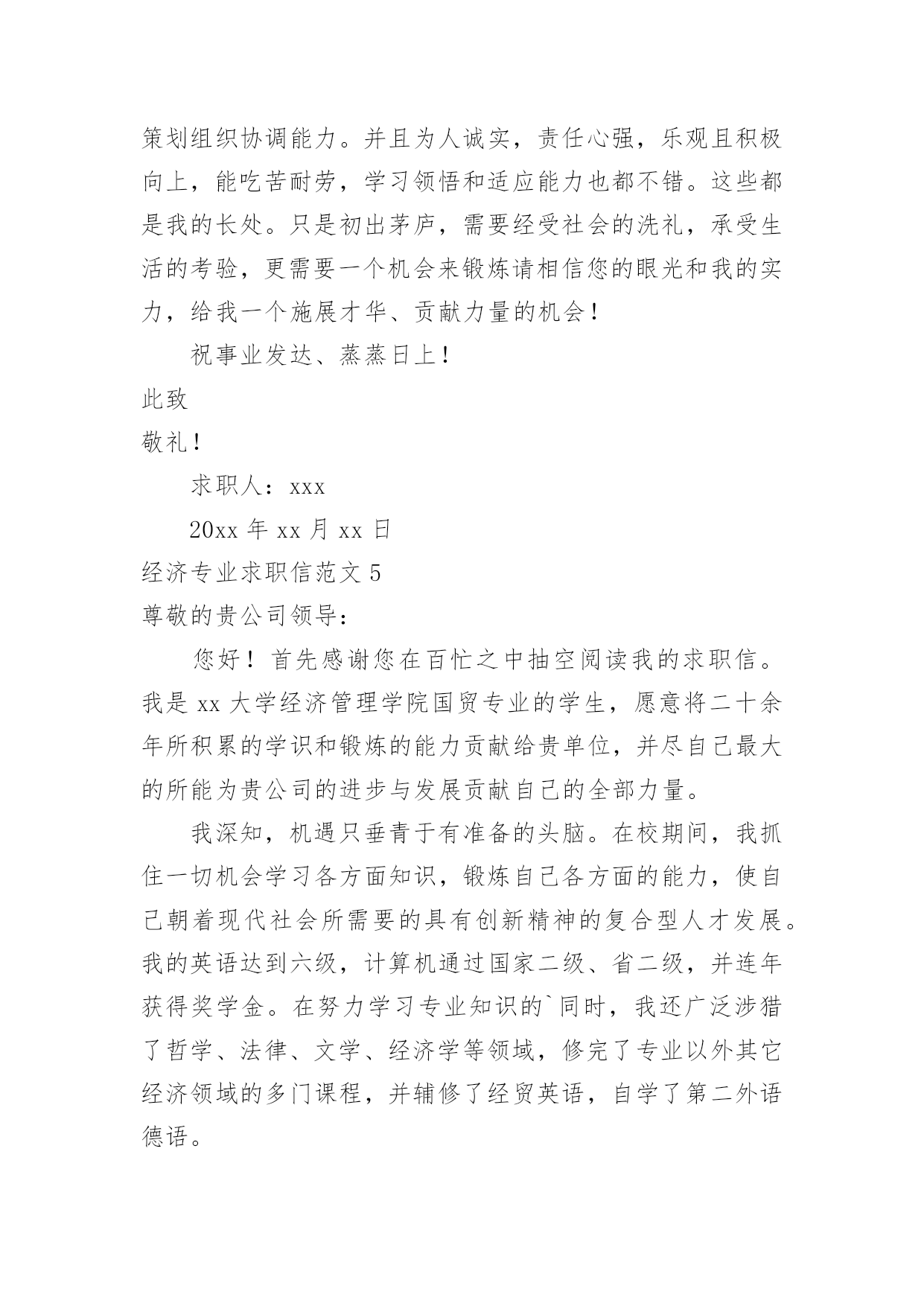 经济专业求职信经济专业求职信范文时间流逝得如此之快,迎接我们的将是新的工作机会,新的挑战,现在的你想必是在写求职信吧。相信很多人都十分头疼怎么写一封精彩的求职信吧,下面是小编精心整理的经济专业求职信范文,仅供参考,欢迎大家阅读。经济专业求职信范文1尊敬的领导:你好,我是毕业于贵州财经大学的xx届环境资源与开展经济学专业,以下是我求职于贵单位的求职信。大学时期,我主修的专业是环境资源与开展经济学。主修的课程有《环境资源管理学》《微观经济学》《微观经济学》《环境资源法学》《管理学》《东方经济学》《开展经济学》《环境生态与自然资源概论》《环境资源经济学》等二十多门课程,学习的内容是围绕怎样样无效应用、维护、规划的我们的环境资源,使我们的环境资源效益最大化。学习这个专业,我觉得是对世界,对人类,对我们国度的`环境有很大益处。希望指导看完我的求职信能给我一个到贵单位实习的时机,使我能把本人所学习到的知识使用到任务中去,为我们的环境,我们的国度奉献本人一份微薄的力气,使我们的环境更美丽,资源运用率高效。最初感激指导在百忙中抽空月底我的求职信,祝任务顺利,身体安康!此致敬礼!求职人:xxx20xx年xx月xx日经济专业求职信范文2尊敬的领导:您好!我是湖南农业大学15级经济学院金融系的毕业生,非常感谢您在百忙之中抽空来垂阅我的求职信。光阴似箭,大学四年转瞬即逝,如今的我已站在人生的重要路口上,满怀着激动与兴奋,准备踏入一个全新的舞台,充满了光芒与机遇,也充满了竞争与挑战。在此,诚挚的希望贵单位能给我一个实现人生价值的`机会,让我能在这个舞台上展示自己,证明自己。大学四年,通过系统的专业知识的学习,我对金融这门学科有了比较深刻的了解,具备了深厚的理论知识及相当的实践操作能力。同时,在课余时间自学法律知识,把金融与法律知识有机融合起来。除此之外,我也积极参加各项实践活动。在各项活动中,培养了自身的组织管理能力和团队协作精神,能迅速融入团队,有较强的适应能力及快速学习能力,并建立了高度的责任心。实践活动的参与,除了让我的能力得到锻炼之外,也让我明白了许多为人处世的道理。人不能只做自己想做的事,而必须做自己该做的事,在人生的道路上,不断努力,不断奋斗,始终信守“岂能皆尽人意,但求无愧于心”。作为大四的毕业生,虽然没有丰富的工作经验,但我相信,只要对自己的工作有高度的责任心,并能抱着谦虚的态度积极努力的学习,勇敢的面对每一次挑战,天道酬勤,没有什么事是做不成的。子贡倦于学,告仲尼曰:“愿有所息。”仲尼曰:“生无所息!”生无所息,奋斗不息,这也是我的人生态度。如蒙录用,定当勤勉工作,不负所望。最后祝贵单位的事业蒸蒸日上,兴旺发达!此致敬礼!求职人:xxx20xx年xx月xx日经济专业求职信范文3尊敬的领导:您好!我是泉州师范学院在校,专业是国际经济与贸易,今年7月我将顺利毕业并将获得经济学士学位。近期获知贵公司正在招聘人才,我自信我在大学里所学的知识能够有助与我来应聘xx职位。我具有良好的计算机基础知识和应用能力,在大一时就已经通过了全国计算机等级考试的考核。现在能熟练的进行windowsXP操作。我具有良好的英语水平,从大一到大三都有专门的外教教课。在大二时就已经通过国家英语四级和六级,成绩分别是512和493。在大三时,去参加雅思考试并取得5.5成绩。在大学期间,时常获得多次二等奖和三等奖的奖学金和"优秀三好学生"的称号。能跟同学和睦相处,积极配合班委的工作。具有优秀的团队精神:曾经跟小组拍过一部商业电影。跟另外的.一小组计划过模拟建立一家公司的整体财务报告。我很希望能到贵公司工作,发挥我的才能。随信附上我的简历。如有机会与您面谈,我将十分感谢!此致敬礼!求职人:xxx20xx年xx月xx日经济专业求职信范文4尊敬的领导:您好!十分感谢你能抽空阅读这封自我求职信。我是xx学院经管系20xx年毕业的贸易经济专业的学生,我知道在众多的应聘者之中我不一定是秀的,但我仍然自信。“付出自有回报”是我的信念;“自强不息”是我的追求,于社会的认可,我将尽自己几年来所学的知识,让时间和效益来证实自己。在校期间,我努力学习专业知识,从各门课程的基础知识出发,努力掌握其基本收集整理,技能技巧,并取得了良好的成绩。21世纪需要的'是综合素质人才,深知这点的我,在大二开始时就自学了Word20xx和Excel20xx等办公室软件、计算机的日常操作。本着自己锐意进取,敬业爱群和乐于助人的作风及表现,连续两年担任班里的干部,赢得了老师、同学们的信任和赞誉,并获得了“优秀班干部”和“优秀团员”的称号,在两年的班干部生活中使自己锻炼了一定的组织、管理、协调能力。为了尽快缩小理论与实践的差距,大三上学期参加短期实习,积累了一定的经验,进一步使我把理论知识融会到实践当中去,为参加