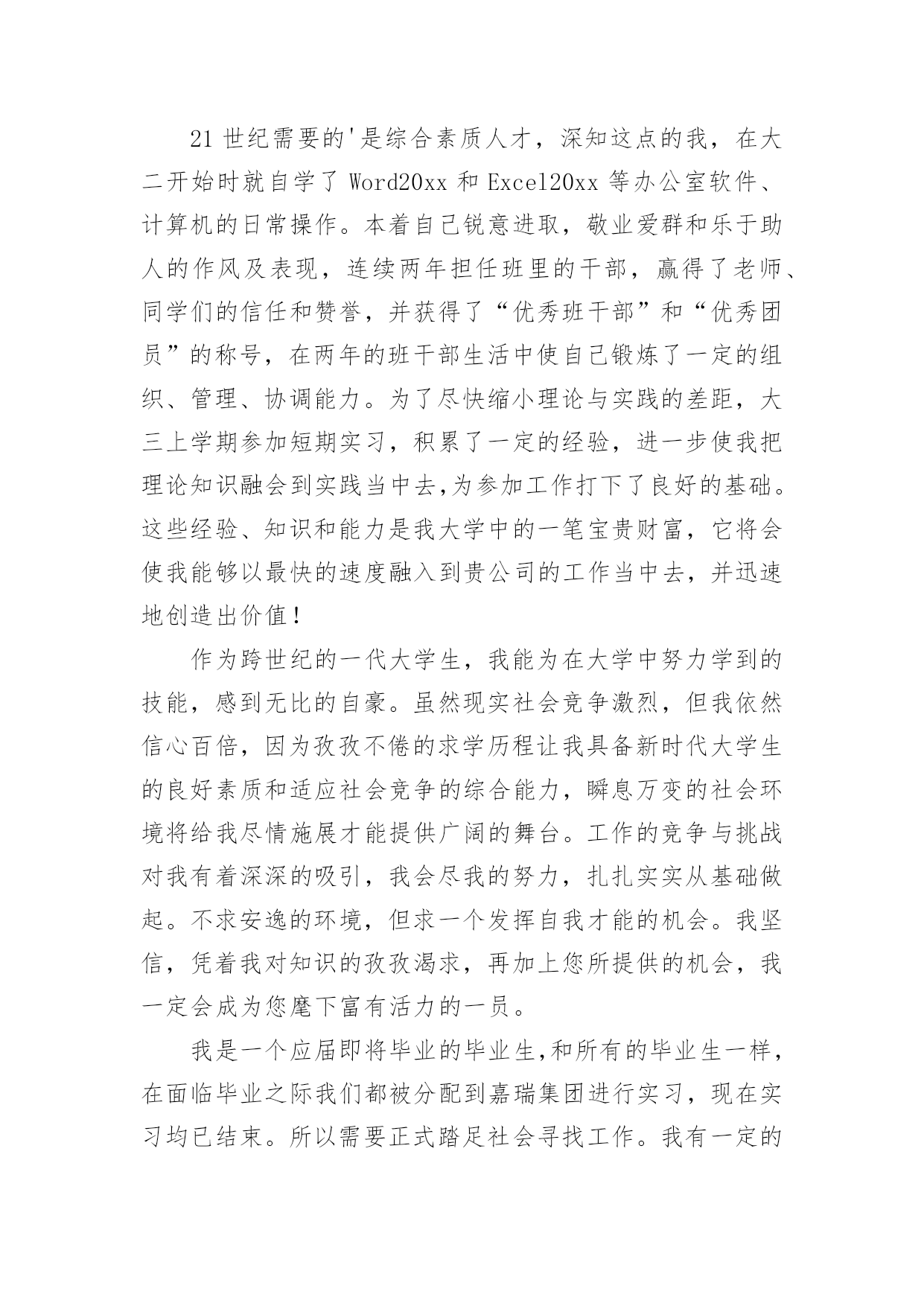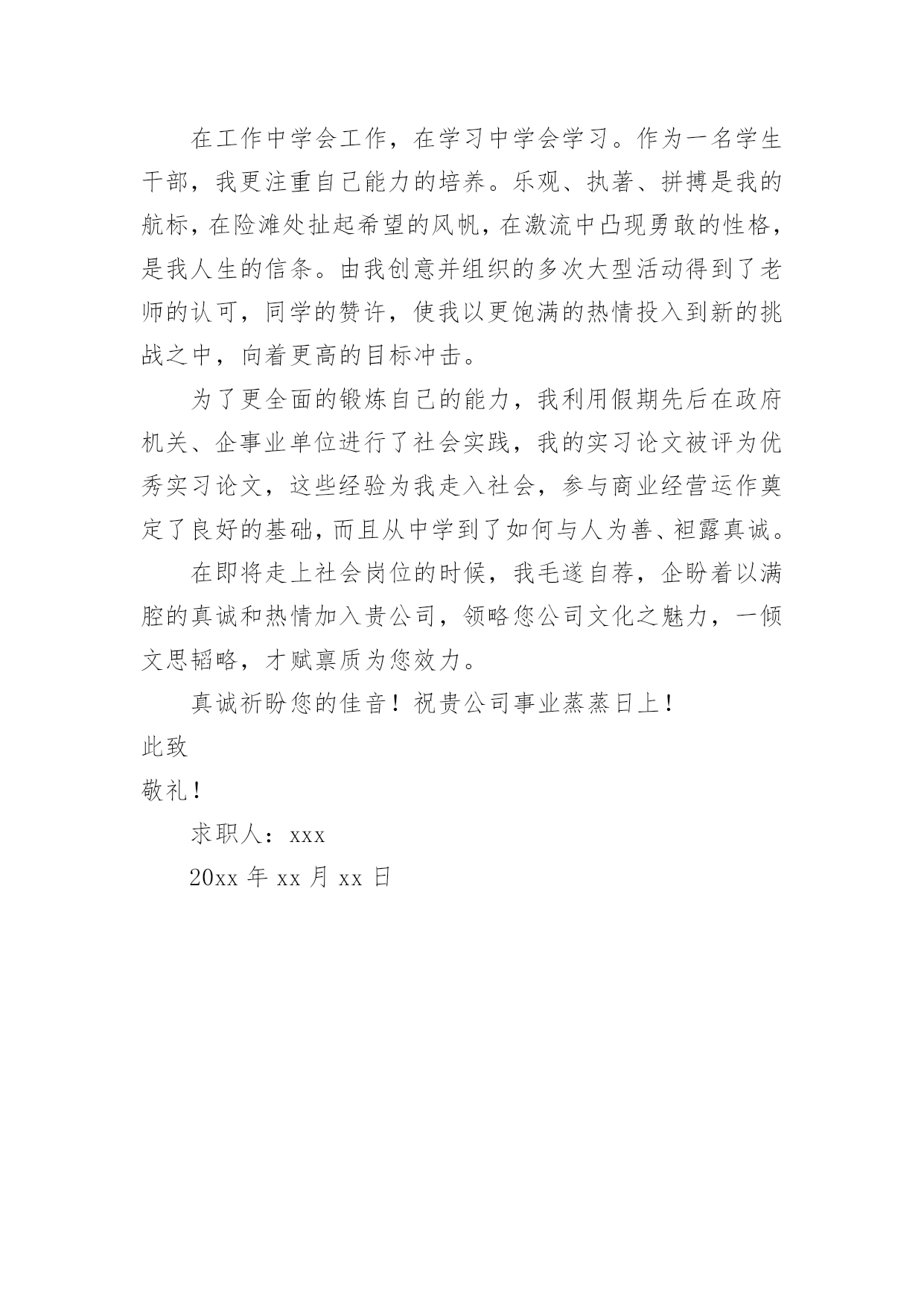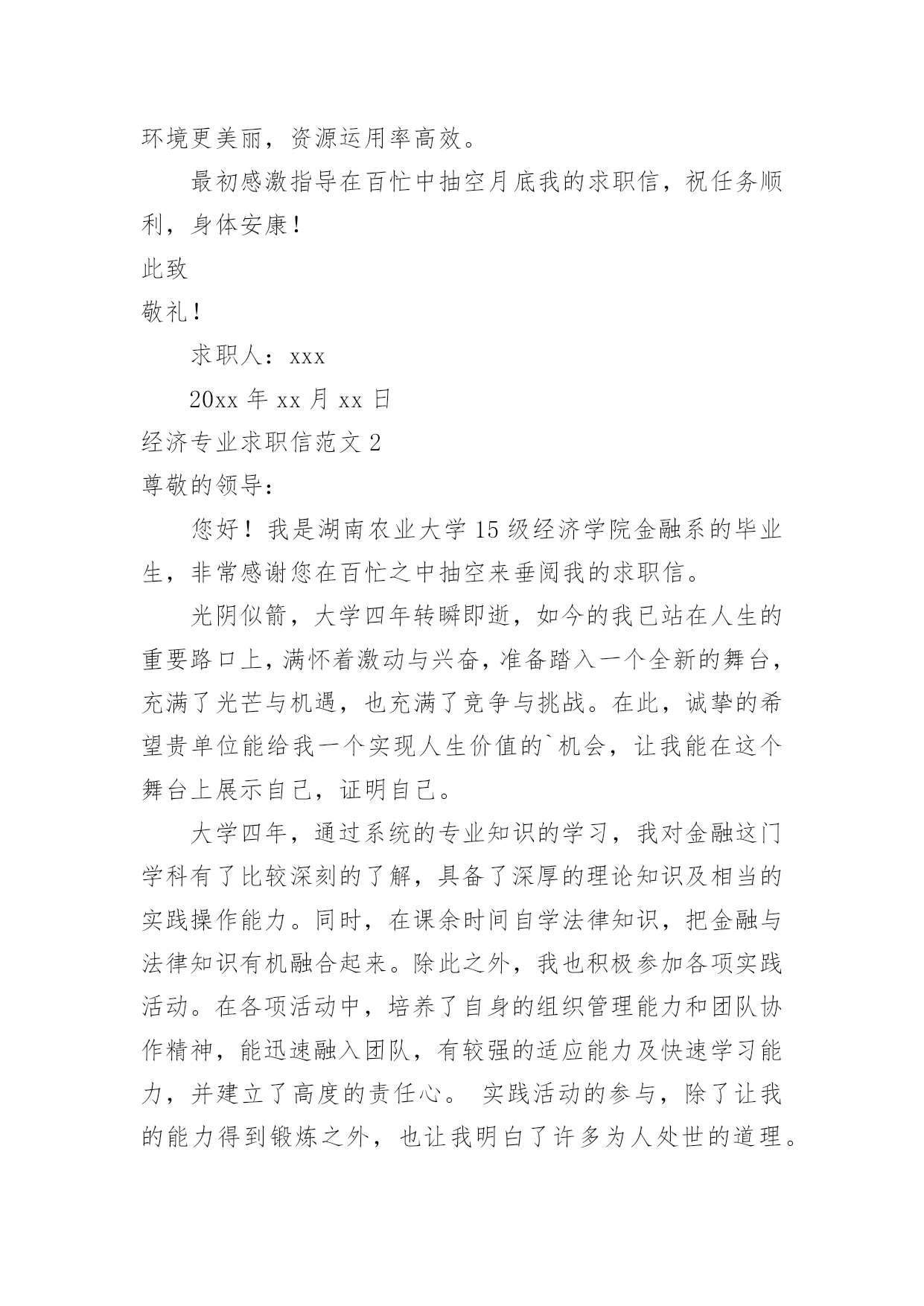 经济专业求职信经济专业求职信范文时间流逝得如此之快,迎接我们的将是新的工作机会,新的挑战,现在的你想必是在写求职信吧。相信很多人都十分头疼怎么写一封精彩的求职信吧,下面是小编精心整理的经济专业求职信范文,仅供参考,欢迎大家阅读。经济专业求职信范文1尊敬的领导:你好,我是毕业于贵州财经大学的xx届环境资源与开展经济学专业,以下是我求职于贵单位的求职信。大学时期,我主修的专业是环境资源与开展经济学。主修的课程有《环境资源管理学》《微观经济学》《微观经济学》《环境资源法学》《管理学》《东方经济学》《开展经济学》《环境生态与自然资源概论》《环境资源经济学》等二十多门课程,学习的内容是围绕怎样样无效应用、维护、规划的我们的环境资源,使我们的环境资源效益最大化。学习这个专业,我觉得是对世界,对人类,对我们国度的`环境有很大益处。希望指导看完我的求职信能给我一个到贵单位实习的时机,使我能把本人所学习到的知识使用到任务中去,为我们的环境,我们的国度奉献本人一份微薄的力气,使我们的环境更美丽,资源运用率高效。最初感激指导在百忙中抽空月底我的求职信,祝任务顺利,身体安康!此致敬礼!求职人:xxx20xx年xx月xx日经济专业求职信范文2尊敬的领导:您好!我是湖南农业大学15级经济学院金融系的毕业生,非常感谢您在百忙之中抽空来垂阅我的求职信。光阴似箭,大学四年转瞬即逝,如今的我已站在人生的重要路口上,满怀着激动与兴奋,准备踏入一个全新的舞台,充满了光芒与机遇,也充满了竞争与挑战。在此,诚挚的希望贵单位能给我一个实现人生价值的`机会,让我能在这个舞台上展示自己,证明自己。大学四年,通过系统的专业知识的学习,我对金融这门学科有了比较深刻的了解,具备了深厚的理论知识及相当的实践操作能力。同时,在课余时间自学法律知识,把金融与法律知识有机融合起来。除此之外,我也积极参加各项实践活动。在各项活动中,培养了自身的组织管理能力和团队协作精神,能迅速融入团队,有较强的适应能力及快速学习能力,并建立了高度的责任心。实践活动的参与,除了让我的能力得到锻炼之外,也让我明白了许多为人处世的道理。人不能只做自己想做的事,而必须做自己该做的事,在人生的道路上,不断努力,不断奋斗,始终信守“岂能皆尽人意,但求无愧于心”。作为大四的毕业生,虽然没有丰富的工作经验,但我相信,只要对自己的工作有高度的责任心,并能抱着谦虚的态度积极努力的学习,勇敢的面对每一次挑战,天道酬勤,没有什么事是做不成的。子贡倦于学,告仲尼曰:“愿有所息。”仲尼曰:“生无所息!”生无所息,奋斗不息,这也是我的人生态度。如蒙录用,定当勤勉工作,不负所望。最后祝贵单位的事业蒸蒸日上,兴旺发达!此致敬礼!求职人:xxx20xx年xx月xx日经济专业求职信范文3尊敬的领导:您好!我是泉州师范学院在校,专业是国际经济与贸易,今年7月我将顺利毕业并将获得经济学士学位。近期获知贵公司正在招聘人才,我自信我在大学里所学的知识能够有助与我来应聘xx职位。我具有良好的计算机基础知识和应用能力,在大一时就已经通过了全国计算机等级考试的考核。现在能熟练的进行windowsXP操作。我具有良好的英语水平,从大一到大三都有专门的外教教课。在大二时就已经通过国家英语四级和六级,成绩分别是512和493。在大三时,去参加雅思考试并取得5.5成绩。在大学期间,时常获得多次二等奖和三等奖的奖学金和"优秀三好学生"的称号。能跟同学和睦相处,积极配合班委的工作。具有优秀的团队精神:曾经跟小组拍过一部商业电影。跟另外的.一小组计划过模拟建立一家公司的整体财务报告。我很希望能到贵公司工作,发挥我的才能。随信附上我的简历。如有机会与您面谈,我将十分感谢!此致敬礼!求职人:xxx20xx年xx月xx日经济专业求职信范文4尊敬的领导:您好!十分感谢你能抽空阅读这封自我求职信。我是xx学院经管系20xx年毕业的贸易经济专业的学生,我知道在众多的应聘者之中我不一定是秀的,但我仍然自信。“付出自有回报”是我的信念;“自强不息”是我的追求,于社会的认可,我将尽自己几年来所学的知识,让时间和效益来证实自己。在校期间,我努力学习专业知识,从各门课程的基础知识出发,努力掌握其基本收集整理,技能技巧,并取得了良好的成绩。21世纪需要的'是综合素质人才,深知这点的我,在大二开始时就自学了Word20xx和Excel20xx等办公室软件、计算机的日常操作。本着自己锐意进取,敬业爱群和乐于助人的作风及表现,连续两年担任班里的干部,赢得了老师、同学们的信任和赞誉,并获得了“优秀班干部”和“优秀团员”的称号,在两年的班干部生活中使自己锻炼了一定的组织、管理、协调能力。为了尽快缩小理论与实践的差距,大三上学期参加短期实习,积累了一定的经验,进一步使我把理论知识融会到实践当中去,为参加