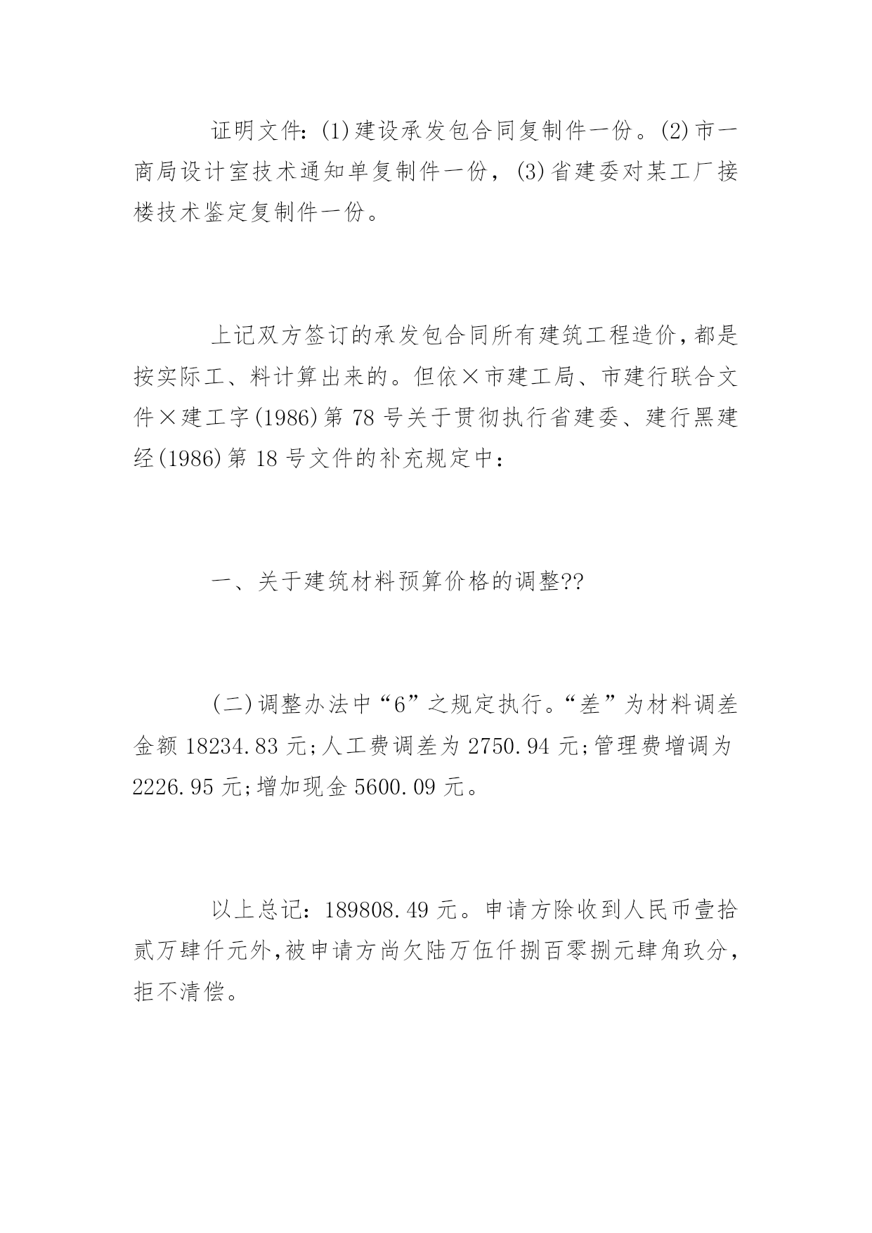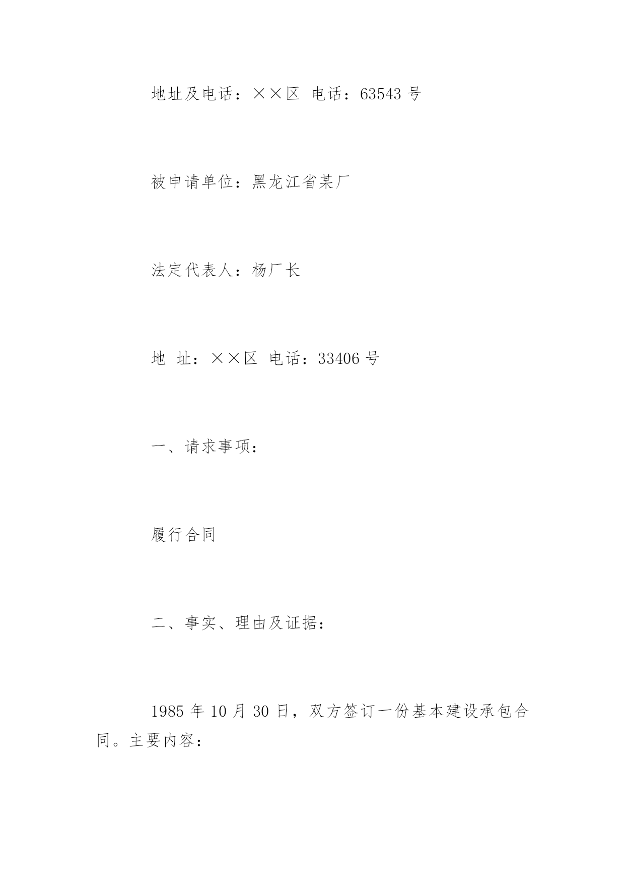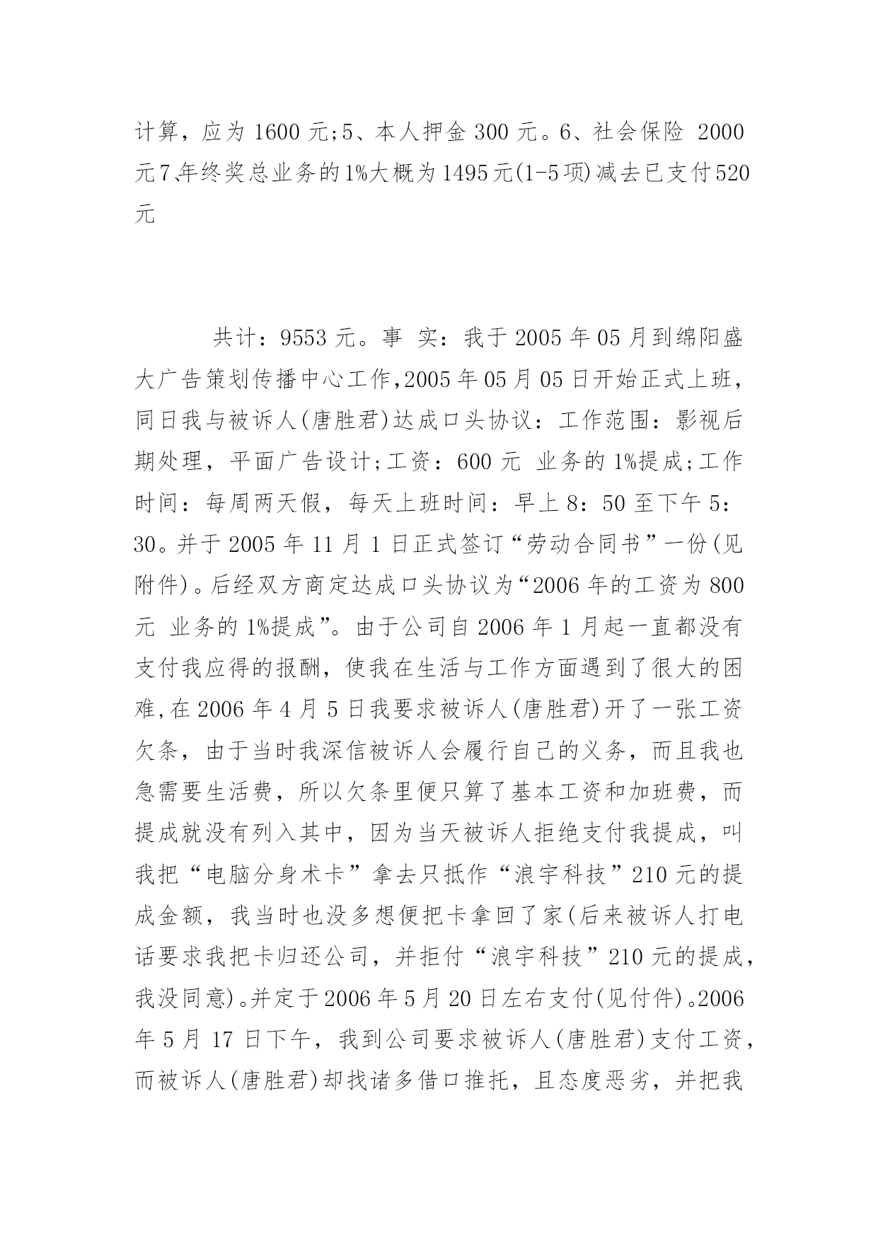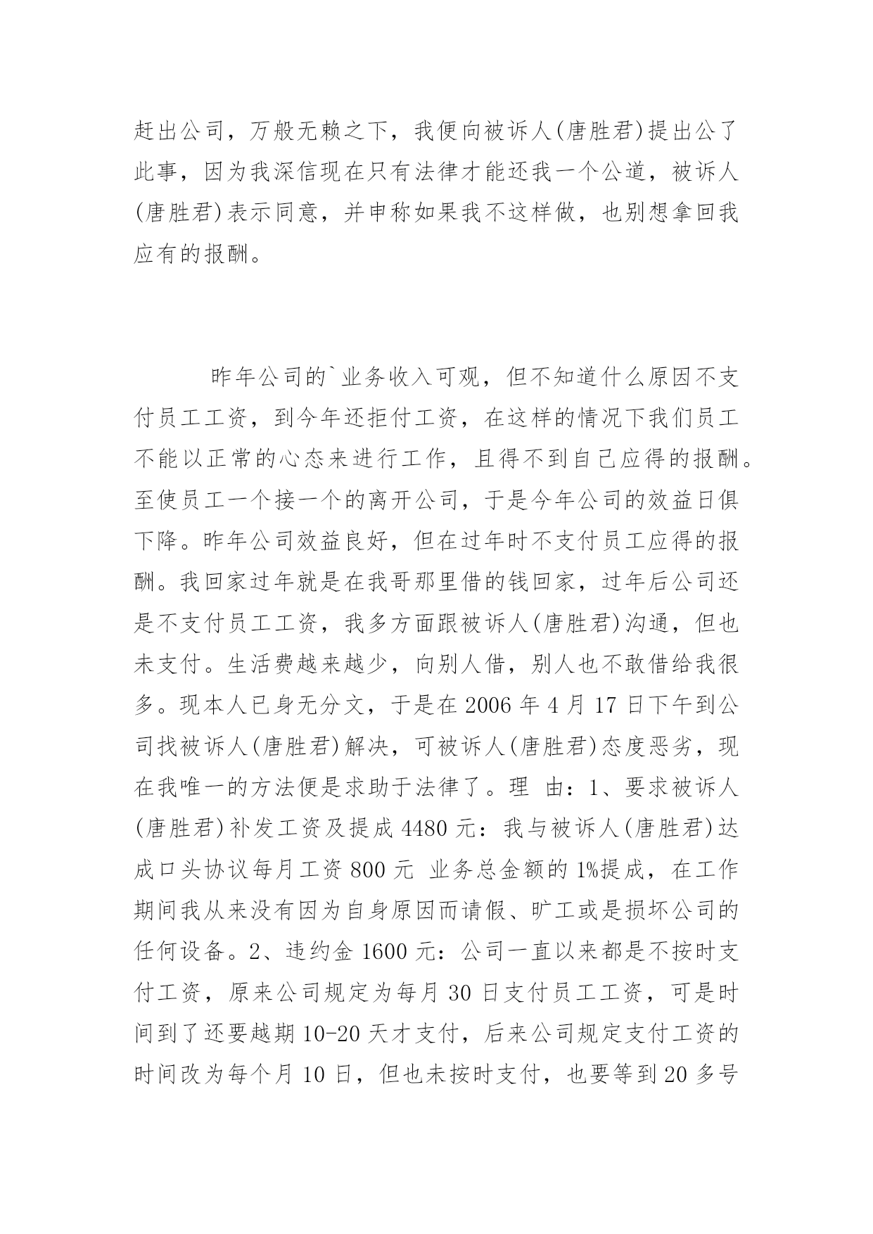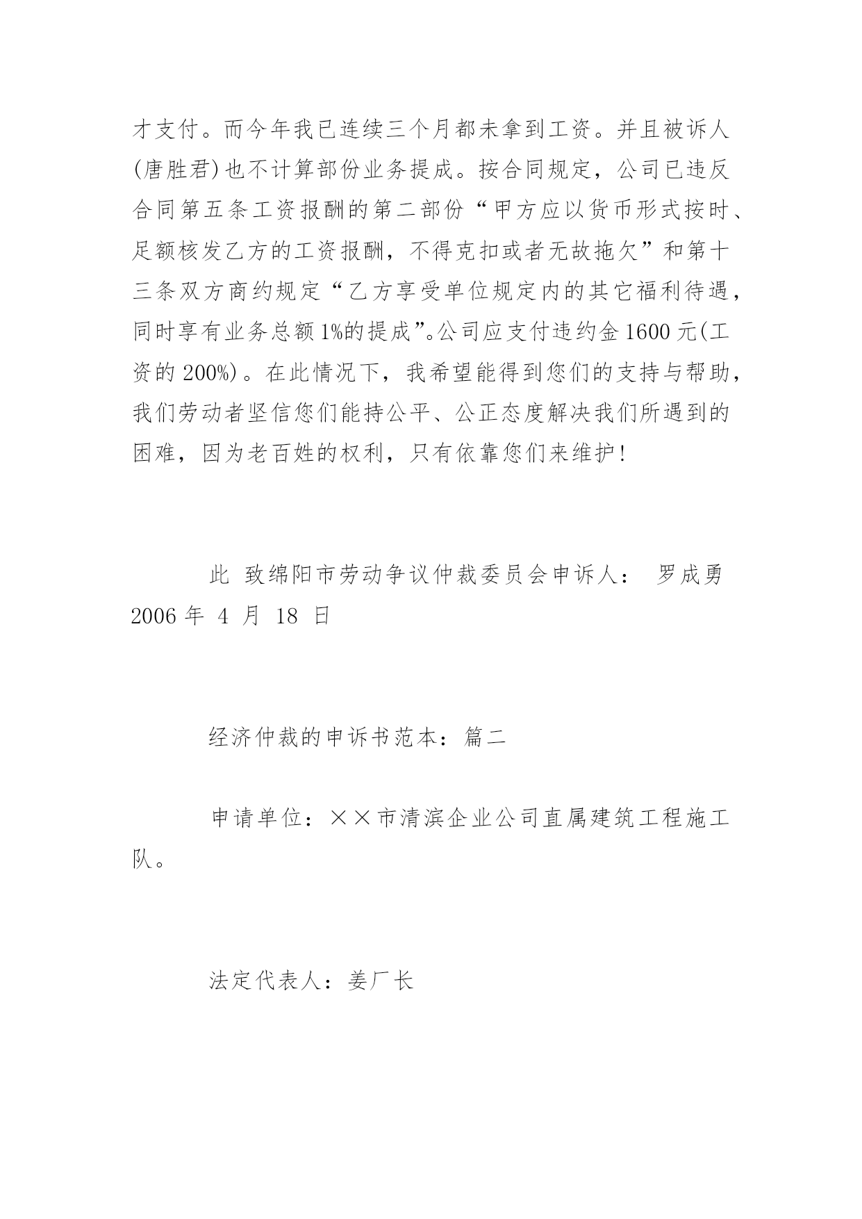 最新经济仲裁的申诉书2017最新经济仲裁的申诉书范本美国人对克林顿事件的不依不饶,是他们护法的坚定和对法律的绝对忠诚,这才是法制得以维持的基石。以下是小编精心为大家整理的经济仲裁的申诉书范本,推荐给大家参考,欢迎大家前来阅读。经济仲裁的申诉书范本:篇一申诉人:罗成勇地址:四川省绵阳市游仙区沈家坝北街联系电话:0816-6686587被诉单位:绵阳盛大广告策划传播中心被诉人:唐胜君地址:四川省绵阳市长虹大道南段37号电话:13158881181(唐胜君)法定代表人:唐胜君(总经理)请求事项:1、要求被诉人(唐胜君)补发三个月基本工资2200元;2、加班费1233元;3、提成1245元(按业务总金额的1%计算)其中包括:2005年12月30日提成未付清的93元;服装学校提成100元;春杯酒80元;鼎霸饲料42元;整形美容医院180元;小岛40元;浪宇科技按1500元的业务总金额30%计算,提成应为450元,已付240元还剩210元未付;拳击赛录像7天500元;4、违约金按基本工资的200%计算,应为1600元;5、本人押金300元。6、社会保险2000元7、年终奖总业务的1%大概为1495元(1-5项)减去已支付520元共计:9553元。事实:我于2005年05月到绵阳盛大广告策划传播中心工作,2005年05月05日开始正式上班,同日我与被诉人(唐胜君)达成口头协议:工作范围:影视后期处理,平面广告设计;工资:600元业务的1%提成;工作时间:每周两天假,每天上班时间:早上8:50至下午5:30。并于2005年11月1日正式签订“劳动合同书”一份(见附件)。后经双方商定达成口头协议为“2006年的工资为800元业务的1%提成”。由于公司自2006年1月起一直都没有支付我应得的报酬,使我在生活与工作方面遇到了很大的困难,在2006年4月5日我要求被诉人(唐胜君)开了一张工资欠条,由于当时我深信被诉人会履行自己的义务,而且我也急需要生活费,所以欠条里便只算了基本工资和加班费,而提成就没有列入其中,因为当天被诉人拒绝支付我提成,叫我把“电脑分身术卡”拿去只抵作“浪宇科技”210元的提成金额,我当时也没多想便把卡拿回了家(后来被诉人打电话要求我把卡归还公司,并拒付“浪宇科技”210元的提成,我没同意)。并定于2006年5月20日左右支付(见付件)。2006年5月17日下午,我到公司要求被诉人(唐胜君)支付工资,而被诉人(唐胜君)却找诸多借口推托,且态度恶劣,并把我赶出公司,万般无赖之下,我便向被诉人(唐胜君)提出公了此事,因为我深信现在只有法律才能还我一个公道,被诉人(唐胜君)表示同意,并申称如果我不这样做,也别想拿回我应有的报酬。昨年公司的`业务收入可观,但不知道什么原因不支付员工工资,到今年还拒付工资,在这样的情况下我们员工不能以正常的心态来进行工作,且得不到自己应得的报酬。至使员工一个接一个的离开公司,于是今年公司的效益日俱下降。昨年公司效益良好,但在过年时不支付员工应得的报酬。我回家过年就是在我哥那里借的钱回家,过年后公司还是不支付员工工资,我多方面跟被诉人(唐胜君)沟通,但也未支付。生活费越来越少,向别人借,别人也不敢借给我很多。现本人已身无分文,于是在2006年4月17日下午到公司找被诉人(唐胜君)解决,可被诉人(唐胜君)态度恶劣,现在我唯一的方法便是求助于法律了。理由:1、要求被诉人(唐胜君)补发工资及提成4480元:我与被诉人(唐胜君)达成口头协议每月工资800元业务总金额的1%提成,在工作期间我从来没有因为自身原因而请假、旷工或是损坏公司的任何设备。2、违约金1600元:公司一直以来都是不按时支付工资,原来公司规定为每月30日支付员工工资,可是时间到了还要越期10-20天才支付,后来公司规定支付工资的时间改为每个月10日,但也未按时支付,也要等到20多号才支付。而今年我已连续三个月都未拿到工资。并且被诉人(唐胜君)也不计算部份业务提成。按合同规定,公司已违反合同第五条工资报酬的第二部份“甲方应以货币形式按时、足额核发乙方的工资报酬,不得克扣或者无故拖欠”和第十三条双方商约规定“乙方享受单位规定内的其它福利待遇,同时享有业务总额1%的提成”。公司应支付违约金1600元(工资的200%)。在此情况下,我希望能得到您们的支持与帮助,我们劳动者坚信您们能持公平、公正态度解决我们所遇到的困难,因为老百姓的权利,只有依靠您们来维护!此致绵阳市劳动争议仲裁委员会申诉人:罗成勇2006年4月18日经济仲裁的申诉书范本:篇二申请单位:××市清滨企业公司直属建筑工程施工队。法定代表人:姜厂长地址及电话:××区电话:63543号被申请单位:黑龙江省某厂法定代表人:杨厂长地址:××区电话:33406号一、请求事项