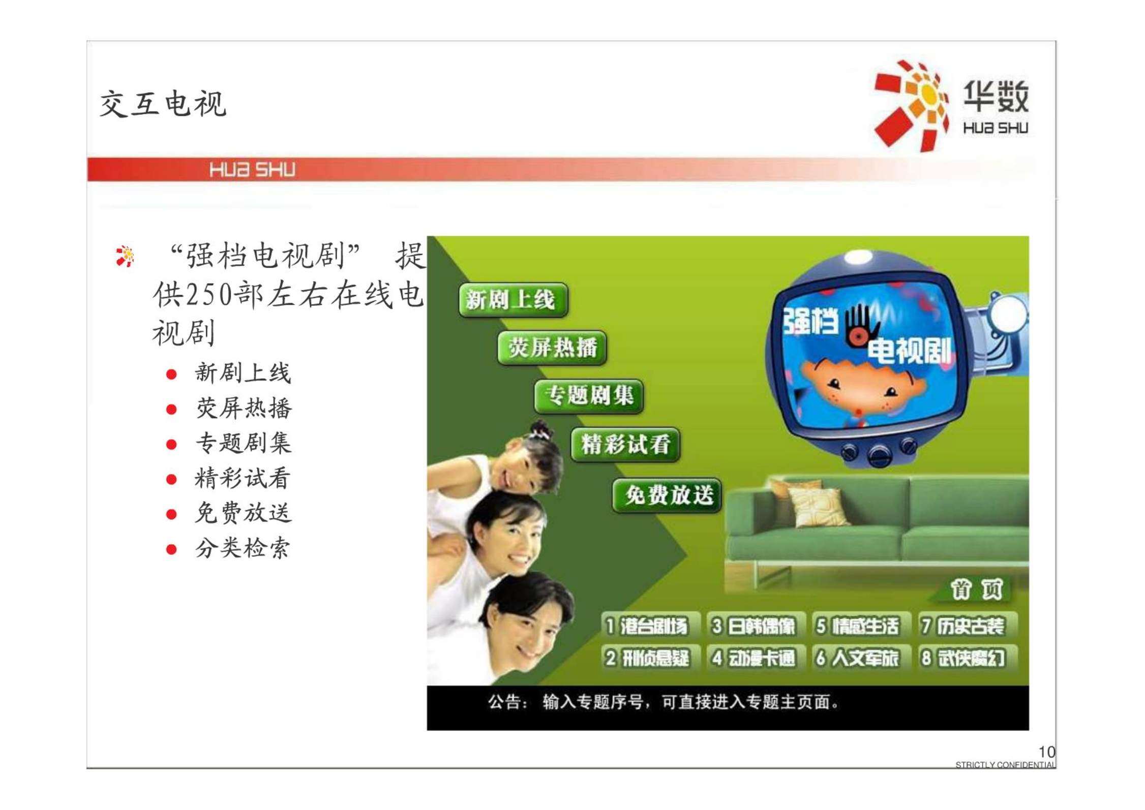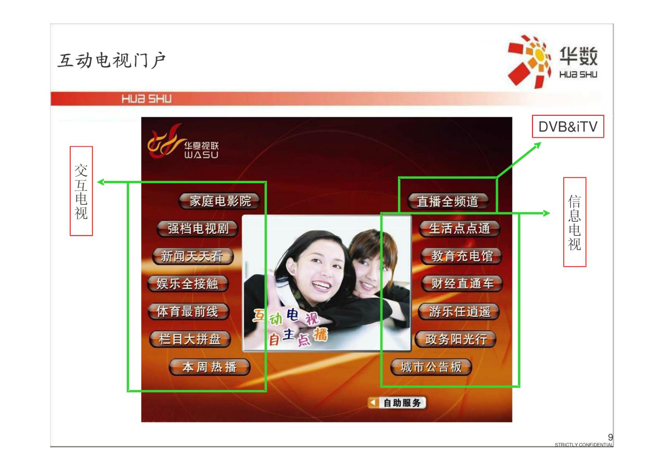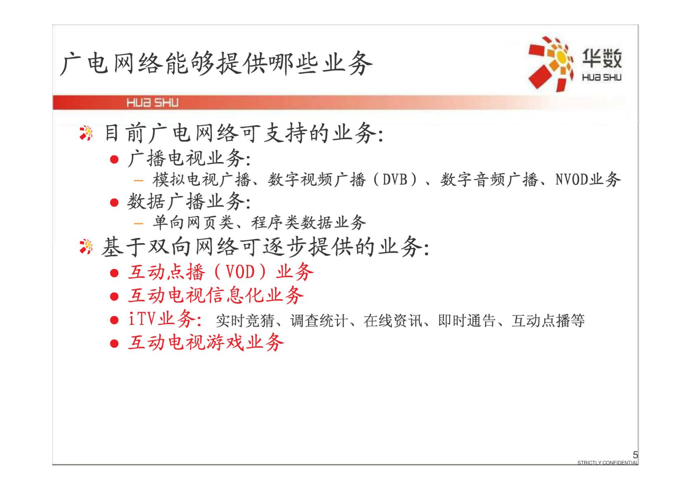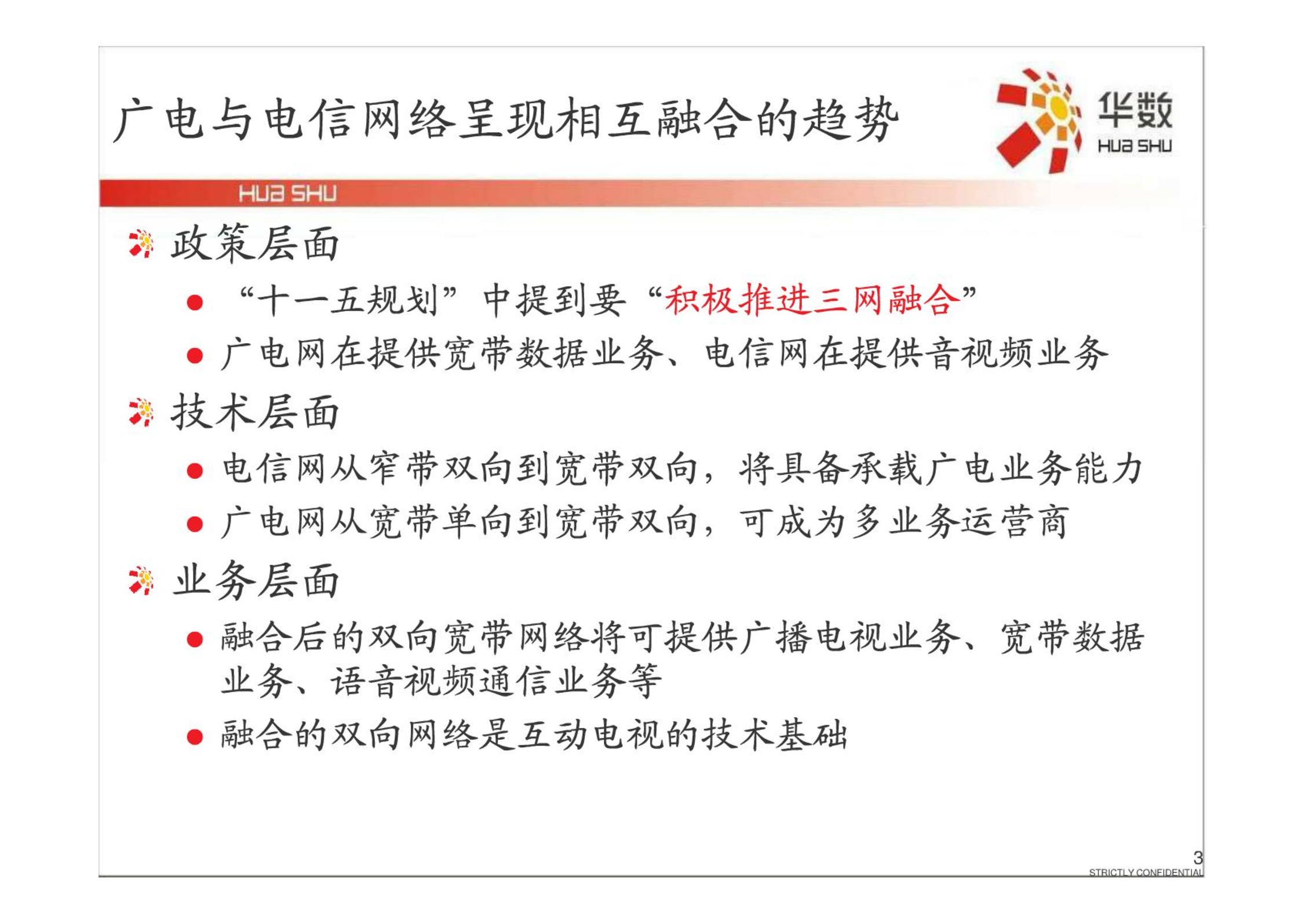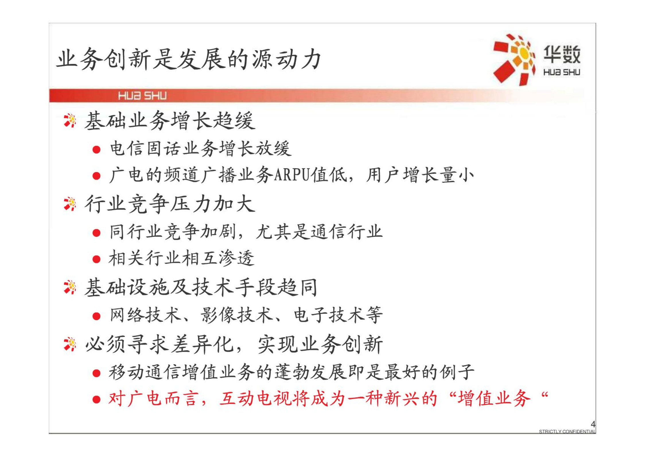 互动电视:数字电视全业务运营的新起点随着数字技术、网络技术的快速发展和普及应用,目前世界广播影视正处在从模拟技术向数字技术全面转换的关键时期,各国政府正大力推进广播影视数字化,发展广播影视数字内容产业。在国内相关行业已完成从模拟技术向数字技术的转换,具备了提供音视频服务的能力,广播电视与通信、互联网等行业正处在融合、汇聚、转型过程中。另一方面,伴随广大人民群众物质文化和精神生活的提高,人们对双向互动数字电视业务的需求日益增加,相关行业利用数字技术、采用各种方式正力图进入传统的广播影视服务领域,收音机、电视