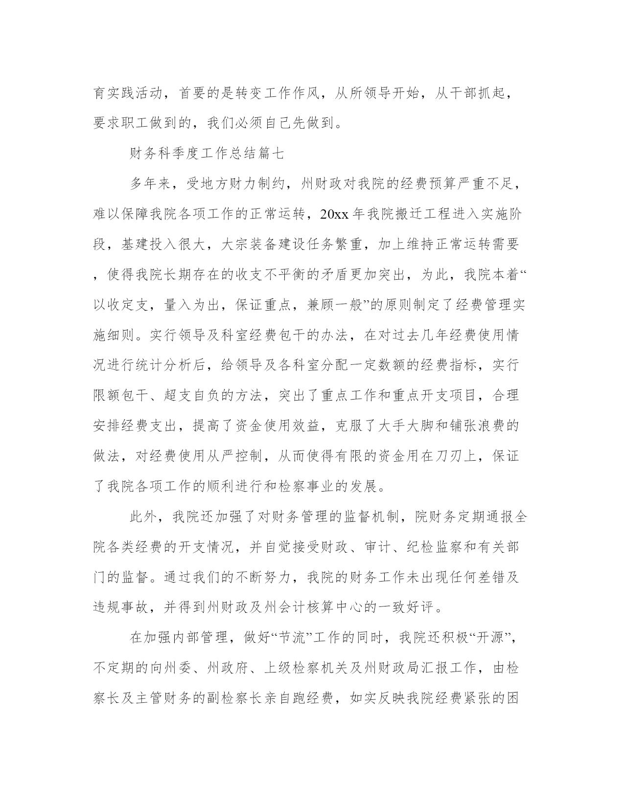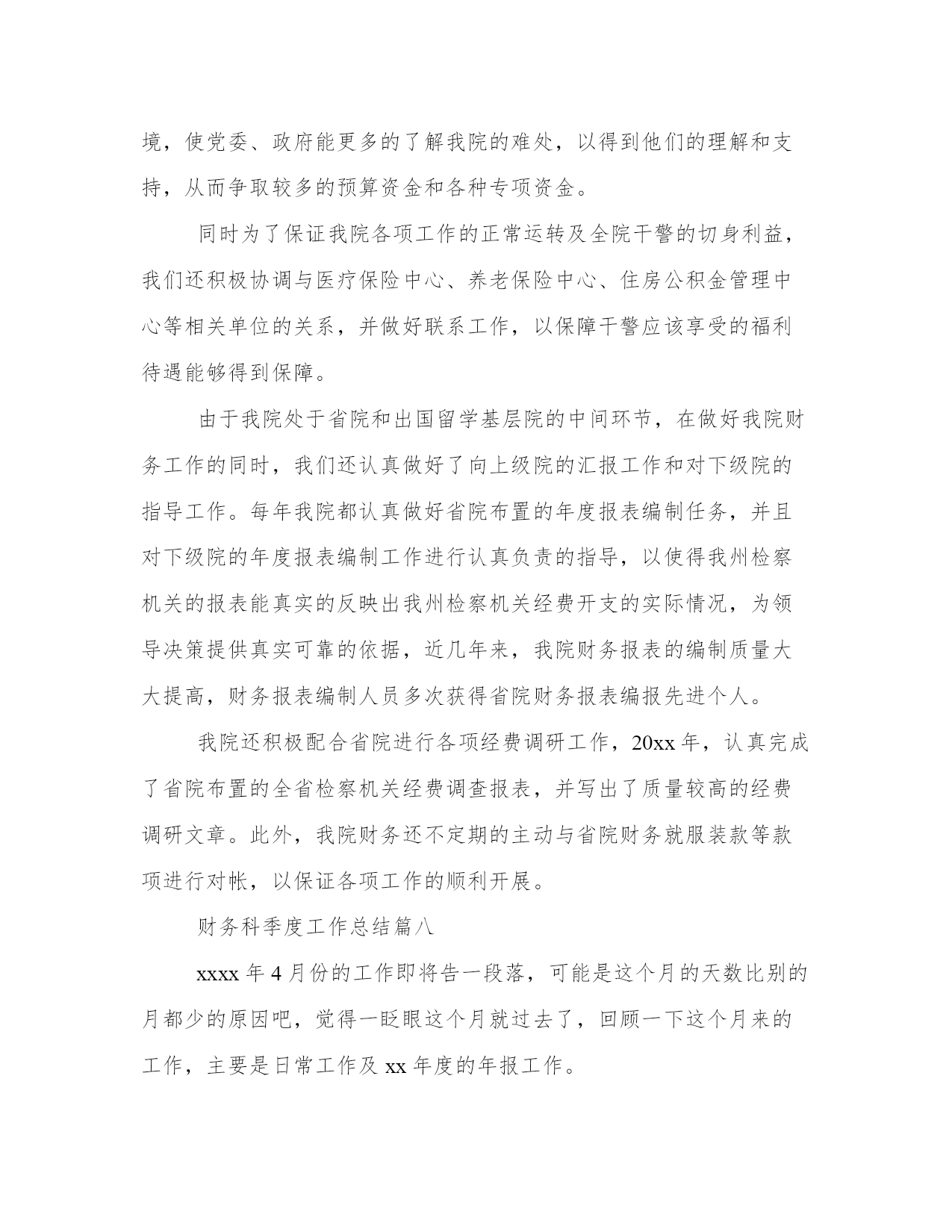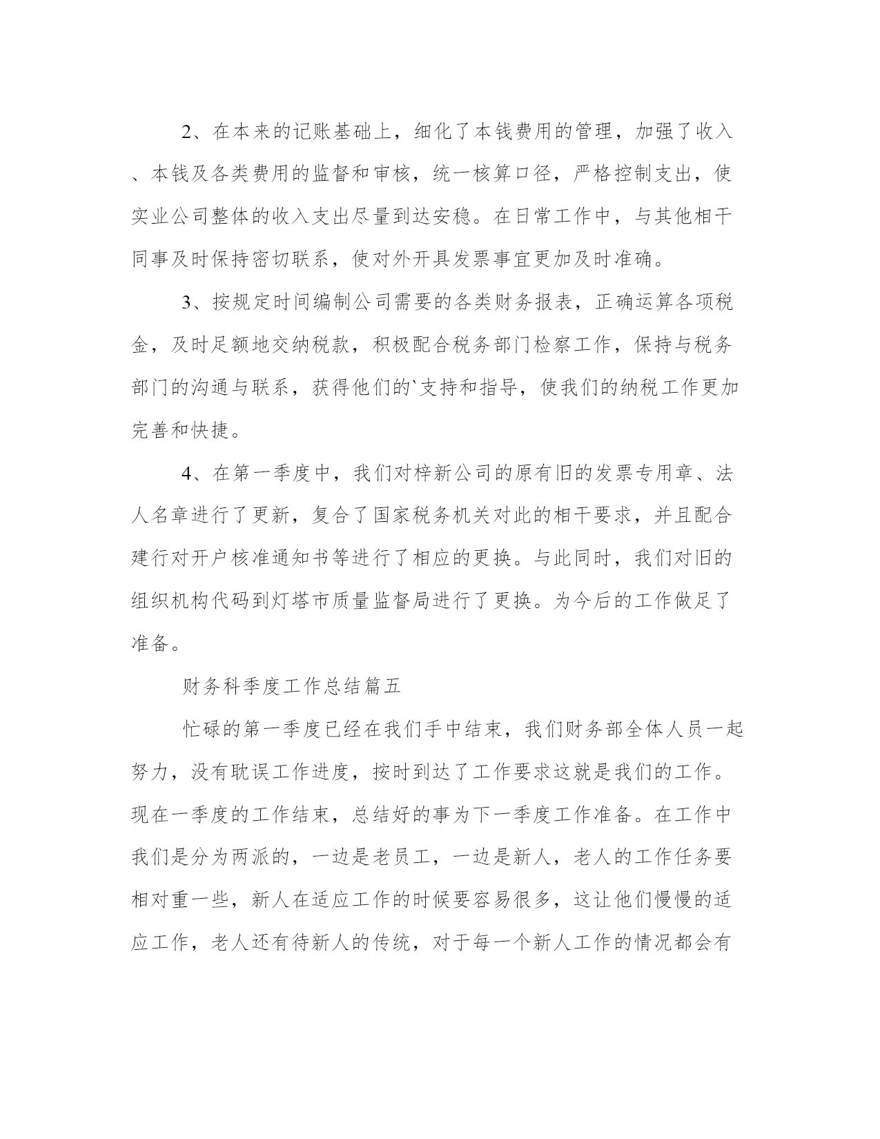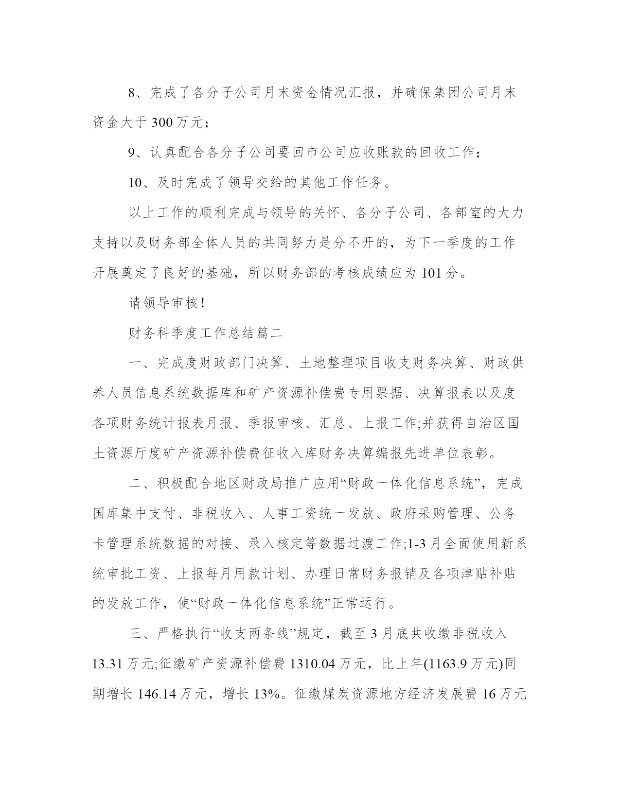最新财务科季度工作总结季度财务工作总结财务工作总结(模板10篇)总结是在一段时间内对学习和工作生活等表现加以总结和概括的一种书面材料,它可以促使我们思考,我想我们需要写一份总结了吧。那么,我们该怎么写总结呢?以下我给大家整理了一些优质的总结范文,希望对大家能够有所帮助。财务科季度工作总结篇一根据周口龙润电力(集团)有限公司机关部室绩效考核办法和规定,财务部建立了相关的制度及实施方案,并较好的完成了x年第一季度各项指标任务,现将第一季度工作情况汇报如下:2、按期完成了第一季度的财务分析,完善了一些财务报表的编制;3、在各分子公司的积极配合下,顺利完成了第一季度利润上缴工作;4、与税务机关积极沟通,按时完成了x年企业所得税汇算申报工作;5、按月上报省市公司各种财务报表;6、认真做好货币资金的管理,确保了集团公司资金安全。7、制订了专项资金管理方案,并将其实施于集团公司专项资金专项管理工作中去;8、完成了各分子公司月末资金情况汇报,并确保集团公司月末资金大于300万元;9、认真配合各分子公司要回市公司应收账款的回收工作;10、及时完成了领导交给的其他工作任务。以上工作的顺利完成与领导的关怀、各分子公司、各部室的大力支持以及财务部全体人员的共同努力是分不开的,为下一季度的工作开展奠定了良好的基础,所以财务部的考核成绩应为101分。请领导审核!财务科季度工作总结篇二一、完成度财政部门决算、土地整理项目收支财务决算、财政供养人员信息系统数据库和矿产资源补偿费专用票据、决算报表以及度各项财务统计报表月报、季报审核、汇总、上报工作;并获得自治区国土资源厅度矿产资源补偿费征收入库财务决算编报先进单位表彰。二、积极配合地区财政局推广应用“财政一体化信息系统”,完成国库集中支付、非税收入、人事工资统一发放、政府采购管理、公务卡管理系统数据的对接、录入核定等数据过渡工作;1-3月全面使用新系统审批工资、上报每月用款计划、办理日常财务报销及各项津贴补贴的发放工作,使“财政一体化信息系统”正常运行。三、严格执行“收支两条线”规定,截至3月底共收缴非税收入13.31万元;征缴矿产资源补偿费1310.04万元,比上年(1163.9万元)同期增长146.14万元,增长13%。征缴煤炭资源地方经济发展费16万元,没有转移和截留收入,坐收坐支、公款私存和私设“小金库”等违纪行为。四、配合中介机构提交土地整理项目竣工财务决算和审计资料,为土地整理项目初验做好准备工作。五、及时办理公积金、社保资金的转入、提取、合并、补缴手续,确保职工个人公积金、社保账户资金正常使用。按照地区社保局办理社会保障卡的要求,完成局机关在职人员资料信息的确认、提交和审核,保障办卡前期工作顺利完成,基础信息真实有效。六、对以来固定资产进行清查,以掌握固定资产卡片的实有数量,查明有无丢失、毁损或未入帐的固定资产,做好资产清查工作的档案整理、归档工作。七、对三公经费(因公出国境、公务车购置及运行、公务接待)和基本公用支出进行公示,做到财务支出公开透明、各项支出有依有据。八、完成领导交办的其他工作。财务科季度工作总结篇三光阴似箭,一年又过去了。回首这一年,本人在工作岗位中勤勤恳恳、脚踏实地,做好本职工作的同时也较为积极地协作各部门的工作,根本完成了所里下达的工作任务,现将全年的工作状况作如下总结,盼望与大家共勉。10、按时缴纳办公场所的房租、物业、水电、宽带、固话及移动电话等所需费用,按需订购工作所用的报刊书籍、软件硬件、办公文具、饮用水、卷筒纸、洗手液、洗洁精等等,定期处理工作中产生的废纸张、废报纸等物品。尽量为大家营造一个良好的工作环境,为所里开展日常工作供应有力的后勤保障。本人在工作中还存在很多缺乏,盼望大家多沟通沟通,批判指正,齐心协力使我们五所更加团结,更加强大。首先,对财务制度还缺乏系统的熟悉。我将努力加强财务学问的学习,力求尽快把握最新的会计准则、税法细则及相关的法律学问。除了书本上的学问,网上也找一些讲座视频,学习业务精英们的阅历心得,我还将虚心向本行业的朋友、前辈请教,争取理论结合实际,使自己的业务水平不断提高。其次,一些工作做得不够细致。比方说,收支明细表中的某些分项过于笼统,不能很清楚地反映出工程所需的信息。这方面,我会努力钻研,同时结合设计行业的特点,尽可能把收入和支出的每个环节细化,但又不会过于琐碎,主要目的是让各种财务报表清楚、明白,便于统计,使其对我们所的整体运营能真正起到指导性的作用。最终,有时会心情化。这也是我的一个缺乏,工作中间或会消失不耐烦的状况。其实更多时候我没有别的意思,只是心烦了不留意自己的语气,盼望大家谅解。今后,我会尽量掌握好自己,不把生活中的心情带到工作中,遇到事情大家好好商议,好好沟通,