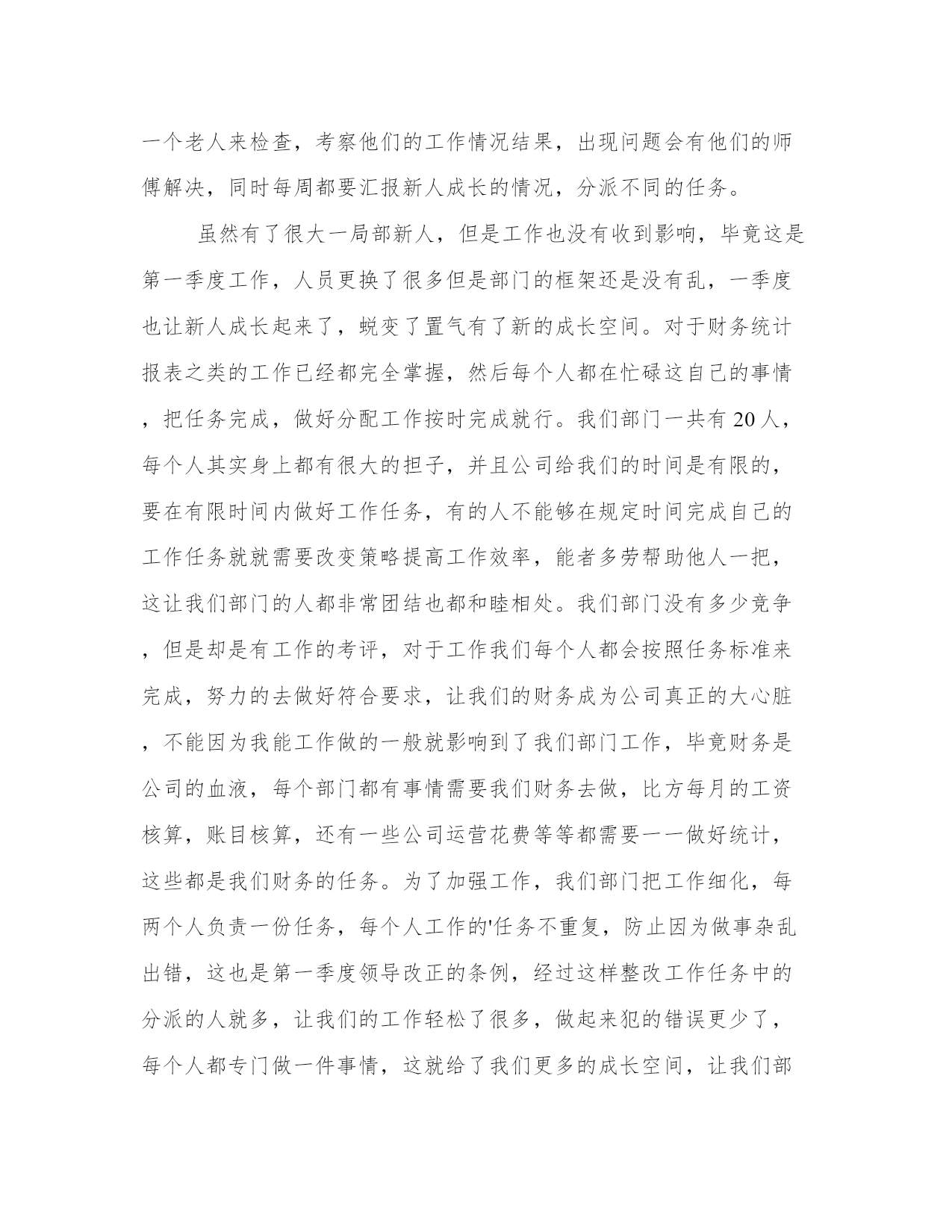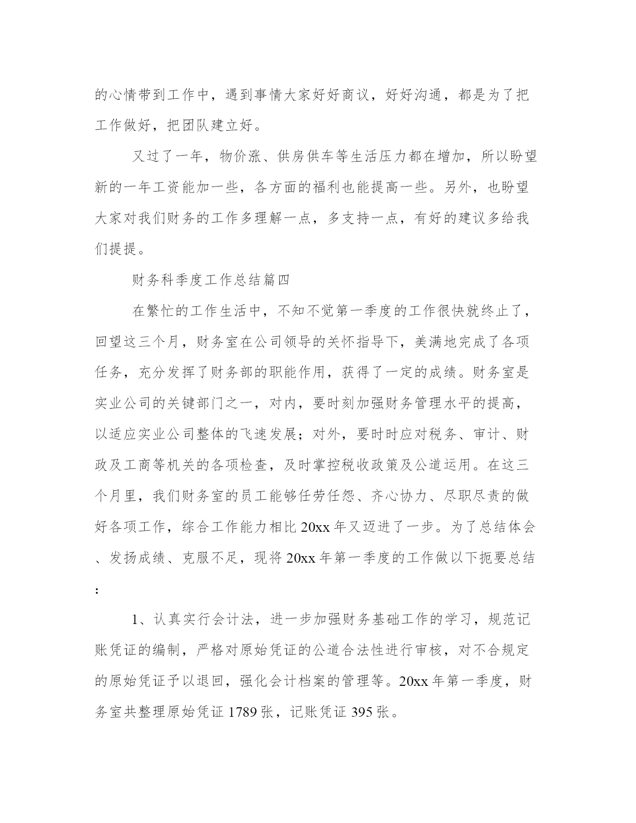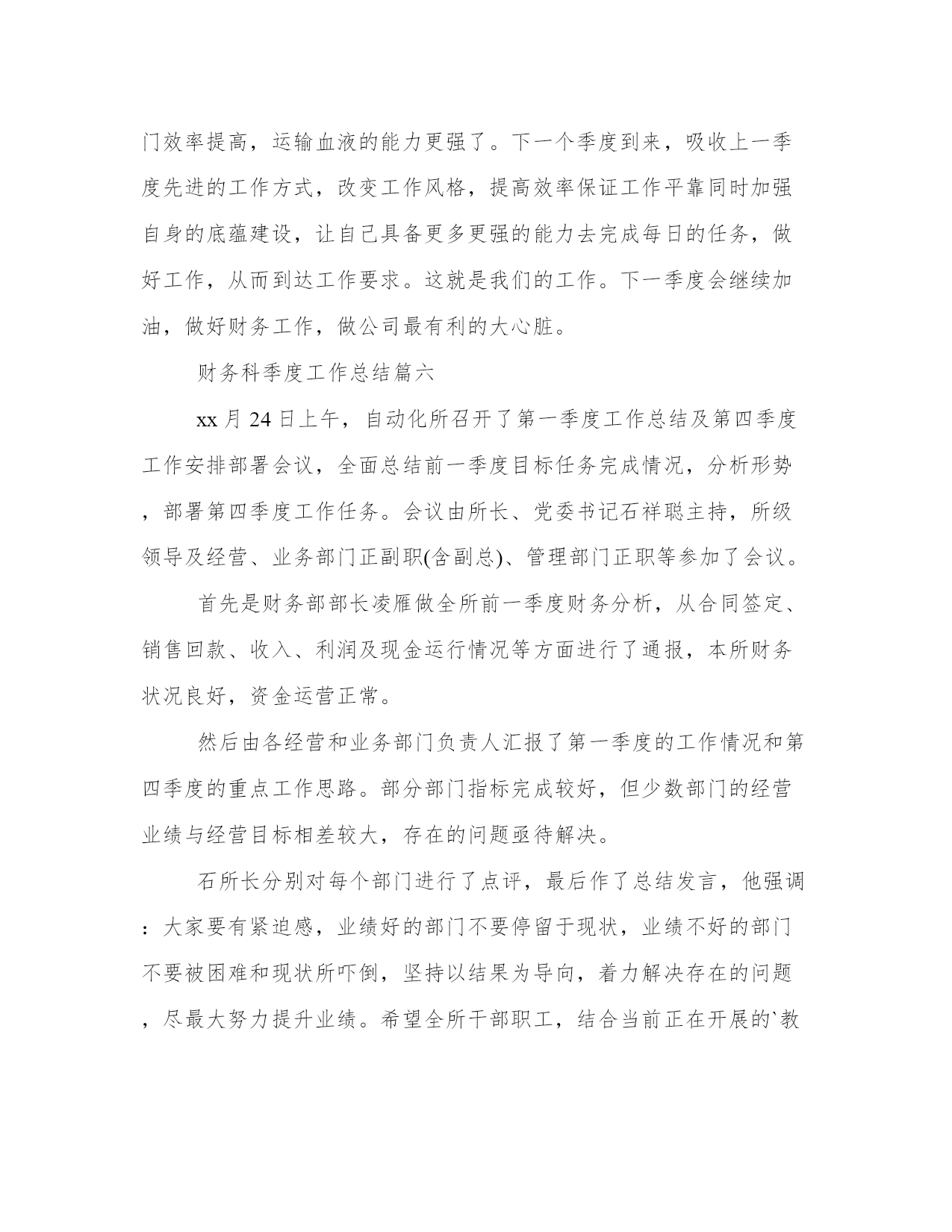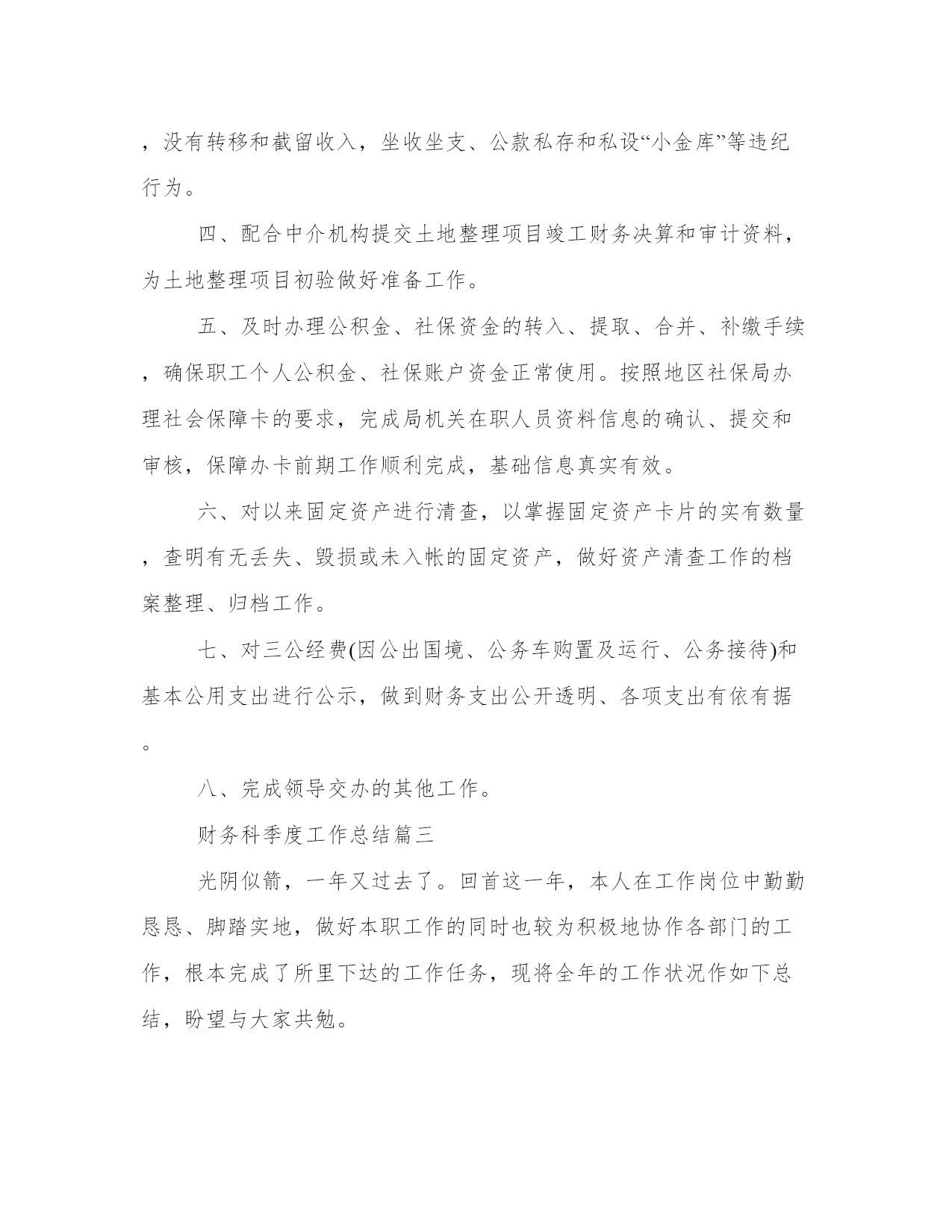 最新财务科季度工作总结季度财务工作总结财务工作总结(模板10篇)总结是在一段时间内对学习和工作生活等表现加以总结和概括的一种书面材料,它可以促使我们思考,我想我们需要写一份总结了吧。那么,我们该怎么写总结呢?以下我给大家整理了一些优质的总结范文,希望对大家能够有所帮助。财务科季度工作总结篇一根据周口龙润电力(集团)有限公司机关部室绩效考核办法和规定,财务部建立了相关的制度及实施方案,并较好的完成了x年第一季度各项指标任务,现将第一季度工作情况汇报如下:2、按期完成了第一季度的财务分析,完善了一些财务报表的编制;3、在各分子公司的积极配合下,顺利完成了第一季度利润上缴工作;4、与税务机关积极沟通,按时完成了x年企业所得税汇算申报工作;5、按月上报省市公司各种财务报表;6、认真做好货币资金的管理,确保了集团公司资金安全。7、制订了专项资金管理方案,并将其实施于集团公司专项资金专项管理工作中去;8、完成了各分子公司月末资金情况汇报,并确保集团公司月末资金大于300万元;9、认真配合各分子公司要回市公司应收账款的回收工作;10、及时完成了领导交给的其他工作任务。以上工作的顺利完成与领导的关怀、各分子公司、各部室的大力支持以及财务部全体人员的共同努力是分不开的,为下一季度的工作开展奠定了良好的基础,所以财务部的考核成绩应为101分。请领导审核!财务科季度工作总结篇二一、完成度财政部门决算、土地整理项目收支财务决算、财政供养人员信息系统数据库和矿产资源补偿费专用票据、决算报表以及度各项财务统计报表月报、季报审核、汇总、上报工作;并获得自治区国土资源厅度矿产资源补偿费征收入库财务决算编报先进单位表彰。二、积极配合地区财政局推广应用“财政一体化信息系统”,完成国库集中支付、非税收入、人事工资统一发放、政府采购管理、公务卡管理系统数据的对接、录入核定等数据过渡工作;1-3月全面使用新系统审批工资、上报每月用款计划、办理日常财务报销及各项津贴补贴的发放工作,使“财政一体化信息系统”正常运行。三、严格执行“收支两条线”规定,截至3月底共收缴非税收入13.31万元;征缴矿产资源补偿费1310.04万元,比上年(1163.9万元)同期增长146.14万元,增长13%。征缴煤炭资源地方经济发展费16万元,没有转移和截留收入,坐收坐支、公款私存和私设“小金库”等违纪行为。四、配合中介机构提交土地整理项目竣工财务决算和审计资料,为土地整理项目初验做好准备工作。五、及时办理公积金、社保资金的转入、提取、合并、补缴手续,确保职工个人公积金、社保账户资金正常使用。按照地区社保局办理社会保障卡的要求,完成局机关在职人员资料信息的确认、提交和审核,保障办卡前期工作顺利完成,基础信息真实有效。六、对以来固定资产进行清查,以掌握固定资产卡片的实有数量,查明有无丢失、毁损或未入帐的固定资产,做好资产清查工作的档案整理、归档工作。七、对三公经费(因公出国境、公务车购置及运行、公务接待)和基本公用支出进行公示,做到财务支出公开透明、各项支出有依有据。八、完成领导交办的其他工作。财务科季度工作总结篇三光阴似箭,一年又过去了。回首这一年,本人在工作岗位中勤勤恳恳、脚踏实地,做好本职工作的同时也较为积极地协作各部门的工作,根本完成了所里下达的工作任务,现将全年的工作状况作如下总结,盼望与大家共勉。10、按时缴纳办公场所的房租、物业、水电、宽带、固话及移动电话等所需费用,按需订购工作所用的报刊书籍、软件硬件、办公文具、饮用水、卷筒纸、洗手液、洗洁精等等,定期处理工作中产生的废纸张、废报纸等物品。尽量为大家营造一个良好的工作环境,为所里开展日常工作供应有力的后勤保障。本人在工作中还存在很多缺乏,盼望大家多沟通沟通,批判指正,齐心协力使我们五所更加团结,更加强大。首先,对财务制度还缺乏系统的熟悉。我将努力加强财务学问的学习,力求尽快把握最新的会计准则、税法细则及相关的法律学问。除了书本上的学问,网上也找一些讲座视频,学习业务精英们的阅历心得,我还将虚心向本行业的朋友、前辈请教,争取理论结合实际,使自己的业务水平不断提高。其次,一些工作做得不够细致。比方说,收支明细表中的某些分项过于笼统,不能很清楚地反映出工程所需的信息。这方面,我会努力钻研,同时结合设计行业的特点,尽可能把收入和支出的每个环节细化,但又不会过于琐碎,主要目的是让各种财务报表清楚、明白,便于统计,使其对我们所的整体运营能真正起到指导性的作用。最终,有时会心情化。这也是我的一个缺乏,工作中间或会消失不耐烦的状况。其实更多时候我没有别的意思,只是心烦了不留意自己的语气,盼望大家谅解。今后,我会尽量掌握好自己,不把生活中的心情带到工作中,遇到事情大家好好商议,好好沟通,