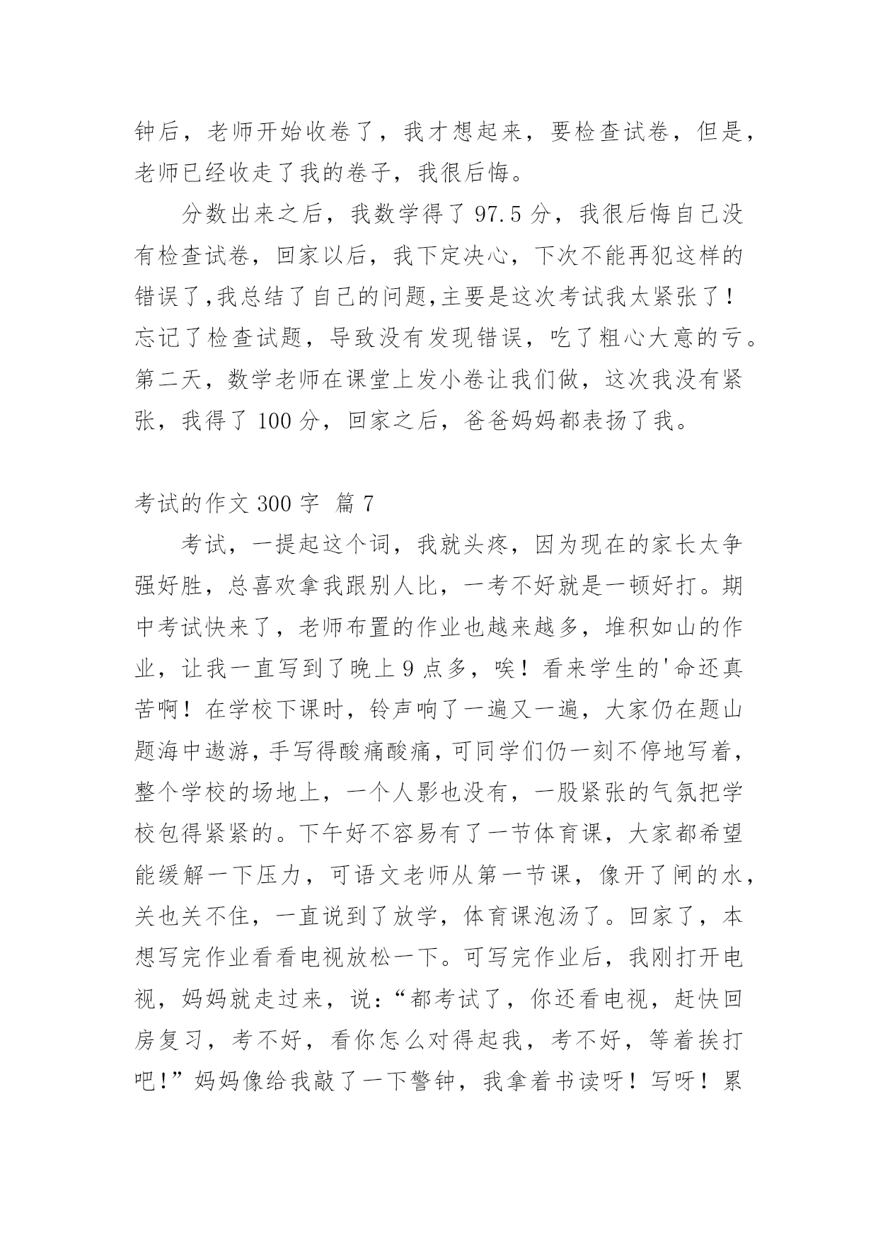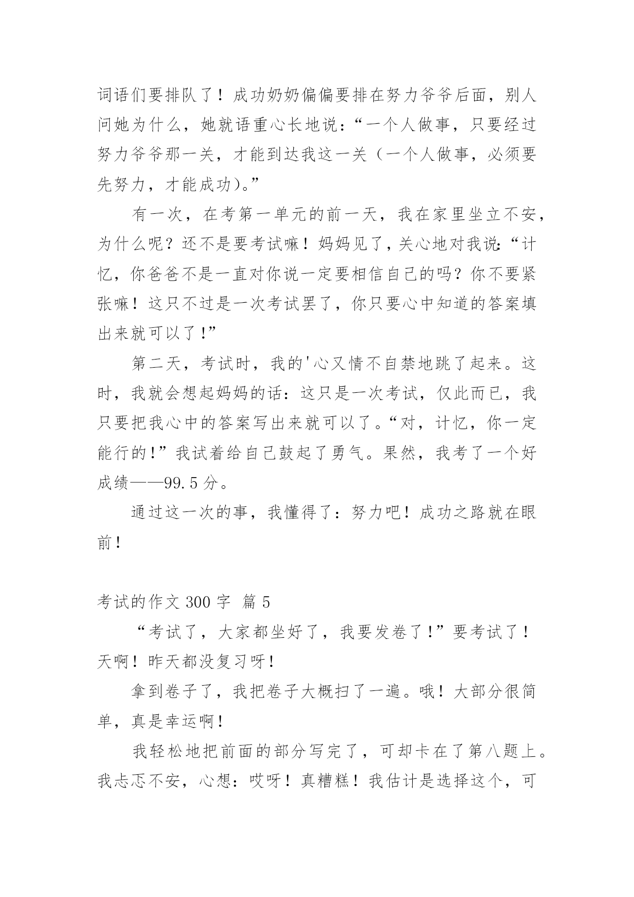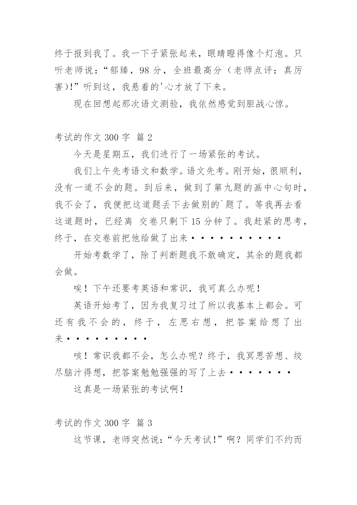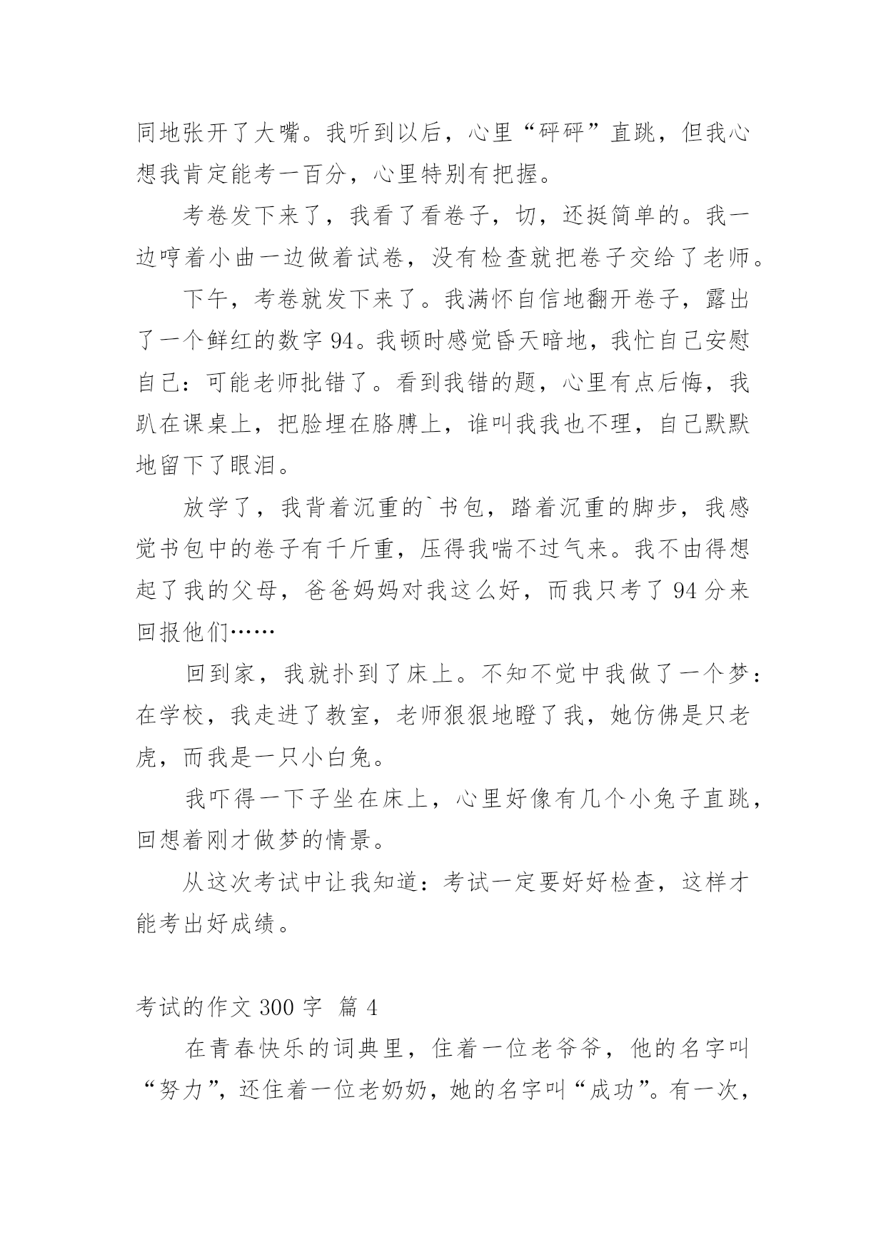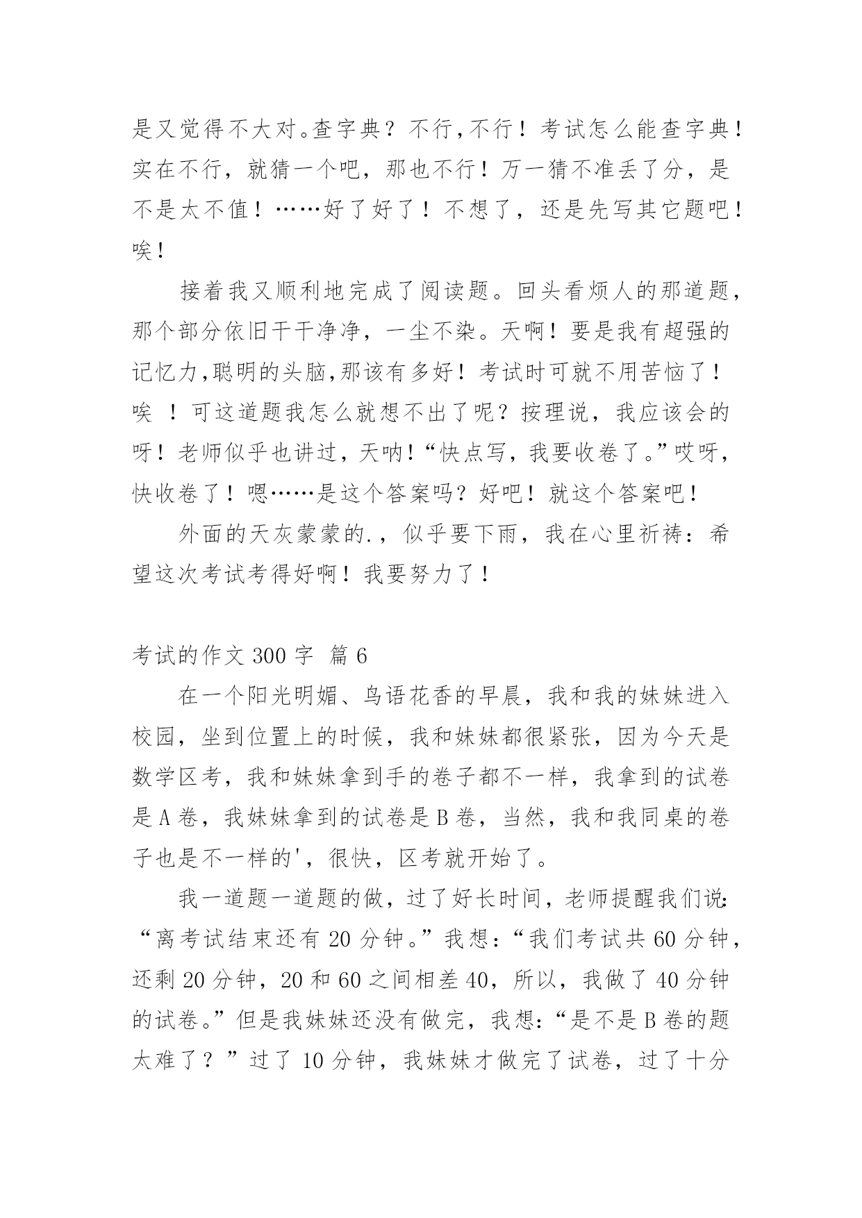 考试的作文300字实用的考试的作文300字锦集七篇在学习、工作或生活中,大家或多或少都会接触过作文吧,作文一定要做到主题集中,围绕同一主题作深入阐述,切忌东拉西扯,主题涣散甚至无主题。怎么写作文才能避免踩雷呢?以下是小编帮大家整理的考试的作文300字7篇,欢迎大家分享。考试的作文300字篇1期中考试来临了,让我最紧张的还是那语文测验。监考老师走进考场,发好试卷,我就开始提笔做题了。前面的题目比较简单,都难不倒我,我也做得比较顺利。做到一小半,我忽然被一道题给难住了。我绞尽脑汁想了一会儿,还是没做出来。这时,监考老师说:“同学们,不会做的题目先空着,把下面会做的题目先做完再做吧!”于是,我先做了下面的题。这时我心想:嘿,这下死定了!做到试卷最后是写作文了。写作文我最在行,“唰唰唰”一下子我就写好了(老师点评:真是快写大王啊)。于是我接着做那道没做出来的题。我想呀想,写呀写,擦呀擦……呀,终于写出来了(老师点评:可真不容易)!我这心里比刷了蜜还甜!我想,语文这下分数不会差了。快要放学了,语文老师终于公布成绩了。我仔细地听着,终于报到我了。我一下子紧张起来,眼睛瞪得像个灯泡。只听老师说:“郁臻,98分,全班最高分(老师点评:真厉害)!”听到这,我悬着的'心才放了下来。现在回想起那次语文测验,我依然感觉到胆战心惊。考试的作文300字篇2今天是星期五,我们进行了一场紧张的考试。我们上午先考语文和数学。语文先考。刚开始,很顺利,没有一道不会的题。到后来,做到了第九题的画中心句时,我不会了,我便把这道题丢下去做别的`题了。等我再去看这道题时,已经离交卷只剩下15分钟了。我赶紧的思考,终于,在交卷前把他给做了出来··········开始考数学了,除了判断题我不敢确定,其余的题我都会做。唉!下午还要考英语和常识,我可真么办呢!英语开始考了,因为我复习过了所以我基本上都会。可还有我不会的,终于,左思右想,把答案给想了出来·········咳!常识我都不会,怎么办呢?终于,我冥思苦想、绞尽脑汁得想,把答案勉勉强强的写了上去·······这真是一场紧张的考试啊!考试的作文300字篇3这节课,老师突然说:“今天考试!”啊?同学们不约而同地张开了大嘴。我听到以后,心里“砰砰”直跳,但我心想我肯定能考一百分,心里特别有把握。考卷发下来了,我看了看卷子,切,还挺简单的。我一边哼着小曲一边做着试卷,没有检查就把卷子交给了老师。下午,考卷就发下来了。我满怀自信地翻开卷子,露出了一个鲜红的数字94。我顿时感觉昏天暗地,我忙自己安慰自己:可能老师批错了。看到我错的题,心里有点后悔,我趴在课桌上,把脸埋在胳膊上,谁叫我我也不理,自己默默地留下了眼泪。放学了,我背着沉重的`书包,踏着沉重的脚步,我感觉书包中的卷子有千斤重,压得我喘不过气来。我不由得想起了我的父母,爸爸妈妈对我这么好,而我只考了94分来回报他们……回到家,我就扑到了床上。不知不觉中我做了一个梦:在学校,我走进了教室,老师狠狠地瞪了我,她仿佛是只老虎,而我是一只小白兔。我吓得一下子坐在床上,心里好像有几个小兔子直跳,回想着刚才做梦的情景。从这次考试中让我知道:考试一定要好好检查,这样才能考出好成绩。考试的作文300字篇4在青春快乐的词典里,住着一位老爷爷,他的名字叫“努力”,还住着一位老奶奶,她的名字叫“成功”。有一次,词语们要排队了!成功奶奶偏偏要排在努力爷爷后面,别人问她为什么,她就语重心长地说:“一个人做事,只要经过努力爷爷那一关,才能到达我这一关(一个人做事,必须要先努力,才能成功)。”有一次,在考第一单元的前一天,我在家里坐立不安,为什么呢?还不是要考试嘛!妈妈见了,关心地对我说:“计忆,你爸爸不是一直对你说一定要相信自己的吗?你不要紧张嘛!这只不过是一次考试罢了,你只要心中知道的答案填出来就可以了!”第二天,考试时,我的'心又情不自禁地跳了起来。这时,我就会想起妈妈的话:这只是一次考试,仅此而已,我只要把我心中的答案写出来就可以了。“对,计忆,你一定能行的!”我试着给自己鼓起了勇气。果然,我考了一个好成绩——99.5分。通过这一次的事,我懂得了:努力吧!成功之路就在眼前!考试的作文300字篇5“考试了,大家都坐好了,我要发卷了!”要考试了!天啊!昨天都没复习呀!拿到卷子了,我把卷子大概扫了一遍。哦!大部分很简单,真是幸运啊!我轻松地把前面的部分写完了,可却卡在了第八题上。我忐忑不安,心想:哎呀!真糟糕!我估计是选择这个,可是又觉得不大对。查字典?不行,不行!考试怎么能查字典!实在不行,就猜一个吧,那也不行!万一猜不准丢了分,是不是太不值!……好了好了!不想了,还是先写其它题吧!唉!接着我又顺利地完成了阅读题。回头看烦人的那道题,那个部分依旧干干净净,一尘不染。天啊!要是我有超强的记忆力,聪明