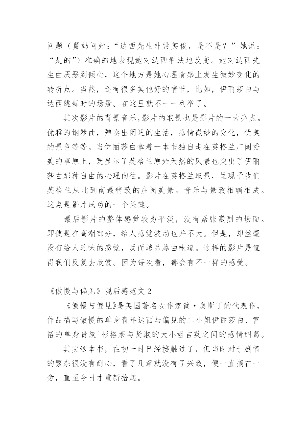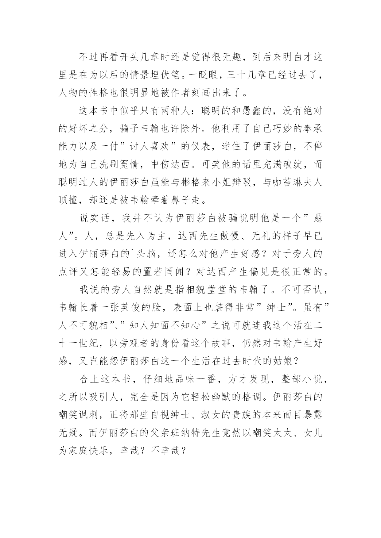 《傲慢与偏见》观后感《傲慢与偏见》观后感范文当看完一部影视作品后,相信你会有不少感想吧,为此需要好好认真地写观后感。现在你是否对观后感一筹莫展呢?下面是小编为大家收集的《傲慢与偏见》观后感范文,欢迎大家分享。《傲慢与偏见》观后感范文1看完《傲慢与偏见》这部浪漫唯美的电影,让我最大的感悟就是“只有爱情才能让我走进婚姻的殿堂”这也是剧中女主角最经典的一句话,也是伊丽莎白的一句至理名言。《傲慢与偏见》这是一部根据简·奥斯汀的同名小说改编,由JoeWright导演的影片,影片主要讲述了美丽的伊丽莎白因为达西先生傲慢的态度而对他产生了偏见。经过种种波折,终于冰释前嫌,走到一起的故事。影片是围绕贝内特一家人展开的,展示了在当时那个以金钱为婚姻的.主要参考的社会下,女主人公独到的爱情观。同时,在影片中,还有伊丽莎白姐妹以及朋友的婚姻,作为陪衬,更加突出了影片主旨。首先影片的关键情节和人物的心理情感变化把握的很准确。特别是在片中,伊丽莎白心理上起的最大变化时,是在凝望达西先生的雕像。从伊丽莎白的表情到她回答舅妈的问题(舅妈问她:“达西先生非常英俊,是不是?”她说:“是的”)准确的地表现她对达西看法地改变。她对达西先生由厌恶到倾心,这个地方是她心理情感上发生微妙变化的转折点。当然,还有很多其他好的情节,比如,伊丽莎白与达西跳舞时的场景。在这里就不一一列举了。其次影片的背景音乐,影片的取景也是影片的一大亮点。优雅的钢琴曲,弹奏出闲适的生活,感情微妙的变化,优美的景色等等。当伊丽莎白拿着一本书独自走在英格兰广阔秀美的草原上,既显示了英格兰原始天然的风景也突出了伊丽莎白那种自由的心理向往。影片在英格兰取景,呈现予我们英格兰从北到南最精致的庄园美景。音乐与景致相辅相成。这点是影片成功的一个关键。最后影片的整体感觉较为平淡,没有紧张激烈的场面。即使是在高潮部分,给人感觉波动也并不大。但是,却丝毫没有给人乏味的感觉,反而越品越由味道。这样的影片是值得我们反复去欣赏。因为每次看,都会有不一样的感受。《傲慢与偏见》观后感范文2《傲慢与偏见》是英国著名女作家简·奥斯丁的代表作,作品描写傲慢的单身青年达西与偏见的二小姐伊丽莎白、富裕的单身贵族`彬格莱与贤淑的大小姐吉英之间的感情纠葛。其实这本书,在初一时已经接触过了,但当时对于剧情的繁杂很没有耐心,看了几章就没有了兴致,便一直搁在一旁,直至今日才重新拾起。不过再看开头几章时还是觉得很无趣,到后来明白才这里是在为以后的情景埋伏笔。一眨眼,三十几章已经过去了,人物的性格也很明显地被作者刻画出来了。这本书中似乎只有两种人:聪明的和愚蠢的,没有绝对的好坏之分,骗子韦翰也许除外。他利用了自己巧妙的奉承能力以及一付”讨人喜欢”的仪表,迷住了伊丽莎白,不停地为自己洗刷冤情,中伤达西。可笑他的话里充满破绽,而聪明过人的伊丽莎白虽能与彬格来小姐辩驳,与咖苔琳夫人顶撞,却还是被韦翰牵着鼻子走。说实话,我并不认为伊丽莎白被骗说明他是一个”愚人”。人,总是先入为主,达西先生傲慢、无礼的样子早已进入伊丽莎白的`头脑,还怎么对他产生好感?对于旁人的点评又怎能轻易的置若罔闻?对达西产生偏见是很正常的。我说的旁人自然就是指相貌堂堂的韦翰了。不可否认,韦翰长着一张英俊的脸,表面上也装得非常”绅士”。虽有”人不可貌相”、”知人知面不知心”之说可就连我这个活在二十一世纪,以旁观者的身份看这个故事,仍然对韦翰产生好感,又岂能怨伊丽莎白这一个生活在过去时代的姑娘?合上这本书,仔细地品味一番,方才发现,整部小说,之所以吸引人,完全是因为它轻松幽默的格调。伊丽莎白的嘲笑讽刺,正将那些自视绅士、淑女的贵族的本来面目暴露无疑。而伊丽莎白的父亲班纳特先生竟然以嘲笑太太、女儿为家庭快乐,幸哉?不幸哉?