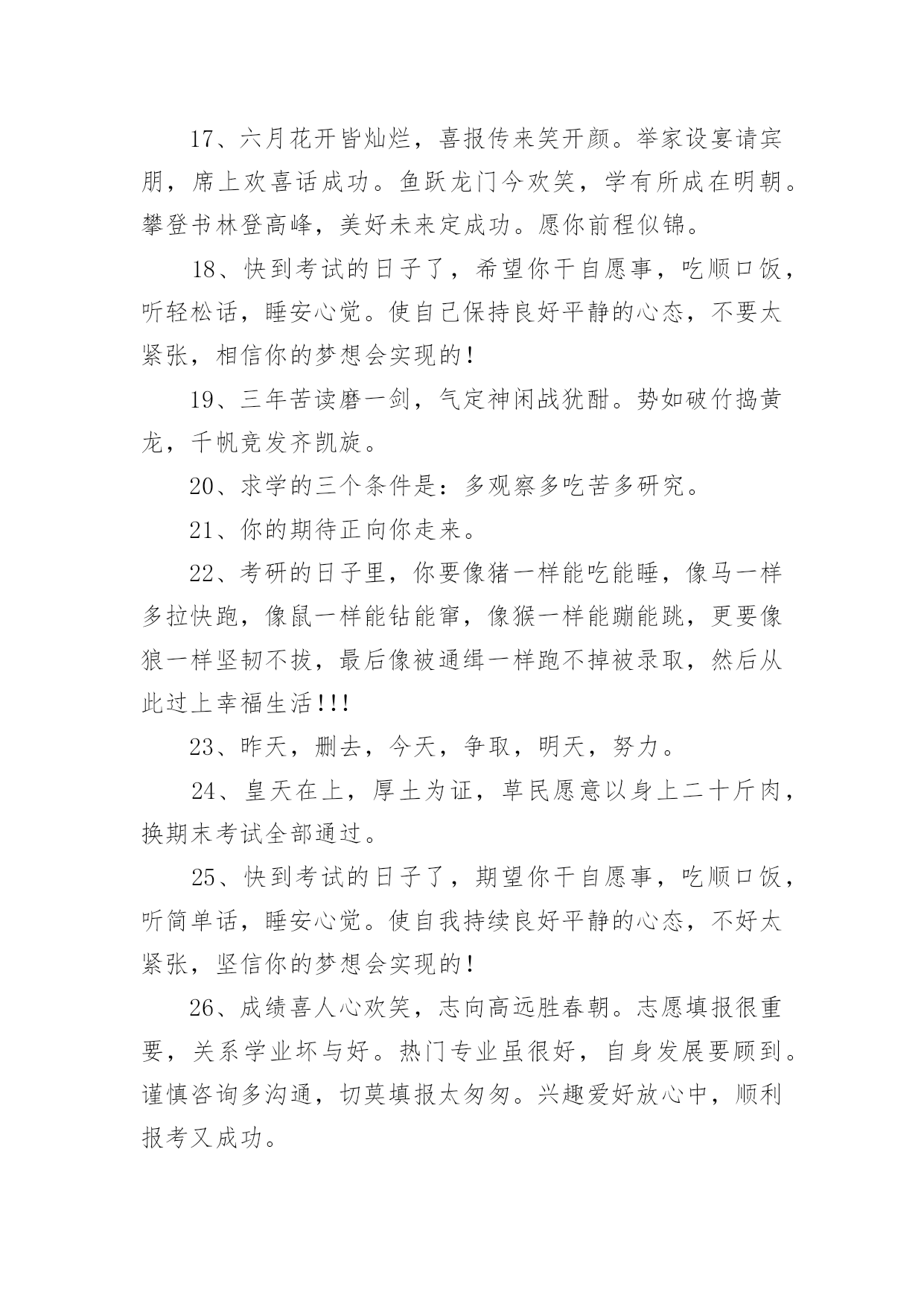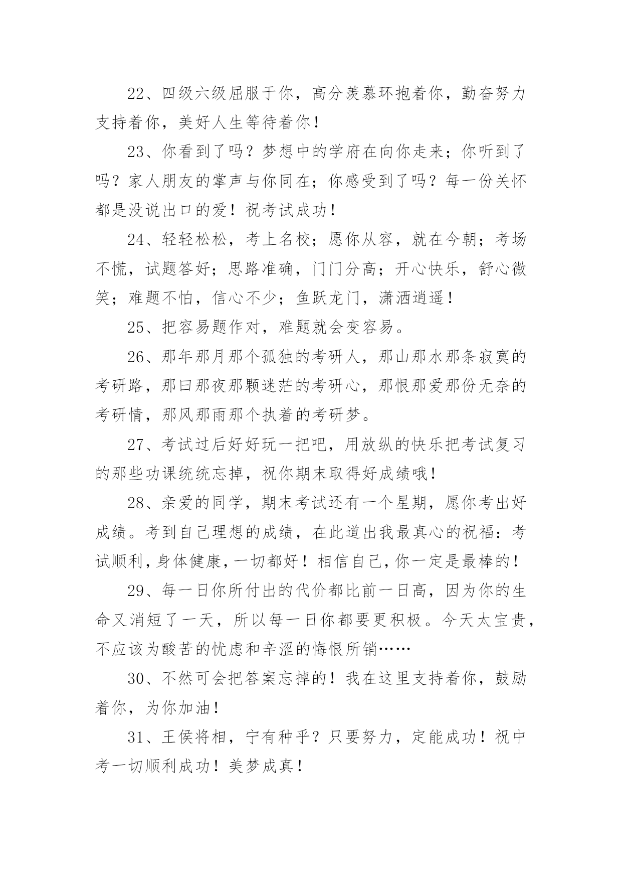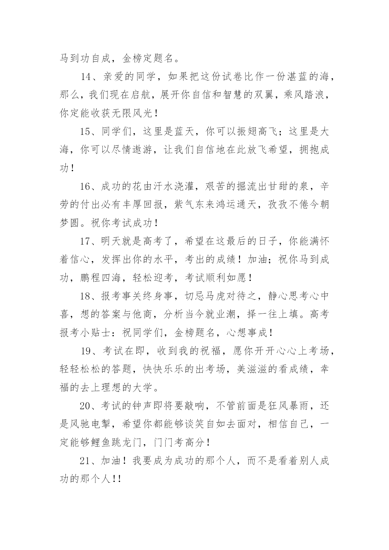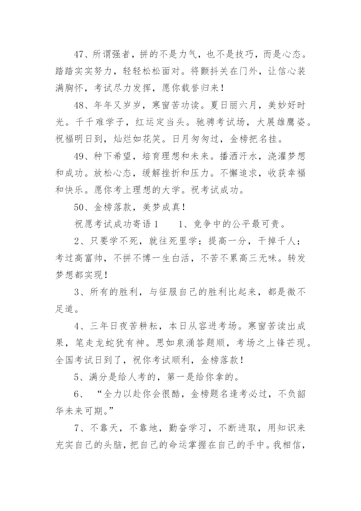 祝愿考试成功寄语关于祝愿考试成功寄语在平凡的学习、工作、生活中,大家最不陌生的就是寄语了吧,借助寄语人们可以寄托自己的希望。你知道寄语怎样写才规范吗?以下是小编整理的关于祝愿考试成功寄语,欢迎阅读,希望大家能够喜欢。祝愿考试成功寄语11、高考到,四化建设不能少。心态需要"冷静化"沉着应答不心慌;应考保持"自信化",发挥能力不失常;审题维持"细心化",心思缜密不马虎;答题尽量"工整化"字迹清秀不邋遢。四化工作做好,高考顺利准没跑。愿你高考顺利哦!2、你可以跌倒100次,但是并不妨碍你第101次爬起来。相信自己,你将如此坚强,忘却曾经的失败,义无反顾地去争取未来更大的建树。祝高考成功,蟾宫折桂。3、努力吧!不管结果怎样,经历过,总会有结果的!期末考试的朋友们,为你们祝福,也为自己祈祷!愿梦开始的地方,也是梦想实现的地方!嗯嗯,加油,嗯,加油!4、亲爱的同学,期末考试来了,愿你们考出好成绩,考到自己理想的成绩。5、相信经过三年的磨练,在今后的人生道路上,无论是荆棘丛生,还是鲜花相拥,一帆风顺,你们都能够坦然面对人生,笑看风云。你们是我们的榜样,是我们的骄傲,作为学弟学妹的我们以你们为荣!6、亲爱的学长学姐们,光阴似箭,白驹过隙,三年的时间转眼已成过去,你们就像是我们的指明灯,带我们从懵懂走向深知,而我们,依旧踏着你们留下来的奋斗的足迹努力着,或许是带着你们想实现却又未完成的梦想一步步向前攀爬。7、相信你们一定会有很多想说却未言的话,总之走过了,哭过了,笑过了,就不会有遗憾!带上我们的祝福去打造另外一片属于自己的天空吧!8、兄弟你今天就要参加考试了,送你一条幸运短信,据说在考试当天能收到这样一条短信,就会考出自己满意的成绩,祝你考试好运气啊!9、又是一年年终了,期末考试转眼到。寒窗苦读为前途,望子成龙父母情。我发短信传祝福:放下包袱开动脑筋,勤于思考好好复习,祝你取得好成绩!10、信心来自于实力,实力来自于勤奋。我看到了你的努力,相信你一定能在考试中取得好成绩!11、别想分数高低,放松最为重要。老妈最近很累,别忘对她笑笑,老爸场场接送,给他一个拥抱。穿得漂漂亮亮,誓把监考迷倒。最后提醒一遍,一定要检查哦!12、期中考试是一个实现人生的省力杠杆,此时是你撬动它的最佳时机,并且以后你的人生会呈弧线上升!13、十年寒窗苦,踏上考试路,心态放平和,信心要十足,面对考试卷,下笔如有神,短信送祝福,愿你能高中,马到功自成,金榜定题名。14、亲爱的同学,如果把这份试卷比作一份湛蓝的海,那么,我们现在启航,展开你自信和智慧的双翼,乘风踏浪,你定能收获无限风光!15、同学们,这里是蓝天,你可以振翅高飞;这里是大海,你可以尽情遨游,让我们自信地在此放飞希望,拥抱成功!16、成功的花由汗水浇灌,艰苦的掘流出甘甜的泉,辛劳的付出必有丰厚回报,紫气东来鸿运通天,孜孜不倦今朝梦圆。祝你考试成功!17、明天就是高考了,希望在这最后的日子,你能满怀着信心,发挥出你的水平,考出的成绩!加油;祝你马到成功,鹏程四海,轻松迎考,考试顺利如愿!18、报考事关终身事,切忌马虎对待之,静心思考心中喜,想的答案与他商,分析当今就业潮,择一往上填。高考报考小贴士:祝同学们,金榜题名,心想事成!19、考试在即,收到我的祝福,愿你开开心心上考场,轻轻松松的答题,快快乐乐的出考场,美滋滋的看成绩,幸福的去上理想的大学。20、考试的钟声即将要敲响,不管前面是狂风暴雨,还是风驰电掣,希望你都能够谈笑自如去面对,相信自己,一定能够鲤鱼跳龙门,门门考高分!21、加油!我要成为成功的那个人,而不是看着别人成功的那个人!!22、四级六级屈服于你,高分羡慕环抱着你,勤奋努力支持着你,美好人生等待着你!23、你看到了吗?梦想中的学府在向你走来;你听到了吗?家人朋友的掌声与你同在;你感受到了吗?每一份关怀都是没说出口的爱!祝考试成功!24、轻轻松松,考上名校;愿你从容,就在今朝;考场不慌,试题答好;思路准确,门门分高;开心快乐,舒心微笑;难题不怕,信心不少;鱼跃龙门,潇洒逍遥!25、把容易题作对,难题就会变容易。26、那年那月那个孤独的考研人,那山那水那条寂寞的考研路,那曰那夜那颗迷茫的考研心,那恨那爱那份无奈的考研情,那风那雨那个执着的考研梦。27、考试过后好好玩一把吧,用放纵的快乐把考试复习的那些功课统统忘掉,祝你期末取得好成绩哦!28、亲爱的同学,期末考试还有一个星期,愿你考出好成绩。考到自己理想的成绩,在此道出我最真心的祝福:考试顺利,身体健康,一切都好!相信自己,你一定是最棒的!29、每一日你所付出的代价都比前一日高,因为你的生命又消短了一天,所以每一日你都要更积极。今天太宝贵,不应该为酸苦的忧虑和辛涩的悔恨所销